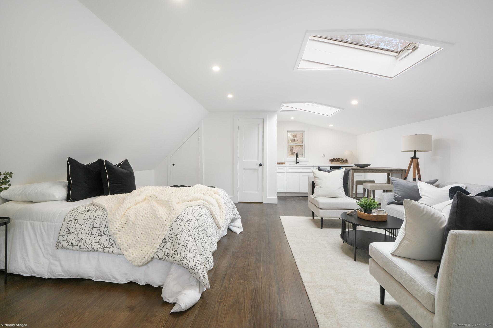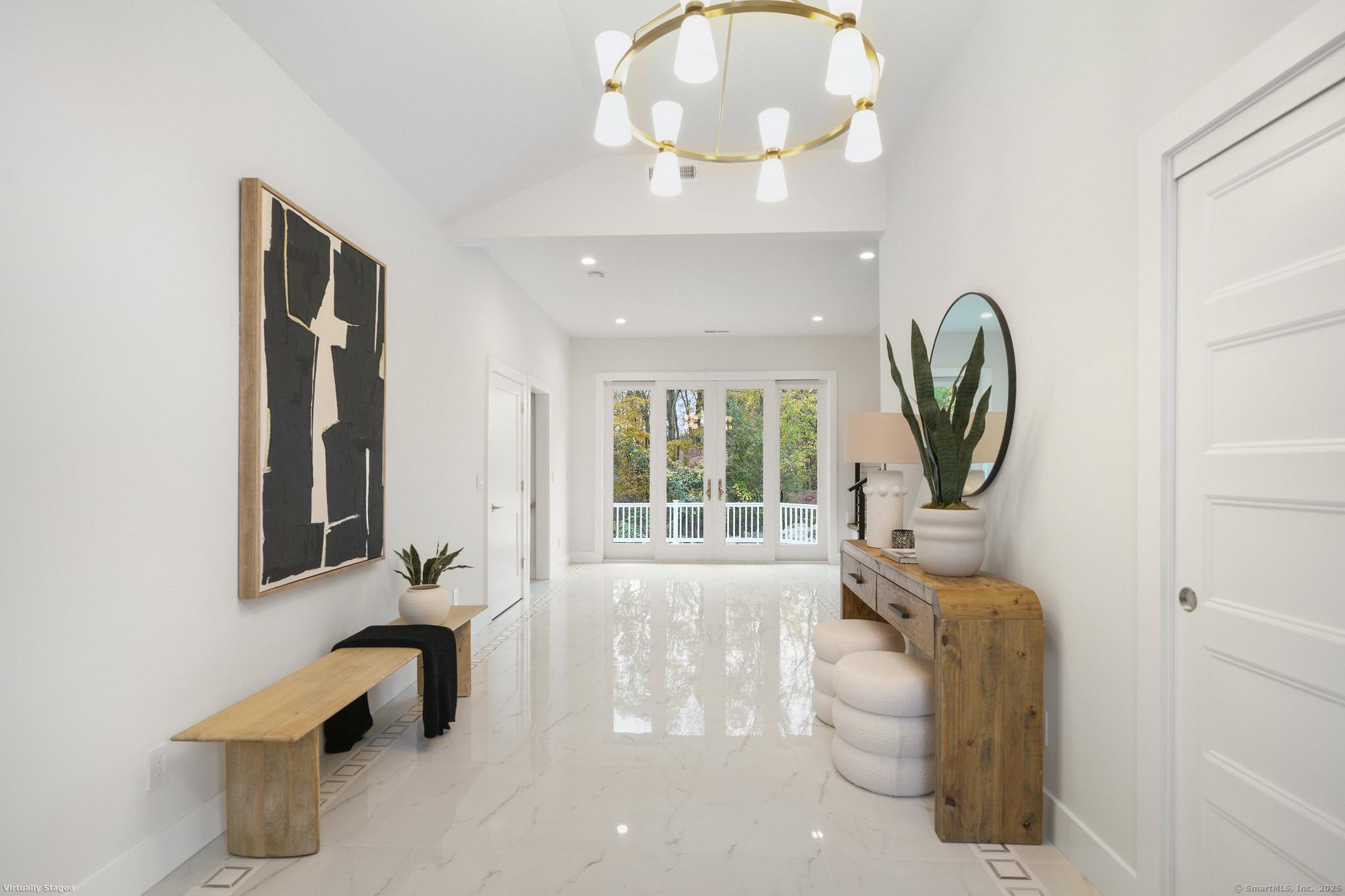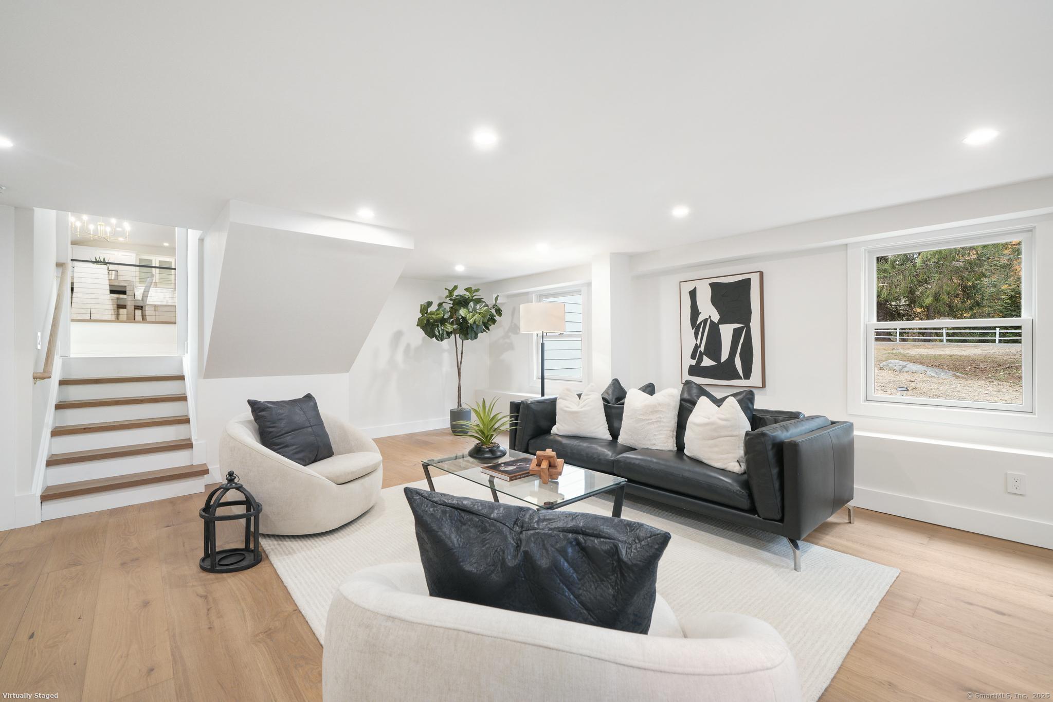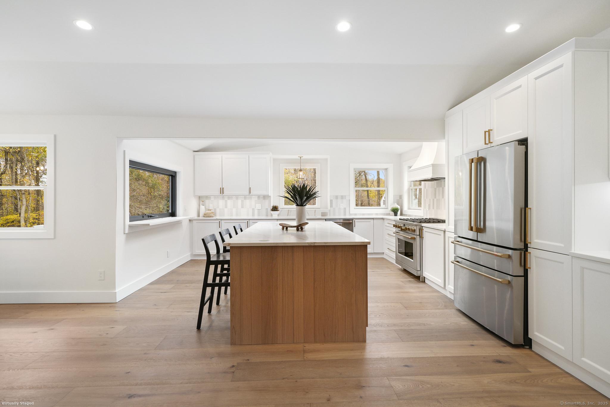 Welcome to 55 Liberty St. Unparalleled modern luxury in this meticulously rebuilt 5-bedroom, 4.5-bath Wilton residence. Set on 1.8 private acres, the home delivers seamless, sun-drenched living across 4,300+ square feet, following a comprehensive 2025 renovation that saw the property rebuilt from the studs up. Step inside to discover European wire-brushed hardwood floors and an effortless, open layout. The heart of the home is a vaulted-ceiling kitchen, featuring contemporary white cabinetry and a full suite of CAFETM smart appliances. Upstairs, the spa-like primary suite is finished with Natural Marble and luxurious gold Kohler fixtures, offering a perfect sanctuary. The lower level is designed for wellness and flexibility, hosting a brand-new sauna and a spacious recreation room. Further enhancing the property is a new detached two-car garage with second-story potential for guest quarters or a private office. Engineered for efficiency, the residence features a Bosch Hyper Heat HVAC system and a new Solar Array. Positioned moments from the Wilton Metro-North Station, this move-in-ready offering combines sophisticated, sustainable design with exceptional convenience. A rare opportunity for a turnkey luxury lifestyle.