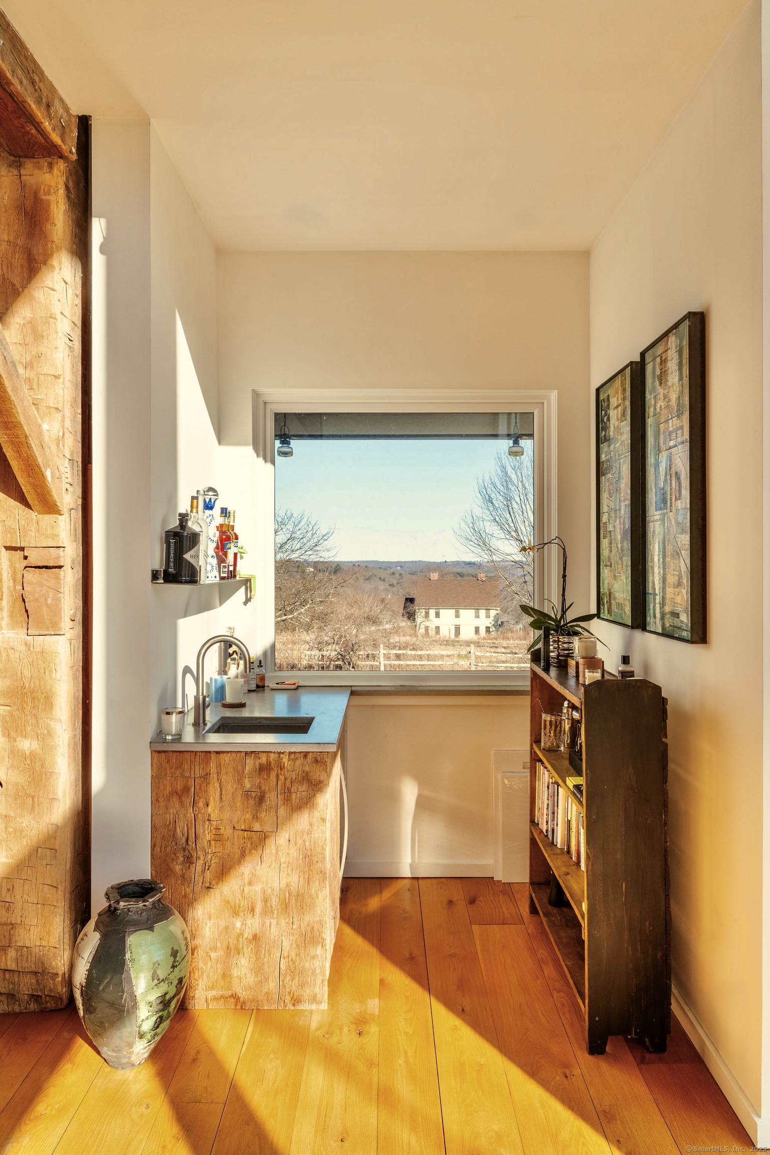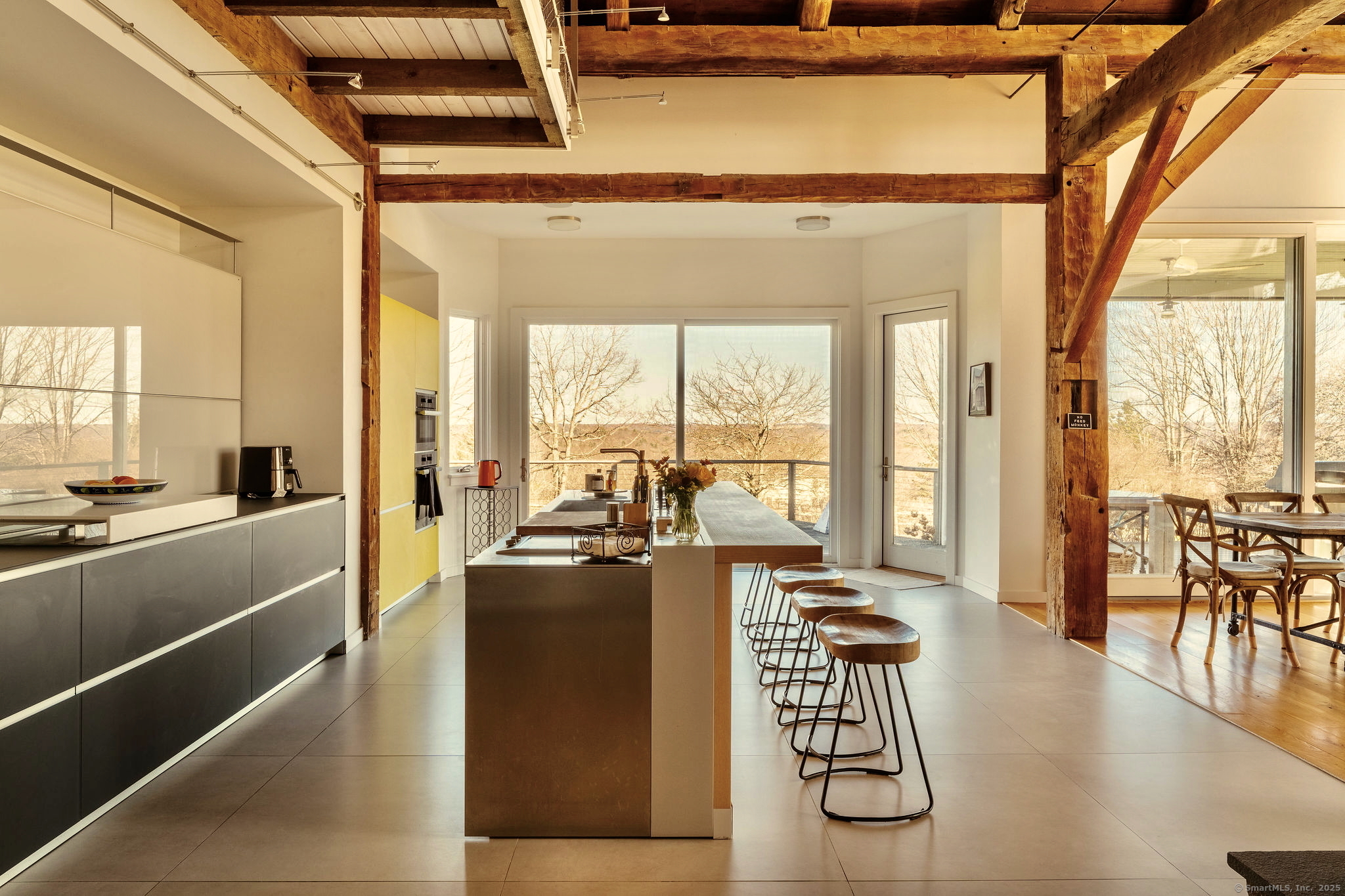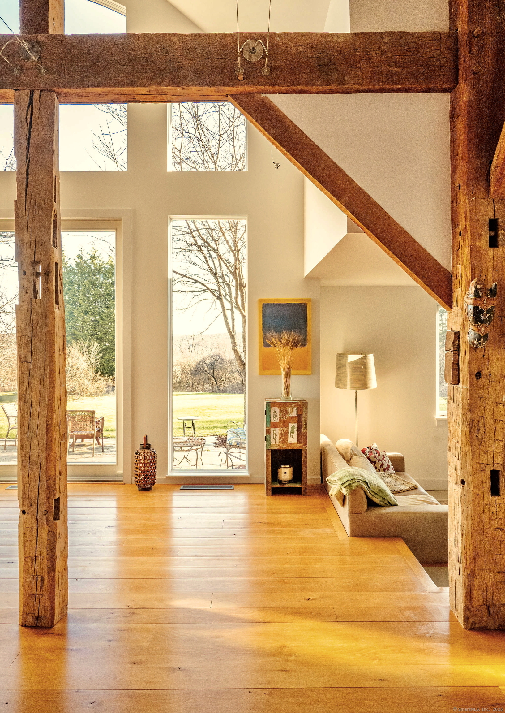 Academic-Year Rental | September-June | $8,500/month | Fully Furnished At the end of a winding country drive, where tall pines rise like quiet sentinels and sunlight filters through branches, the Bantam Barn reveals itself-set high on a hill, completely hidden from view. This exceptional long-term rental blends the soul of a 19th-century barn with the ease and elegance of modern living, offering a rare opportunity to dwell in both history and comfort. Thoughtfully restored and architecturally reimagined, the home features reclaimed barnwood, antique hand-hewn beams, and wide-plank floors throughout. Natural textures are paired with clean lines and contemporary finishes, creating interiors that feel both grounded and luminous. The heart of the home is a dramatic great room with soaring ceilings and a fieldstone fireplace, surrounded by walls of windows that frame views of the surrounding woods. The sleek, modern kitchen is outfitted with integrated appliances, double ovens, an induction cooktop, and a massive island-ideal for both daily rituals and entertaining. Just beyond, a sunken den/TV room provides a cozy, informal space to unwind.