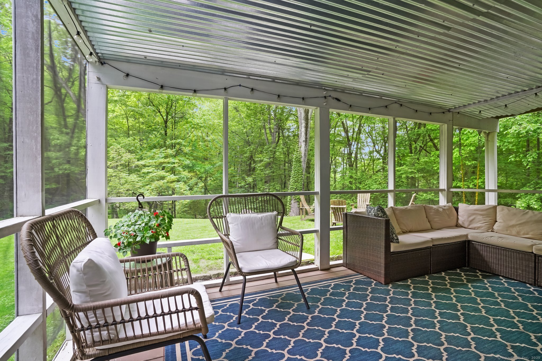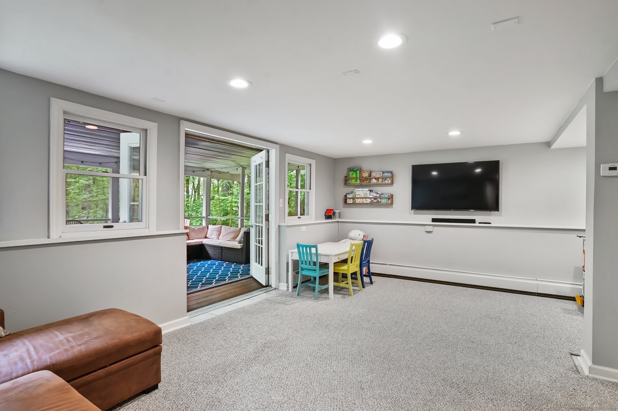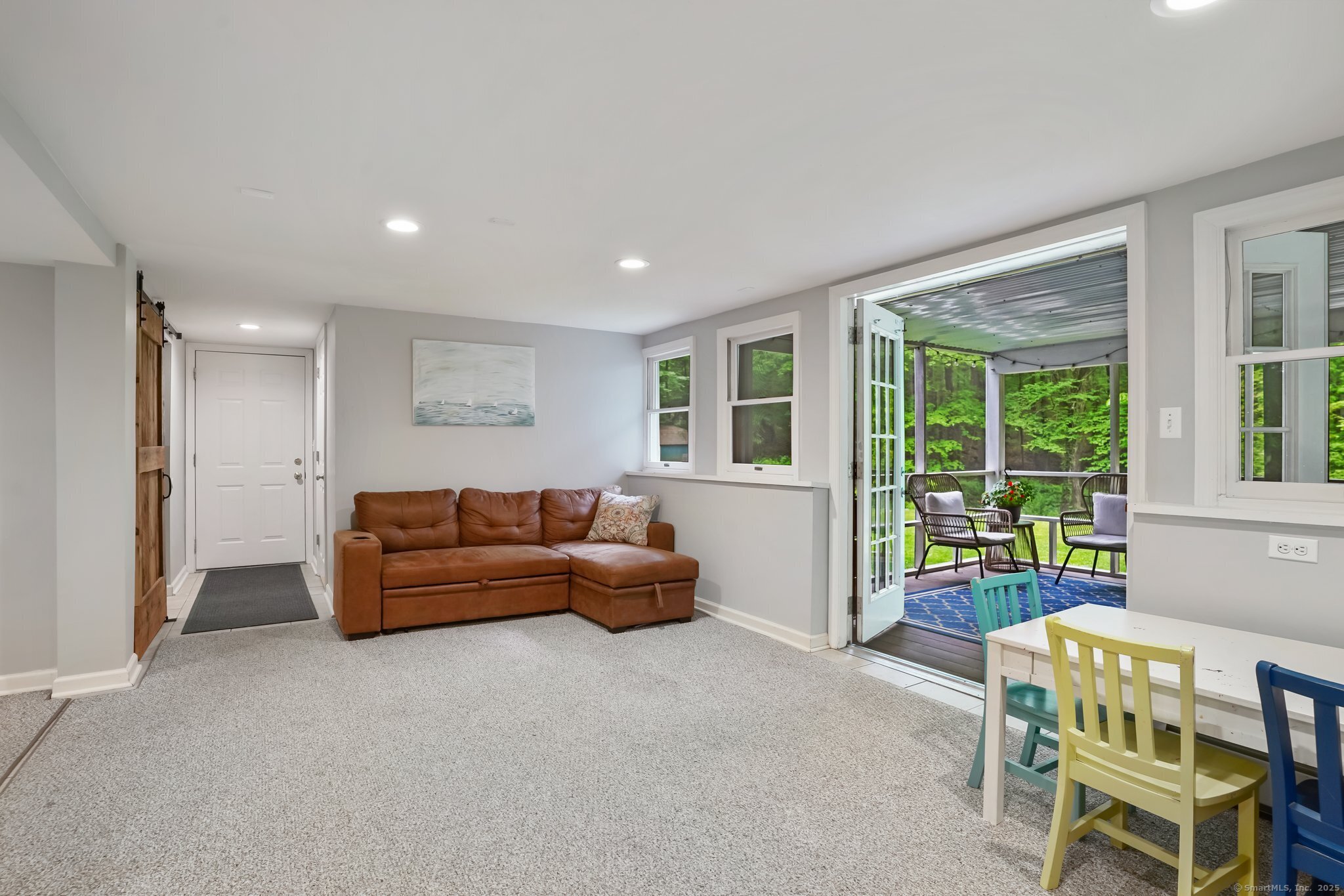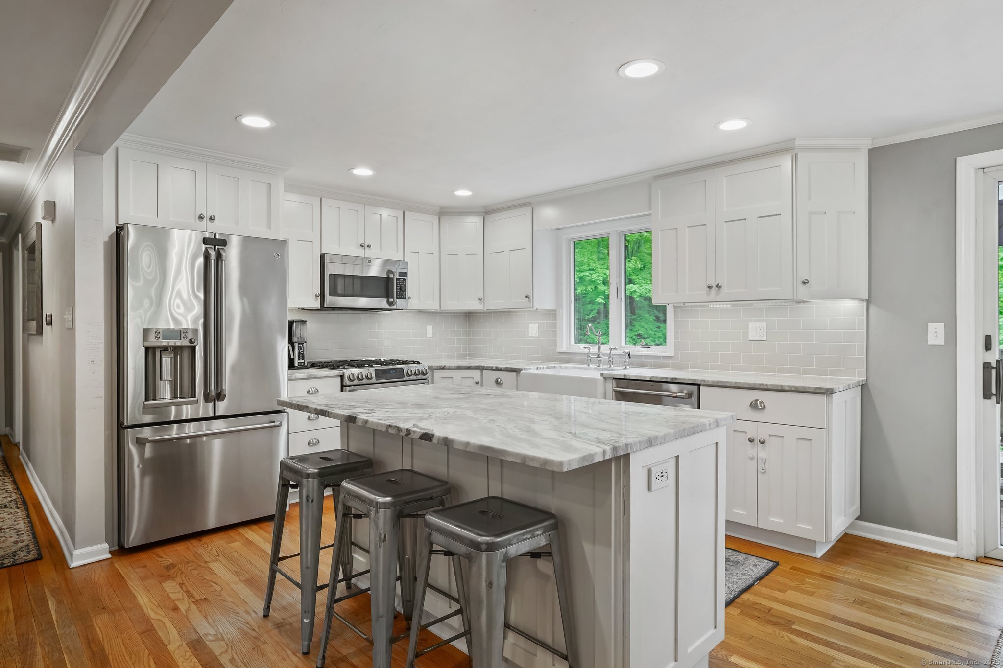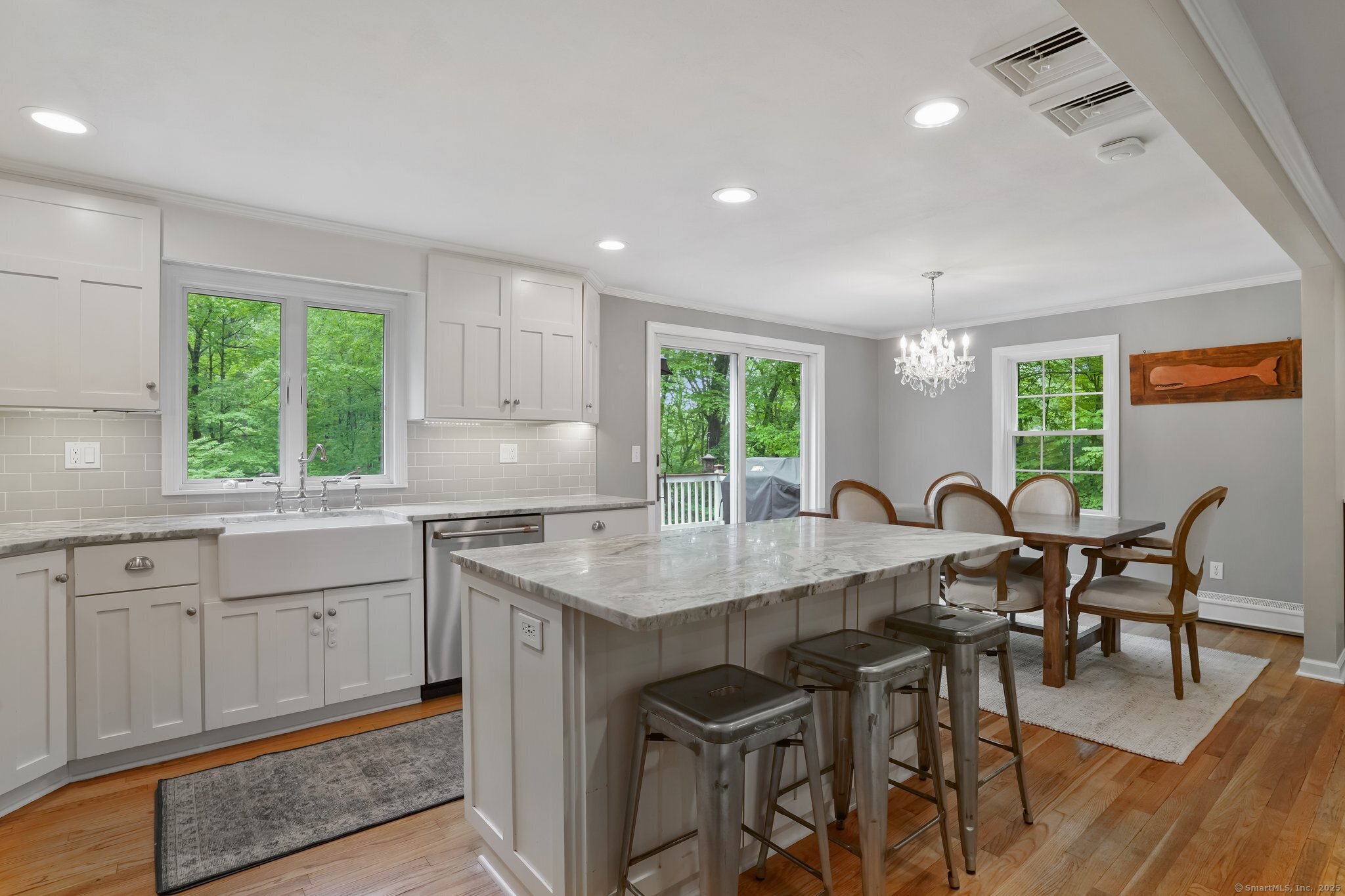 Welcome to this beautifully updated 3-bedroom, 2.5-bathroom ranch home, nestled on 1.12 acres, and located on a picturesque, scenic road in Ridgefield. This light and bright home offers the perfect blend of comfort and convenience. Just moments away from Branchville, you'll have easy access to the train station, elementary school, local restaurants, and shops. Step inside and you are greeted by the light-filled living room with fireplace and the dining room, perfect for everyday gathering and dining, yet spacious enough for entertaining. The fully renovated kitchen features a large island with seating, quartzite counters, a farm sink, top-end appliances, white cabinetry, a pantry closet, and under-counter lighting. Sliding doors lead you to the deck overlooking the stunning and private back yard, with a cozy fire pit, stone outcroppings, mature trees, and a level lot bordering a nature preserve available for hiking and exploring. Primary bedroom features built-in wardrobe cabinetry, an en-suite bathroom with double sinks, a large walk-in shower, and modern cabinetry. Two bedrooms and a full hall bath complete the main level, featuring spacious closets and hardwood floors. Downstairs, the finished lower level provides a family room/playroom, half bathroom, laundry, mud room with custom cabinets, mechanical rooms, sliders to a screened-in porch, plus a two-car garage and an electric charger. Minutes away from Ridgefield restaurants, shopping, arts & culture.