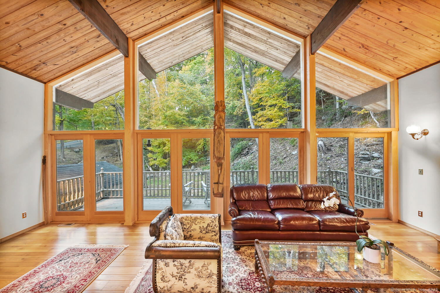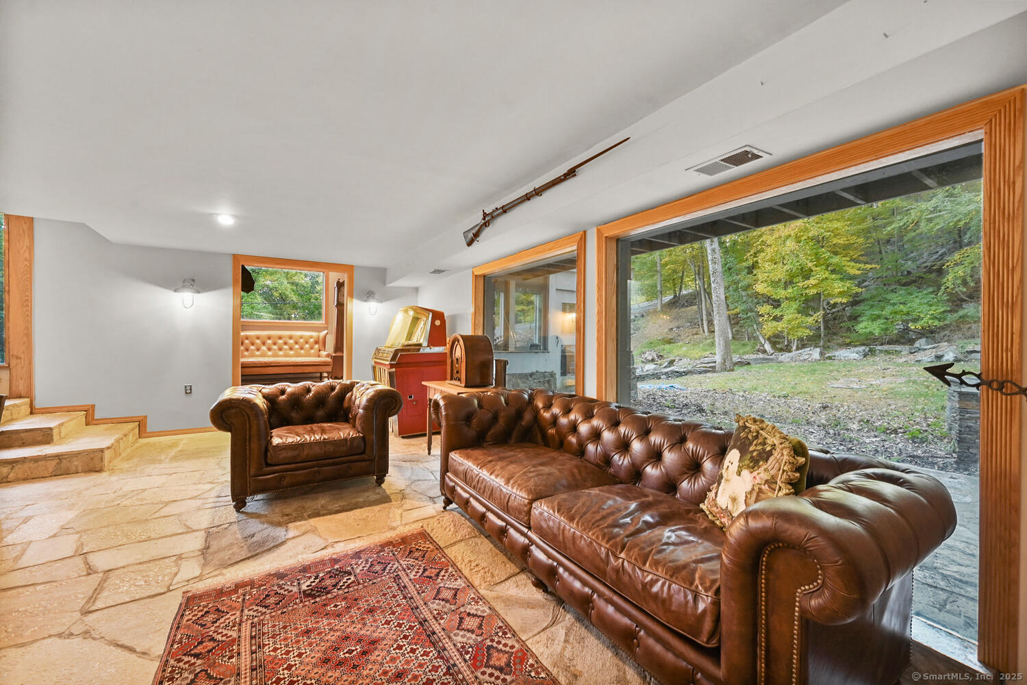 This exceptional stone home, blending contemporary design with natural tranquility, sits on 2 private acres in Weston. Expertly engineered & beautifully constructed, the home welcomes you through a dramatic two-story foyer into a sun-filled living room with floor-to-cathedral windows, a custom two-sided fireplace, and sweeping woodland views. Open chef's kitchen features granite countertops, custom cabinetry, granite center island, premium built-in appliances: Sub-Zero, Thermador stoves, Miele cappuccino station, warming oven, steamer. The large dining room offers perfect space for entertaining. Main level includes three bedrooms, highlighted by a spacious primary suite w sitting room, spa bath, double vanity & custom staircase that winds to a loft ideal for reading or stargazing. Two additional upstairs bedrooms feature getaway lofts. Lower level incl 2 more bedrooms, full bath, wine cellar, sauna, game room & family w stone fireplace that opens to outdoor living area. Heated red barn, accessible from upper deck, perfect for basketball, exercise/yoga, office, gym, studio, or meditation retreat. Honeycombed by trails & two meandering rivers, Weston has the largest nature preserve in Fairfield County, pairing abundant opportunities for hiking, cycling, fishing, & birding with easy access to NYC. The town's renowned school system has a low ratio (12/1) & has been awarded CT Blue Ribbons for excellence. Community, sophistication, nature. It doesn't get any better than this!!!