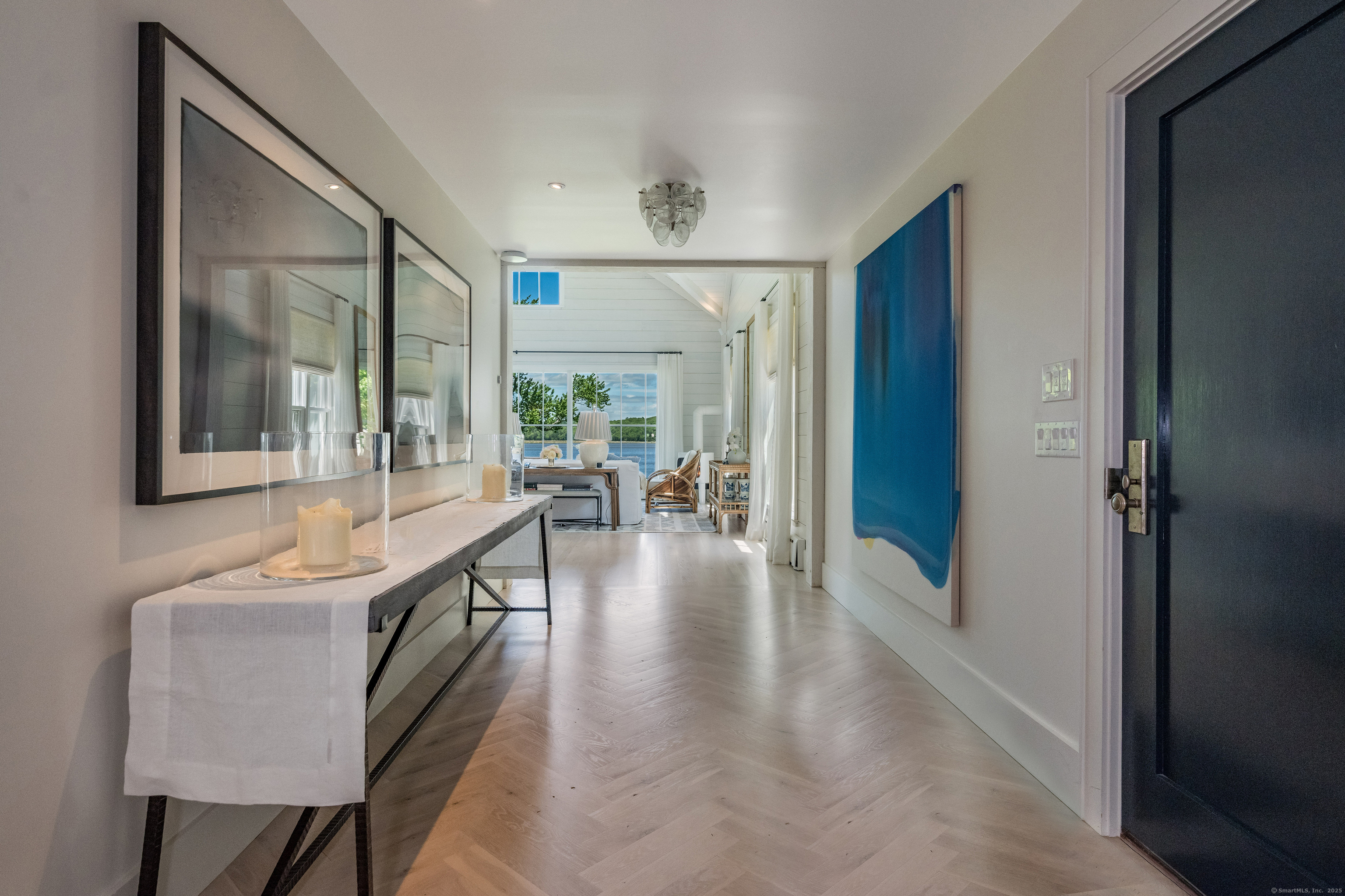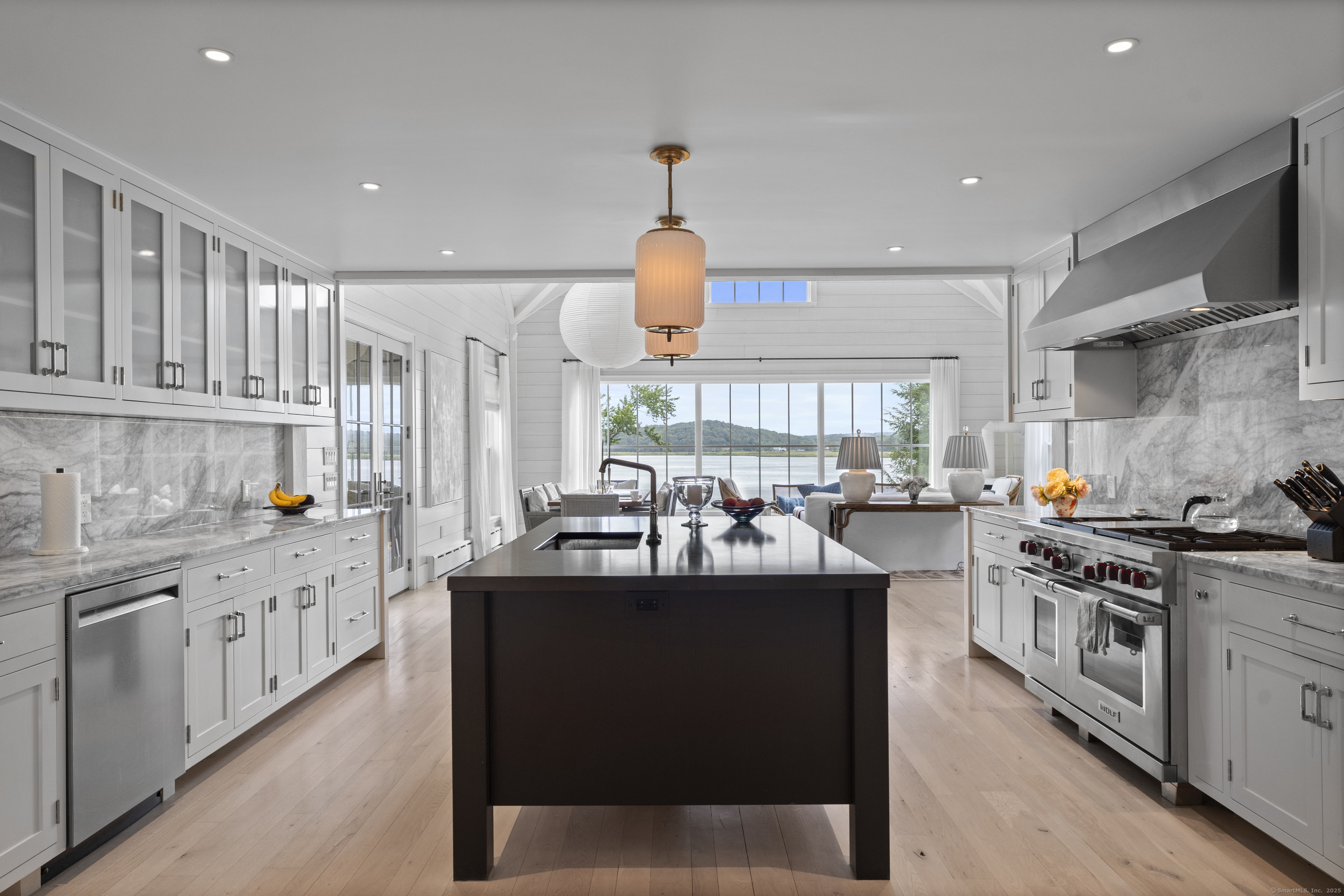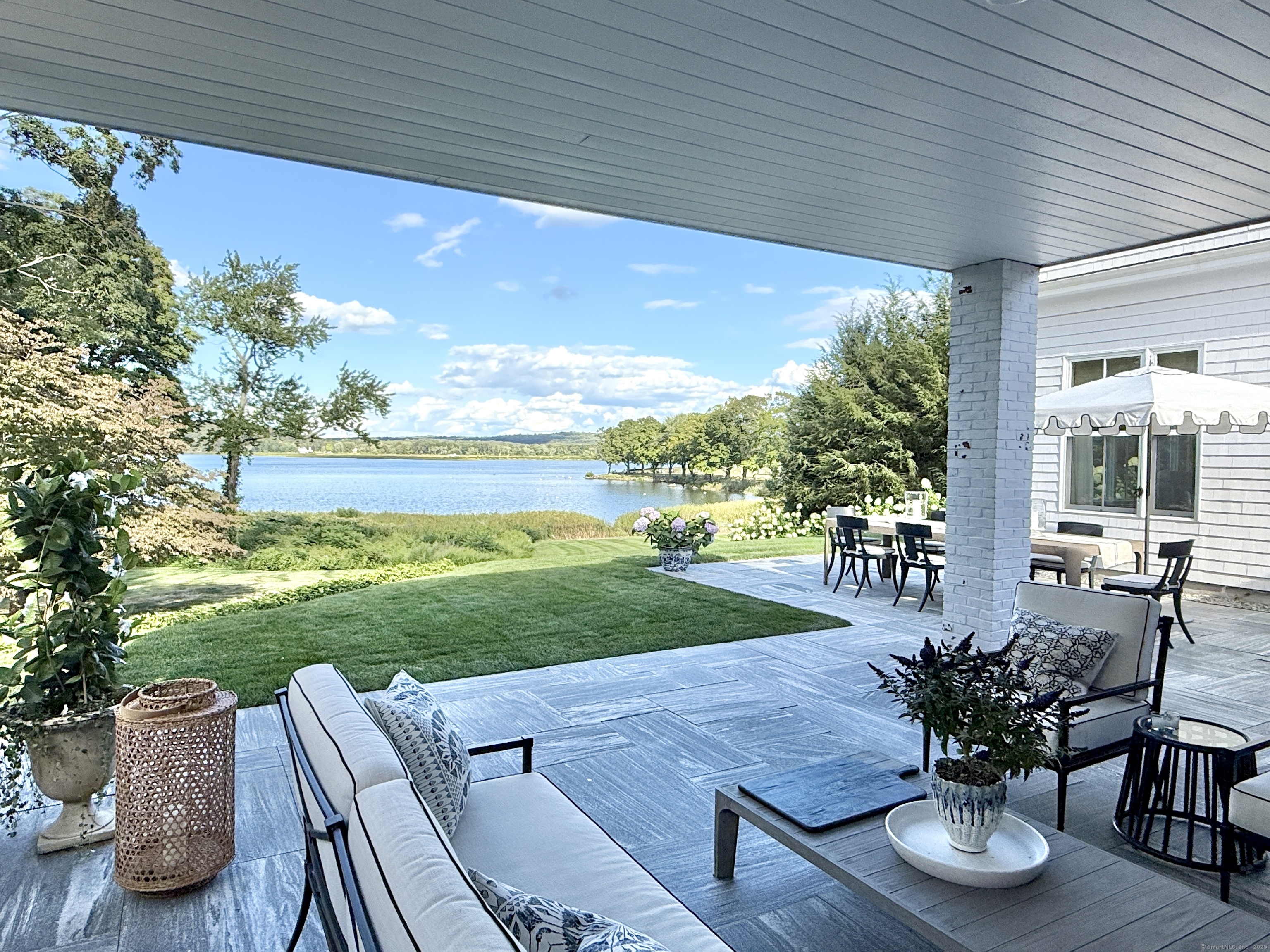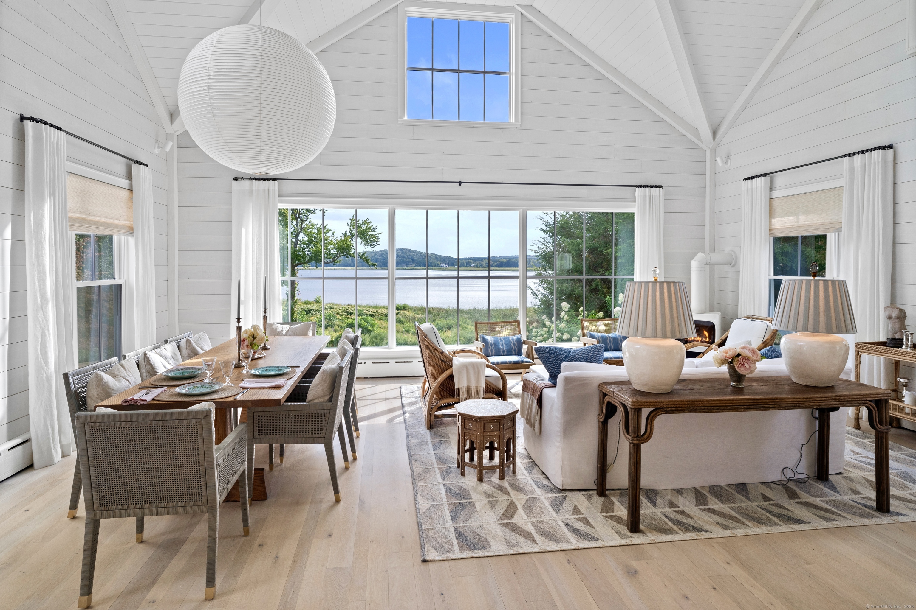 Fresh Update for a Classic Connecticut Home - Discover a beautifully restored 1955 waterfront classic. Stunning panoramic water views, privacy and walk-to-town convenience. Ascend to the family room, crowned with cathedral ceilings and expansive windows that invite the breathtaking views of the Connecticut River. A Danish gas fireplace adds a touch of sophistication, creating a cozy yet chic atmosphere year-round. At the heart of the home lies a vast chef's kitchen, a culinary masterpiece equipped with top-tier appliances and exquisite millwork by a master craftsman, ensuring both style and functionality. There is a butler's pantry, an elegant paneled library with water views, as well as an outdoor shower in the garden. The entertainment quotient soars in the spacious playroom, complete with a vaulted ceiling, a chic bar, and a sub-zero wine cooler, setting the stage for memorable games of ping pong and billiards. This riverside haven is graced with two large, sumptuous en-suite guest rooms. An entirely new primary bedroom suite was added to the original house in 2021. Gorgeous views from the primary bed as well as an extra-large dressing area and jaw-dropping primary bathroom with vaulted ceilings. Part of the restoration and renovation was the addition of a sleek new garage, housing a gym designed to cater to the wellness-minded.