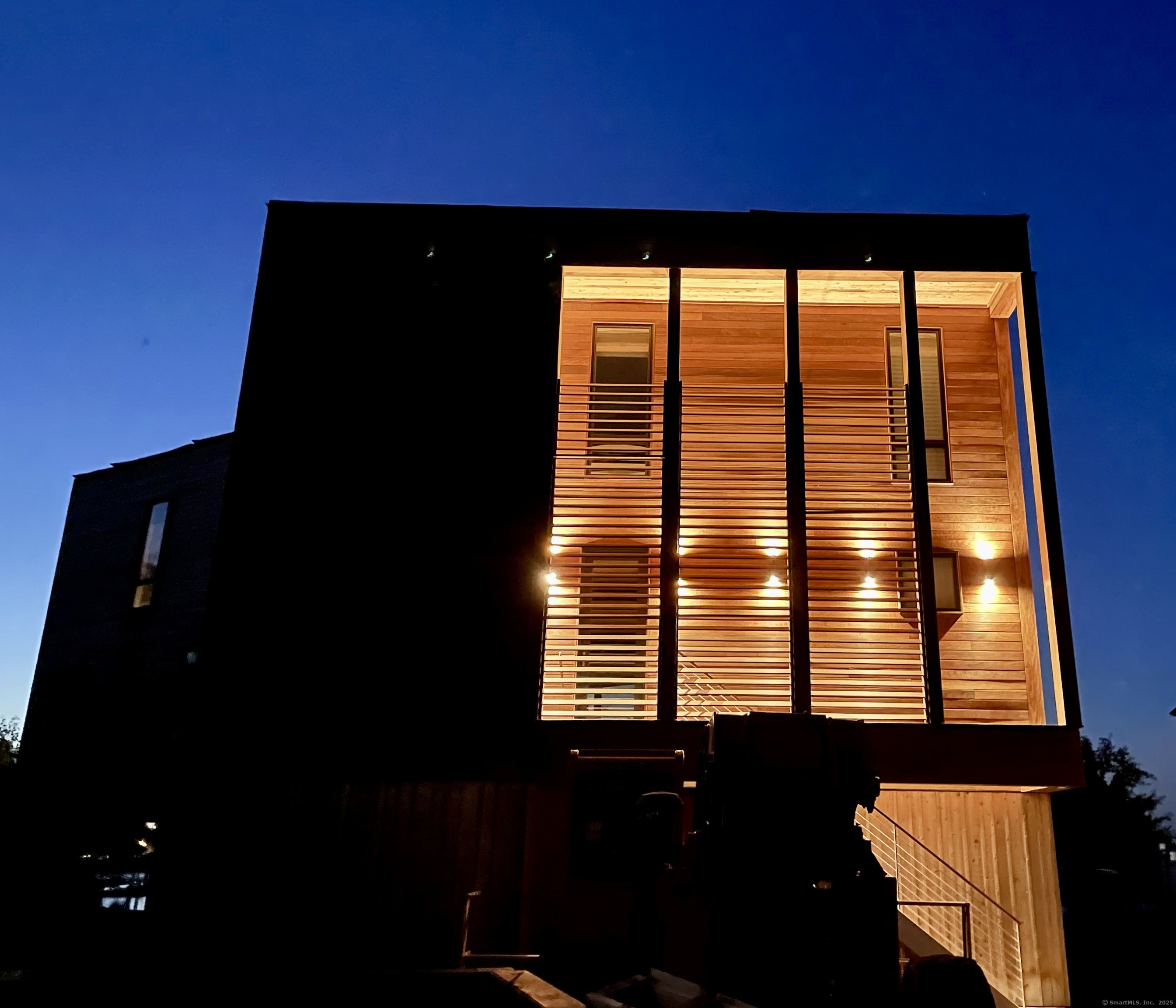 Inspired by the expansive 100 ft. waterfront setting in the Harbor View Association, this beautifully architect-designed Modern Contemporary home takes full advantage of the sweeping Norwalk Harbor waterscapes. Carefully crafted, it was constructed in 2018 with finest materials taking advantage of ever changing vistas from every room. Perfect for family gatherings or entertaining, there is a deck spanning the entire waterfront side of the house as well as an open floor plan on the Main Level with perfect flow between the Living Room, Dining Room and Kitchen. In addition, there is a Family Room with pocket door for quiet moments or movie nights, a spacious Pantry and a Half Bath. On the Upper Level is the Primary Bedroom Suite, two additional Bedrooms with en suite Baths, as well as an Office area that could easily be a Nursery, Bedroom, or Gym. The home features state-of-the-art mechanicals and rooftop solar panels. There is a convenient elevator from the open two-car Garage to all levels. Four dedicated Storage Rooms off the Garage provide space for outdoor equipment, trash/recycling and more. The property is peaceful and private with a lovely walkway amongst native grasses and perennials and a "forest" of birch trees leading to a lush lawn area on the waterfront side. This is truly a one-of-a-kind, special offering. Every detail has been thoughtfully considered in making it exceptional.