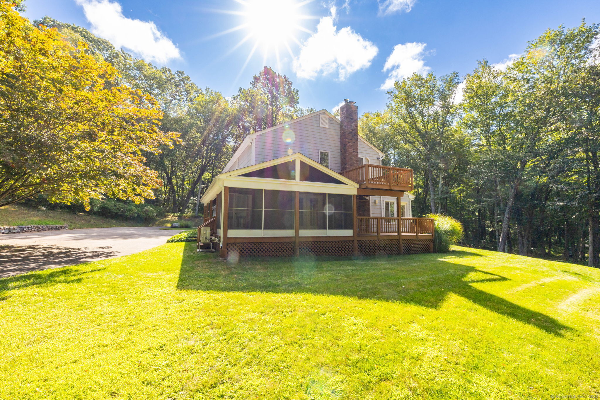 This contemporary home is nestled on 35 acres of private land, offering unmatched peace and tranquility. A long, private driveway leads you to this meticulously maintained property, which has been cared for with the utmost attention to detail, supported by comprehensive documentation. Inside, you'll find three spacious bedrooms, including a primary bedroom suite complete with a full bath, a generously sized walk-in closet and a private deck. The family room features a cozy fireplace, with French doors that open to a screened porch, creating a perfect flow between indoor and outdoor spaces. A bright sunroom offers skylights and a vaulted ceiling, while the open-concept kitchen flows seamlessly into the dining room that has a dramatic two-story ceiling. The lower level of the home offers a large recreational room with a half bathroom. The property also features a covered porch and multiple decks as well as a two-car garage. This home is an ideal sanctuary for those seeking both comfort and nature. With thorough care and attention to detail, this property is a rare find.