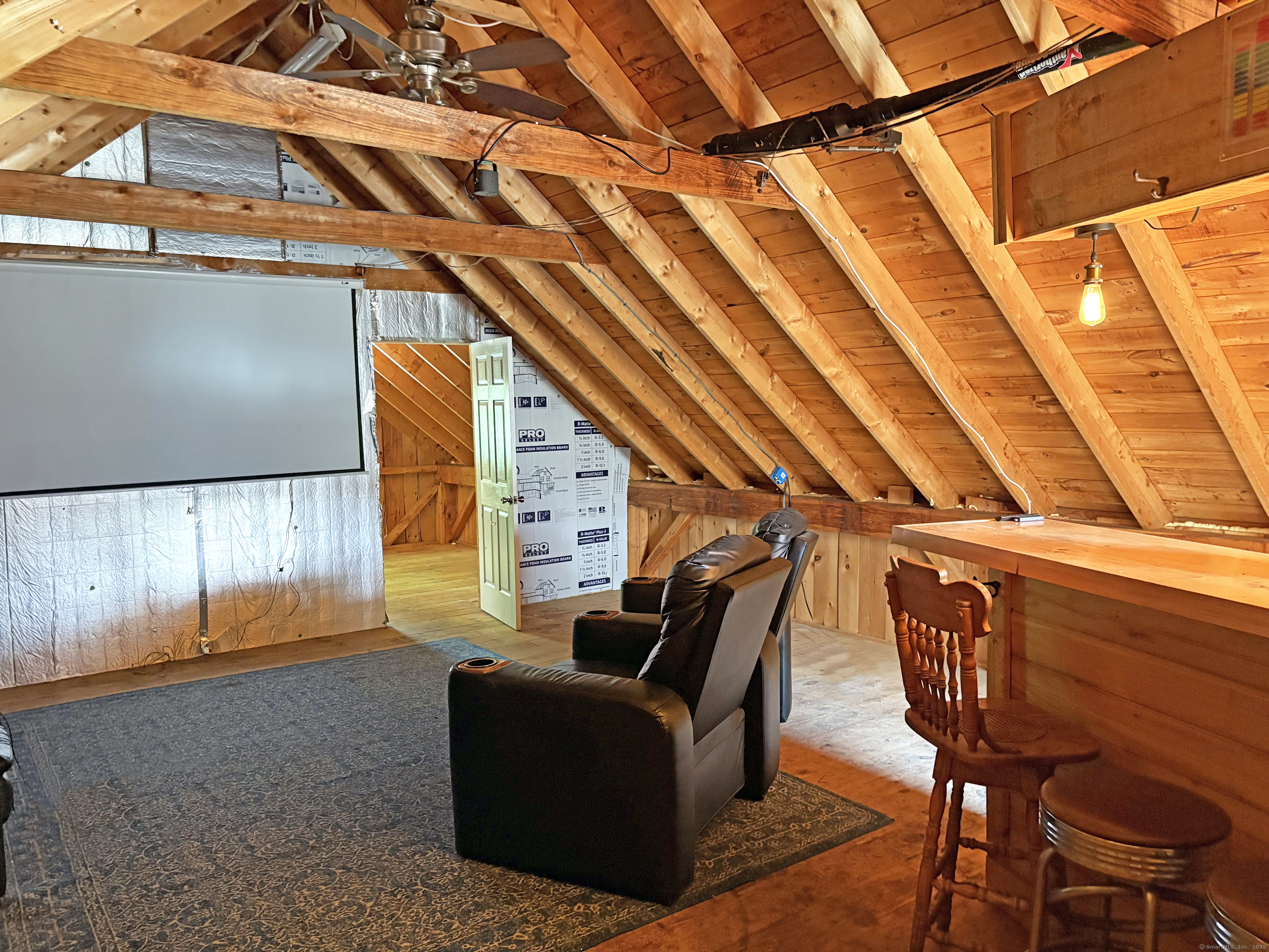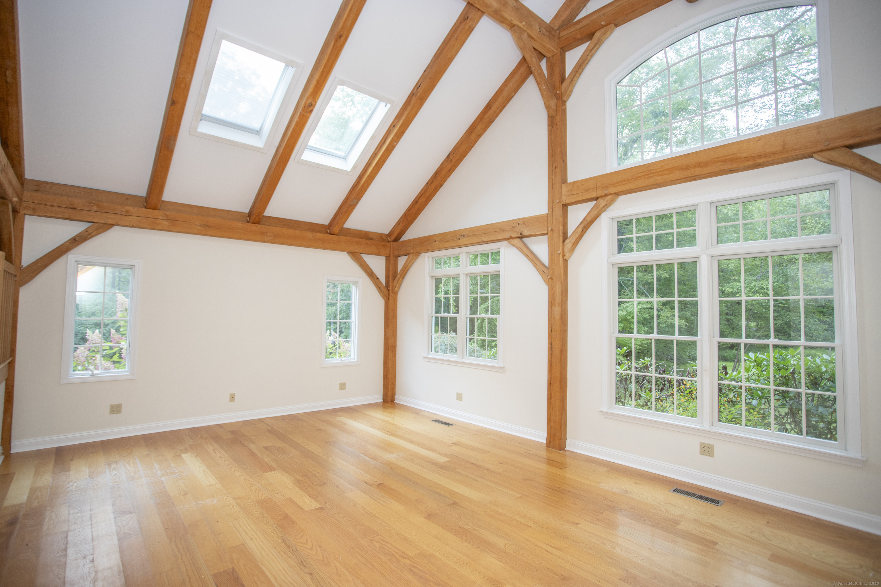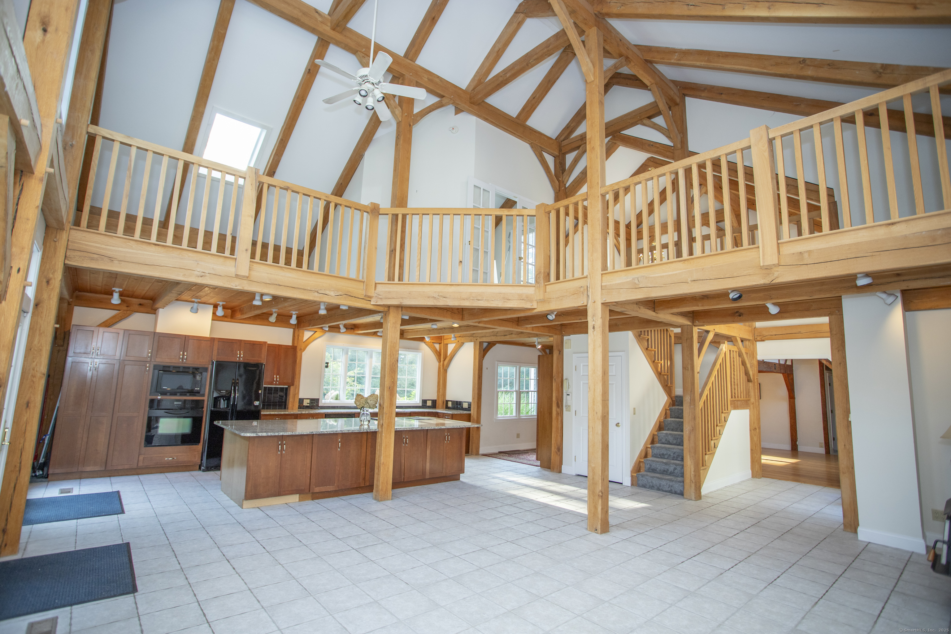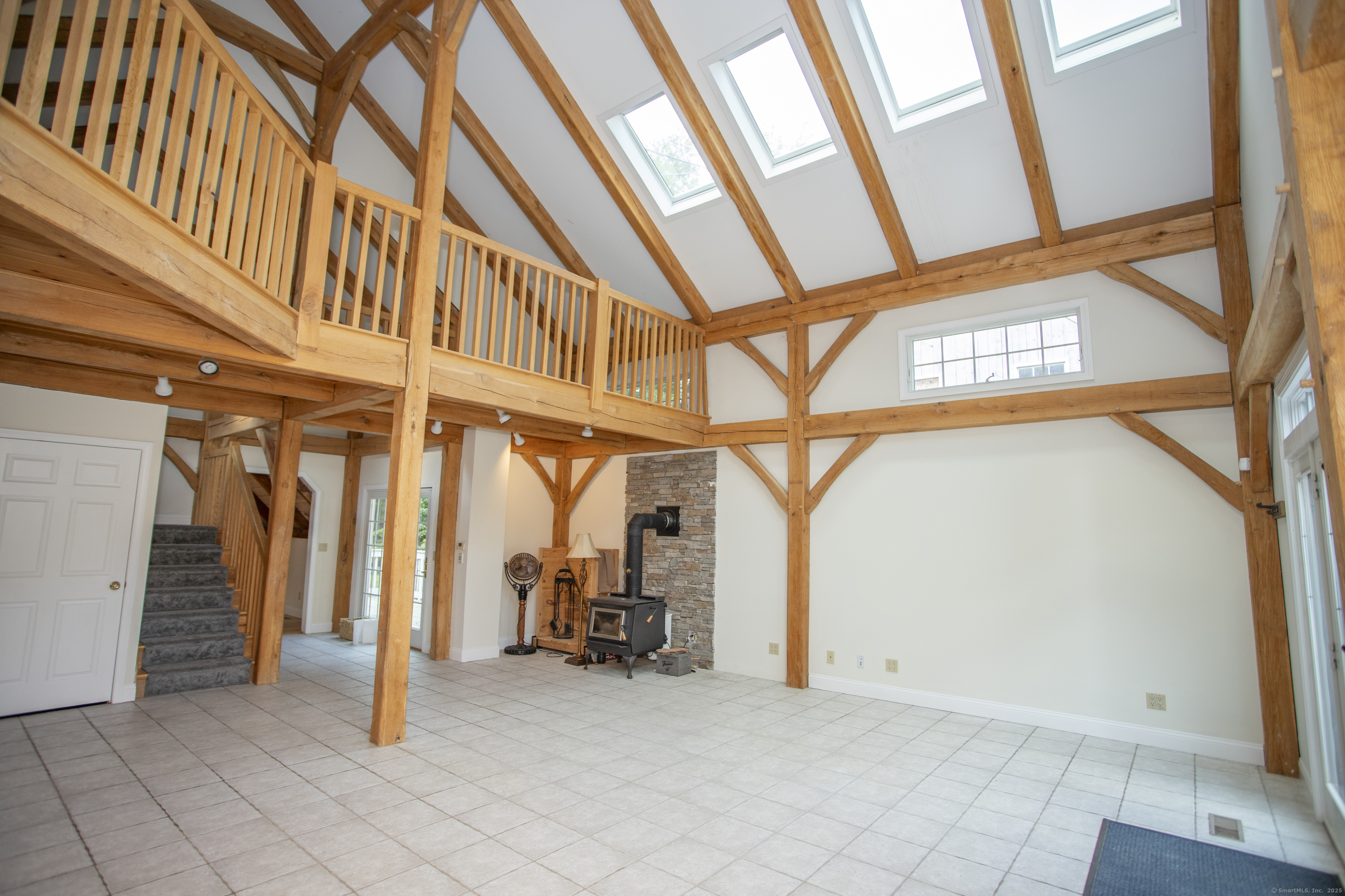 Tucked away in complete privacy, this stunning post and beam home offers a rare opportunity to live in harmony with nature. Situated on 6.4 acres of wooded serenity, the property is a true retreat and offers many outside features including a tranquil pond, ample space for gardens, hobbies, or simply room to roam. The home itself showcases timeless craftsmanship with exposed beams, soaring ceilings, and plenty of windows that flood the space with natural light and offer views in every direction. Warm wood tones and an open floor plan create an inviting atmosphere that blends rustic charm with modern comfort. The kitchen features an expansive granite countertop island, plenty of cabinets for storage, a large bay window over the sink, and an attached butler's pantry/dry bar. The spacious first-floor primary bedroom suite is a true retreat with vaulted ceilings with exposed beams and a spa-like full bath complete with double vanity sinks. Upstairs you will find 3 bedrooms that mirror the character of the home with a-frame ceilings and beams and a full bathroom. In the lower level you will find a finished space that could serve as an additional entertaining space or exercise room to utilize the sauna. Included on this property is also a large barn 3 bay garage workshop that offers a second-floor entertaining space set up as a movie viewing room with bar. With all of these added features and location, if you are searching for quiet, nature, and character-this is it.