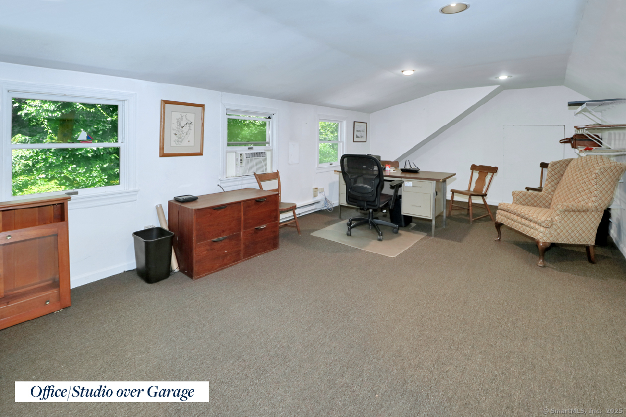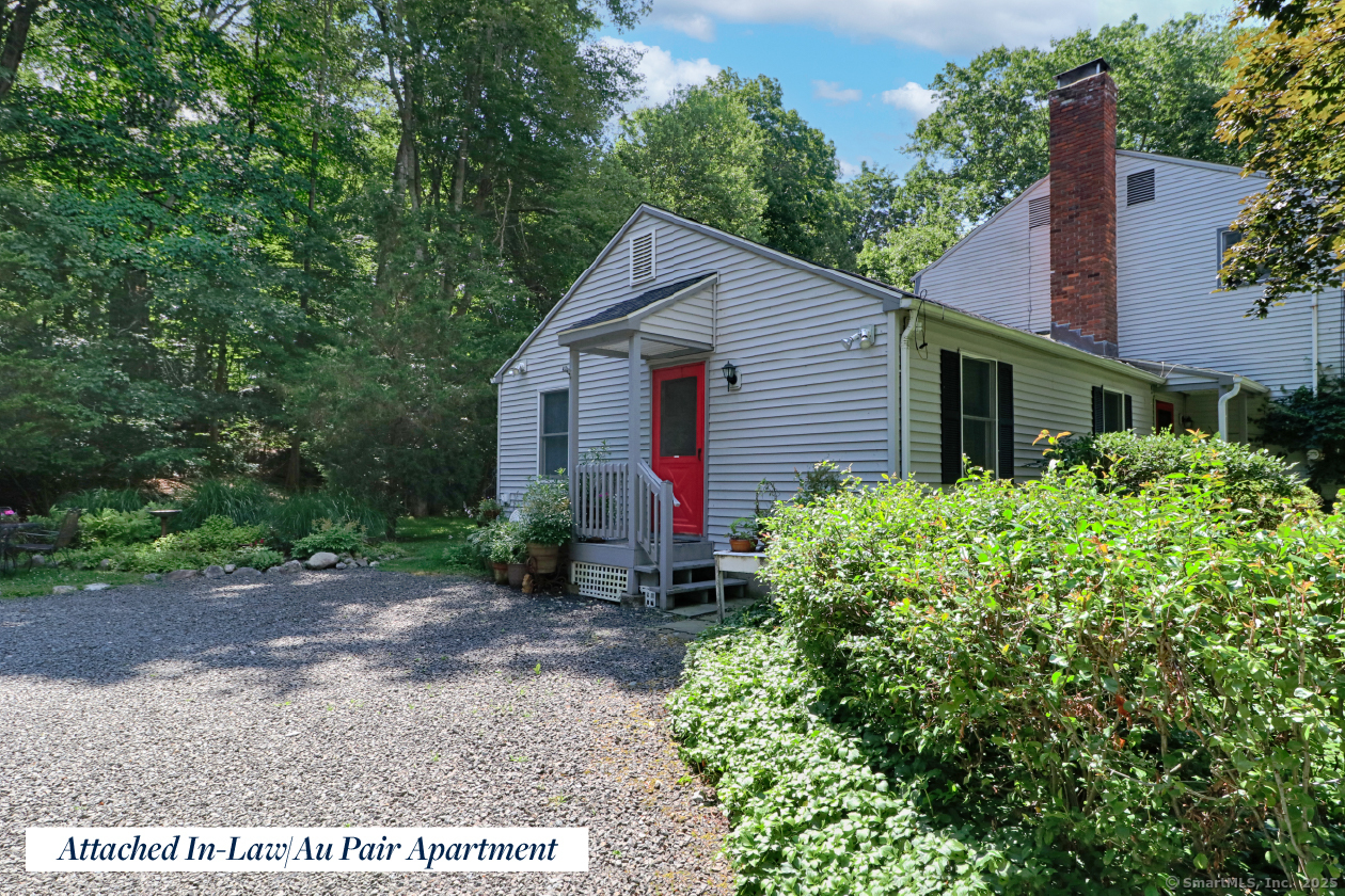 A prime Southport estate location at the Westport line is home to this gracious 5 Bedroom Colonial featuring a rarely found attached main level IN-LAW / AU PAIR APARTMENT with a private entrance, Living/Dining Room, Bedroom and a full Bath. Additionally appreciated, and perfect for today's work from home buyer, is an OFFICE/STUDIO over the barn style oversized detached two car garage. Approached by a long driveway this home is a nature lovers paradise offering complete privacy with the convenience of being approximately 2 miles to Southport Village center, train and harbor. Inside a welcoming Foyer introduces the front to back Living Room with fireplace, formal Dining Room and the charming Family Room with rustic beams, built in bookcases and impressive brick fireplace. This room is open to the Kitchen and the Breakfast Room with atrium door to a two tier deck to enjoy al fresco dining. The Kitchen impresses with abundant cabinetry and counter space including large breakfast bar perfect for gathering friends/family or food prep duties. Adjacent is a mudroom with side door access to the front walk, the laundry/storage room and if desired access to the attached apartment. Five ample Bedrooms occupy the second floor along with generous linen and cedar closet storage. The primary Bedroom offers a walk in closet, Bath with heated floor, double sink vanity and walk in steam shower. A truly private country home just minutes from Southport Village Center, Harbor, Beach and Train