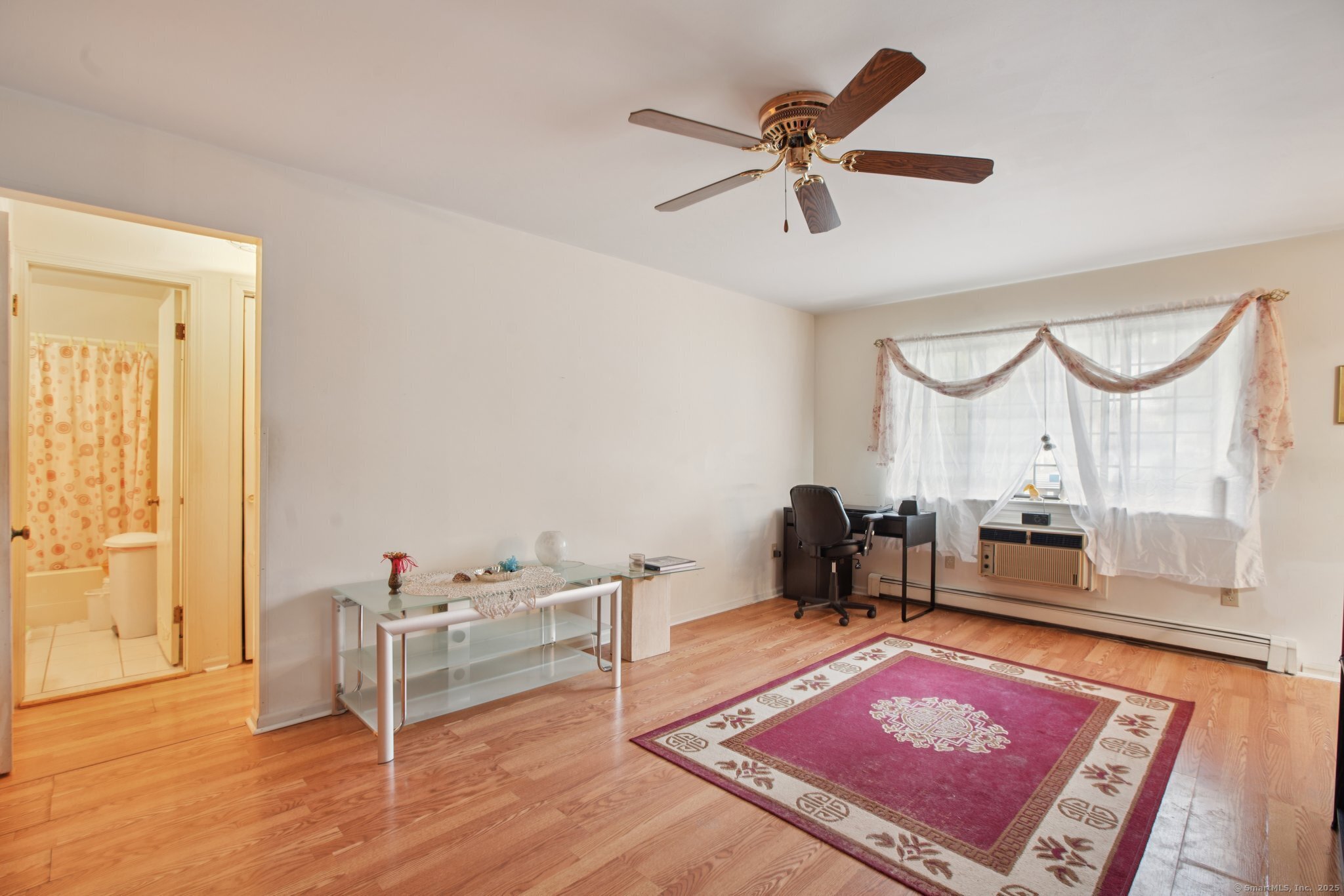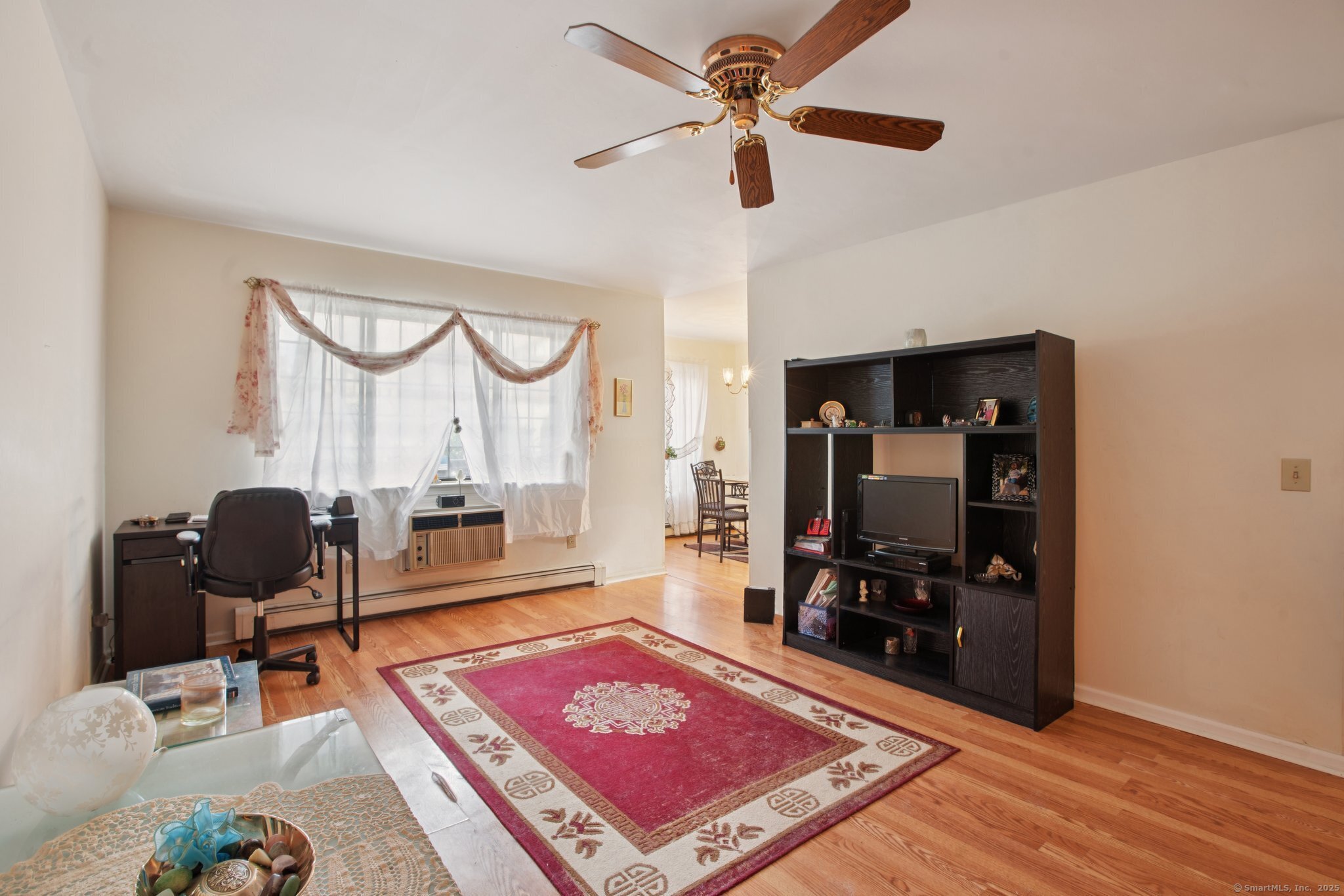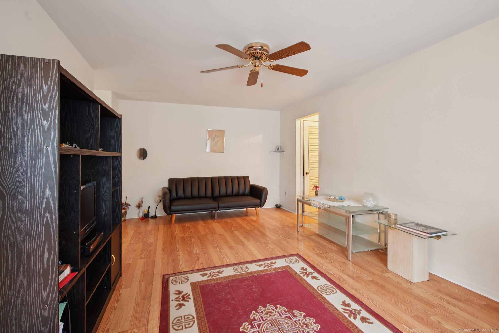 Welcome to 27 Teresa Place, Unit 27, an inviting end unit condo tucked away in Bridgeport's desirable North End that blends comfort and convenience with every detail designed for easy living. Step inside to find a bright open layout where hardwood floors flow seamlessly from the spacious living room into the dining area and kitchen. The living room feels warm and welcoming with its ceiling fan and natural light, creating the perfect space to relax or entertain. The kitchen offers plenty of cabinet space and comes fully equipped with a dishwasher, oven range, refrigerator, washer and dryer, making daily life effortless. The bedroom is generously sized with hardwood floors and a ceiling fan, while the full bath features tile flooring for a clean, modern touch. This home also includes access to a shared basement with storage, giving you extra space when you need it, and the complex offers beautifully maintained grounds and a community pool, perfect for warm summer days. With heat, hot water, snow removal, trash pickup and grounds maintenance all included in the HOA, this move-in ready condo delivers comfort, convenience and community whether you're a first-time buyer, downsizing, or simply looking for a well-kept space to call home.