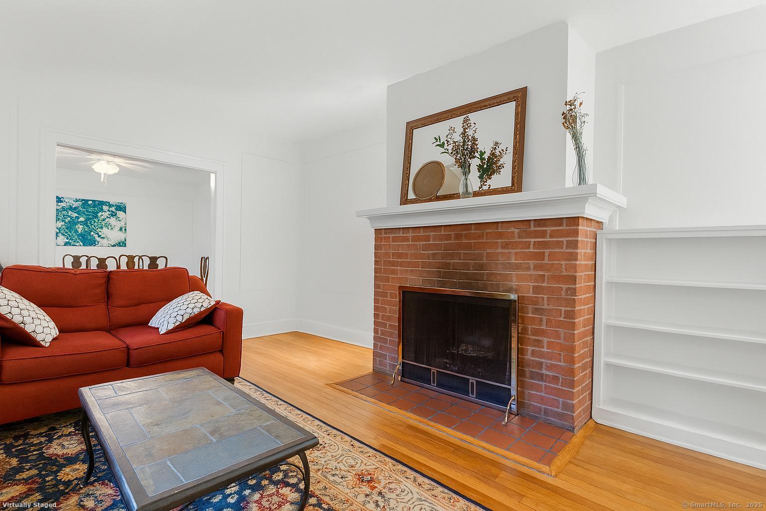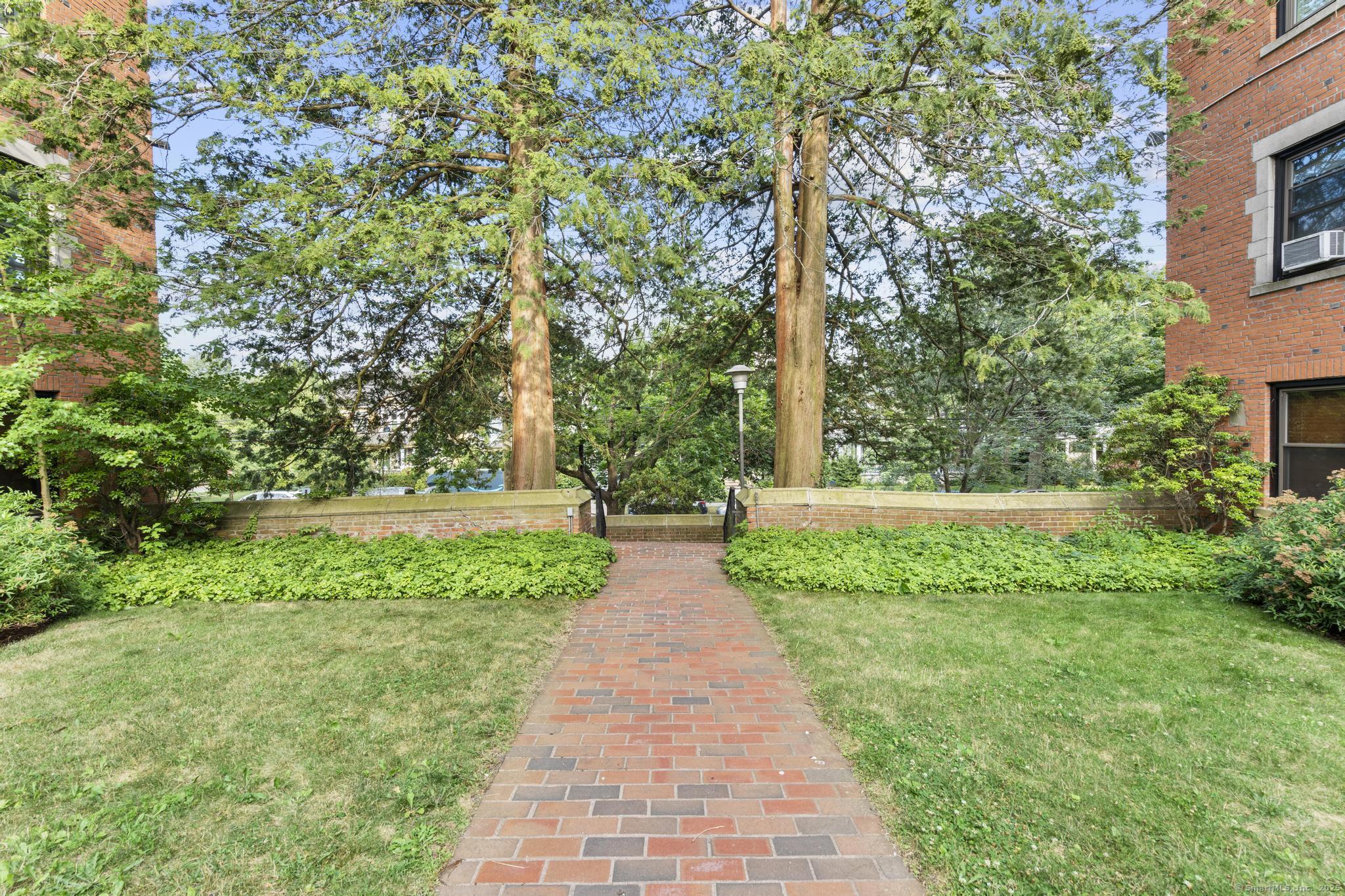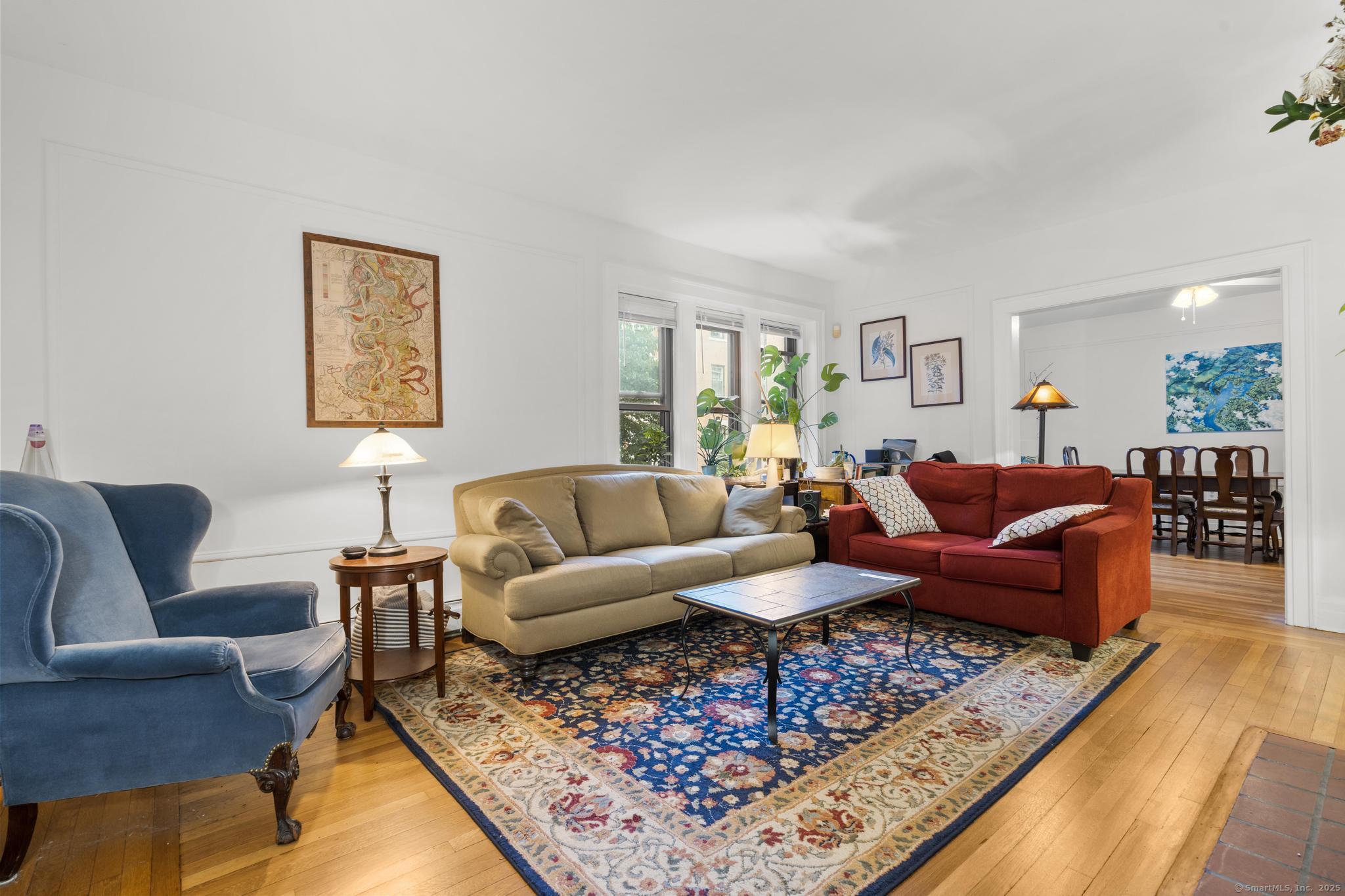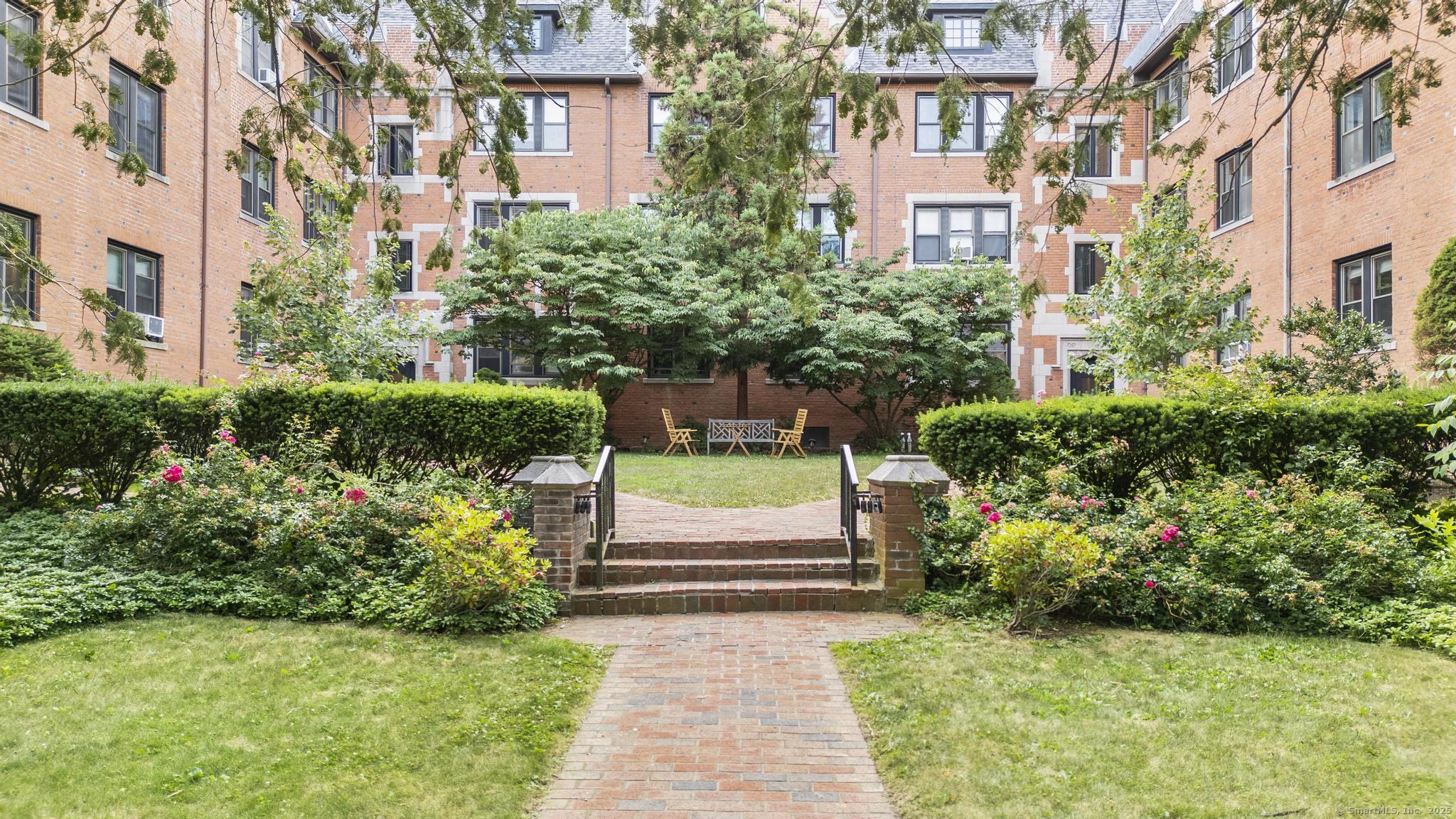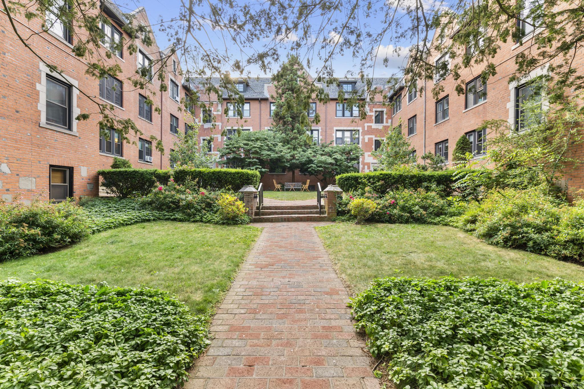 Seize this unique chance to own a main floor condo in the coveted Livingston Hill Complex, perfectly situated in East Rock's vibrant core, within the top-rated Worthington Hooker School district. Spanning 1125 sq ft, this freshly repainted home features soaring ceilings and rich hardwood floors that flow throughout. The expansive living area, bathed in natural light, showcases custom built-in shelving and a cozy brick fireplace, creating an inviting ambiance overlooking the courtyard. The elegant dining space is perfect for hosting gatherings. The renovated kitchen dazzles with sleek appliances, generous storage, and a chic tiled backsplash. Two well-appointed bedrooms with ample closets share a beautifully fully tiled bathroom with new vanity. Enjoy the convenience of private basement storage and shared laundry facilities. Step outside to the complex's picturesque courtyard for a tranquil retreat. Ideally located, you're moments from artisanal shops, East Rock Park, Yale shuttle stops, public transit, and a short stroll to downtown New Haven, Yale, and nearby hospitals.