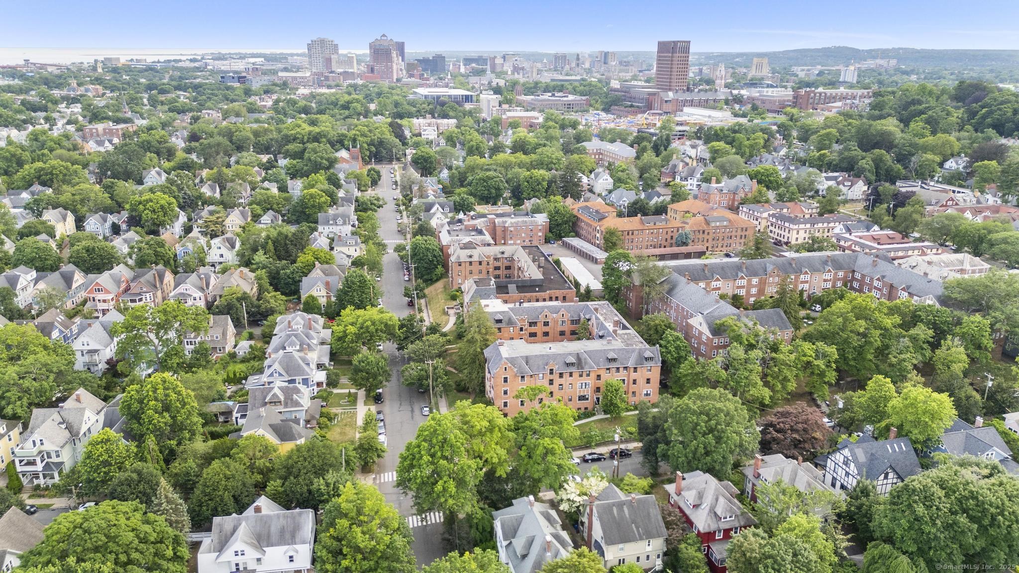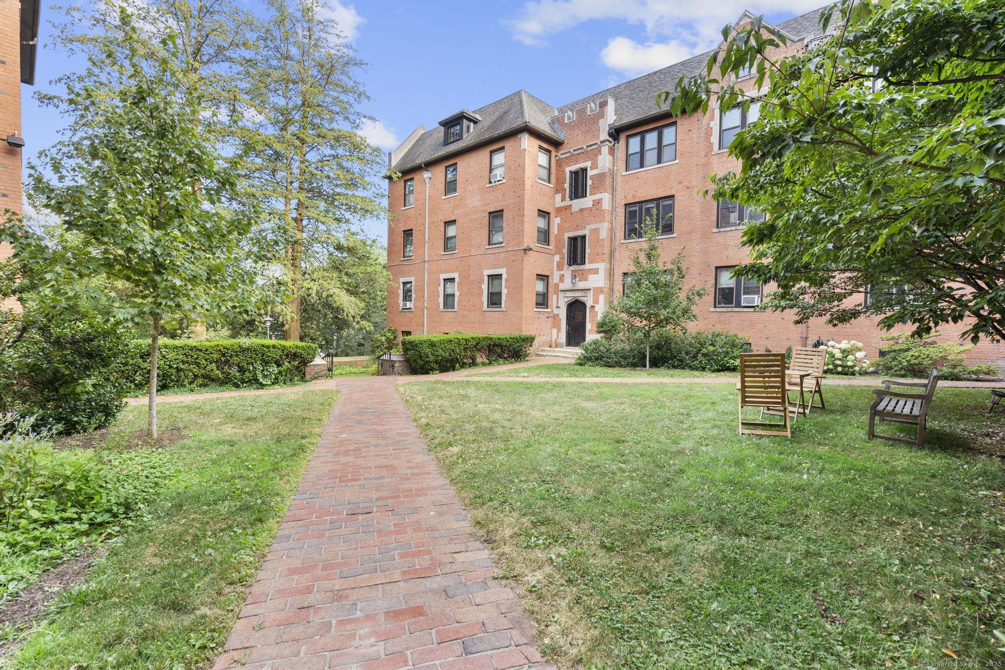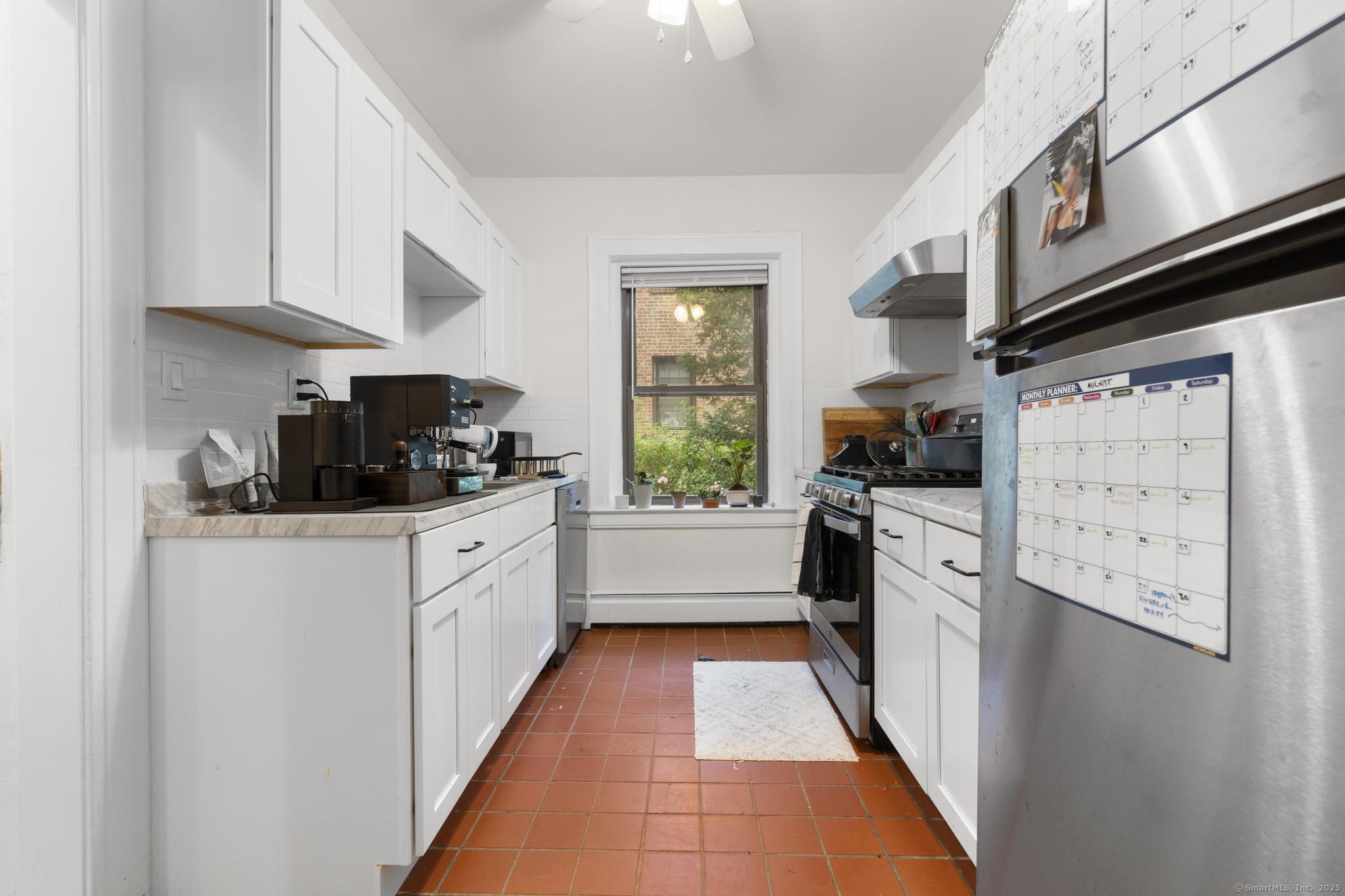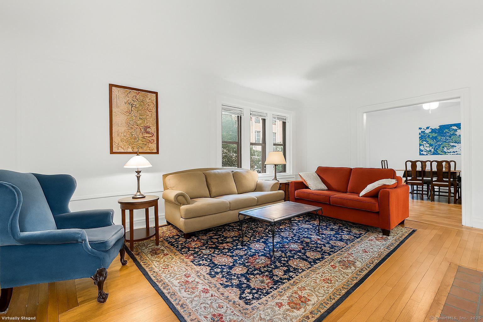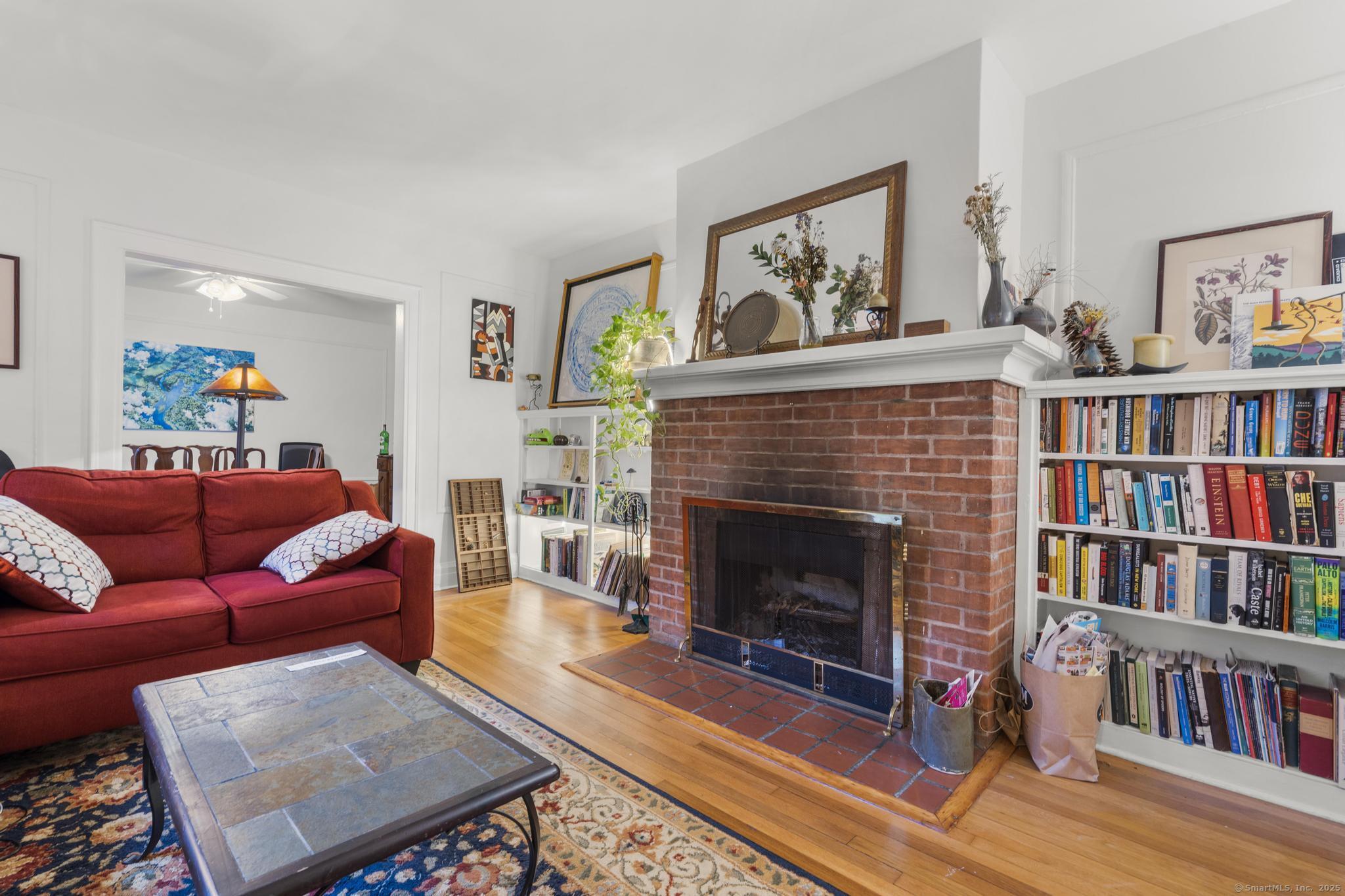 Seize this unique chance to own a main floor condo in the coveted Livingston Hill Complex, perfectly situated in East Rock's vibrant core, within the top-rated Worthington Hooker School district. Spanning 1125 sq ft, this freshly repainted home features soaring ceilings and rich hardwood floors that flow throughout. The expansive living area, bathed in natural light, showcases custom built-in shelving and a cozy brick fireplace, creating an inviting ambiance overlooking the courtyard. The elegant dining space is perfect for hosting gatherings. The renovated kitchen dazzles with sleek appliances, generous storage, and a chic tiled backsplash. Two well-appointed bedrooms with ample closets share a beautifully fully tiled bathroom with new vanity. Enjoy the convenience of private basement storage and shared laundry facilities. Step outside to the complex's picturesque courtyard for a tranquil retreat. Ideally located, you're moments from artisanal shops, East Rock Park, Yale shuttle stops, public transit, and a short stroll to downtown New Haven, Yale, and nearby hospitals.