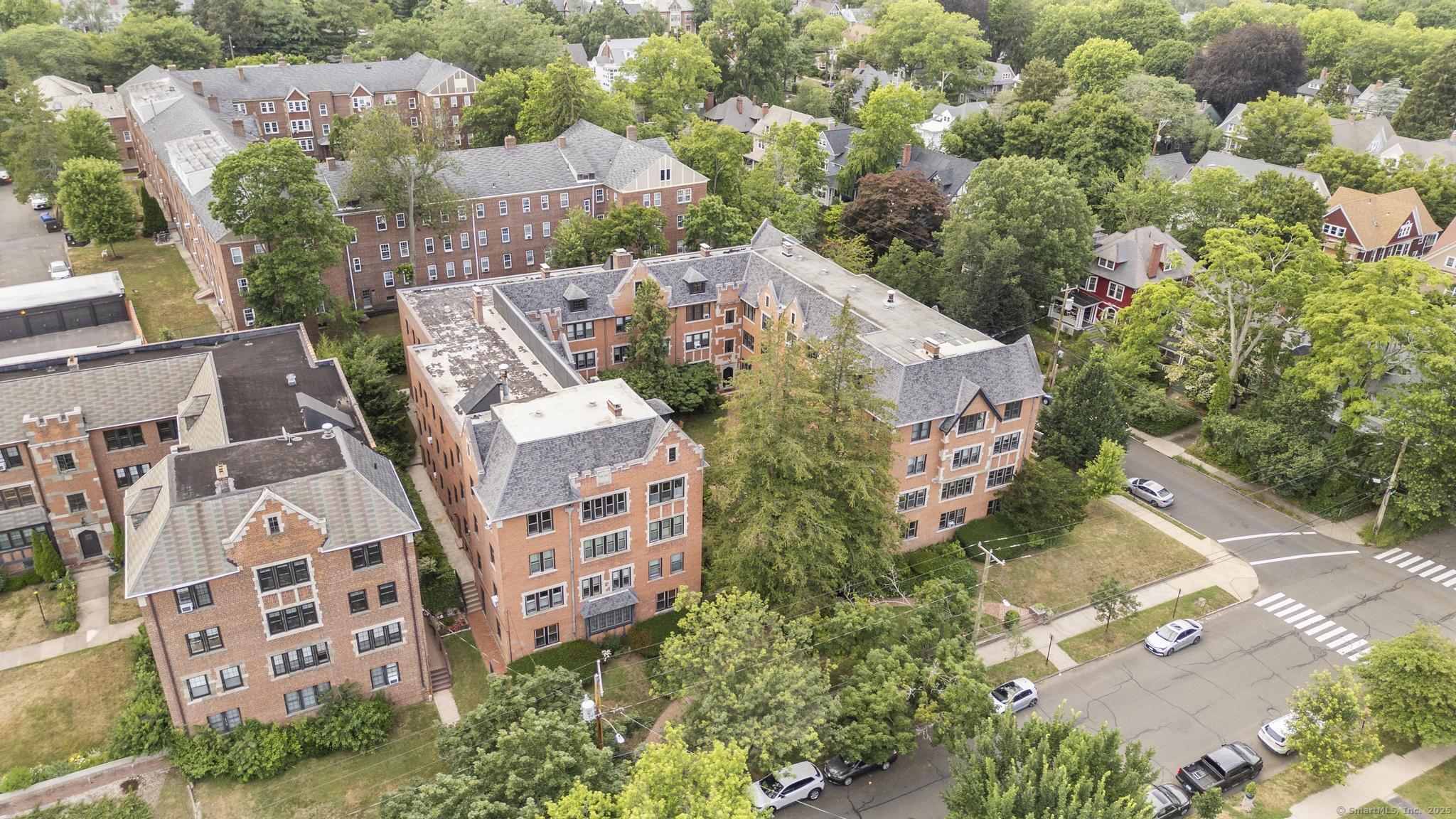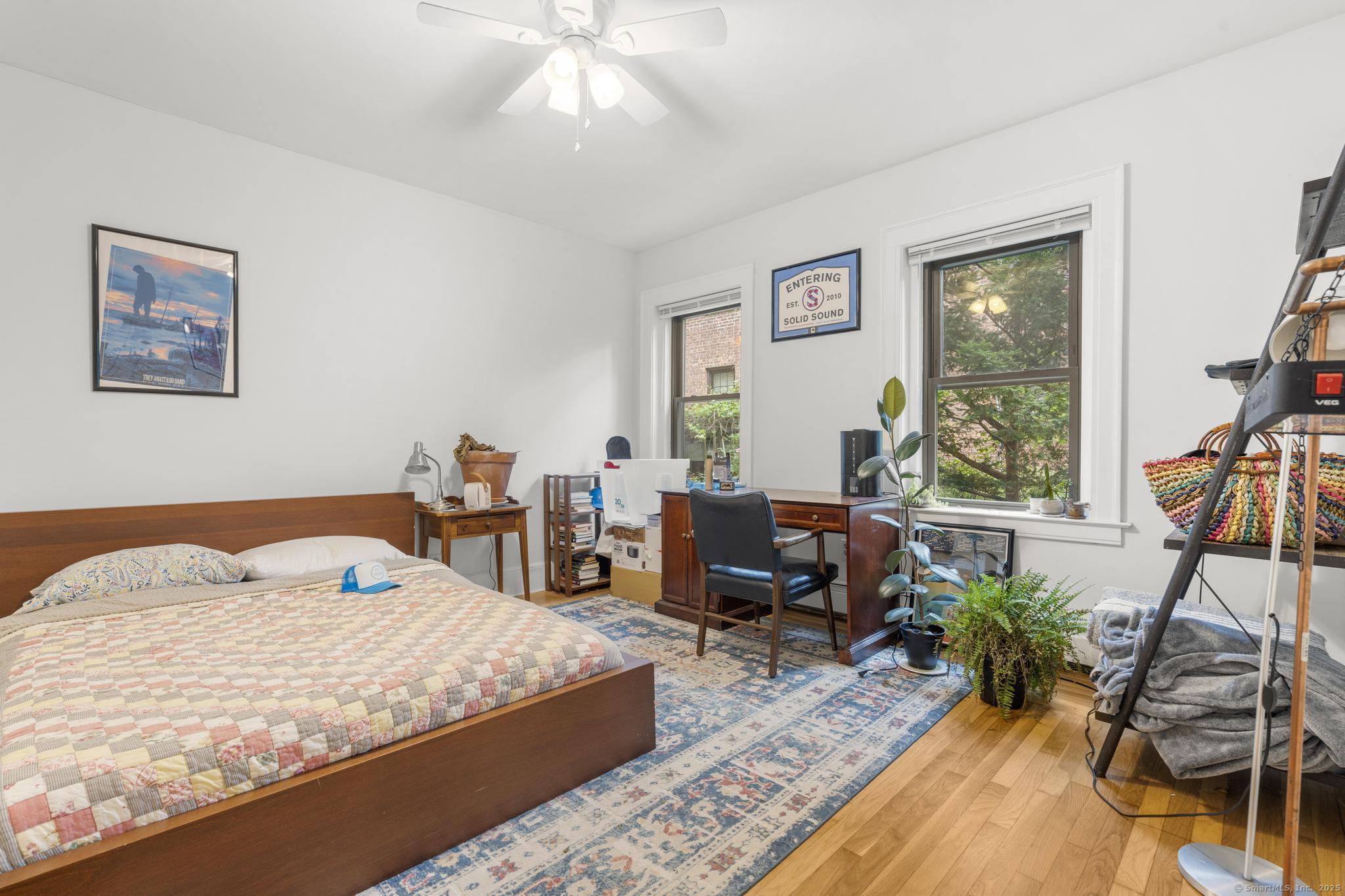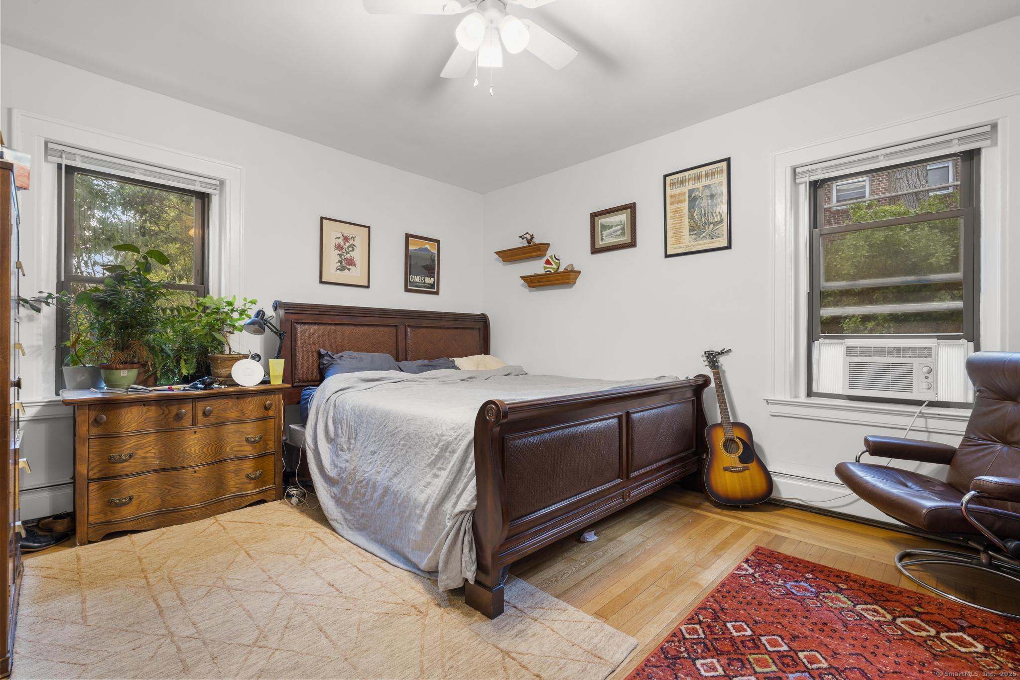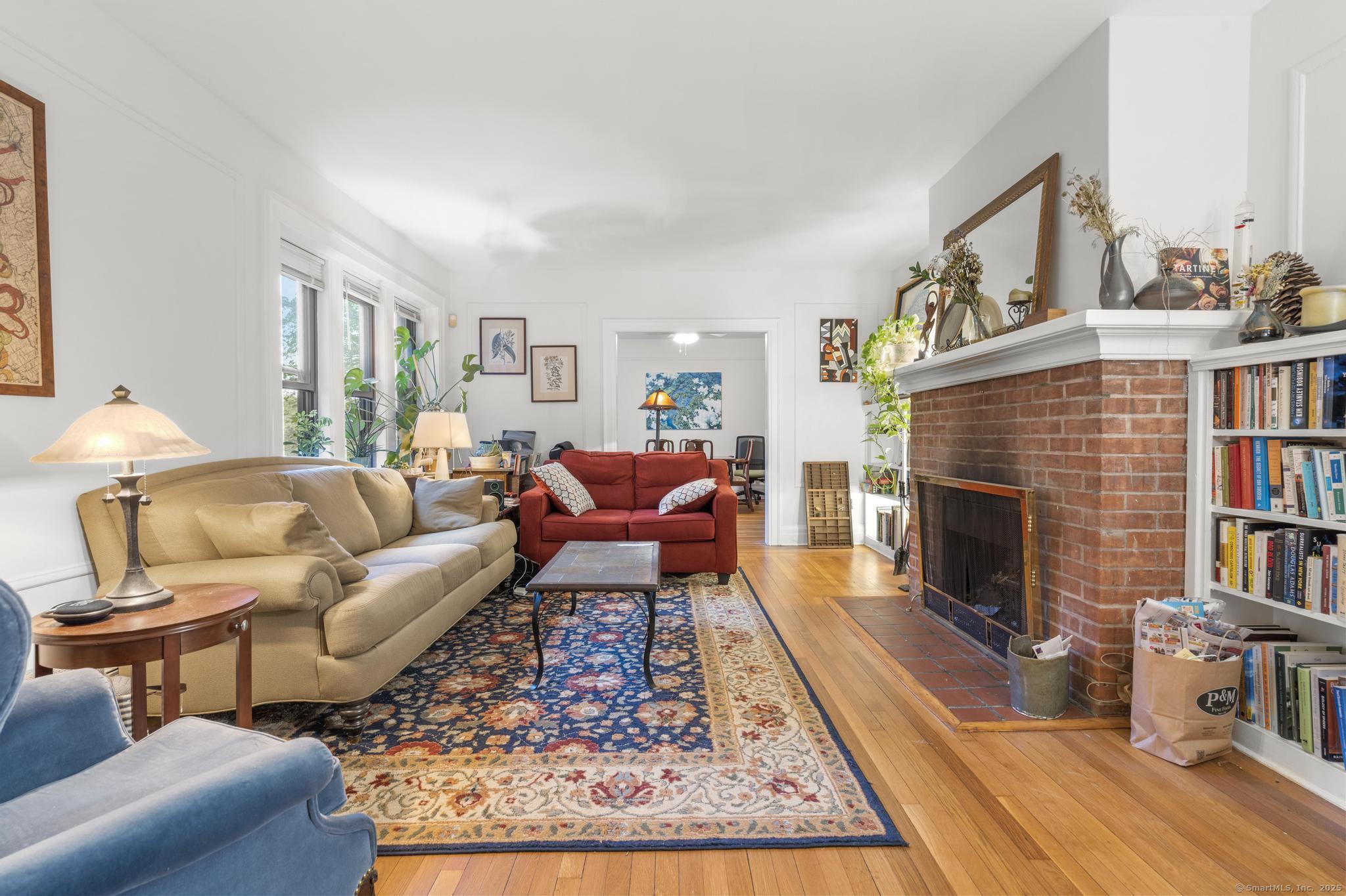Seize this unique chance to own a main floor condo in the coveted Livingston Hill Complex, perfectly situated in East Rock's vibrant core, within the top-rated Worthington Hooker School district. Spanning 1125 sq ft, this freshly repainted home features soaring ceilings and rich hardwood floors that flow throughout. The expansive living area, bathed in natural light, showcases custom built-in shelving and a cozy brick fireplace, creating an inviting ambiance overlooking the courtyard. The elegant dining space is perfect for hosting gatherings. The renovated kitchen dazzles with sleek appliances, generous storage, and a chic tiled backsplash. Two well-appointed bedrooms with ample closets share a beautifully fully tiled bathroom with new vanity. Enjoy the convenience of private basement storage and shared laundry facilities. Step outside to the complex's picturesque courtyard for a tranquil retreat. Ideally located, you're moments from artisanal shops, East Rock Park, Yale shuttle stops, public transit, and a short stroll to downtown New Haven, Yale, and nearby hospitals.
