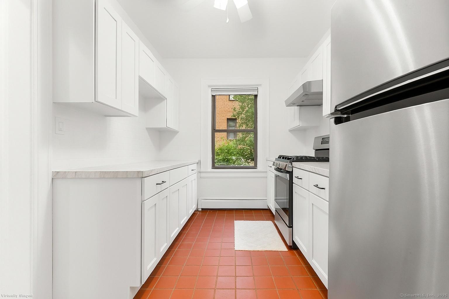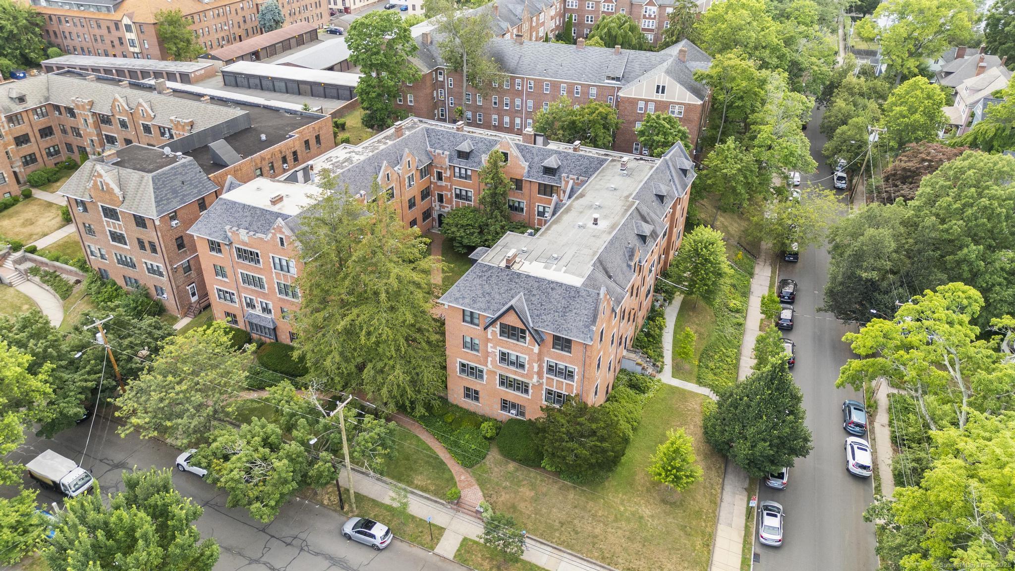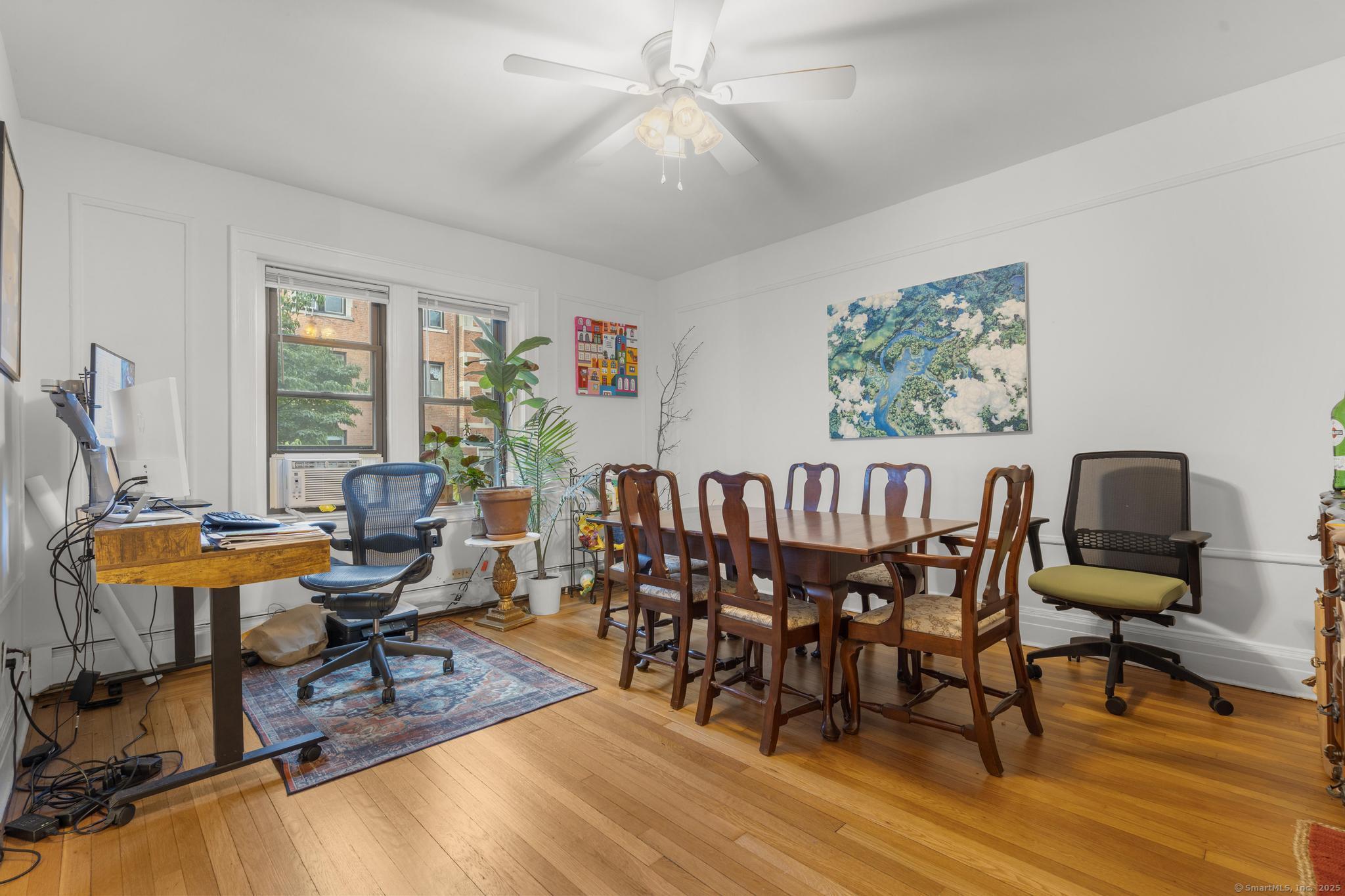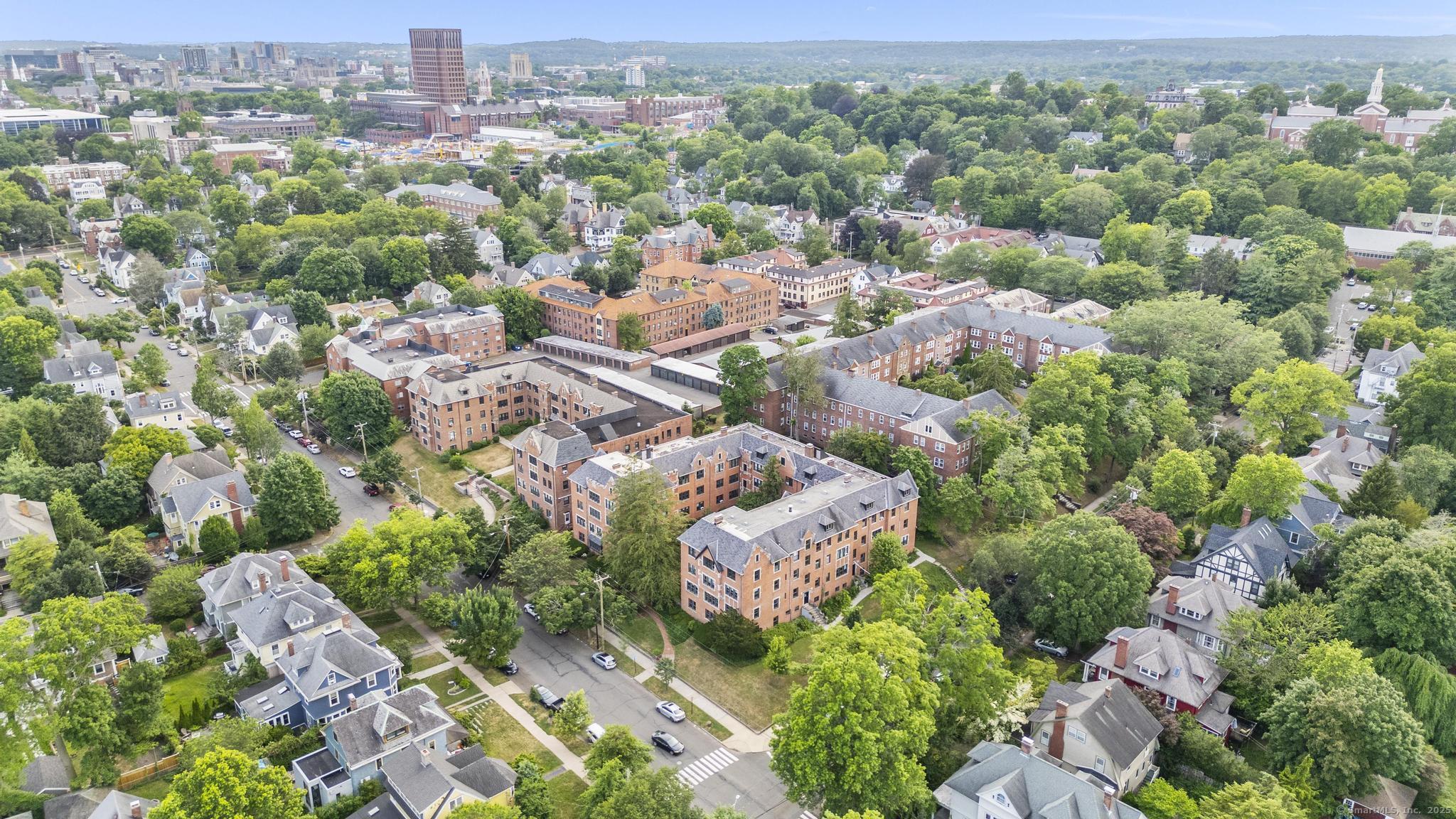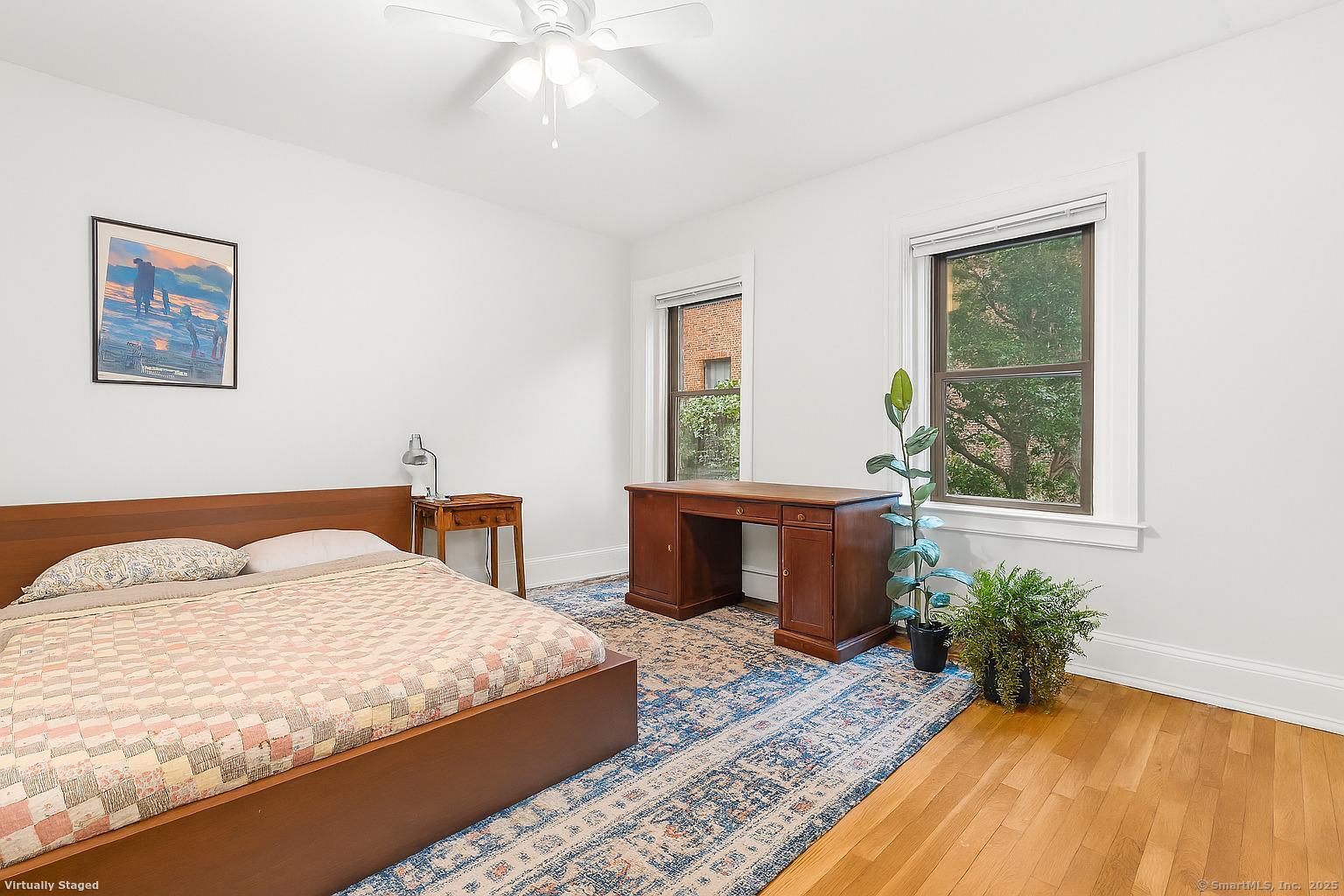 Seize this unique chance to own a main floor condo in the coveted Livingston Hill Complex, perfectly situated in East Rock's vibrant core, within the top-rated Worthington Hooker School district. Spanning 1125 sq ft, this freshly repainted home features soaring ceilings and rich hardwood floors that flow throughout. The expansive living area, bathed in natural light, showcases custom built-in shelving and a cozy brick fireplace, creating an inviting ambiance overlooking the courtyard. The elegant dining space is perfect for hosting gatherings. The renovated kitchen dazzles with sleek appliances, generous storage, and a chic tiled backsplash. Two well-appointed bedrooms with ample closets share a beautifully fully tiled bathroom with new vanity. Enjoy the convenience of private basement storage and shared laundry facilities. Step outside to the complex's picturesque courtyard for a tranquil retreat. Ideally located, you're moments from artisanal shops, East Rock Park, Yale shuttle stops, public transit, and a short stroll to downtown New Haven, Yale, and nearby hospitals.