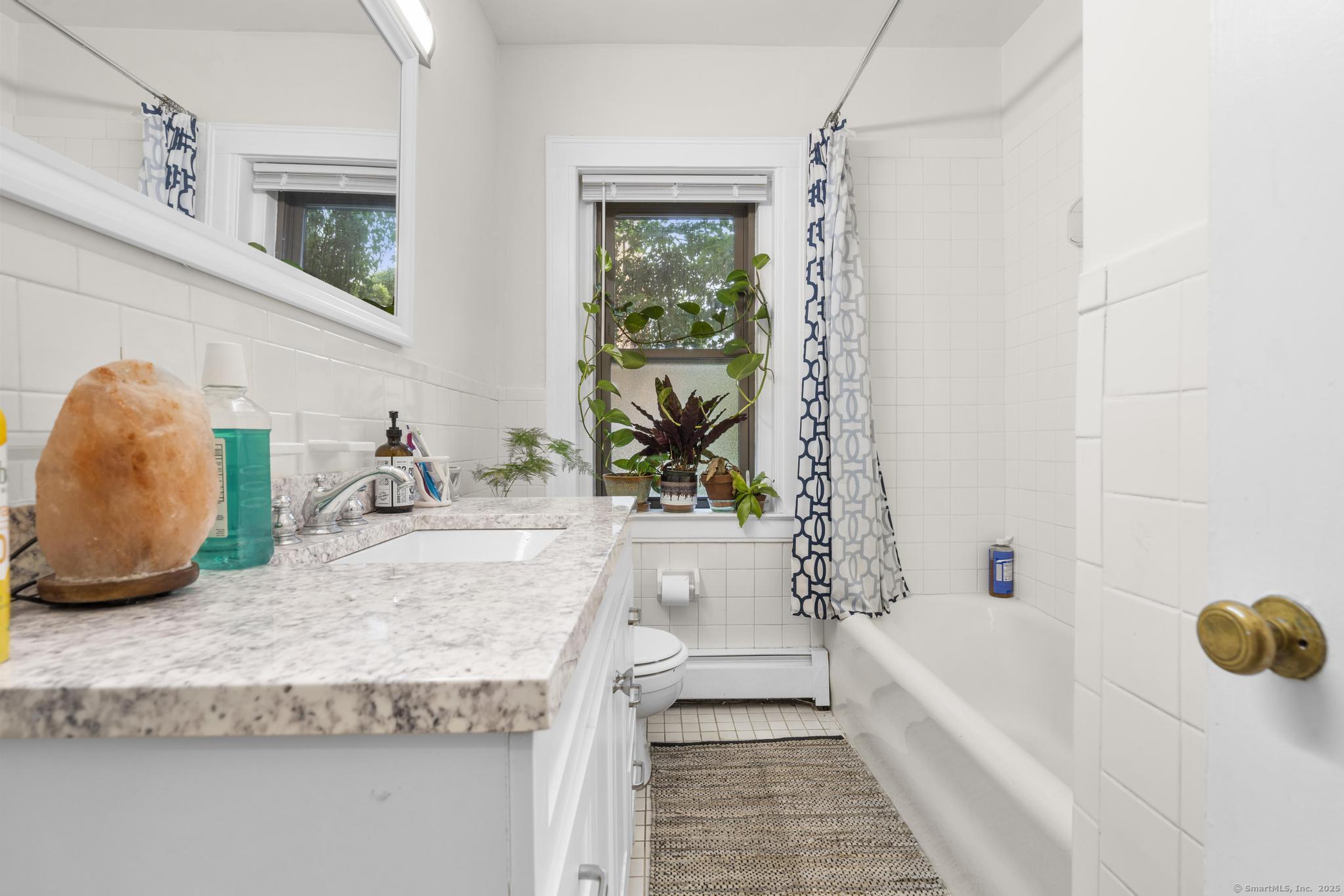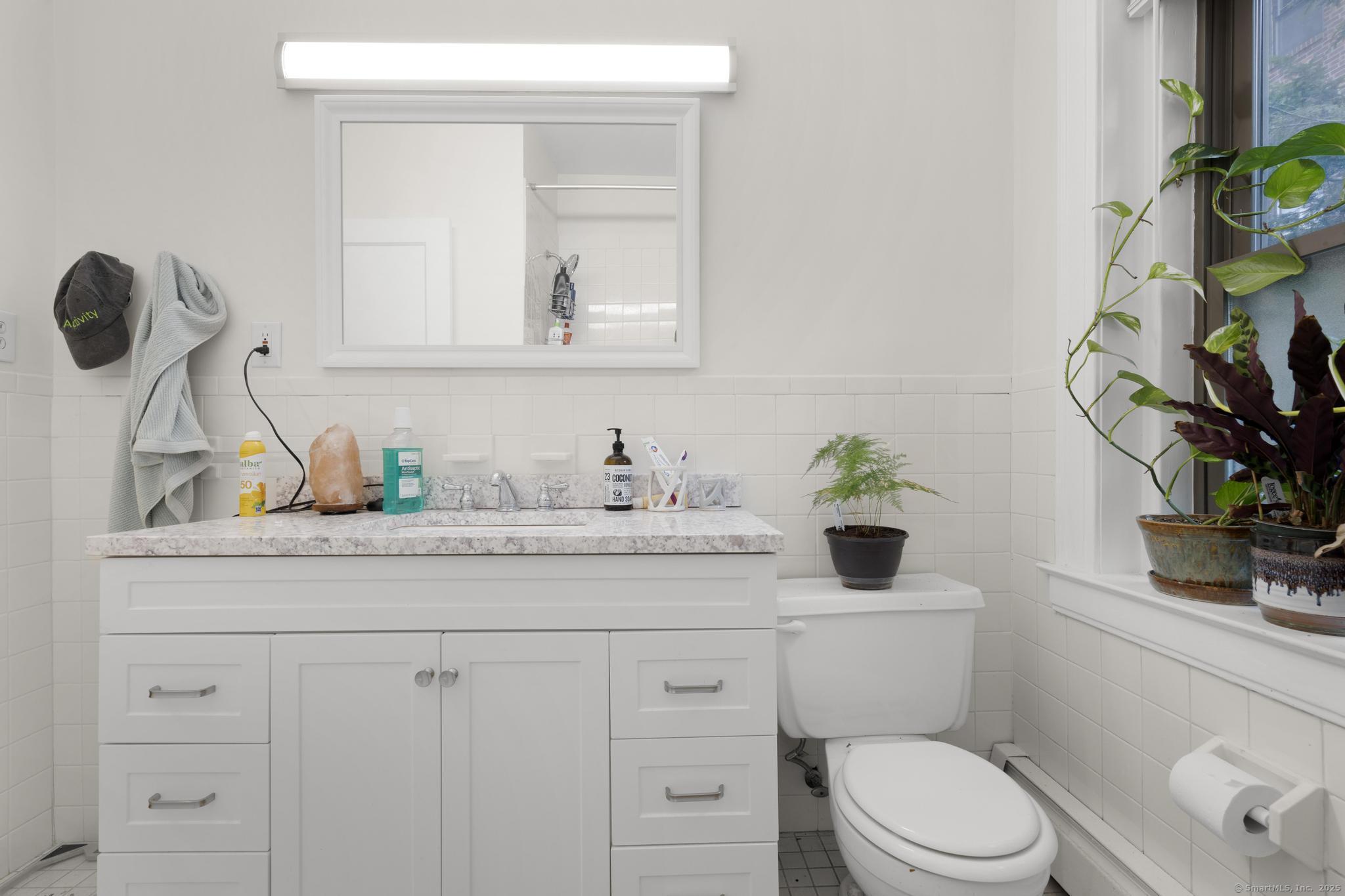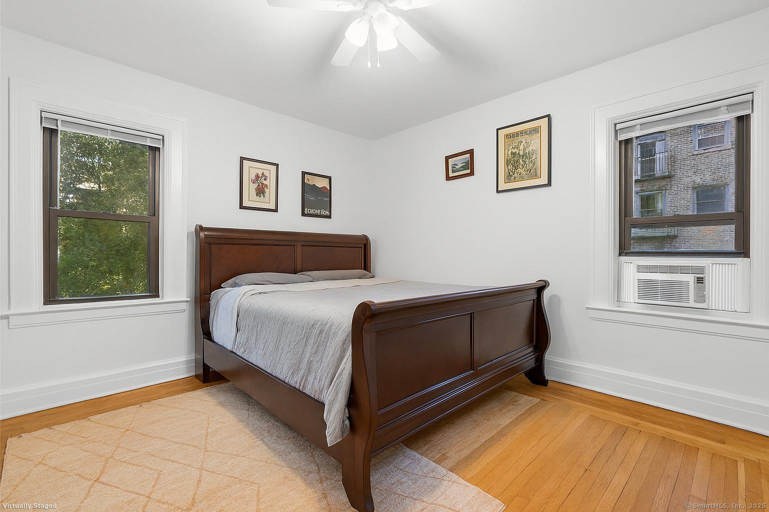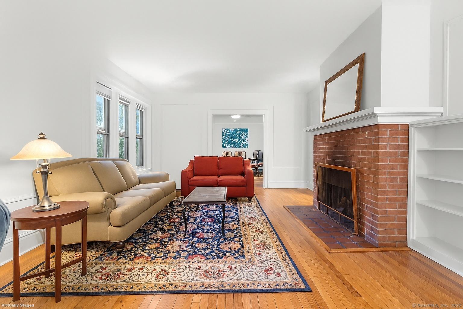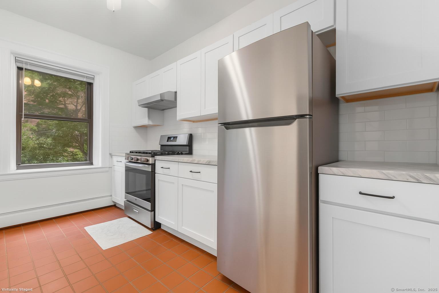 Seize this unique chance to own a main floor condo in the coveted Livingston Hill Complex, perfectly situated in East Rock's vibrant core, within the top-rated Worthington Hooker School district. Spanning 1125 sq ft, this freshly repainted home features soaring ceilings and rich hardwood floors that flow throughout. The expansive living area, bathed in natural light, showcases custom built-in shelving and a cozy brick fireplace, creating an inviting ambiance overlooking the courtyard. The elegant dining space is perfect for hosting gatherings. The renovated kitchen dazzles with sleek appliances, generous storage, and a chic tiled backsplash. Two well-appointed bedrooms with ample closets share a beautifully fully tiled bathroom with new vanity. Enjoy the convenience of private basement storage and shared laundry facilities. Step outside to the complex's picturesque courtyard for a tranquil retreat. Ideally located, you're moments from artisanal shops, East Rock Park, Yale shuttle stops, public transit, and a short stroll to downtown New Haven, Yale, and nearby hospitals.