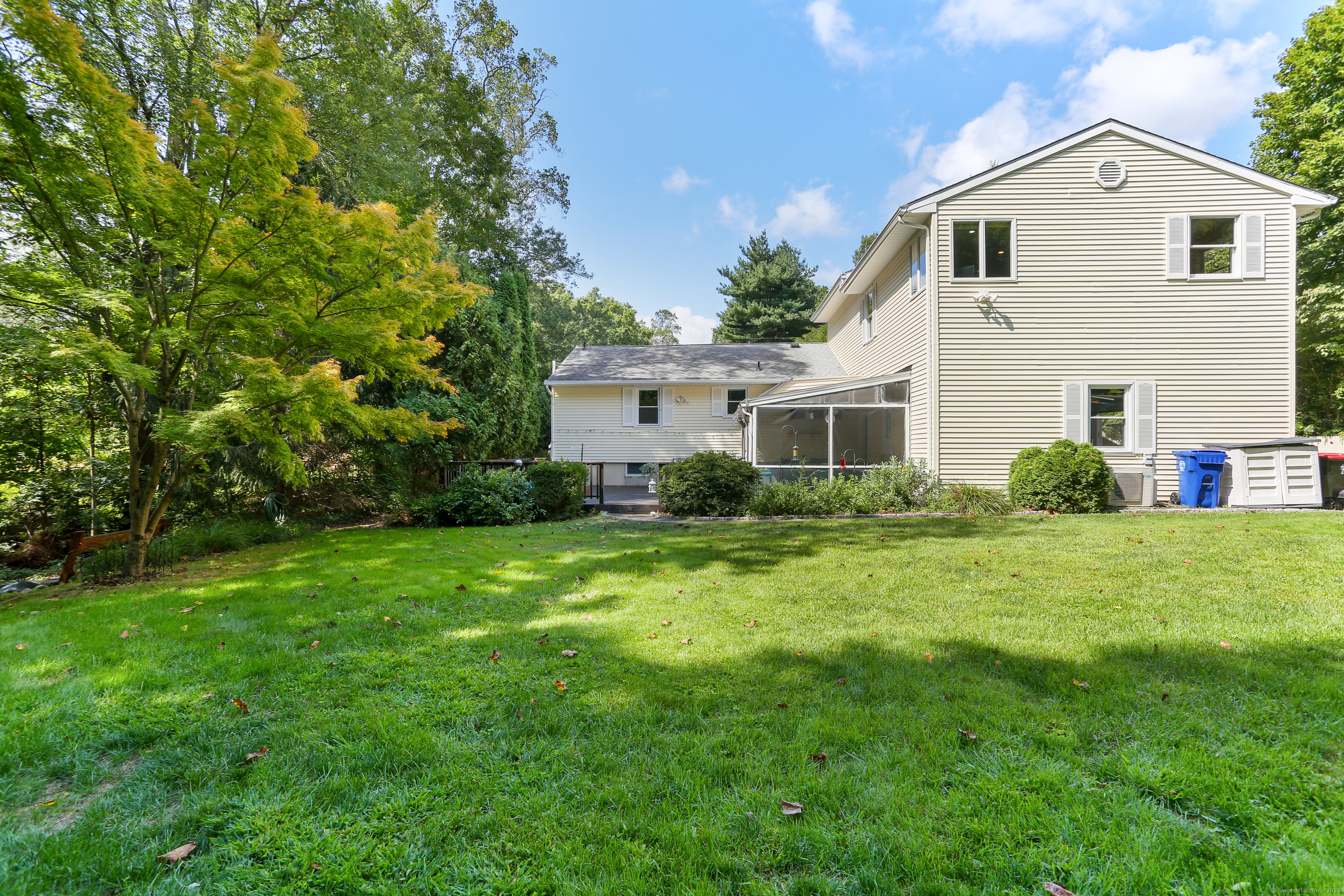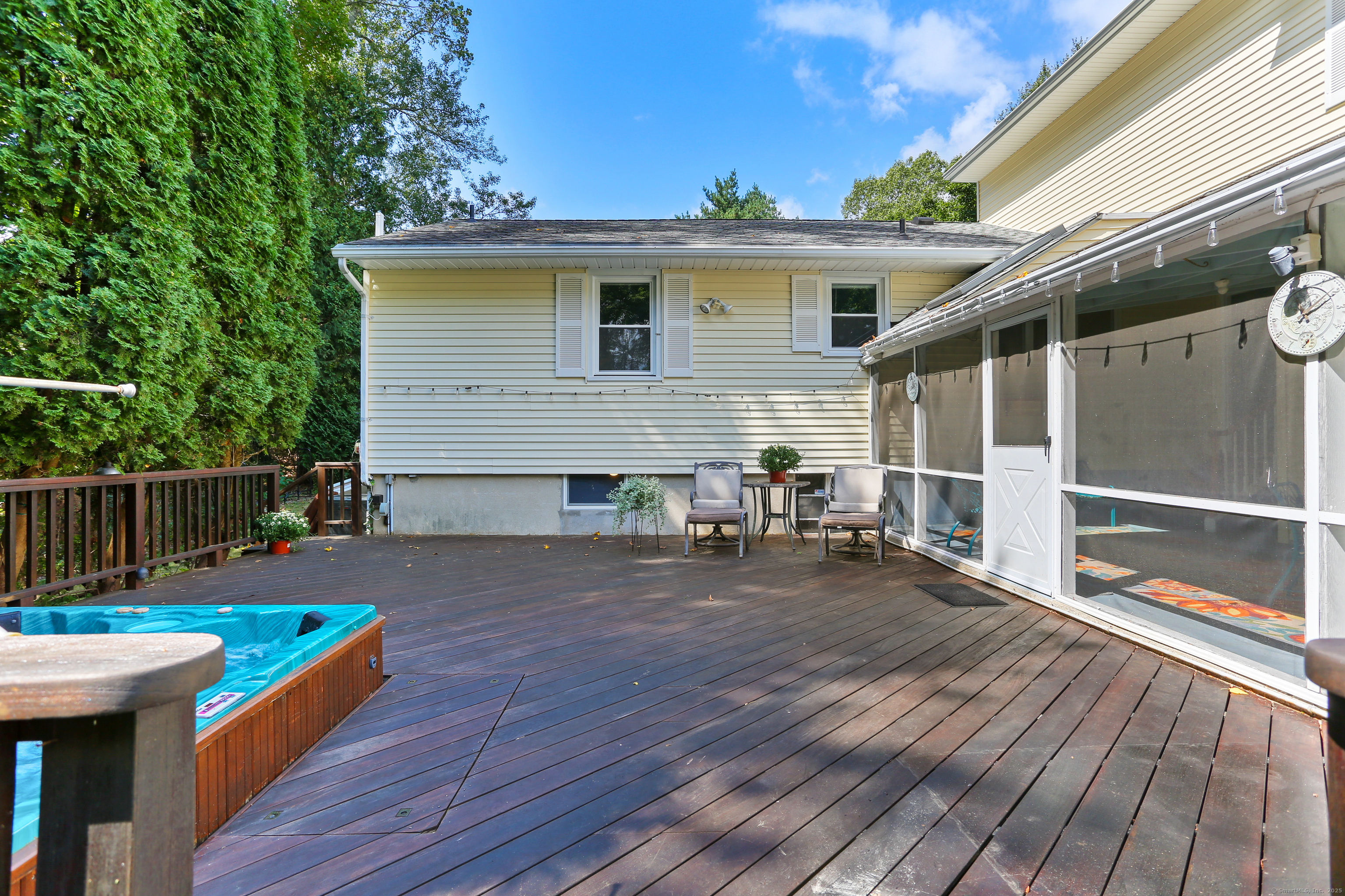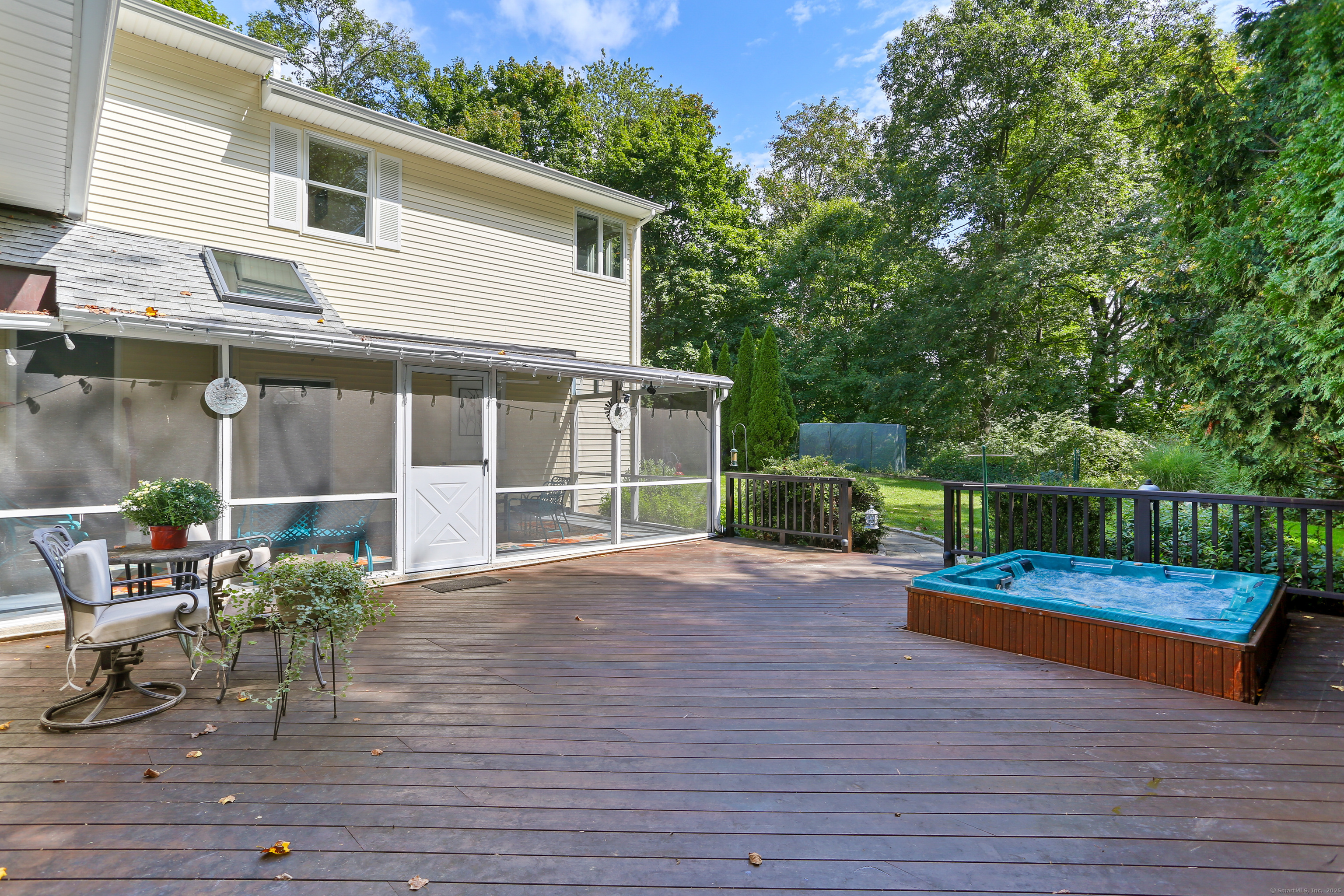 This beautiful ranch has been expanded with a second floor that includes an office space, a playroom and a huge (ready to finish) space that would make a great primary suite! With 2,126 sq ft of living space as well as an additional 1642 sq ft in the lower level there is plenty of room for everyone. Situated on 0.71 acres with lush landscaping and privacy screening trees, the property features an Outdoor Oasis with huge screened porch, teak deck and hot tub. The main floor includes the primary bedroom with private bath, two additional bedrooms with a large hall bathroom with double sinks, living room with oversized fireplace, dining room with charming original built ins, eat in kitchen and mud room. Hardwood floors throughout the main living areas create a warm and inviting atmosphere. The lower level provides additional recreation space with a second fireplace and ample room for games, lounging, workouts or storage. 2 exterior sheds (one with electricity, heat and a/c) complete the property. This impeccably maintained and versatile home is "move in ready" or can be customized to suit your lifestyle.