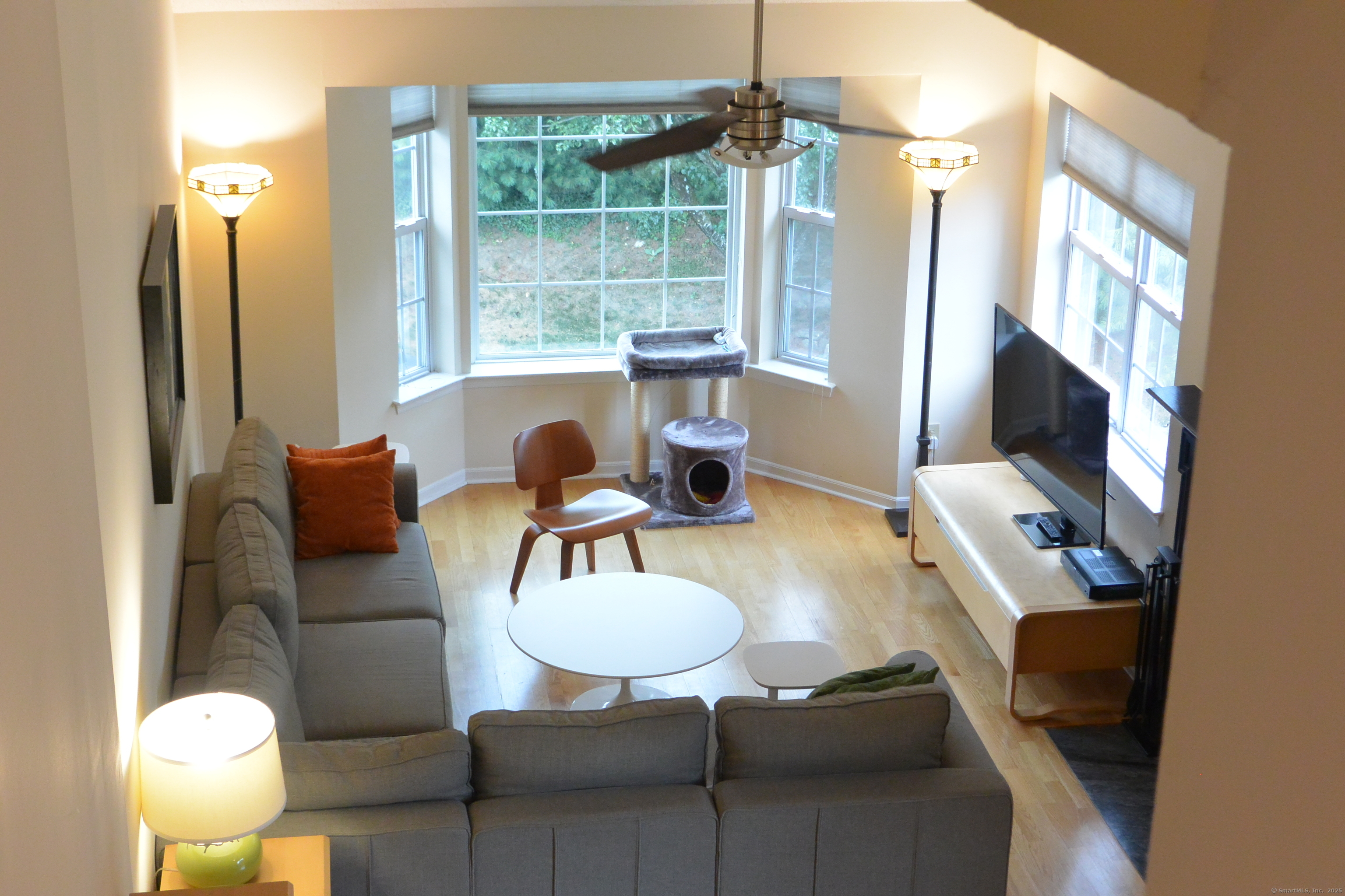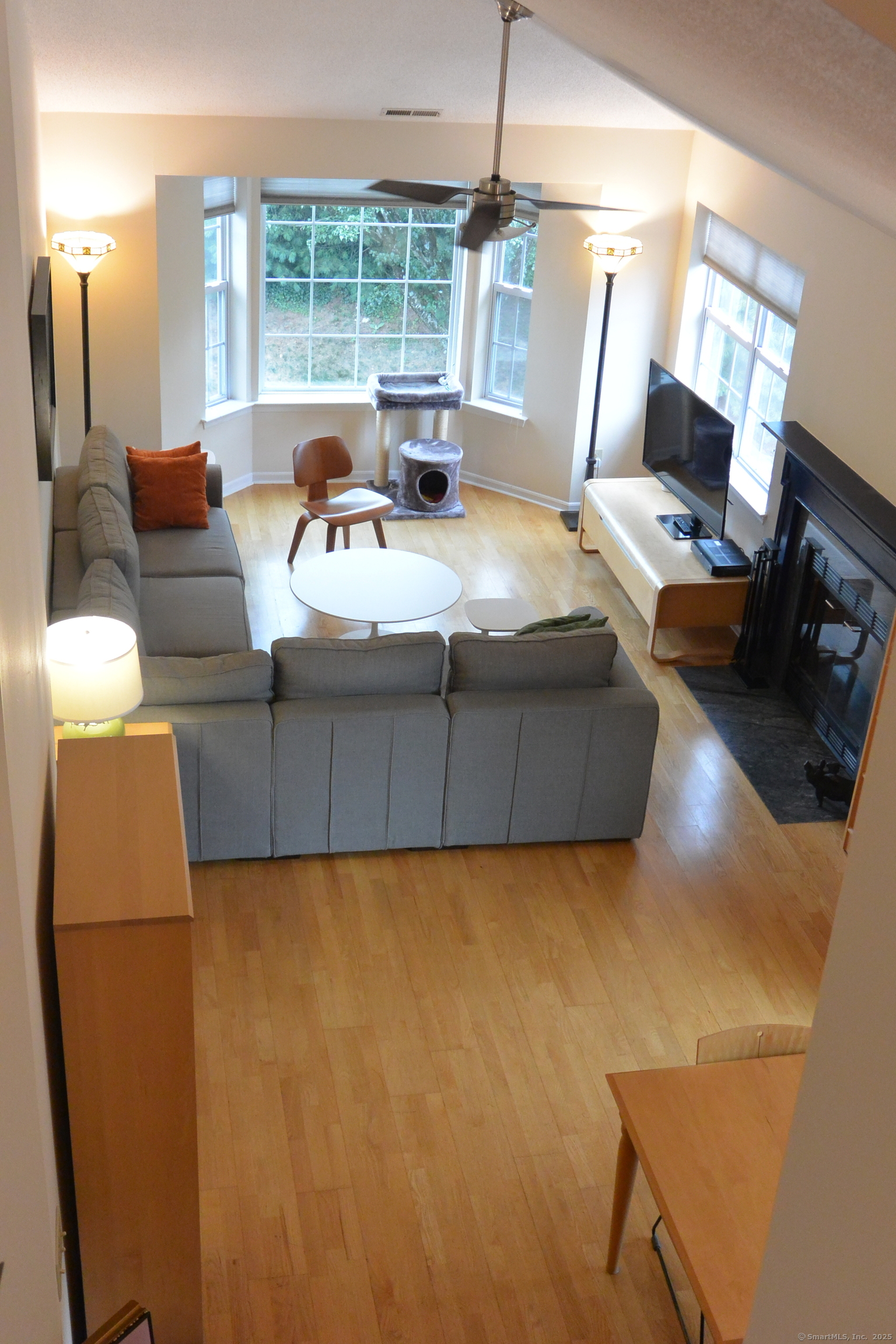 Bright and sunny end unit! Two bedroom, two full bath condo with beautiful hardwood floors, cathedral ceiling, fireplace, deck overlooking grass and quiet pond. The loft provides extra space for office, etc. One car attached garage, plus plenty of parking, beautiful swimming pool, convenient to all.