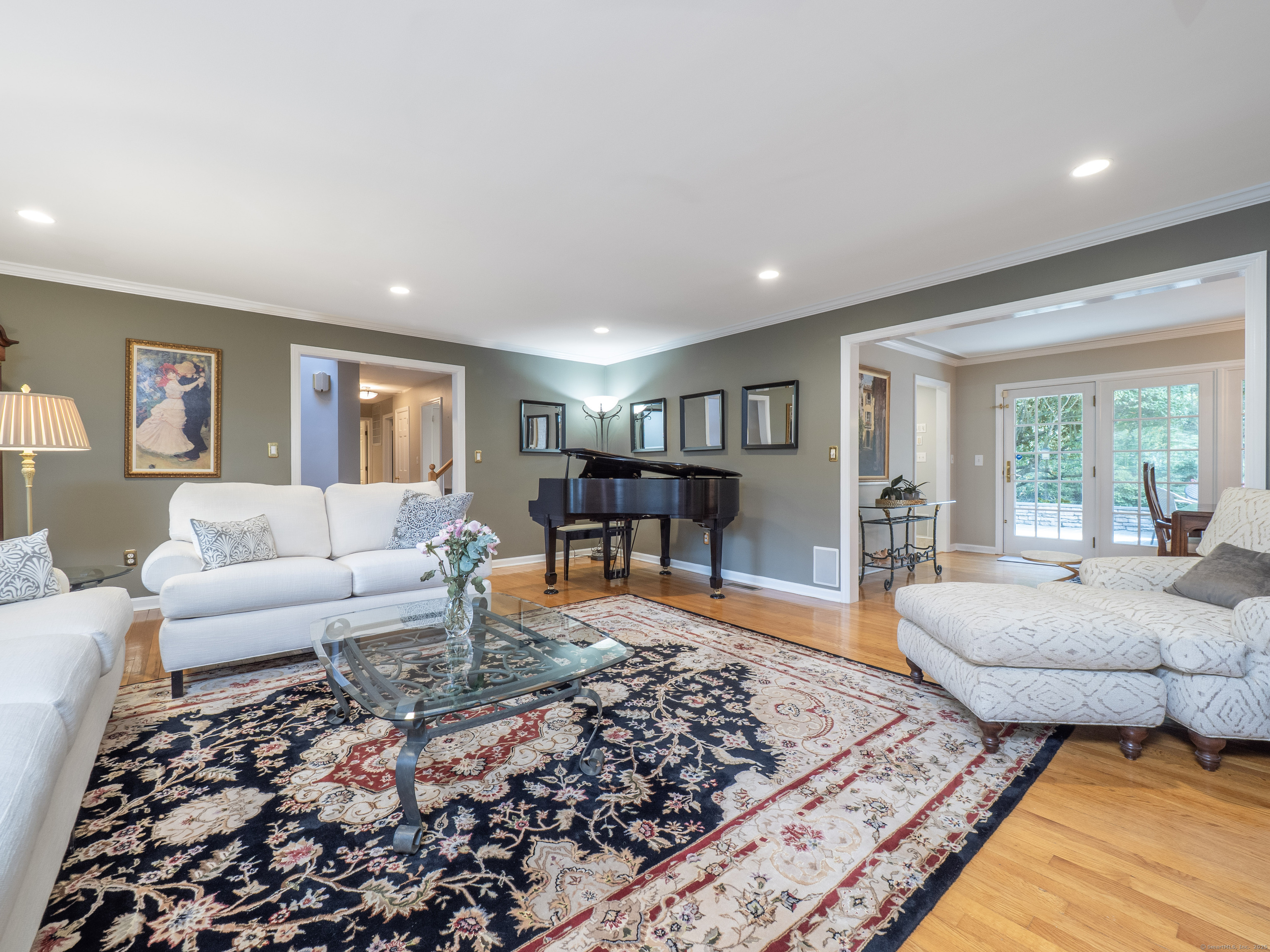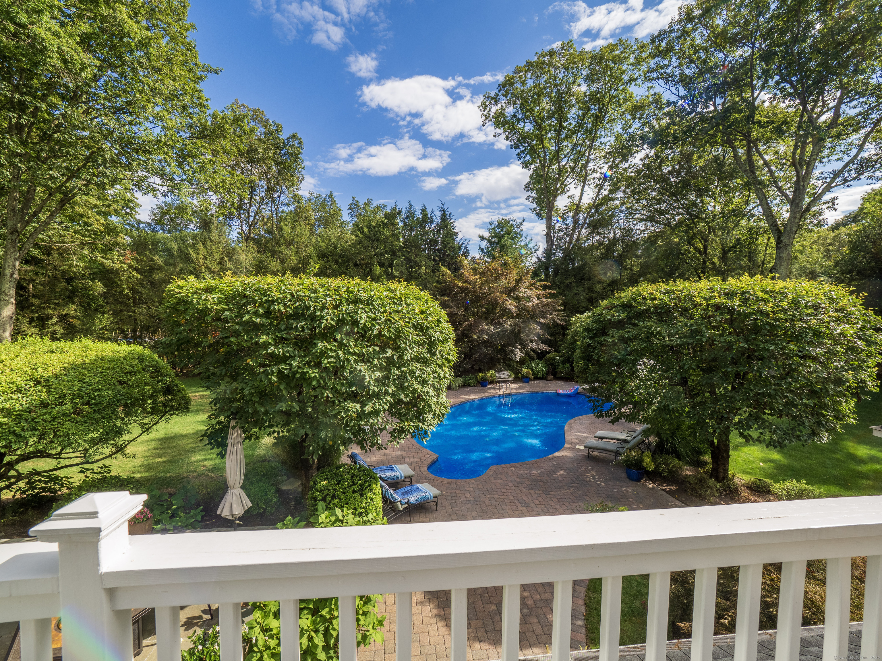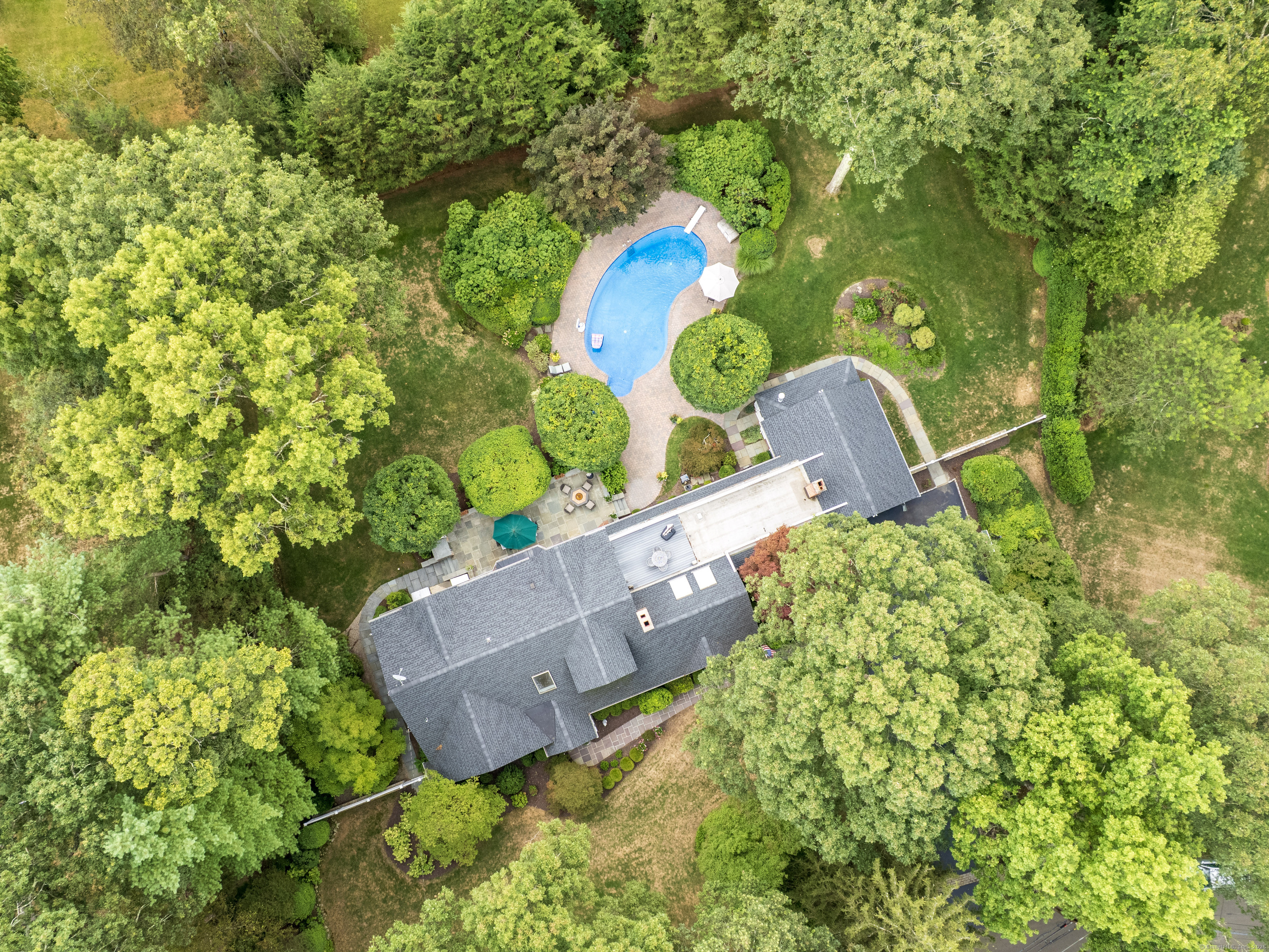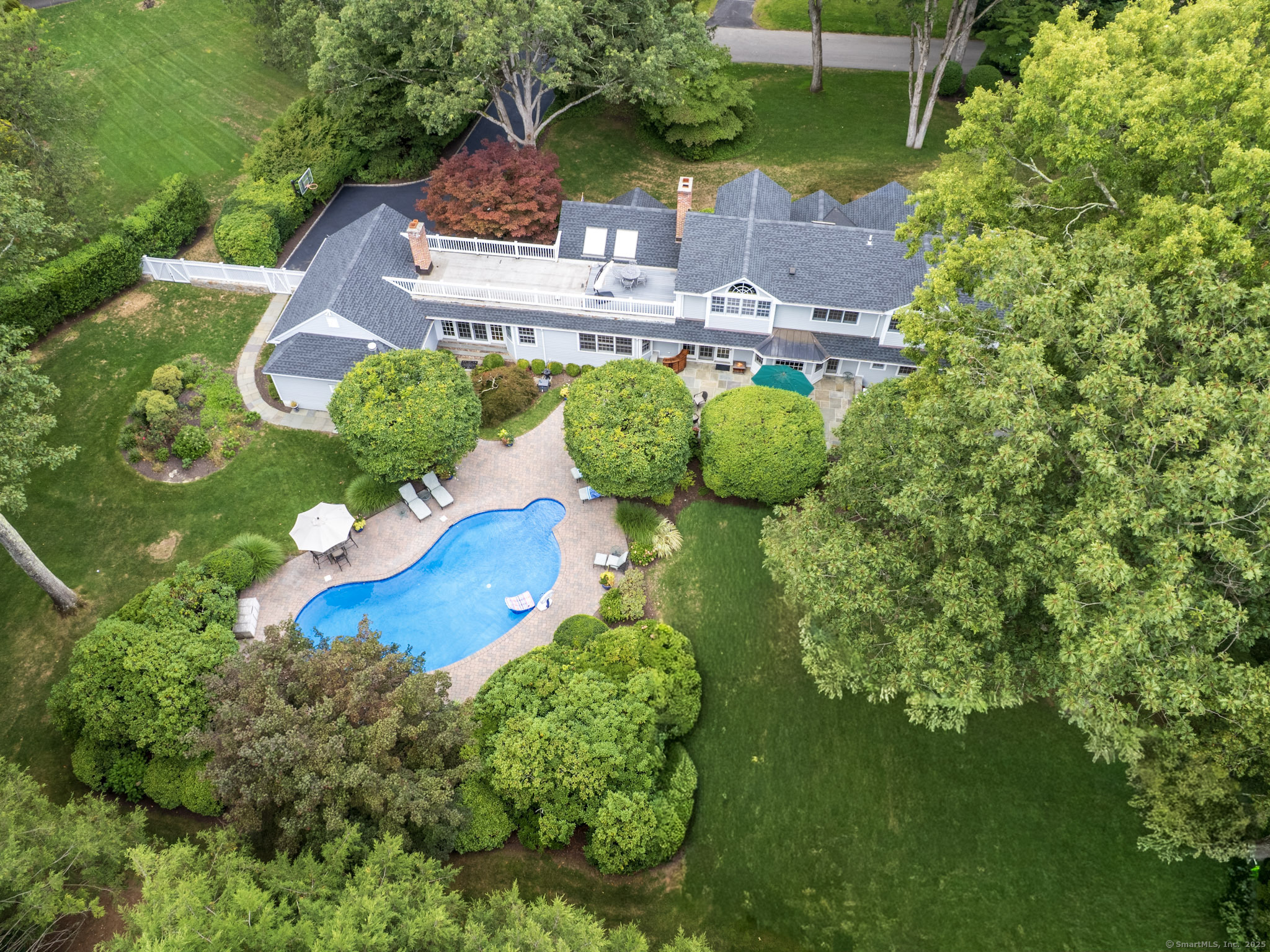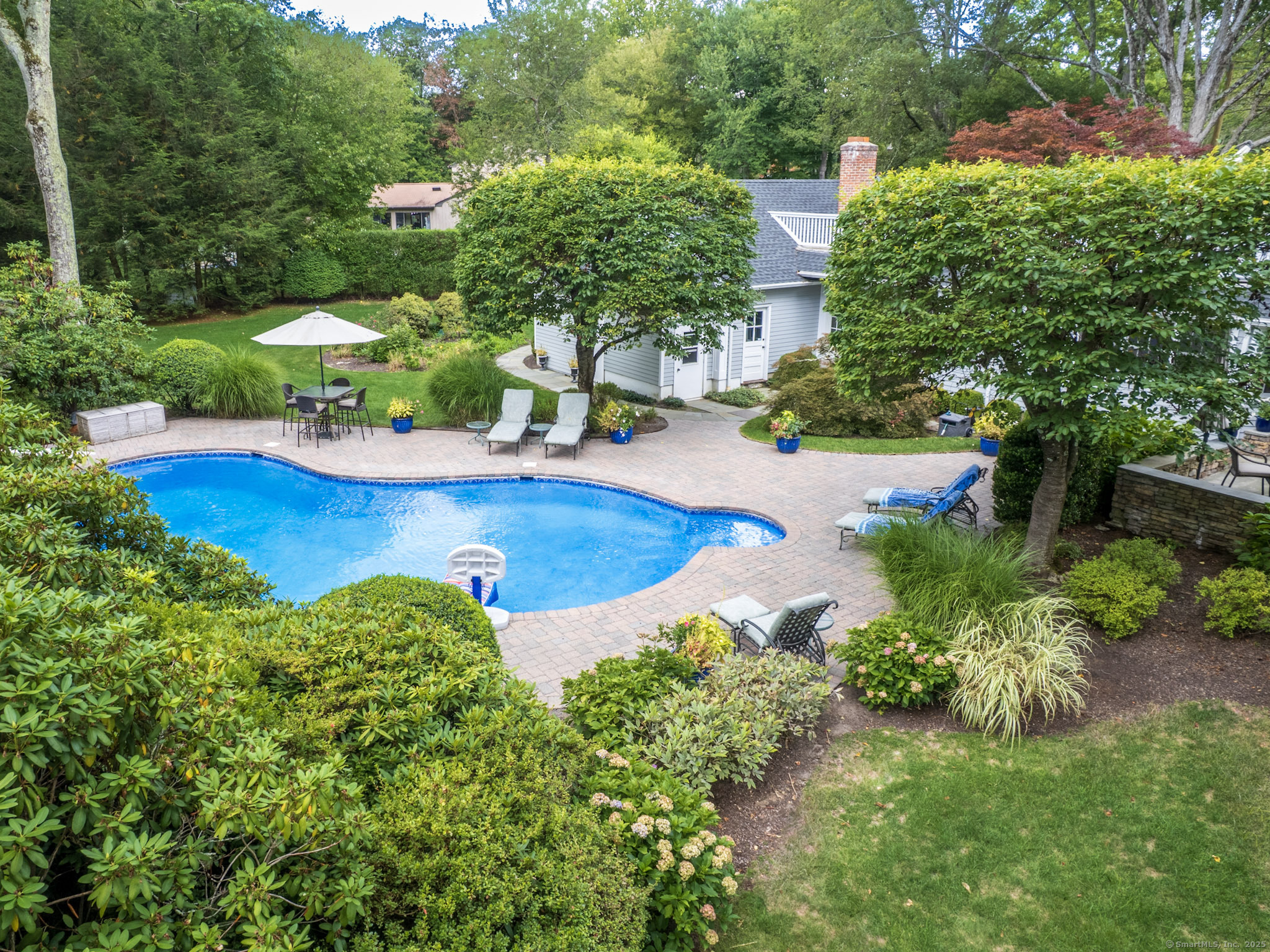 Welcome to 9 Singing Woods Road, a stunning Silvermine 4-5 bedroom home where lush grounds, elegant interiors, and a resort-style pool create the perfect retreat. Set on a professionally landscaped acre, enjoy a heated in-ground gunite pool and open-concept living designed for both relaxation and entertaining. Inside, host elegant dinner parties in the formal dining room. The living room invites conversation, and the family room is a perfect place to relax. The inviting eat-in kitchen boasts stone countertops and radiant heated floors. A sunroom with French doors overlooks the pool, while a massive stone patio with built-in grill and refrigerator sets the stage for effortless outdoor living. An integrated audio system carries music inside and out. Upstairs, the private primary suite spans the entire level with a spacious bedroom, walk-in closet, and spa-inspired bath featuring a jetted tub, oversized glass shower, and radiant heated floors. A full-size office-equal in scale to the bedroom-opens to a rooftop deck with views of the pool and backyard. Additional highlights include two fireplaces, a large finished basement, and an expanded three-car garage (two in tandem). Freshly painted and meticulously maintained, the home offers Hardie board siding, a new roof, and public water. Just a short stroll from GrayBarns, minutes to both I-95 and Merritt, this exceptional residence blends timeless style with modern comfort.