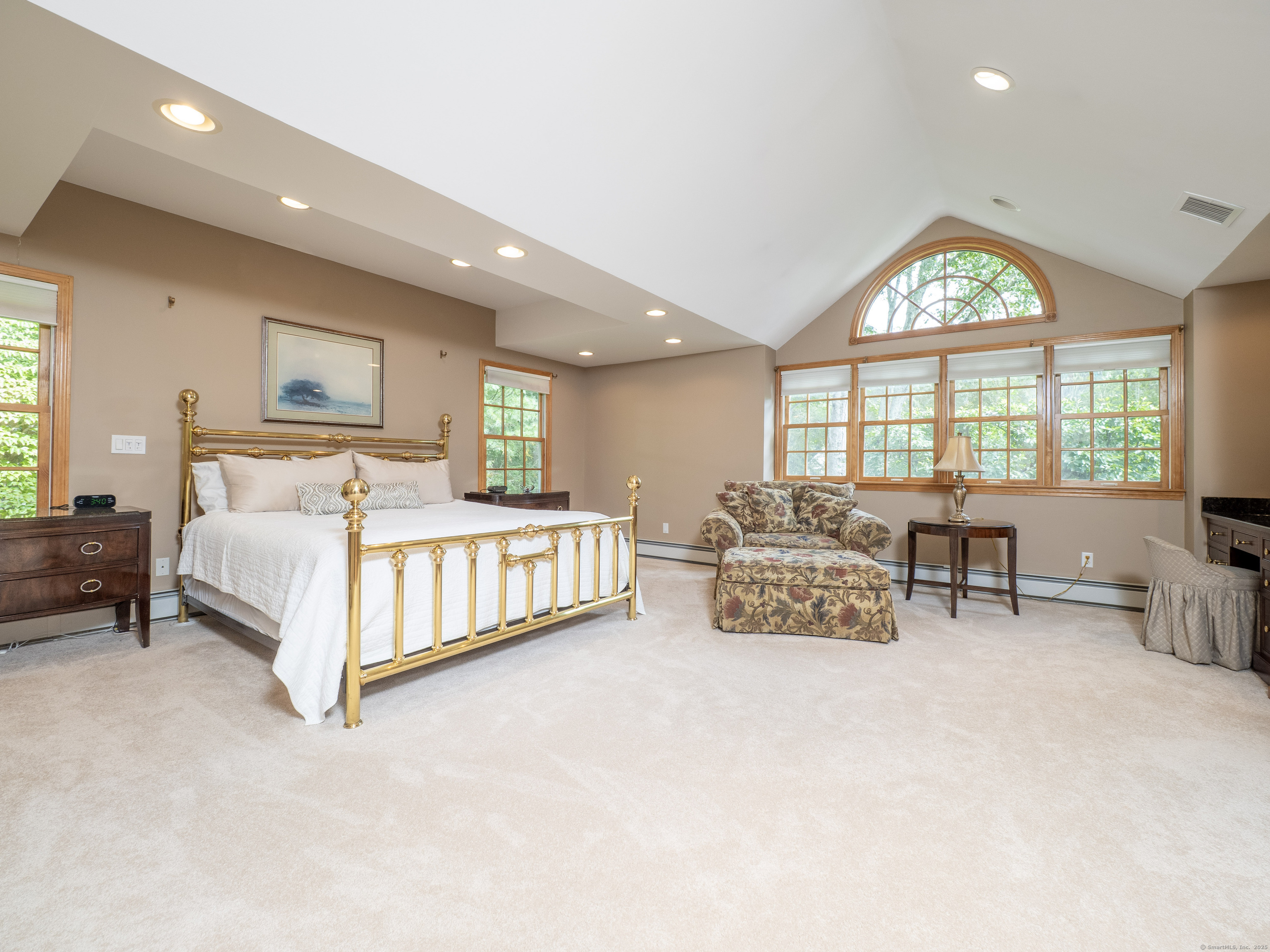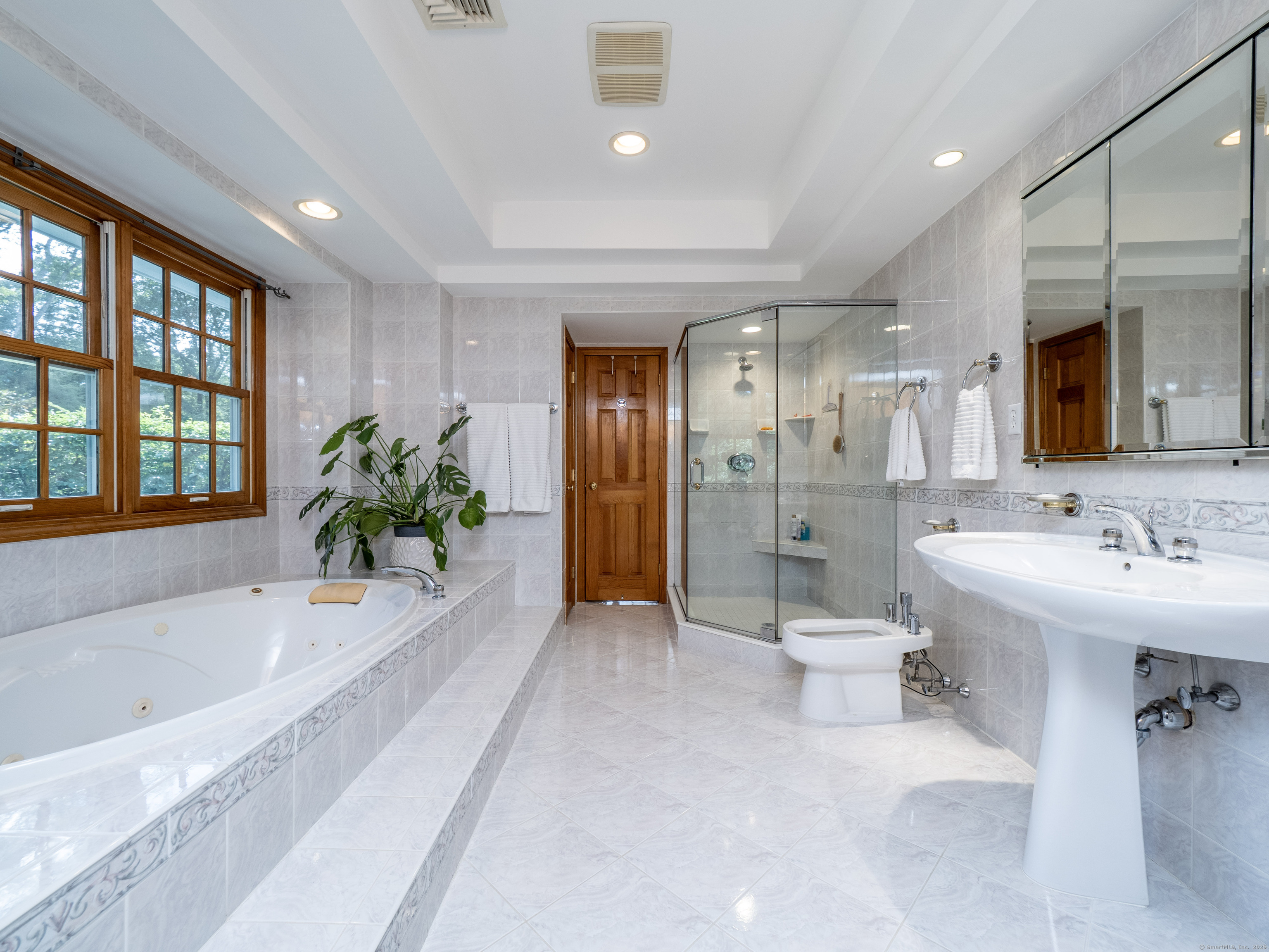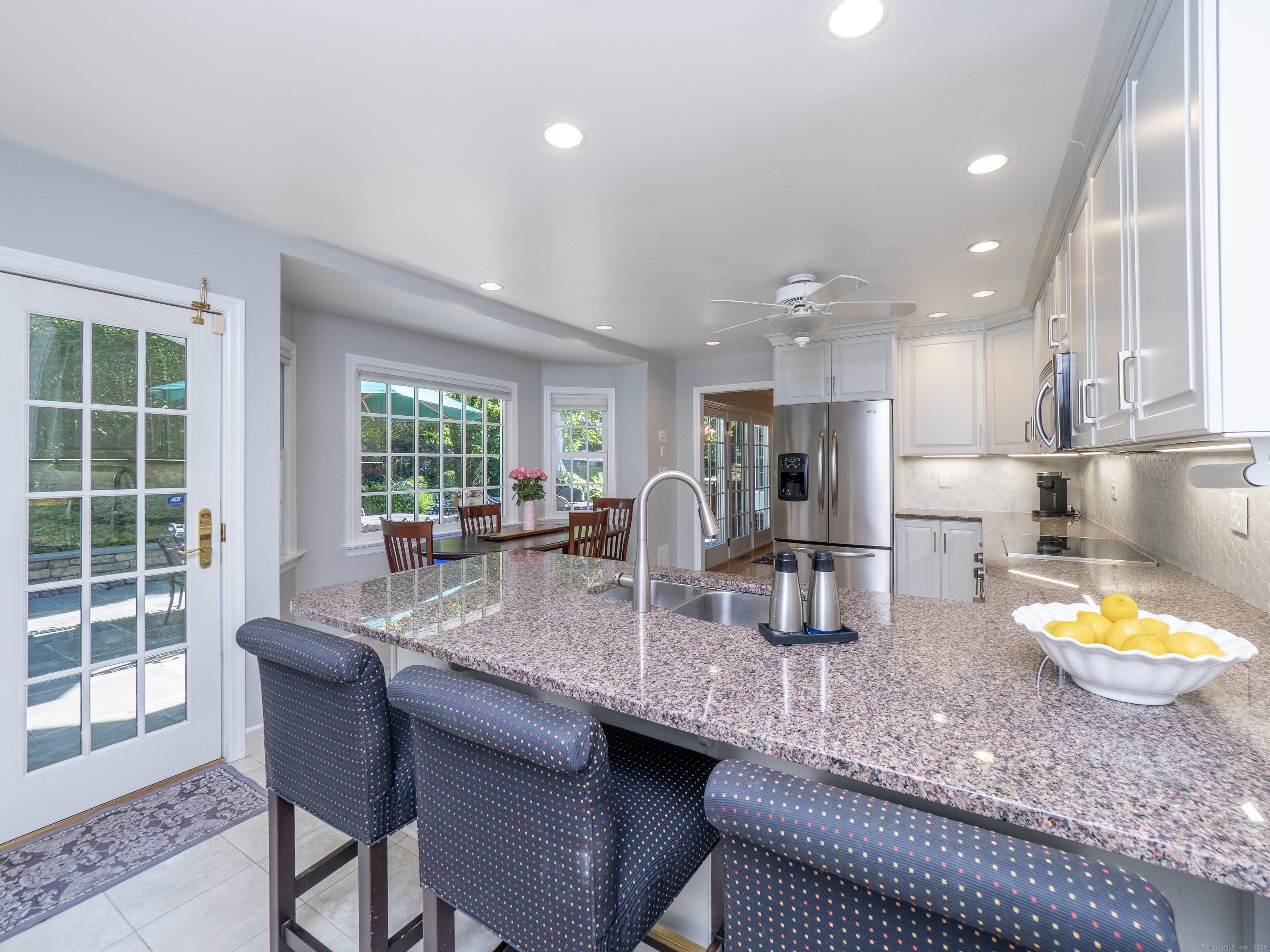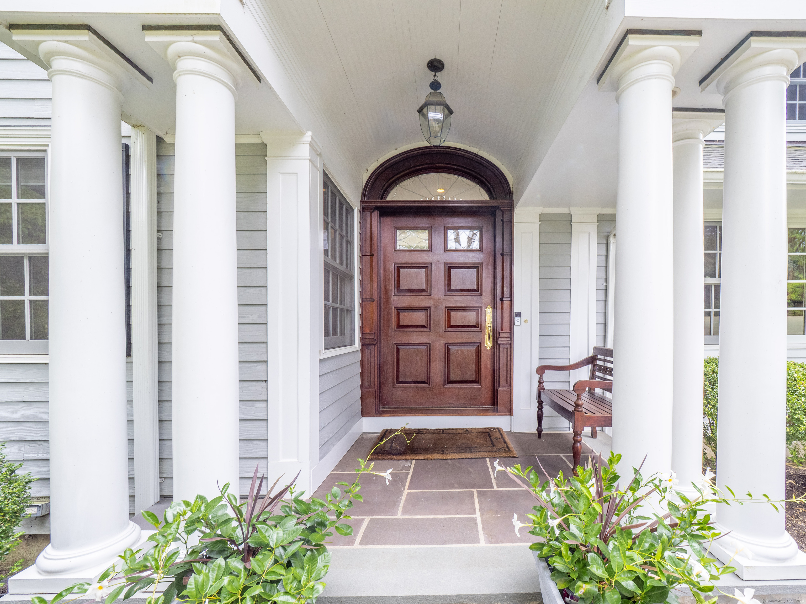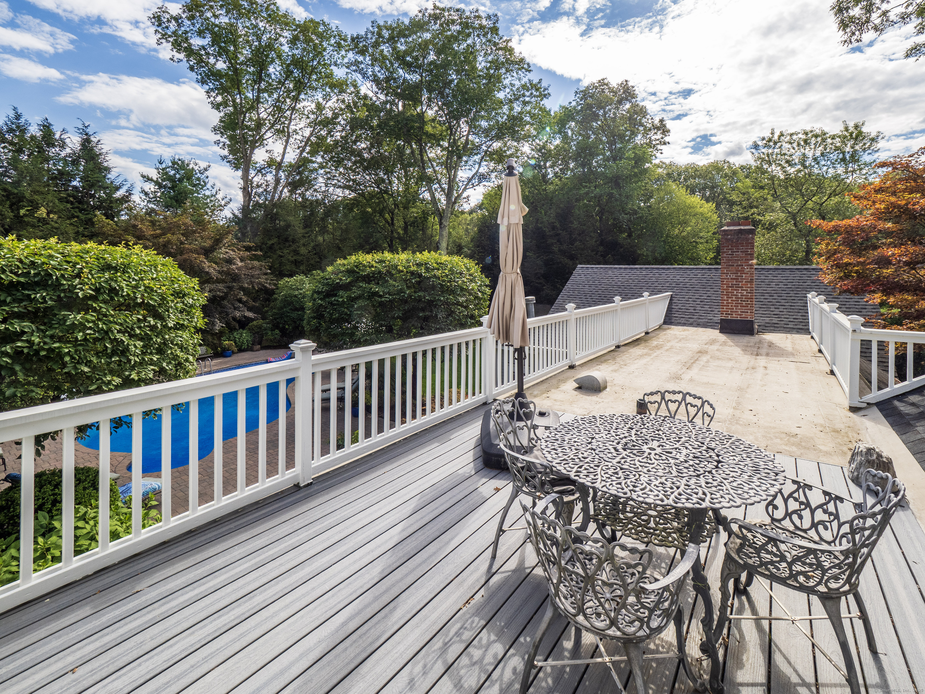Welcome to 9 Singing Woods Road, a stunning Silvermine 4-5 bedroom home where lush grounds, elegant interiors, and a resort-style pool create the perfect retreat. Set on a professionally landscaped acre, enjoy a heated in-ground gunite pool and open-concept living designed for both relaxation and entertaining. Inside, host elegant dinner parties in the formal dining room. The living room invites conversation, and the family room is a perfect place to relax. The inviting eat-in kitchen boasts stone countertops and radiant heated floors. A sunroom with French doors overlooks the pool, while a massive stone patio with built-in grill and refrigerator sets the stage for effortless outdoor living. An integrated audio system carries music inside and out. Upstairs, the private primary suite spans the entire level with a spacious bedroom, walk-in closet, and spa-inspired bath featuring a jetted tub, oversized glass shower, and radiant heated floors. A full-size office-equal in scale to the bedroom-opens to a rooftop deck with views of the pool and backyard. Additional highlights include two fireplaces, a large finished basement, and an expanded three-car garage (two in tandem). Freshly painted and meticulously maintained, the home offers Hardie board siding, a new roof, and public water. Just a short stroll from GrayBarns, minutes to both I-95 and Merritt, this exceptional residence blends timeless style with modern comfort.
