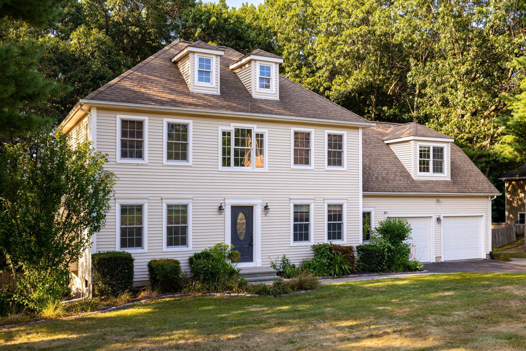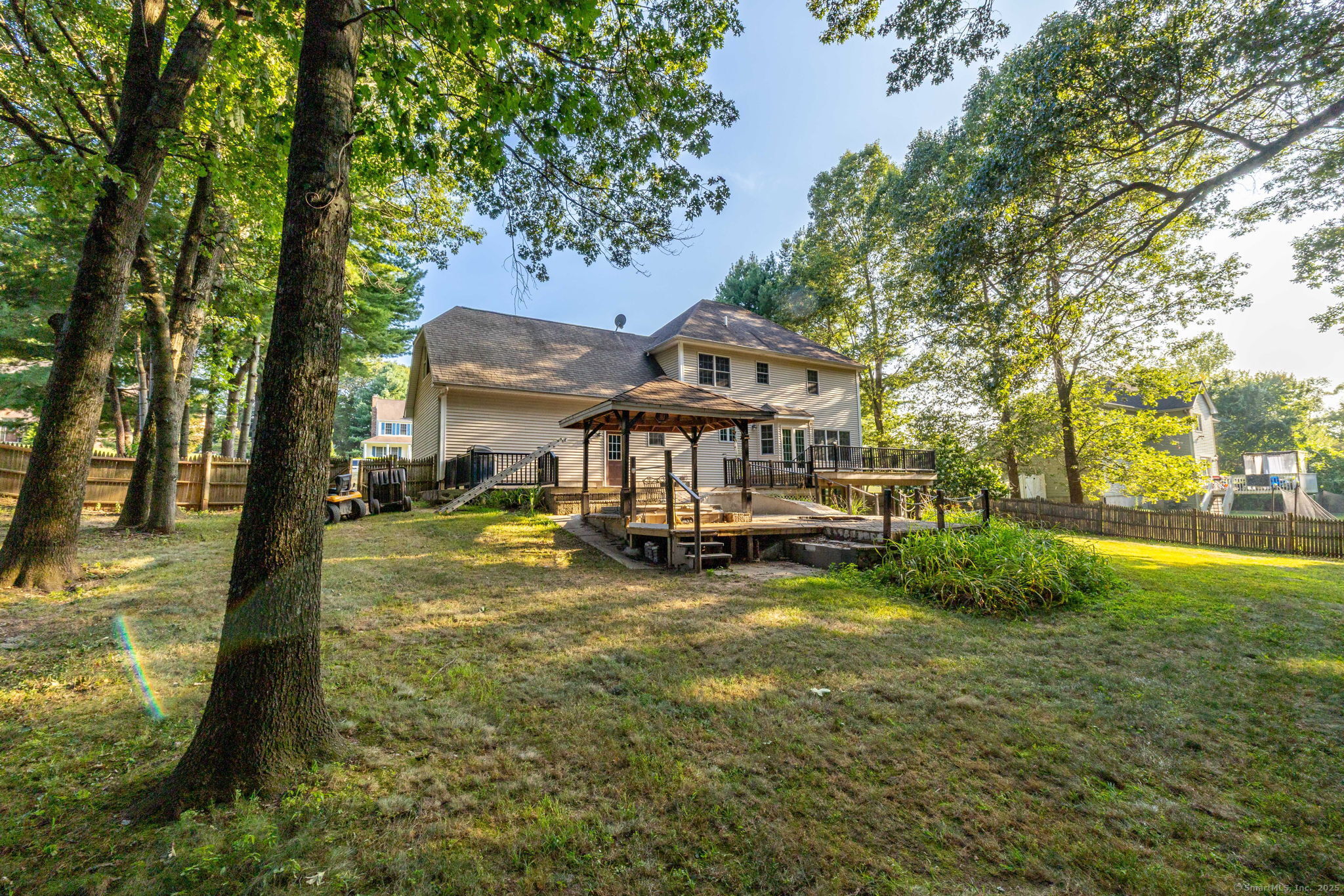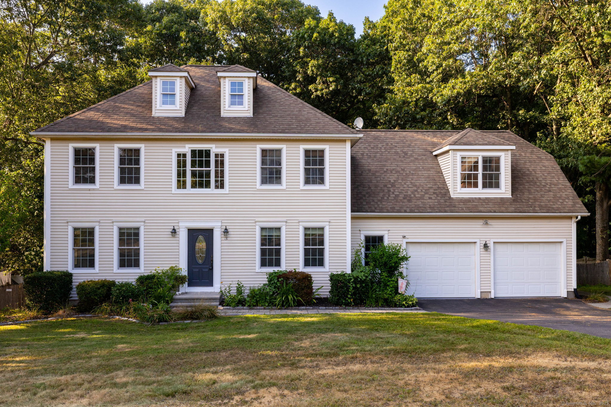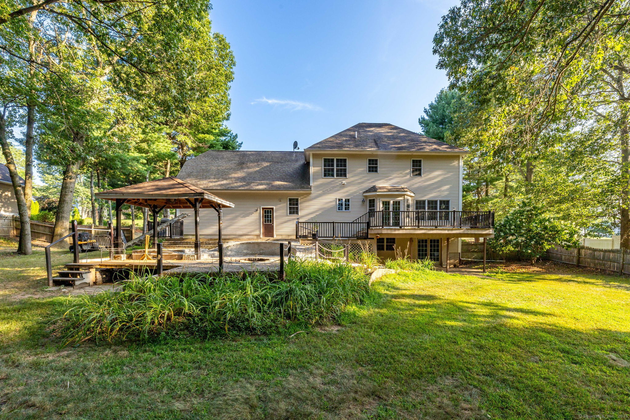 Nestled on a lush .43-acre lot, this stunning 3-bedroom, 2.5-bath Colonial, spanning 2,243 sq ft with an additional 900+ sq ft unfinished walk-out lower level, is a masterpiece of elegance and modern comfort. Freshly painted with new flooring gracing the main level, this home exudes timeless elegance with thick crown moulding adorning every room. The front-to-back living room captivates with abundant natural light, a cozy gas fireplace crowned by a robust mantle and seamless flow into the eat-in kitchen. Here, granite countertops gleam atop a spacious island with barstool seating, complemented by stainless steel appliances, pantry and a slider opening to a breathtaking multi-tiered deck. Spanning the back of the home, the deck boasts a relaxing hot tub and a patio with a built-in firepit, perfect for starlit gatherings. A formal dining room and remodeled half bath complete the main floor. Upstairs, the primary suite impresses with a walk-in closet and a full bath featuring a granite double sink and tub-shower combo. Two additional bedrooms, a full bath and a versatile finished bonus room-ideal as a 4th bedroom, rec room, home office or gym-offer endless possibilities. Practicality meets luxury with a 2nd floor laundry room, 2-car attached garage, fenced-in backyard, newer hot water heater, efficient gas heat and central air. This Colonial gem blends sophistication and functionality, ready to welcome its next chapter. Schedule today.