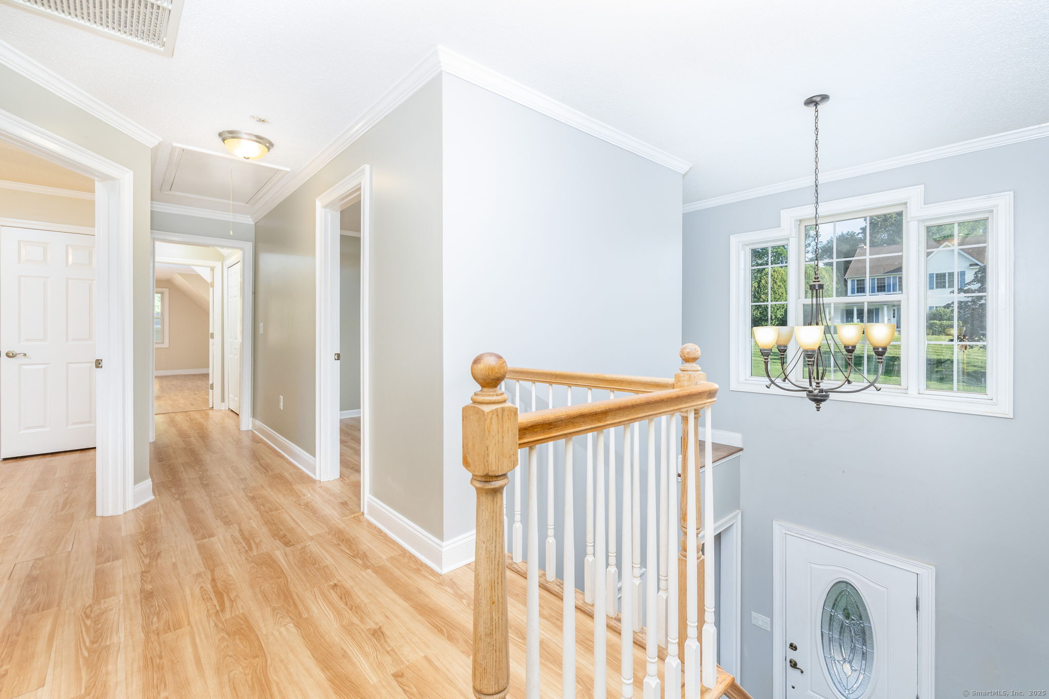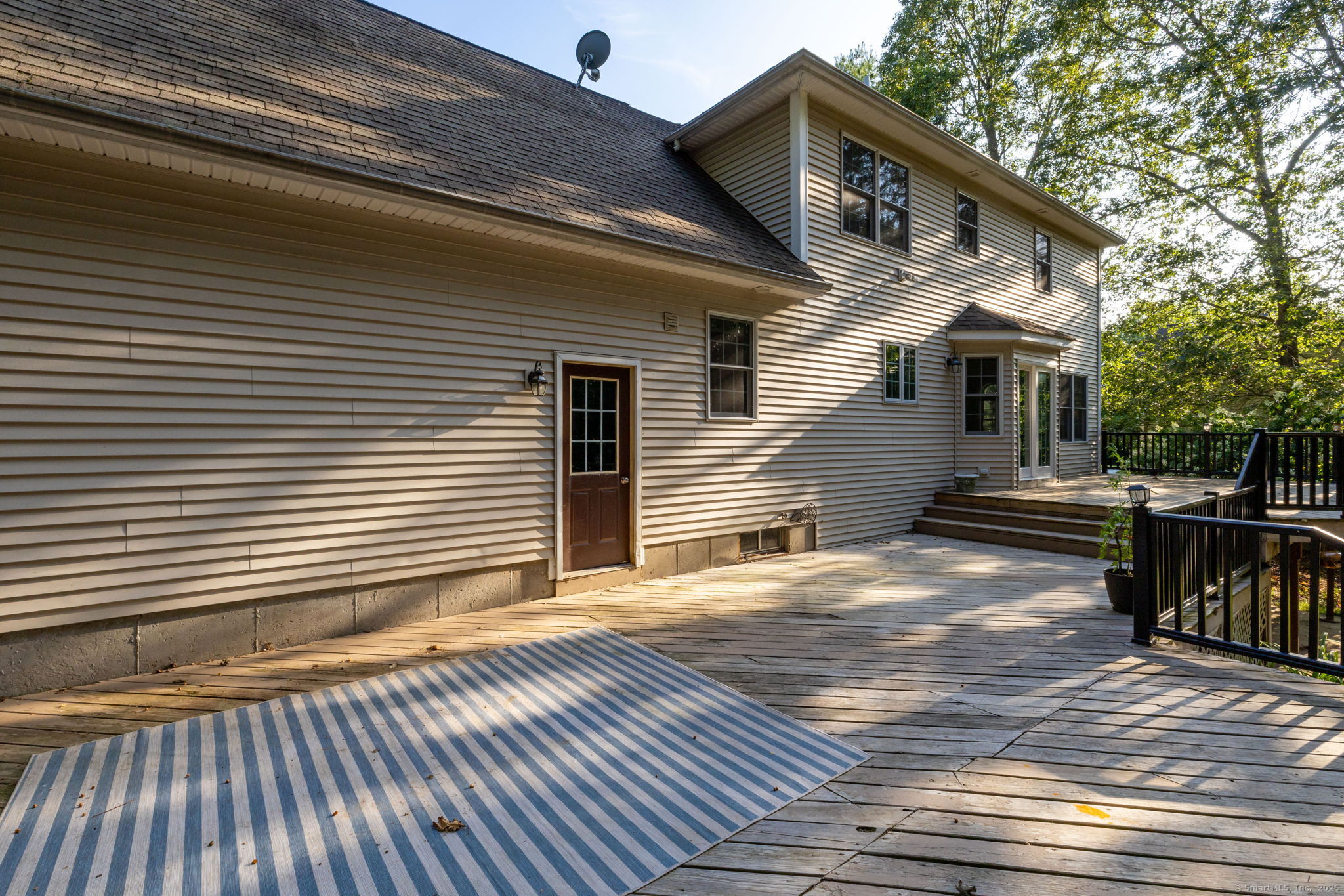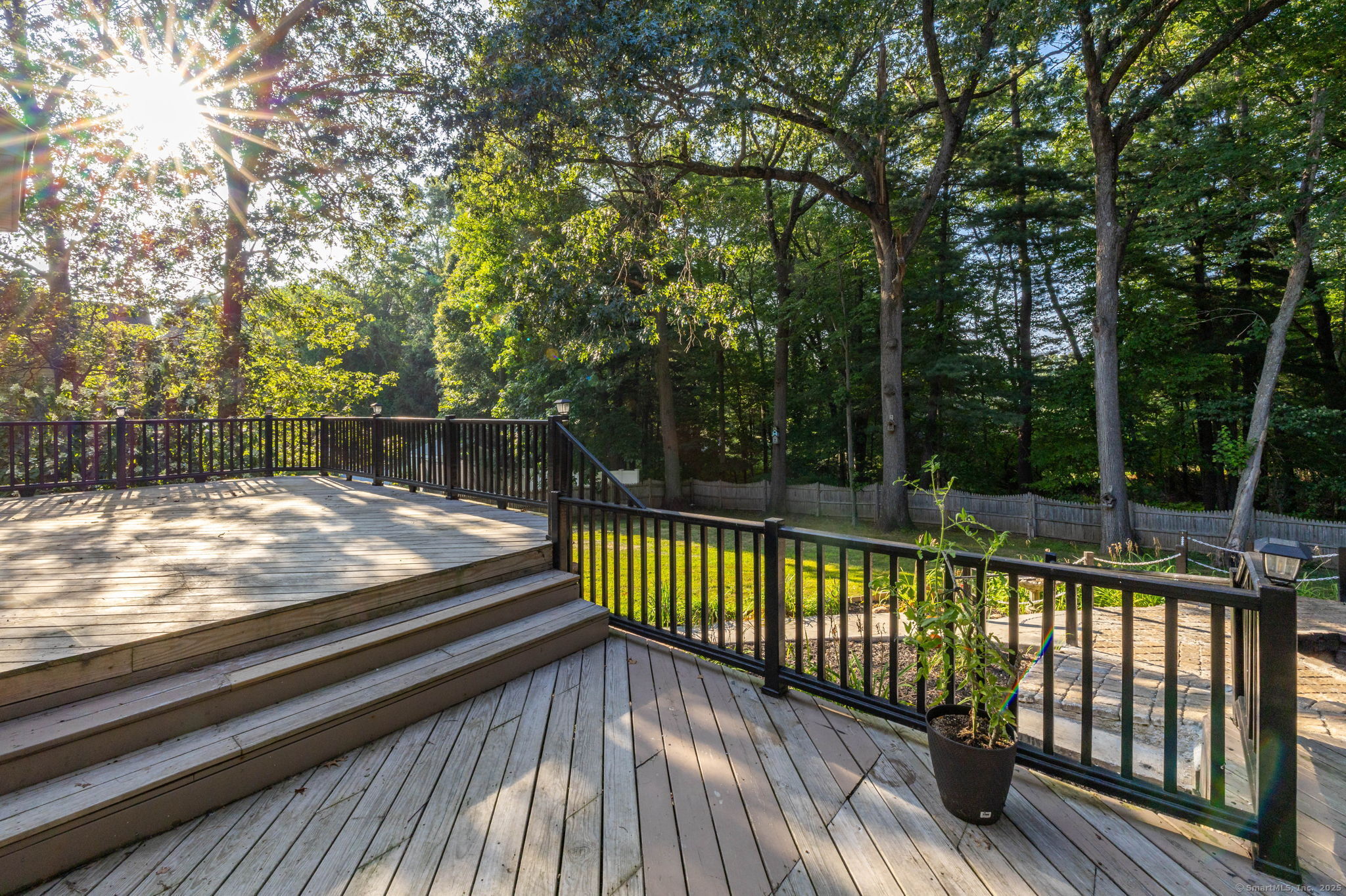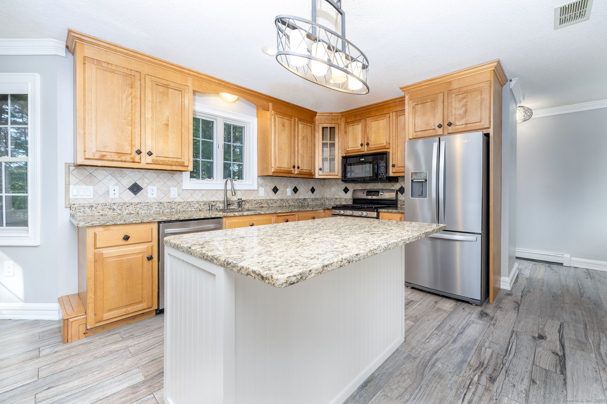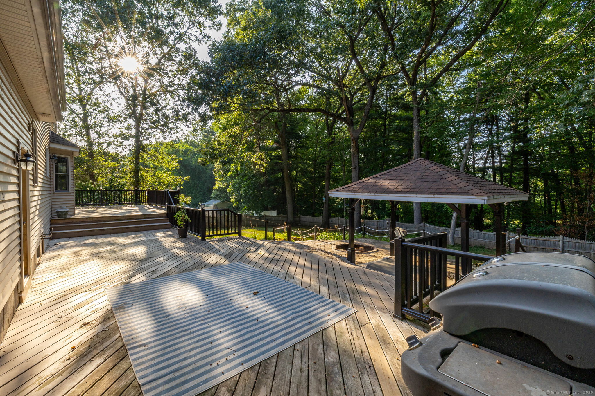 Nestled on a lush .43-acre lot, this stunning 3-bedroom, 2.5-bath Colonial, spanning 2,243 sq ft with an additional 900+ sq ft unfinished walk-out lower level, is a masterpiece of elegance and modern comfort. Freshly painted with new flooring gracing the main level, this home exudes timeless elegance with thick crown moulding adorning every room. The front-to-back living room captivates with abundant natural light, a cozy gas fireplace crowned by a robust mantle and seamless flow into the eat-in kitchen. Here, granite countertops gleam atop a spacious island with barstool seating, complemented by stainless steel appliances, pantry and a slider opening to a breathtaking multi-tiered deck. Spanning the back of the home, the deck boasts a relaxing hot tub and a patio with a built-in firepit, perfect for starlit gatherings. A formal dining room and remodeled half bath complete the main floor. Upstairs, the primary suite impresses with a walk-in closet and a full bath featuring a granite double sink and tub-shower combo. Two additional bedrooms, a full bath and a versatile finished bonus room-ideal as a 4th bedroom, rec room, home office or gym-offer endless possibilities. Practicality meets luxury with a 2nd floor laundry room, 2-car attached garage, fenced-in backyard, newer hot water heater, efficient gas heat and central air. This Colonial gem blends sophistication and functionality, ready to welcome its next chapter. Schedule today.
