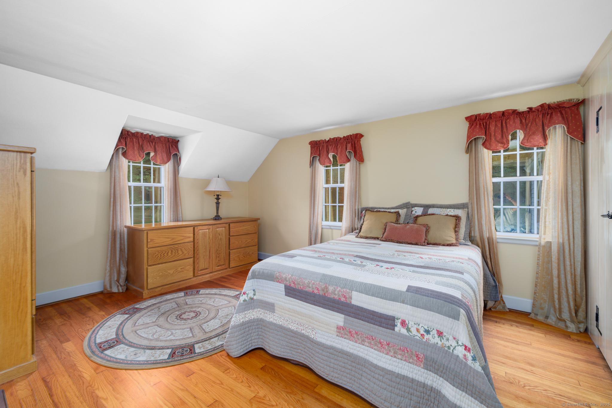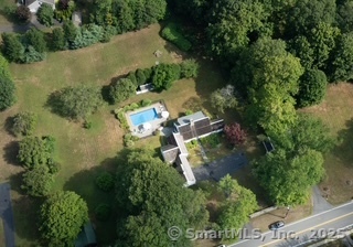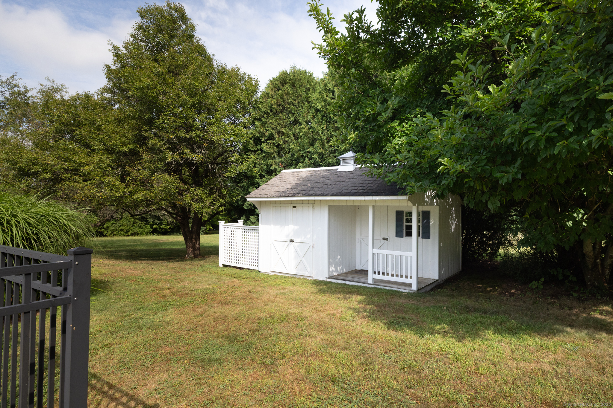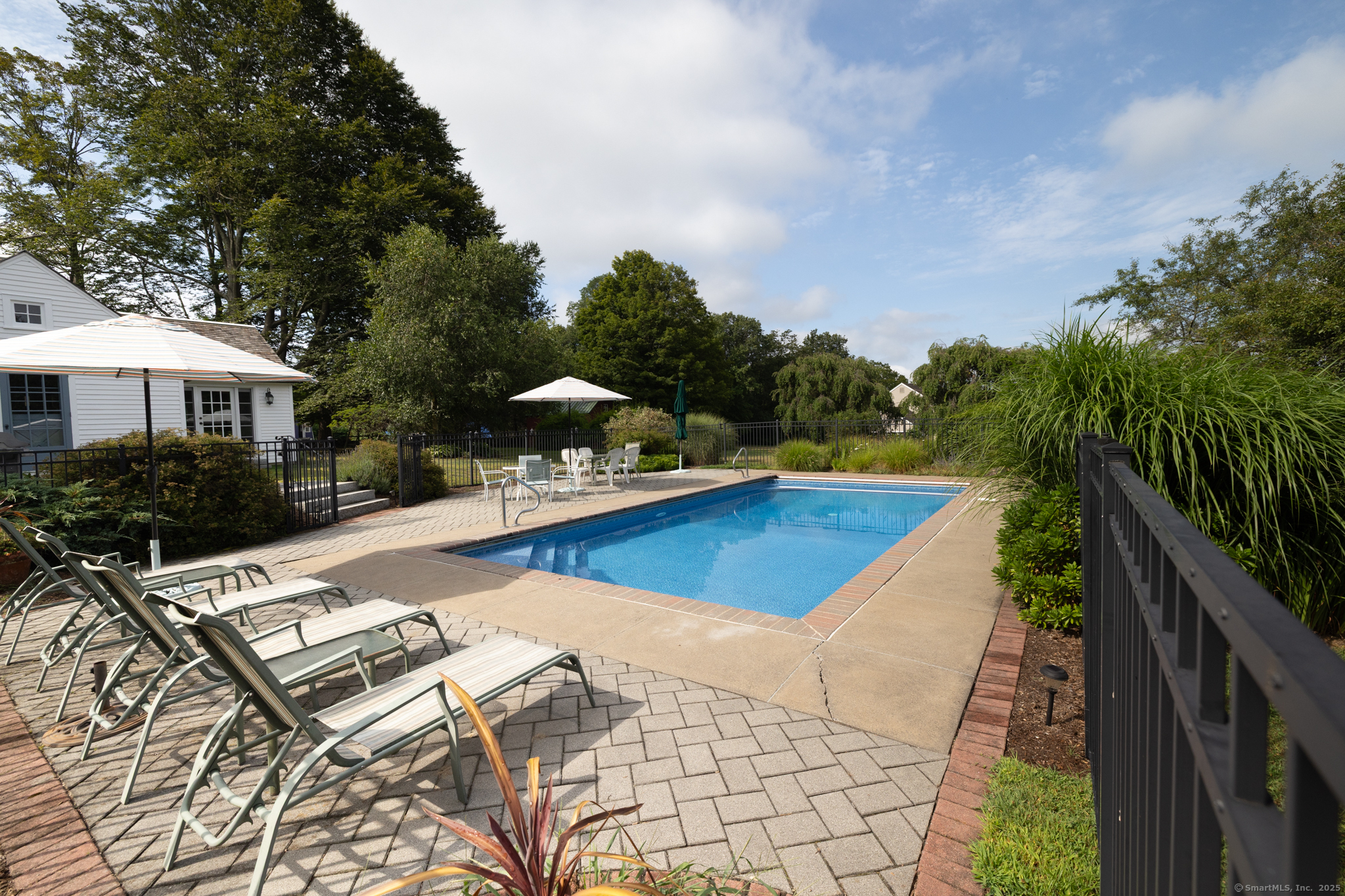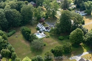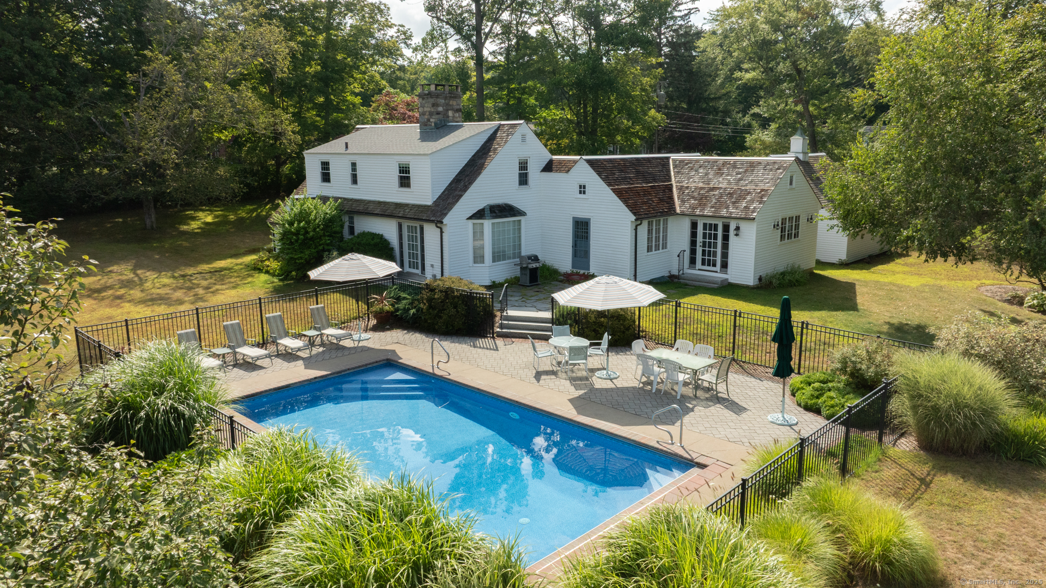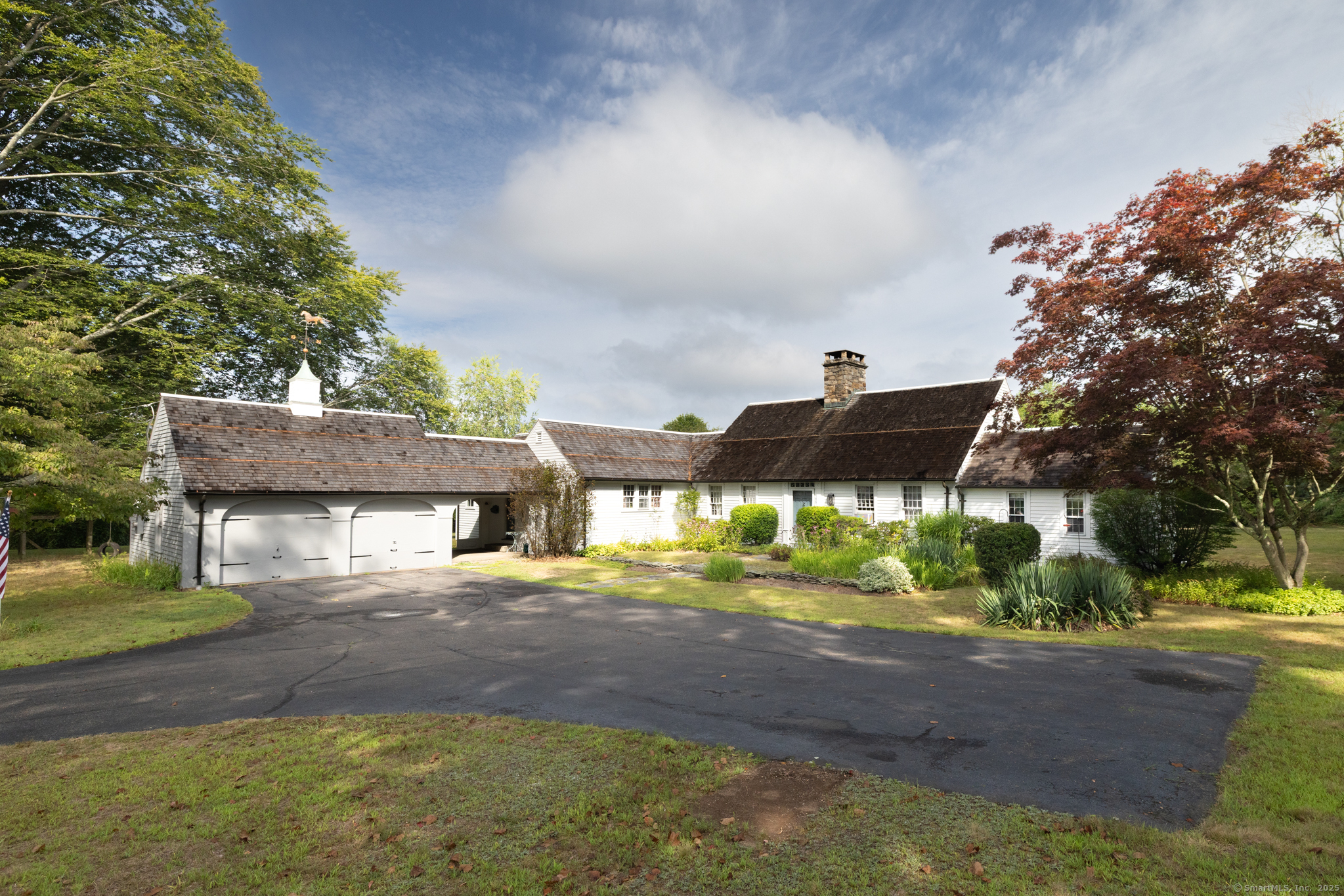 This quintessential "L" shaped Cape Cod Home sits on 2 acres tucked behind a 200ft long stonewall. It's a colonial reproduction, designed by Norris Prentice, a renowned architect once featured in Better Homes and Gardens as well as the Hartford Courant. Centrally located in town yet provides a private setting, it has an understated appearance. Every room is sun-drenched. Front to back living room boasts granite fireplace, large bay window & french doors. Remodeled kitchen features added 18x11 addition, oversized 7x7 granite island, dual fuel oven & access to mudroom, powder room, open-air staircase to lower level game room & French doors to granite patio. The primary bedroom is on the 1st floor with 2 separate closets & its own bath. Two generous bedrooms upstairs share their own bath. All 3 bathrooms have been updated. The home is unique in that it offers 2 HOME OFFICES, one which may be converted to 4th bdrm. Built- ins throughout the house as well hardwood floors. The home's outdoors gives the vibe of being in an oasis, with its privacy, plantings, outbuildings & heated pool with wrap around patio. The grounds provide a 2 story barn, garden shed, pool shed/clubhouse as well as a fire-pit hidden in a private field found through the opening craved in the arborvitae. The plantings were chosen so that as one is done blooming another one begins. The heated pool & expansive decking provide for an excellent place to entertain, offering an extended season.