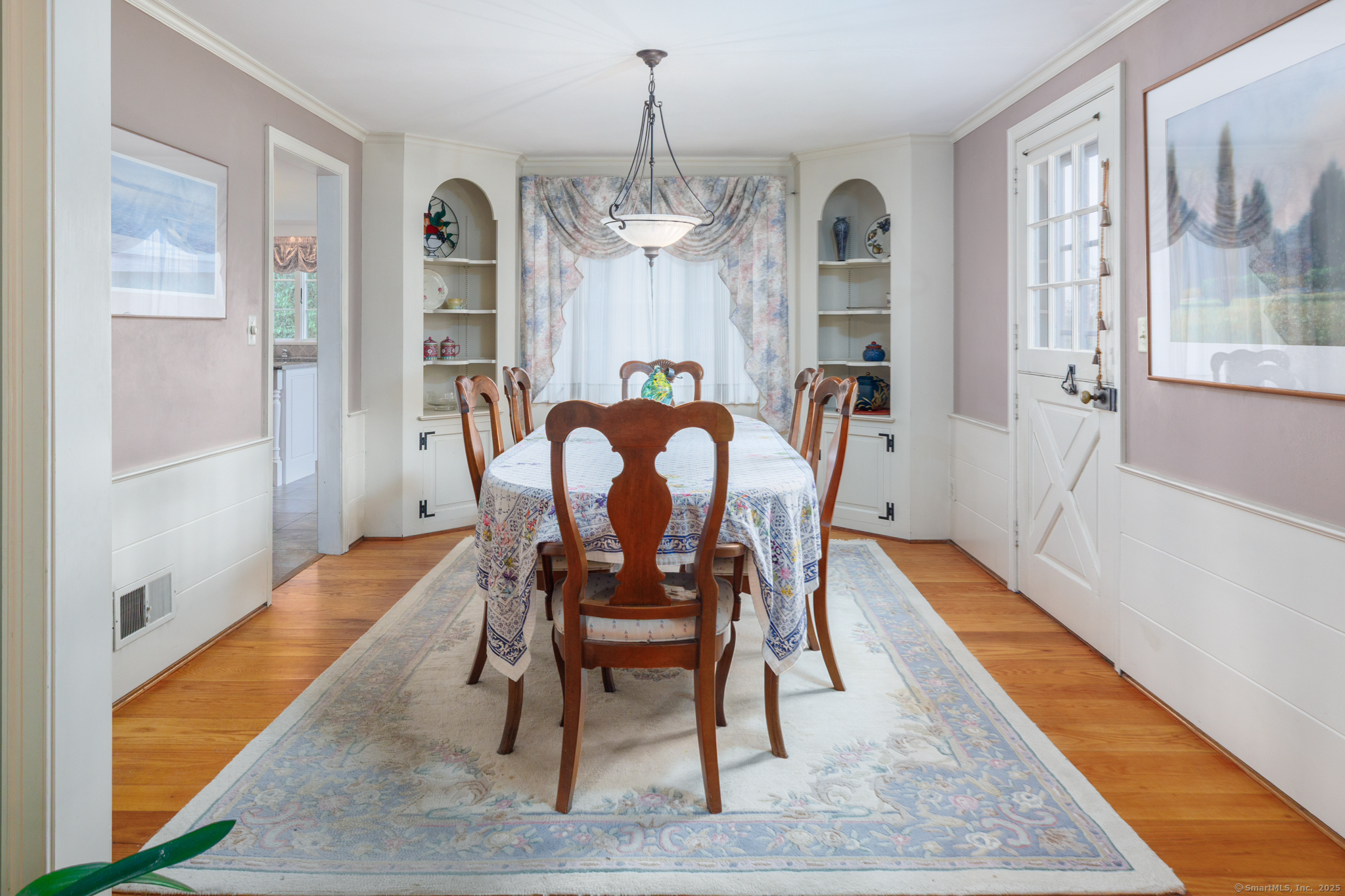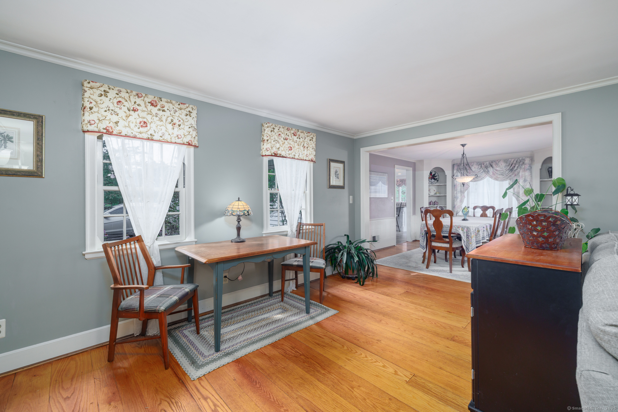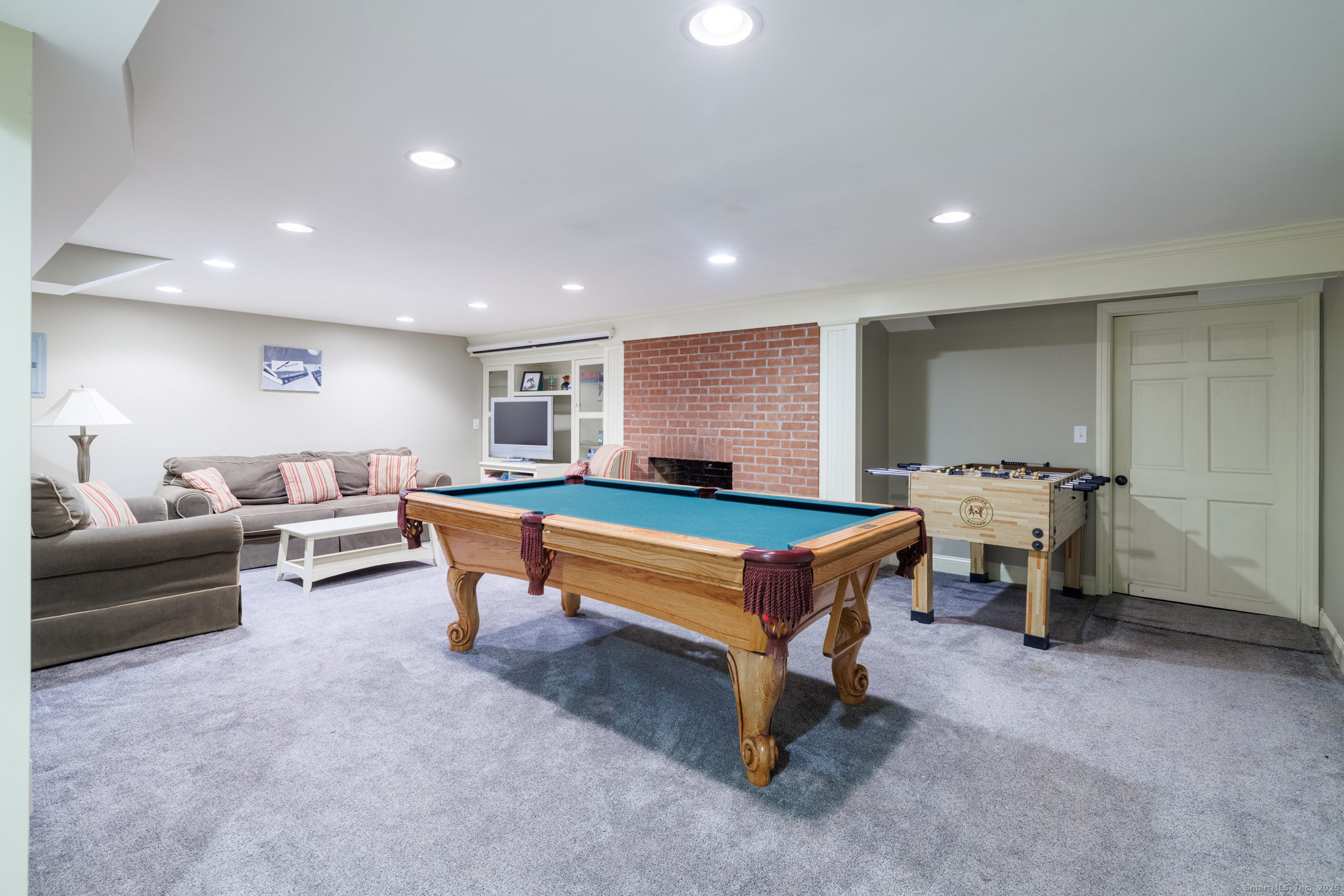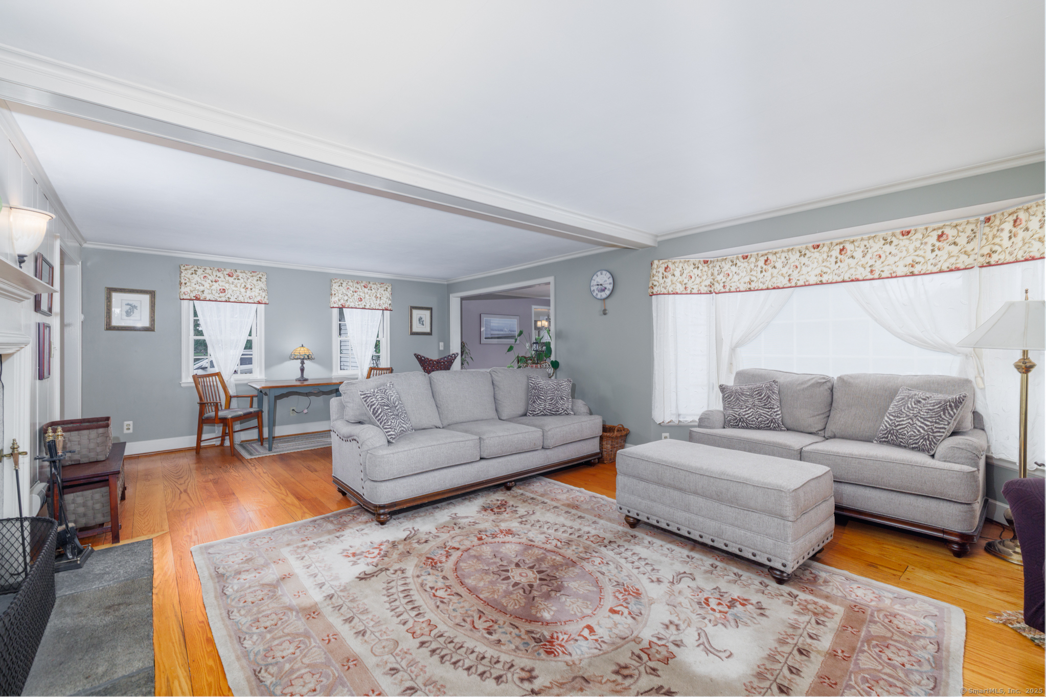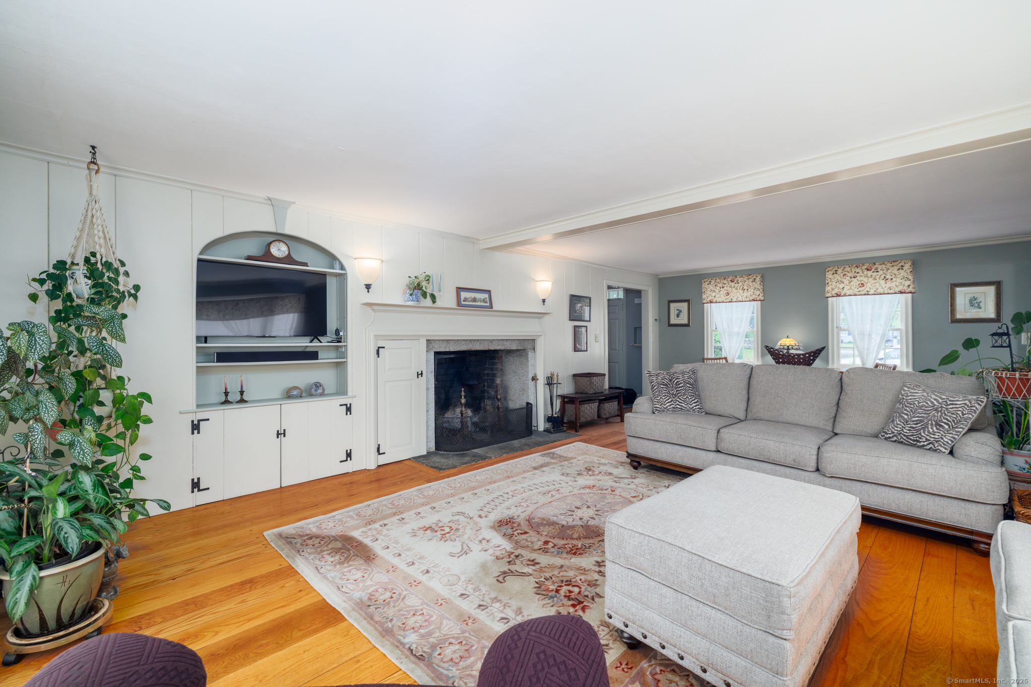 This quintessential "L" shaped Cape Cod Home sits on 2 acres tucked behind a 200ft long stonewall. It's a colonial reproduction, designed by Norris Prentice, a renowned architect once featured in Better Homes and Gardens as well as the Hartford Courant. Centrally located in town yet provides a private setting, it has an understated appearance. Every room is sun-drenched. Front to back living room boasts granite fireplace, large bay window & french doors. Remodeled kitchen features added 18x11 addition, oversized 7x7 granite island, dual fuel oven & access to mudroom, powder room, open-air staircase to lower level game room & French doors to granite patio. The primary bedroom is on the 1st floor with 2 separate closets & its own bath. Two generous bedrooms upstairs share their own bath. All 3 bathrooms have been updated. The home is unique in that it offers 2 HOME OFFICES, one which may be converted to 4th bdrm. Built- ins throughout the house as well hardwood floors. The home's outdoors gives the vibe of being in an oasis, with its privacy, plantings, outbuildings & heated pool with wrap around patio. The grounds provide a 2 story barn, garden shed, pool shed/clubhouse as well as a fire-pit hidden in a private field found through the opening craved in the arborvitae. The plantings were chosen so that as one is done blooming another one begins. The heated pool & expansive decking provide for an excellent place to entertain, offering an extended season.