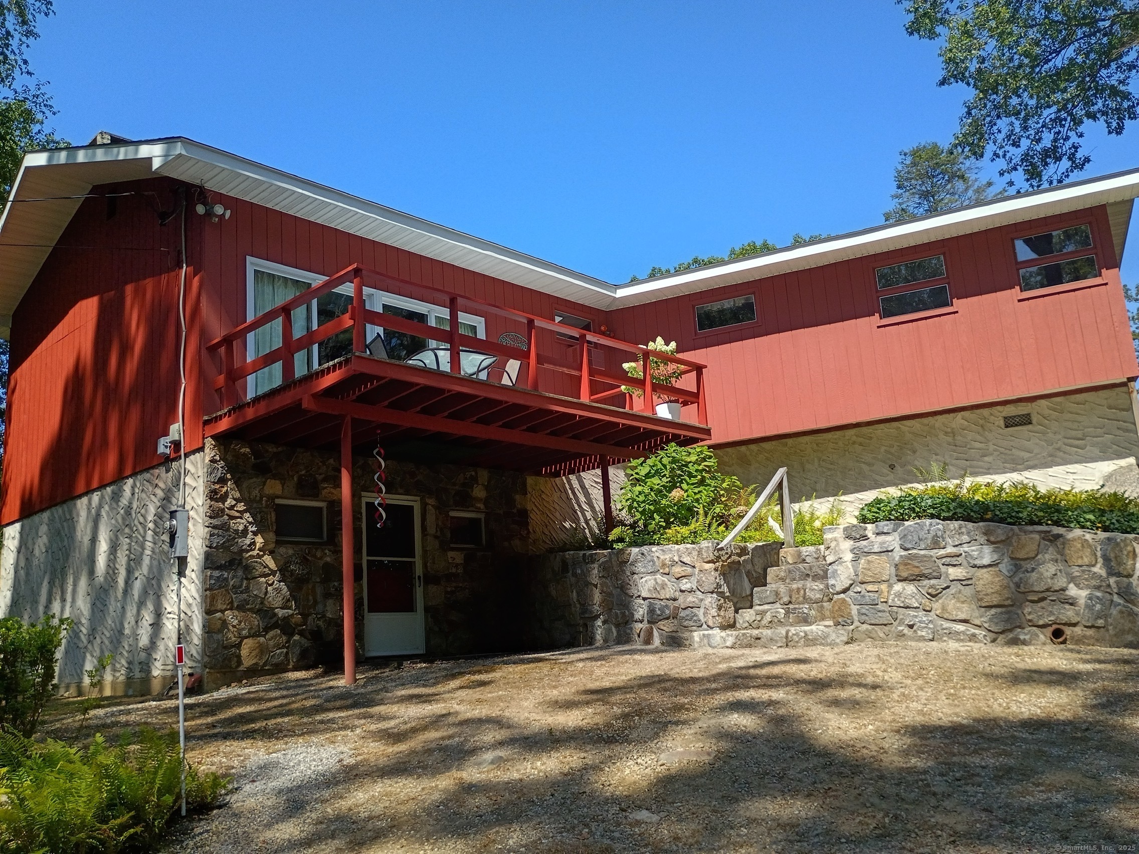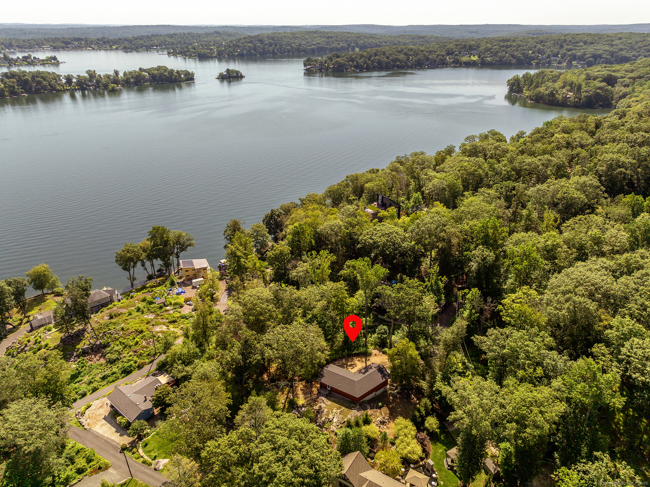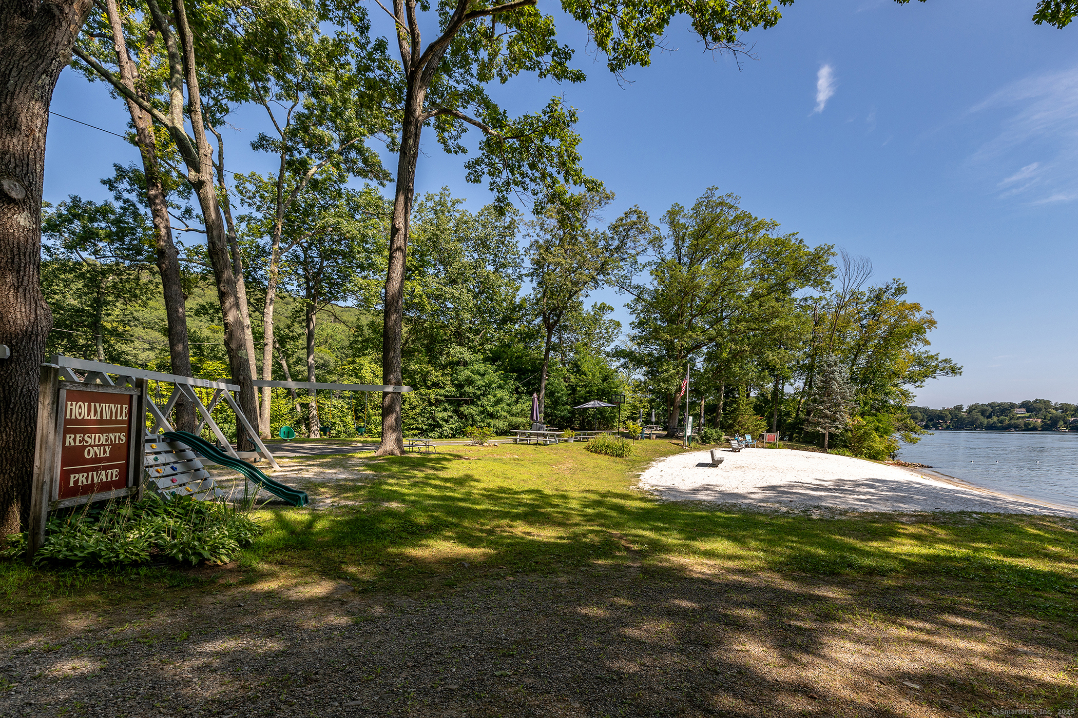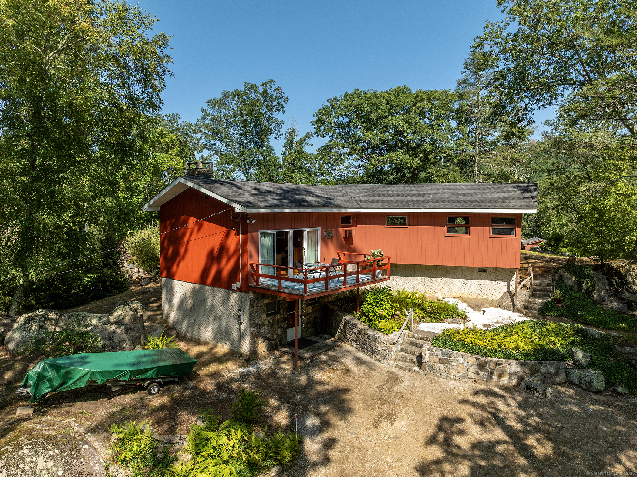 Nestled in the desirable Candlewood Lake Community of Hollywyle, 1 Sylvan Road offers a rare combination of privacy, very little traffic, lake charm, beach access and a boat dock slip (additional $200 a year). Set on a secluded multilevel lot, this 3 bedroom, 1.5 bath home is part of a private lake association that includes transferable multi-year dock rights, a beach picnic area and playground, perfect for enjoying the lake lifestyle all year long. The home's new roof (2018), ample levelish parking for 8-10 vehicles (unheard of in lake communities) and good sized decks off both the kitchen and living room make outdoor entertaining easy and enjoyable along with seasonal lake views. Inside, the home features an oversized step-down living room with 10' beamed ceiling, a stunning fieldstone wood burning fireplace and two sets of sliders that bring the outdoors right into the living room. The kitchen features a breakfast bar for 5 and a separate seating area for 6-10 guests. The home features three bedrooms including a spacious primary suite with crown molding, double closets, and a private half bath offering ample space to expand into a full bath if desired.The main bathroom has been thoughtfully updated with modern finishes including a granite countertop.Whether you're looking for a weekend retreat or a full time residence this home is the perfect balance of comfort/convenience and Candlewood Lake charm.Large lot which has street frontage on Sylvan Road as well as Candlewood Rd