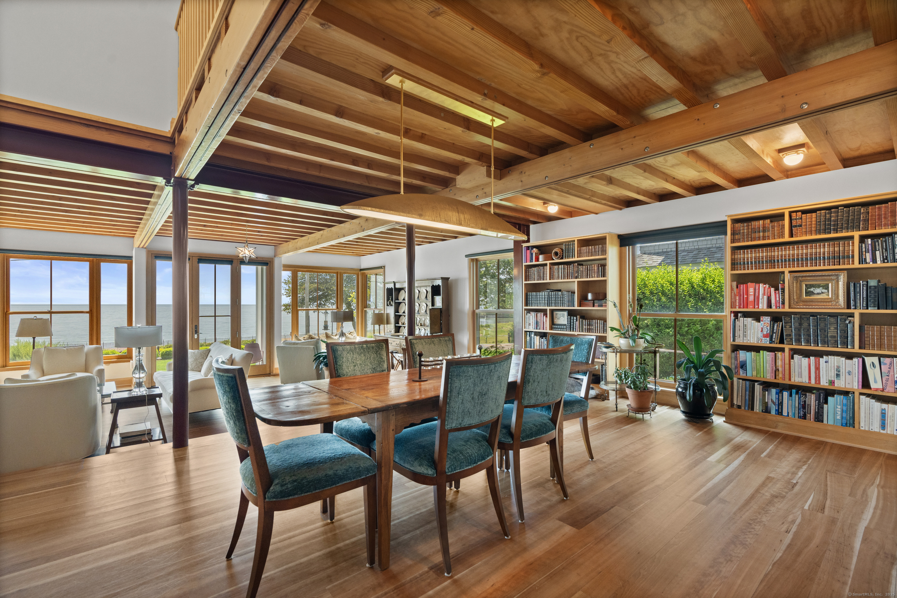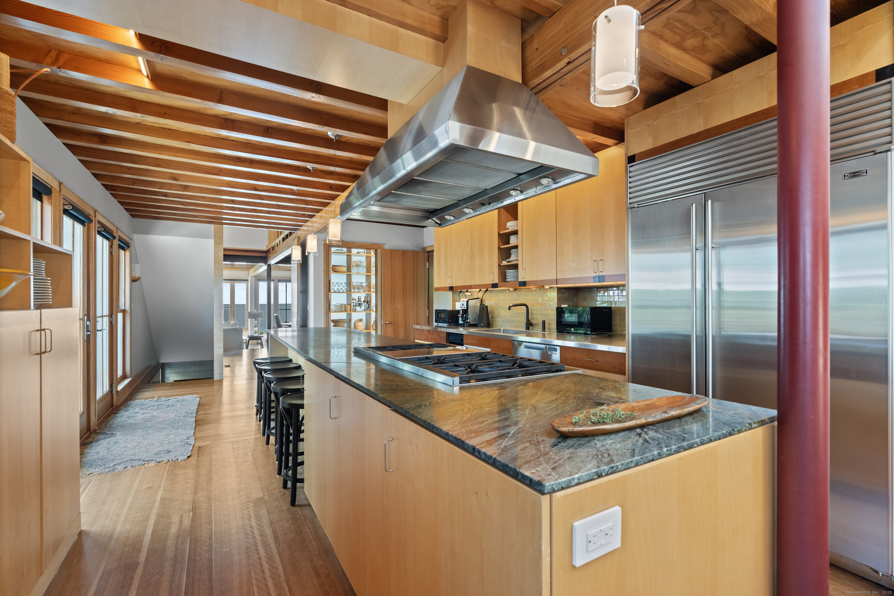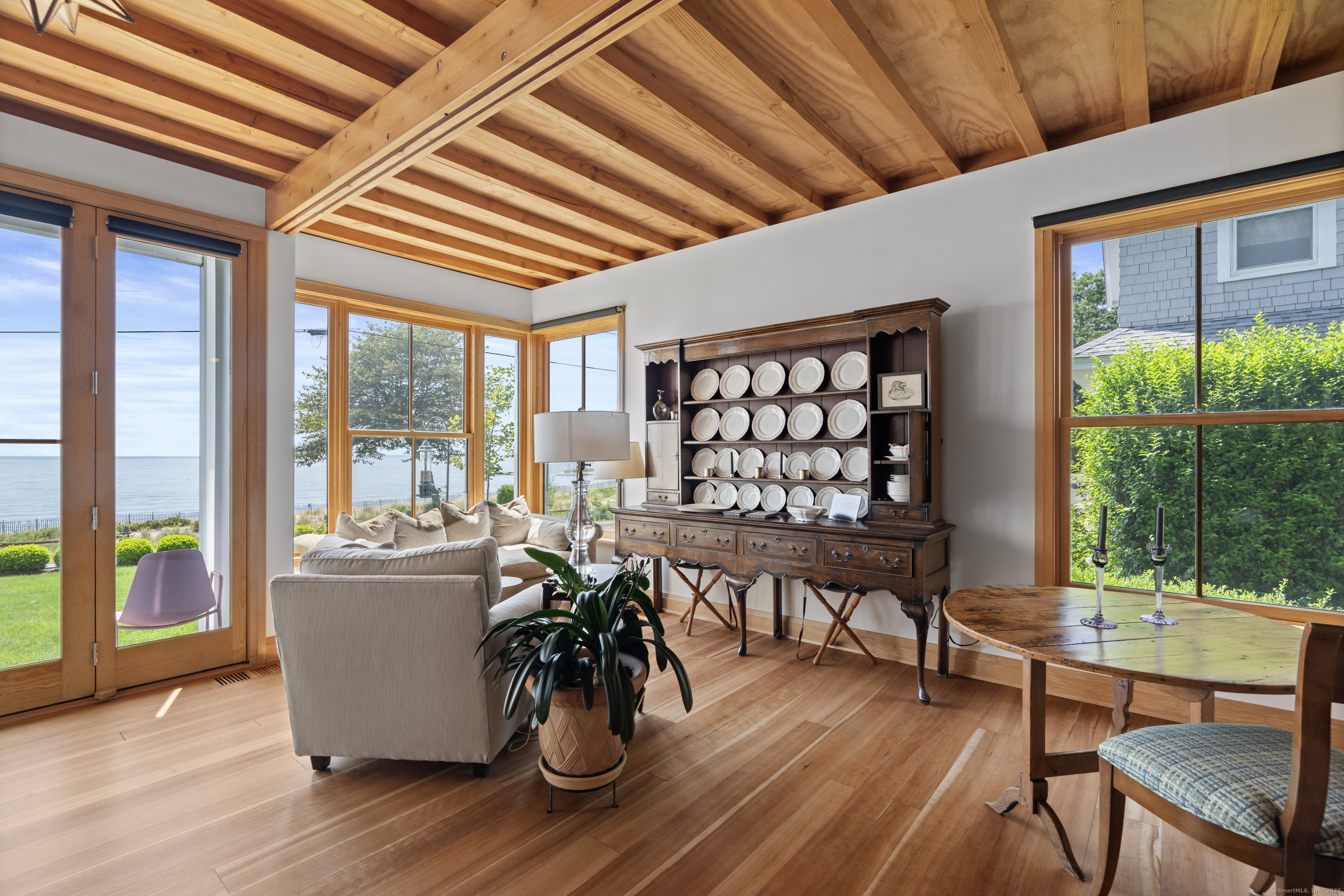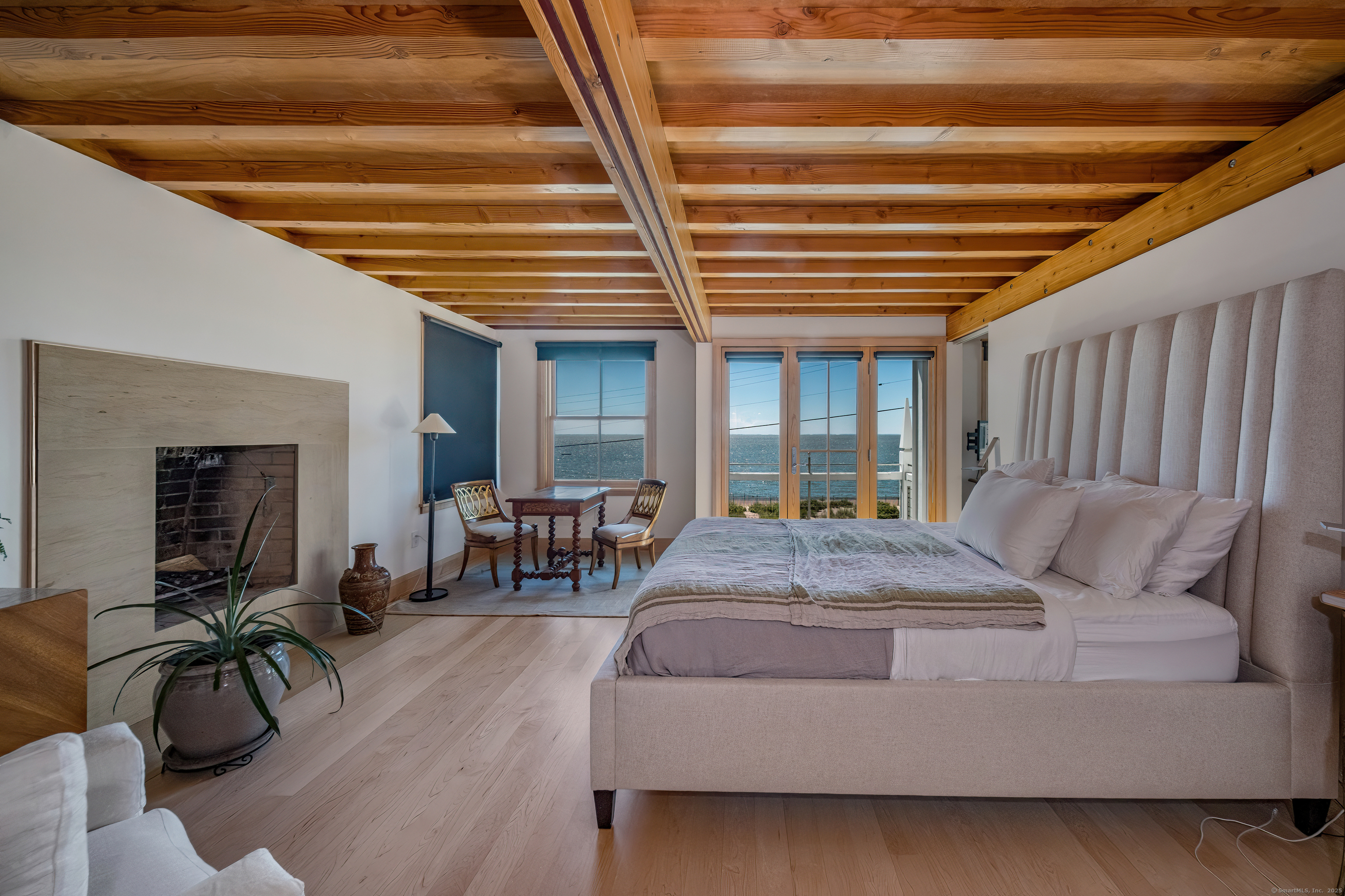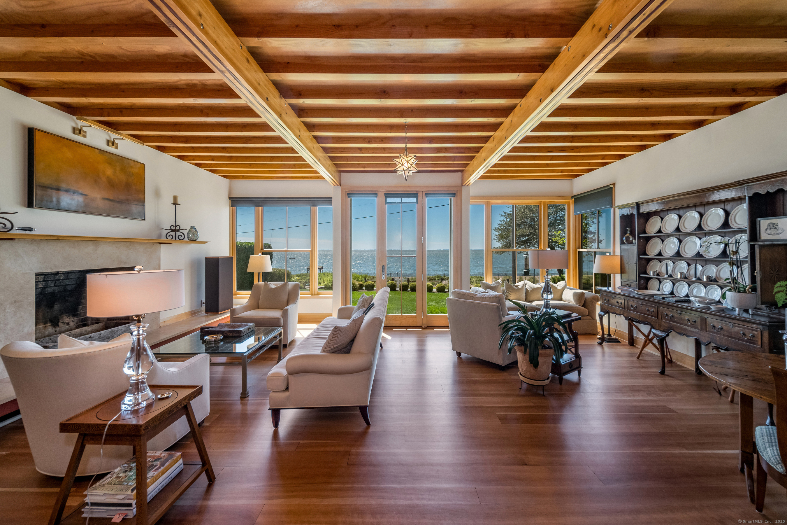 Stunning one-of-a-kind residence designed by Robert Page, AIA. Set directly on coveted private assoc. Seaview Beach, this iconic 4-level 4,600+ sq. ft. coastal retreat offers an unparalleled blend of modern sensibility and timeless craftmanship. Largely renovated in 2023, no detail was overlooked in this luxurious sanctuary for those who want the exceptional in coastal living. No flood insurance required. 5 bedrooms and 4.5 baths include multiple suites. Expansive 1,453 sf main level floor plan with dramatic open living spaces and guest suite. Gourmet chef's kitchen with top-of-the-line appliances, illuminated pantry wall, and seamless flow to dining and family rm with FP. Custom millwork throughout in maple and cherry, exposed beams, open floating staircases, and sleek steel columns suggest a refined city-loft-meets-beach aesthetic. Main floor: open living/dining space, kitchen, family rm with FP, mudroom, and private guest suite w/ensuite bath. Second Level: expansive primary suite with fplc, private Sound-facing balcony, office, spa-like bath, 2 custom closets, and a 2nd laundry. Additional bdrm currently serves as a music room. Third level:2 private bdrms, one w/balcony overlooks the Sound, the other a loft-like space with soaring ceilings and natural light, plus a brand new double bath.Lower level:guest rm, full bath, gym, den/office with FP, wet bar, wine closet, laundry and 20x20 storage rm. A bright 1080 sf by way of daylighting design. Perfect in-law.