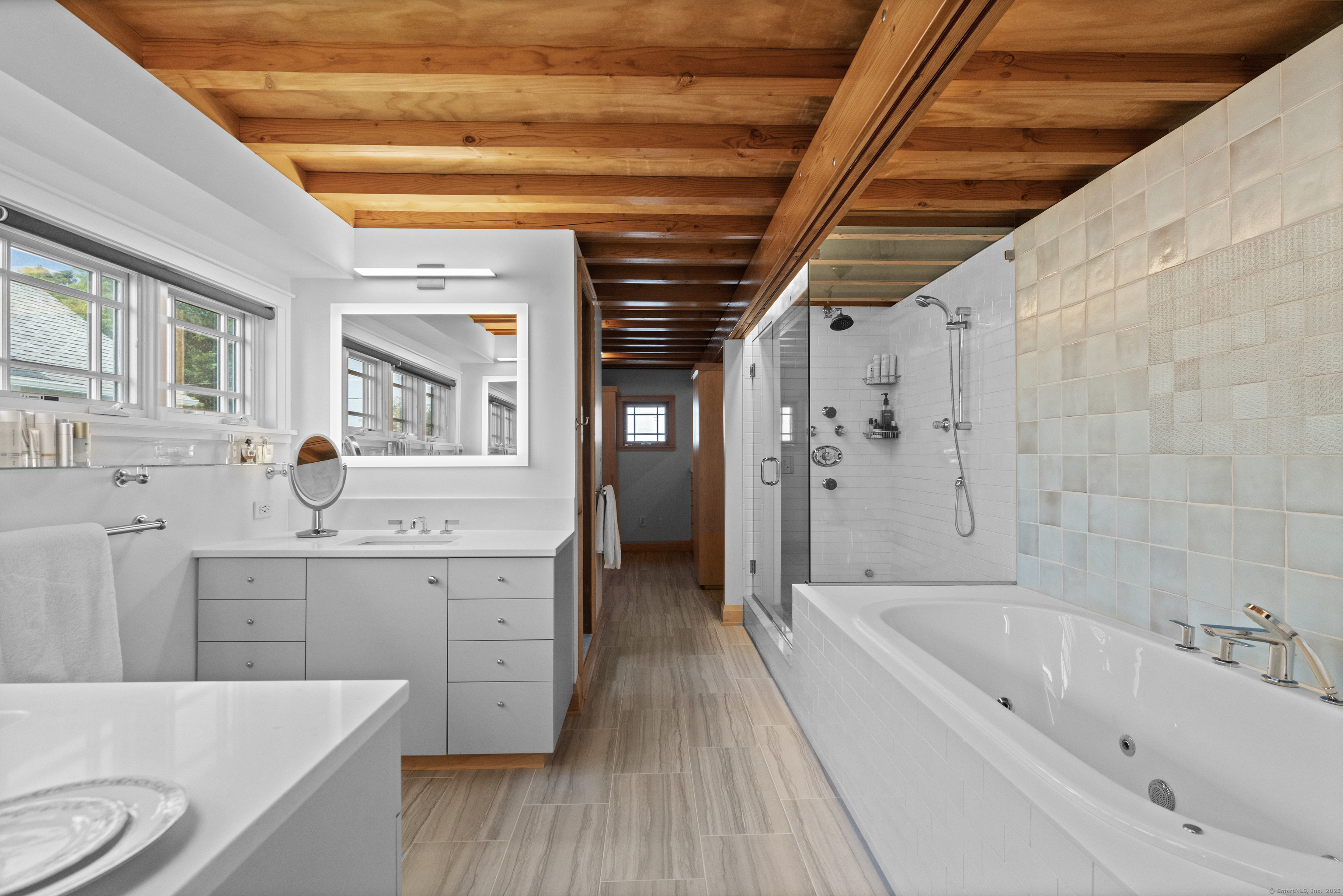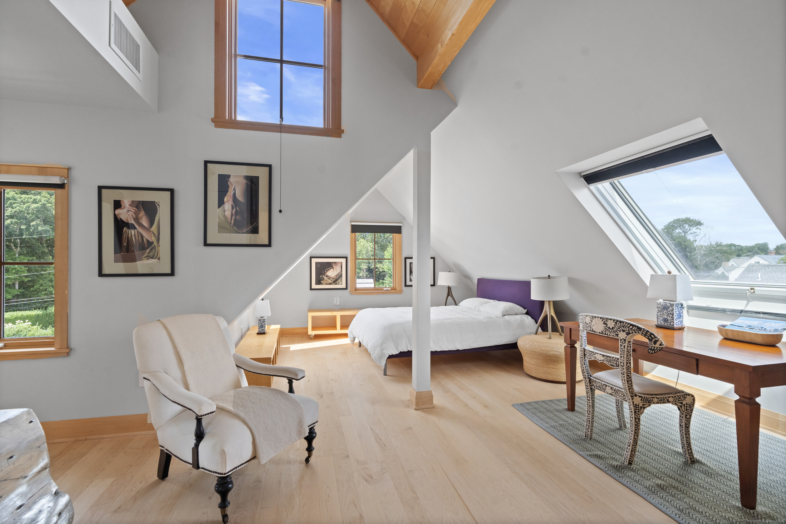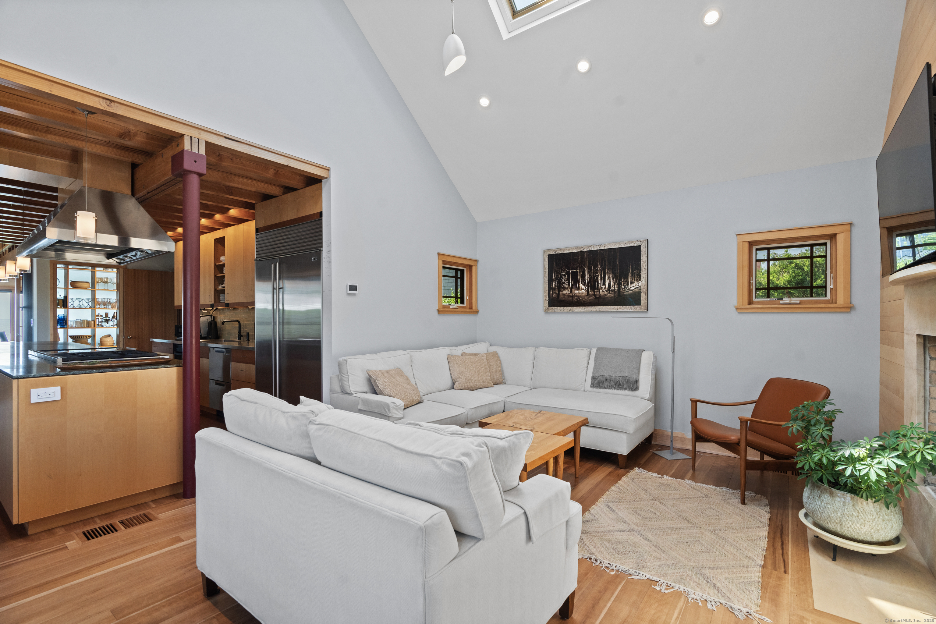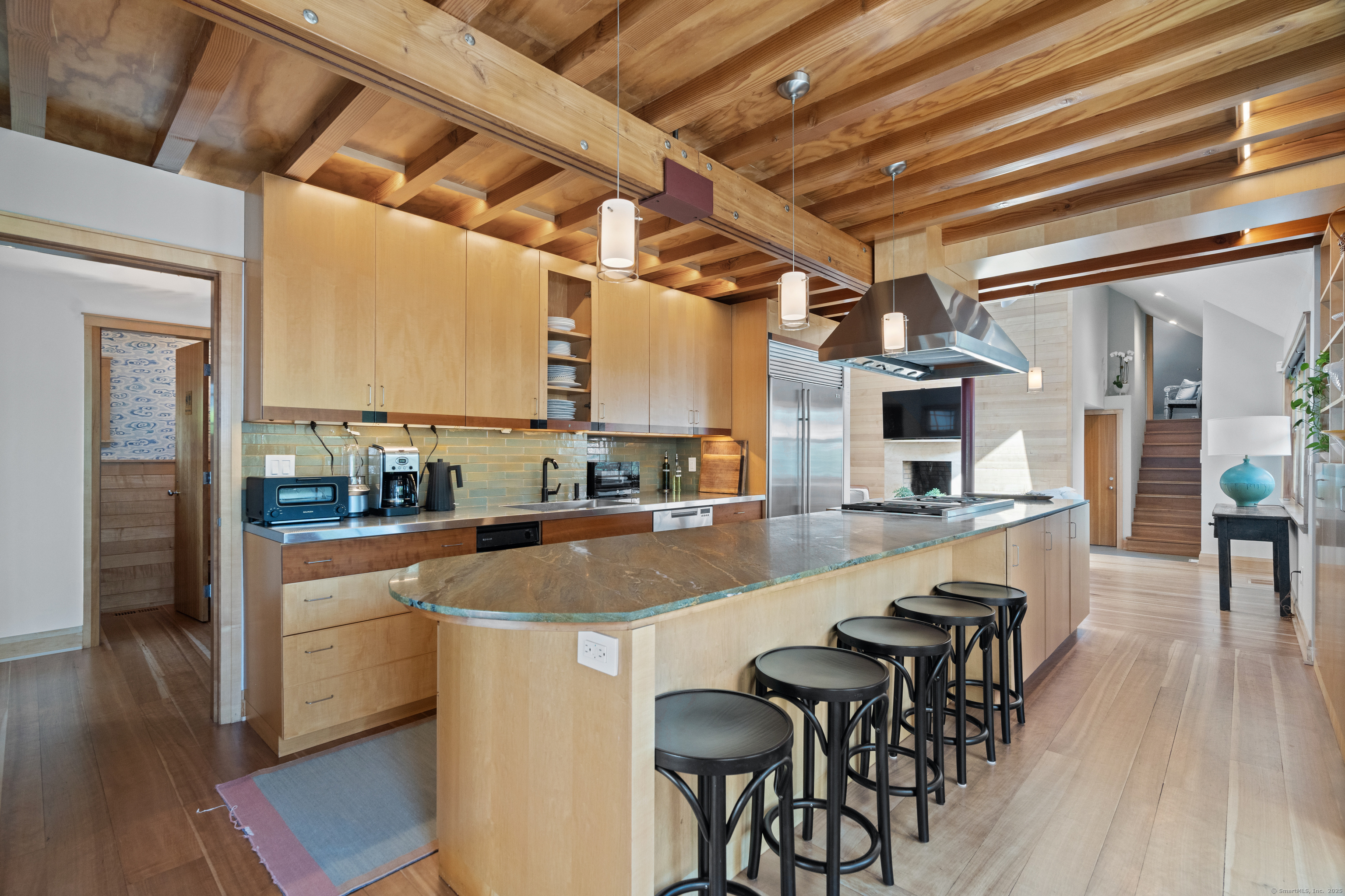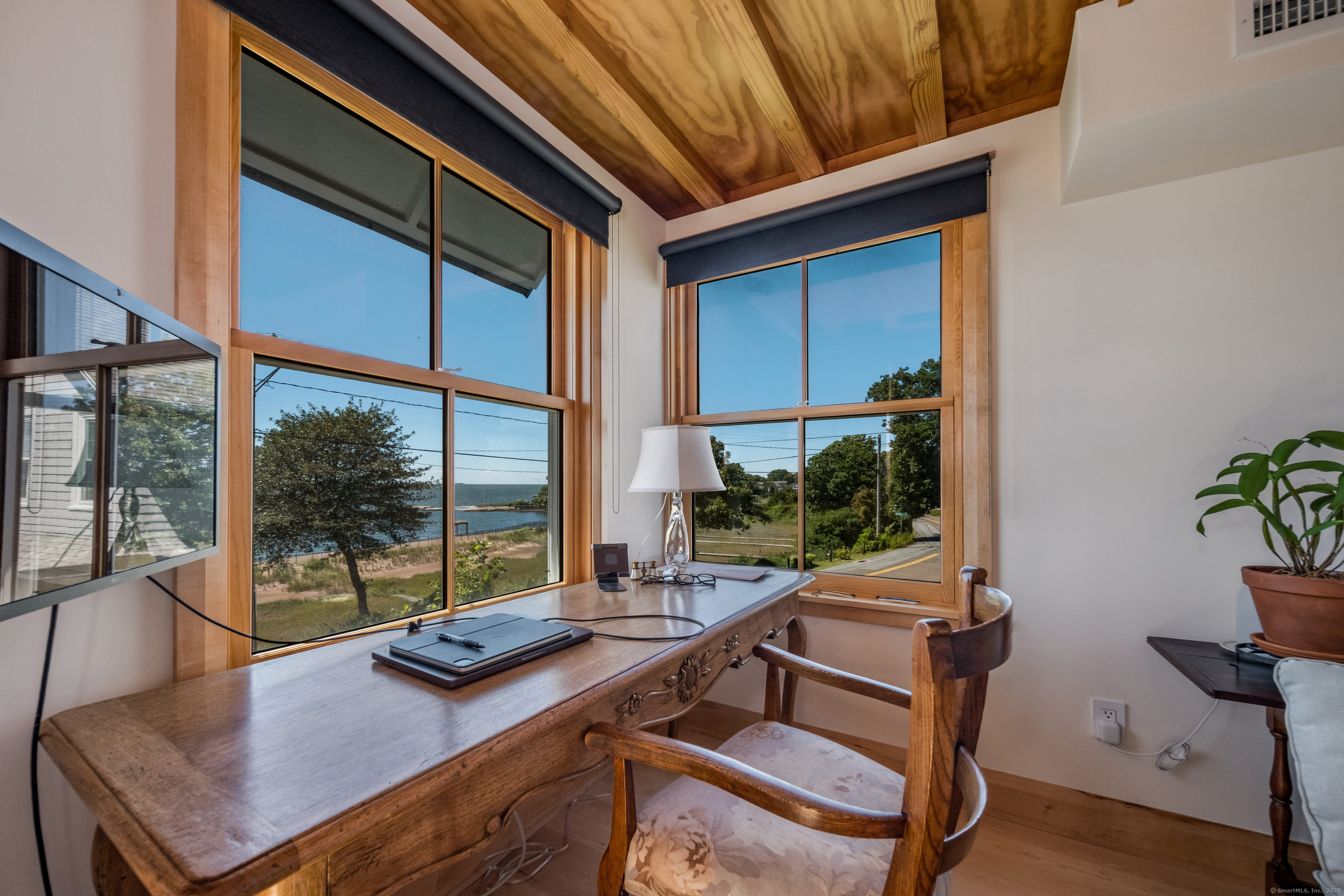 Stunning one-of-a-kind residence designed by Robert Page, AIA. Set directly on coveted private assoc. Seaview Beach, this iconic 4-level 4,600+ sq. ft. coastal retreat offers an unparalleled blend of modern sensibility and timeless craftmanship. Largely renovated in 2023, no detail was overlooked in this luxurious sanctuary for those who want the exceptional in coastal living. No flood insurance required. 5 bedrooms and 4.5 baths include multiple suites. Expansive 1,453 sf main level floor plan with dramatic open living spaces and guest suite. Gourmet chef's kitchen with top-of-the-line appliances, illuminated pantry wall, and seamless flow to dining and family rm with FP. Custom millwork throughout in maple and cherry, exposed beams, open floating staircases, and sleek steel columns suggest a refined city-loft-meets-beach aesthetic. Main floor: open living/dining space, kitchen, family rm with FP, mudroom, and private guest suite w/ensuite bath. Second Level: expansive primary suite with fplc, private Sound-facing balcony, office, spa-like bath, 2 custom closets, and a 2nd laundry. Additional bdrm currently serves as a music room. Third level:2 private bdrms, one w/balcony overlooks the Sound, the other a loft-like space with soaring ceilings and natural light, plus a brand new double bath.Lower level:guest rm, full bath, gym, den/office with FP, wet bar, wine closet, laundry and 20x20 storage rm. A bright 1080 sf by way of daylighting design. Perfect in-law.