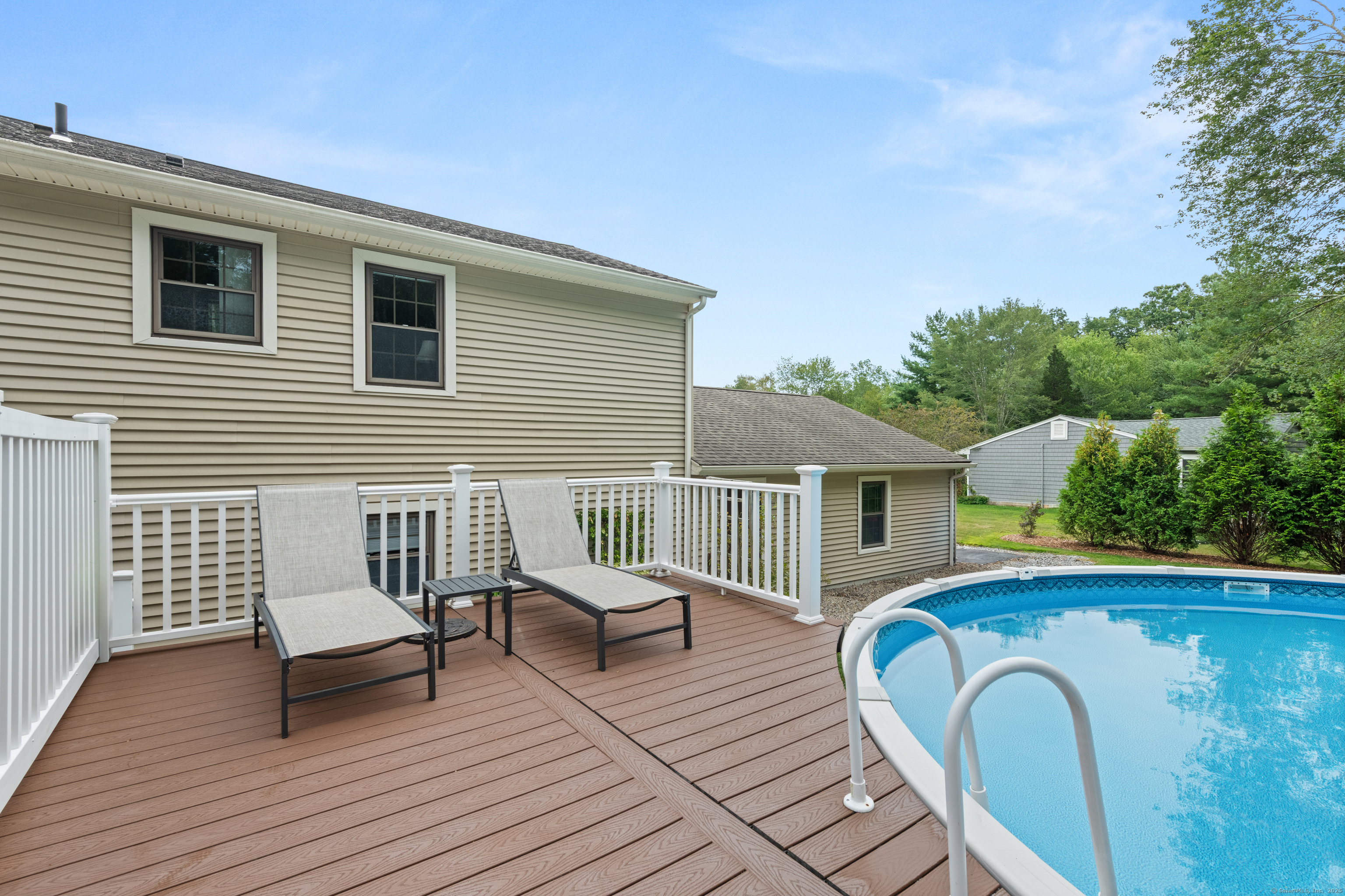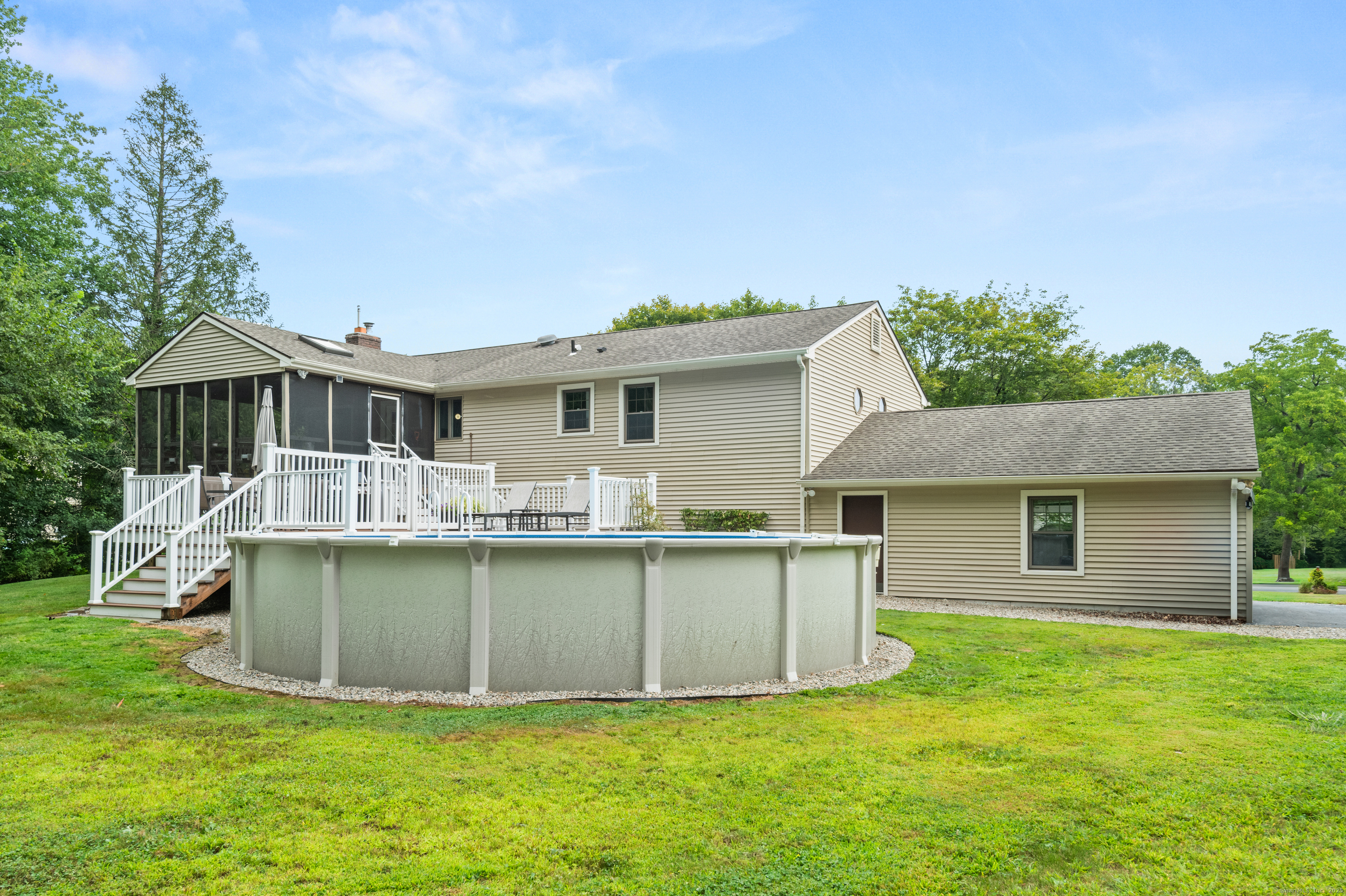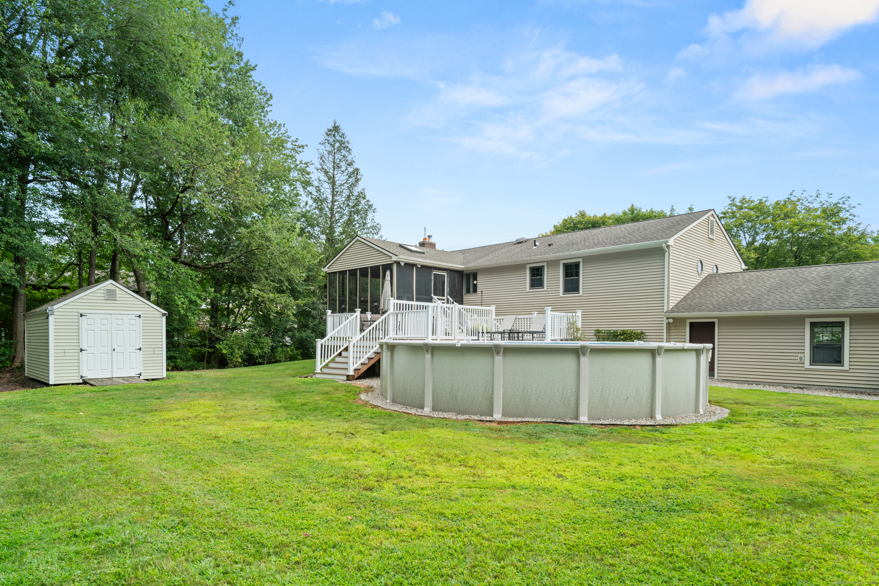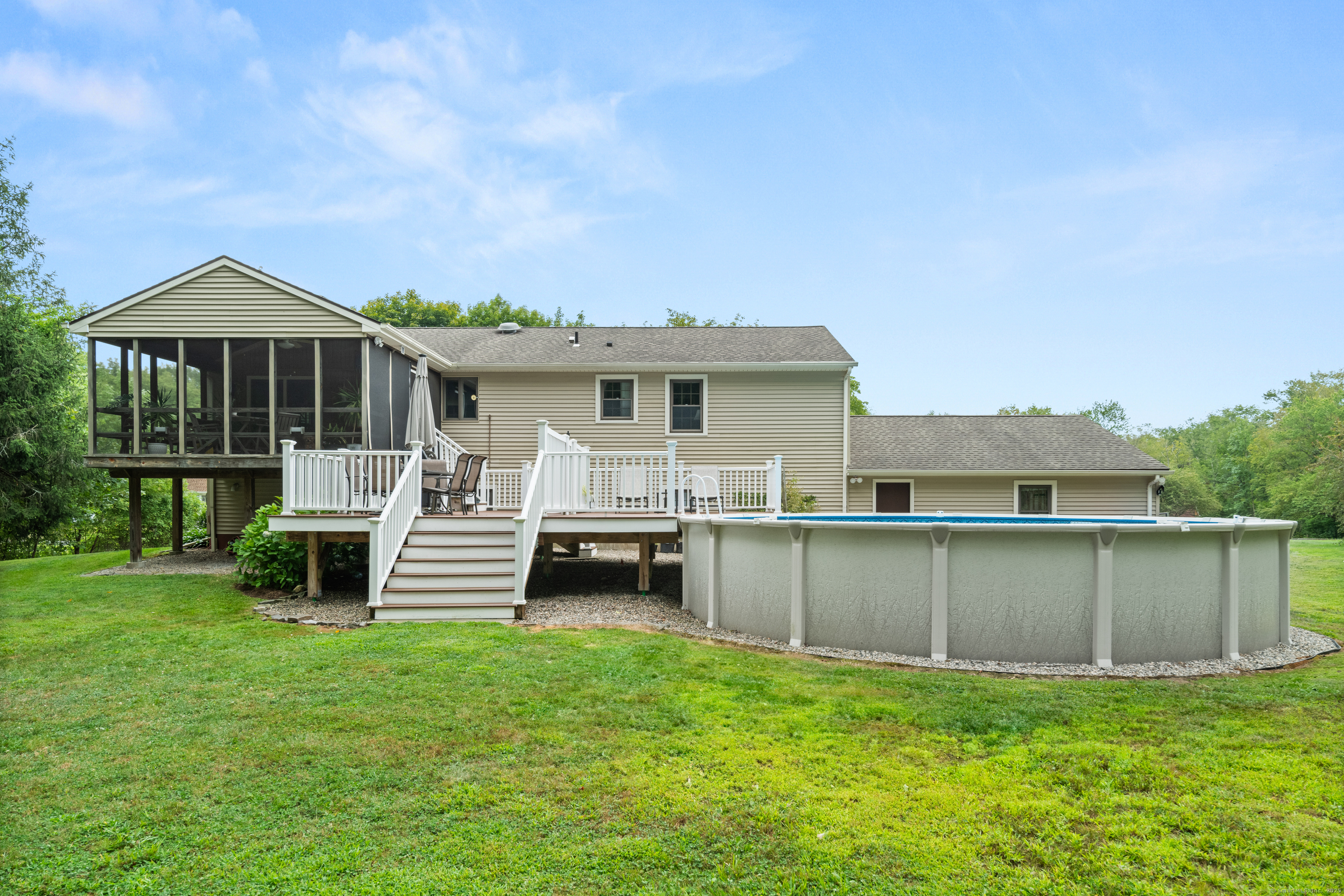 Just what you've been waiting for! Welcome to 43 Old Castle Drive - a stunning 3-bedroom, 2.5-bath raised ranch offering 2,428 sq. ft. of beautifully updated living space on a full acre in one of Monroe's most desirable cul-de-sacs. This home is the perfect blend of style, comfort, and function, with upgrades that make it truly move-in ready. Step inside and fall in love with the open floor plan, where gleaming hardwood floors and abundant natural light create a warm, welcoming feel. The remodeled kitchen is a showstopper - featuring crisp white shaker cabinets, stainless steel appliances, and a spacious center island with seating. Perfect for entertaining, it flows seamlessly into the dining room and bright living room, making every gathering feel effortless. Your outdoor retreat awaits! Enjoy morning coffee or summer dinners in the 3-season screened porch while overlooking your private backyard. Host unforgettable summer parties on the Trex deck or take a dip in the above-ground pool. A large storage shed keeps everything neatly tucked away. The expansive lower level is designed for today's lifestyle - complete with a cozy family room and angled fireplace, media room, a large home office, and a full laundry area. Additional must-haves include central air, natural gas heat, an attached 2-car garage, and public water with 2 year old septic. * HIGHEST AND BEST DUE 10/7 by 7pm
