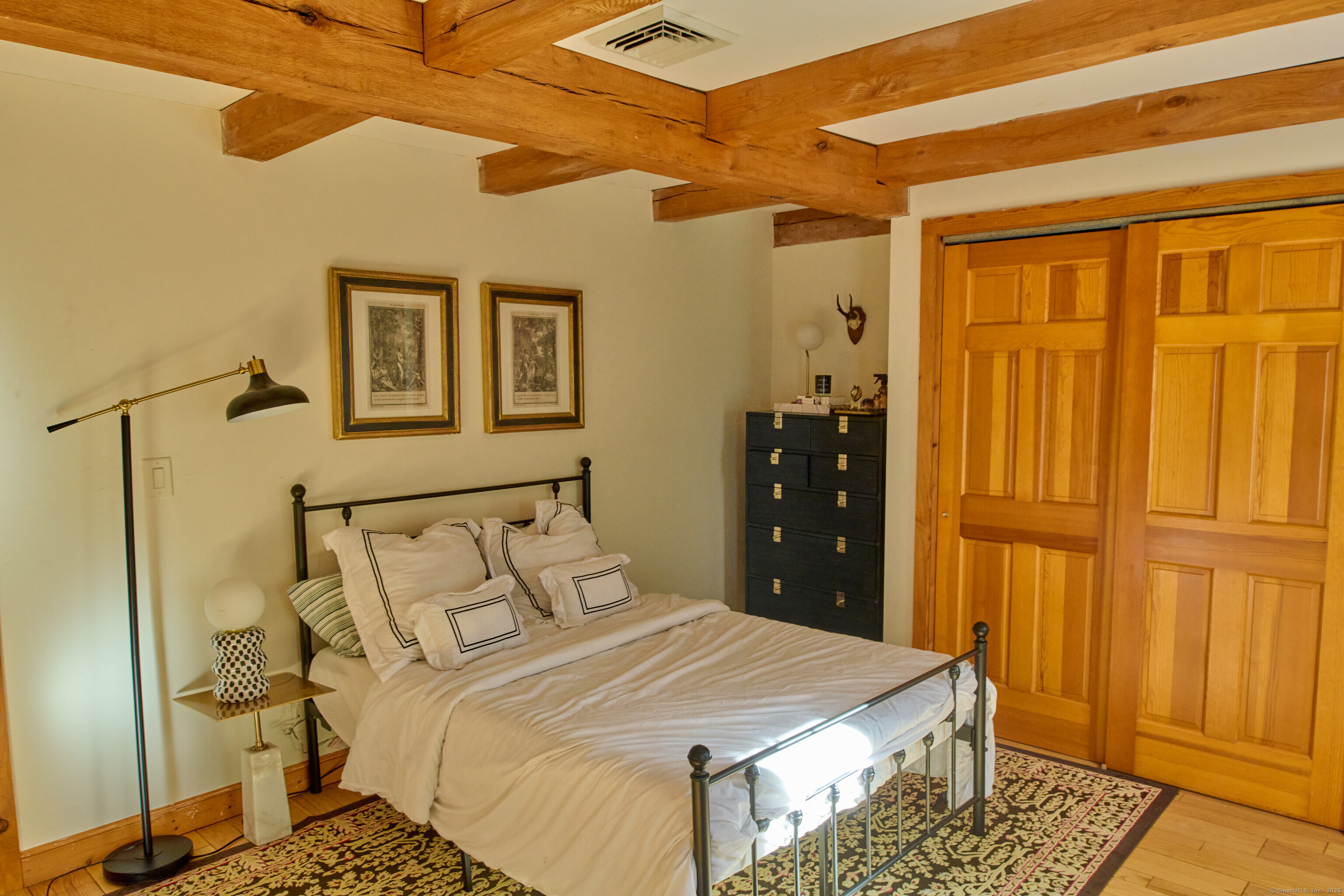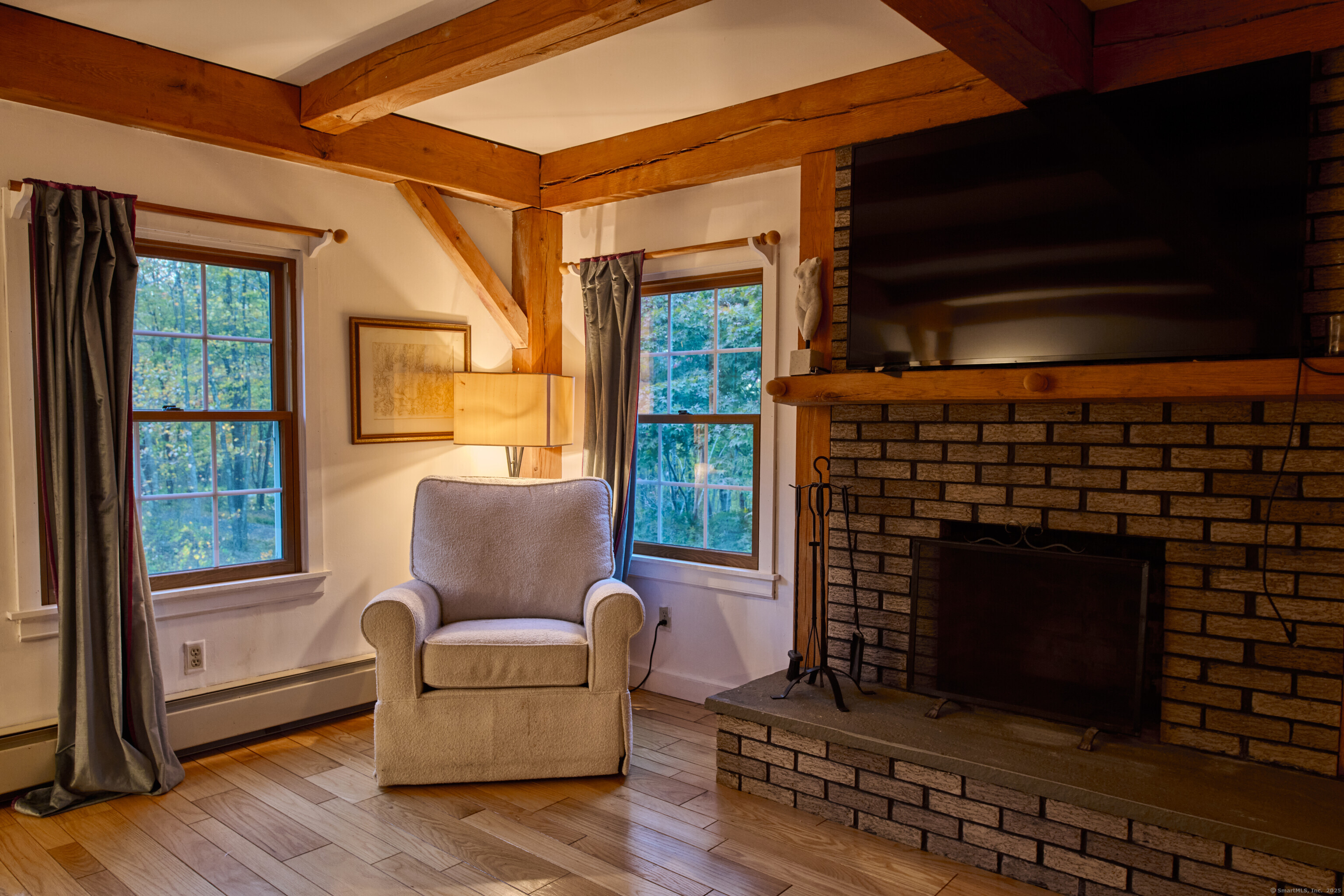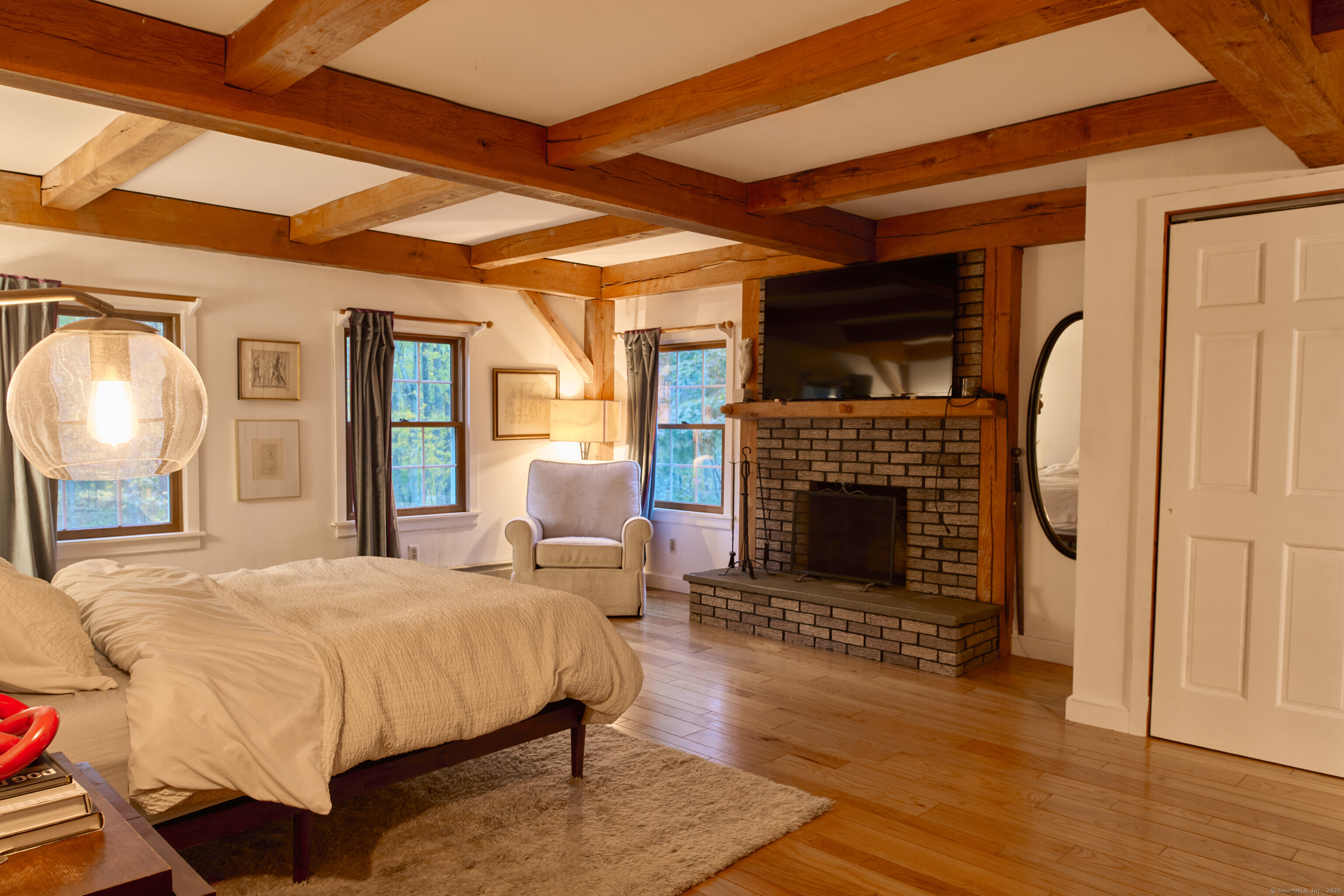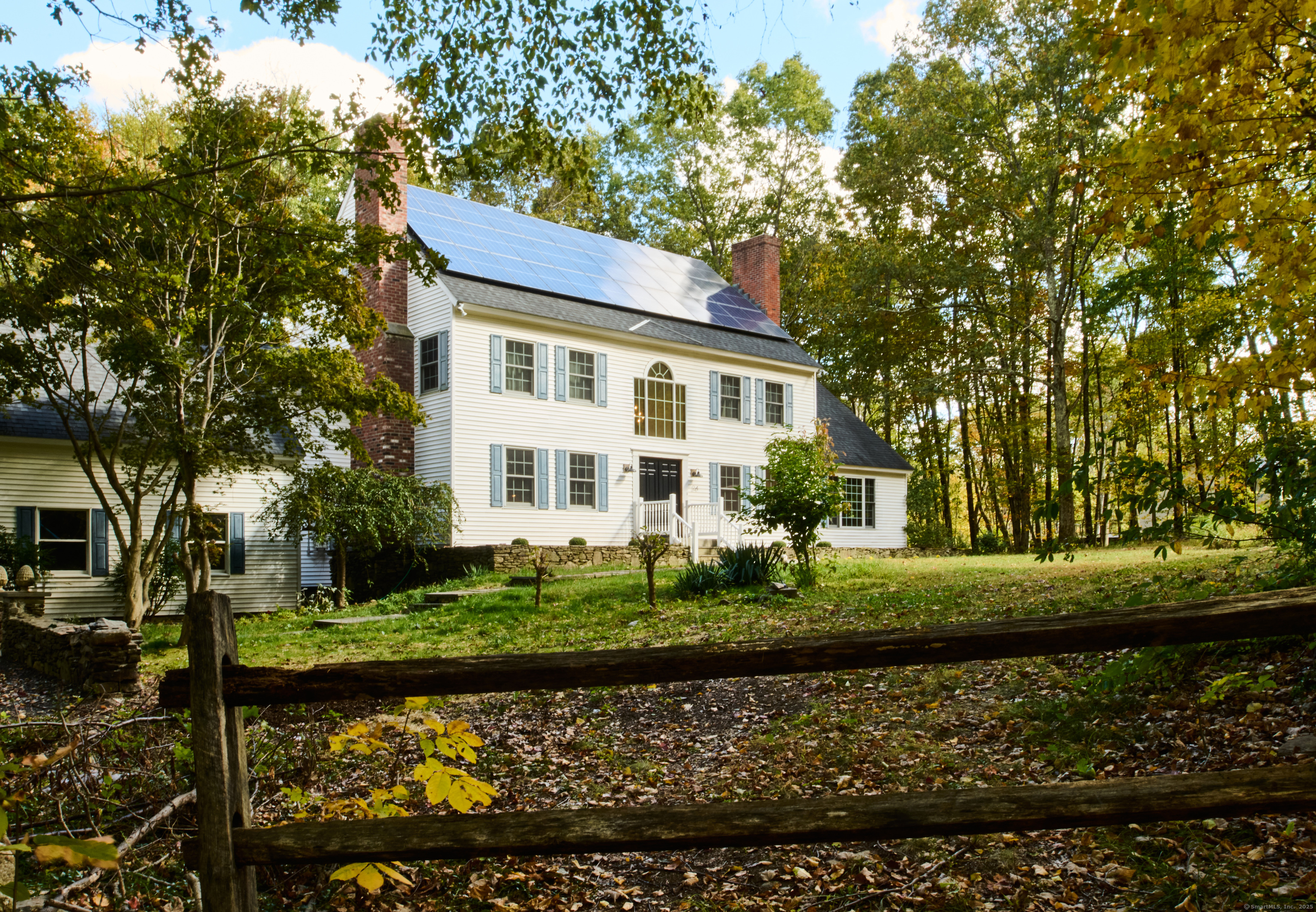 Stunning Post & Beam Home with Extensive Upgrades. This beautifully updated Post & Beam residence offers exceptional craftsmanship and modern amenities throughout. Over the past five years, the home has received numerous enhancements, including a new roof, remodeled kitchen with tile flooring, all-new Pella windows and doors, asphalt driveway, 5-zone LP boiler, central A/C unit, and more. The inviting interior centers around a dramatic two-story stair hall and an expansive Great Room with a cathedral ceiling and wood-burning fireplace-ideal for entertaining or relaxing evenings. Adjacent is a fully renovated eat-in kitchen featuring a large center island with honed granite countertops, custom cherry cabinetry, and premium appliances. Additional main-level highlights include a formal dining room and a private study with its own fireplace. Upstairs, four spacious bedrooms showcase exposed beams and hardwood floors. The primary suite includes a wood-burning fireplace and a private en-suite bath. A one-bedroom apartment above the garage with a separate entrance adds flexibility for guests or rental income. Energy-efficient features include R-26 insulated walls, Pella thermopane windows, LP heating, and solar PV panels. Additional amenities include a 2.5-car garage, central vacuum, screened porch, and five cedar closets. Set on a serene, wooded 3-acre lot with mature landscaping, the property offers privacy and convenience - just 15 minutes from shopping and I-84.