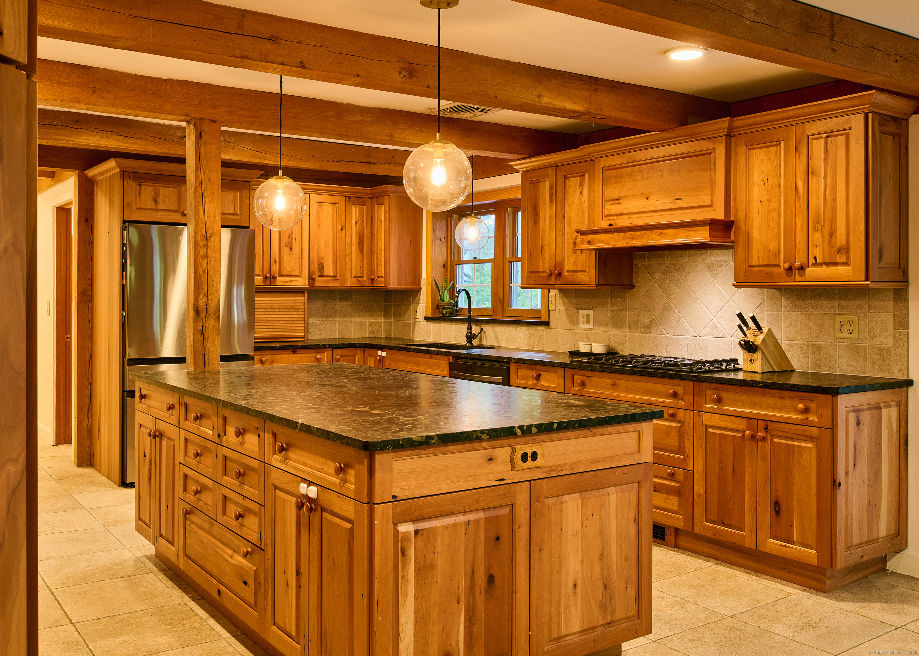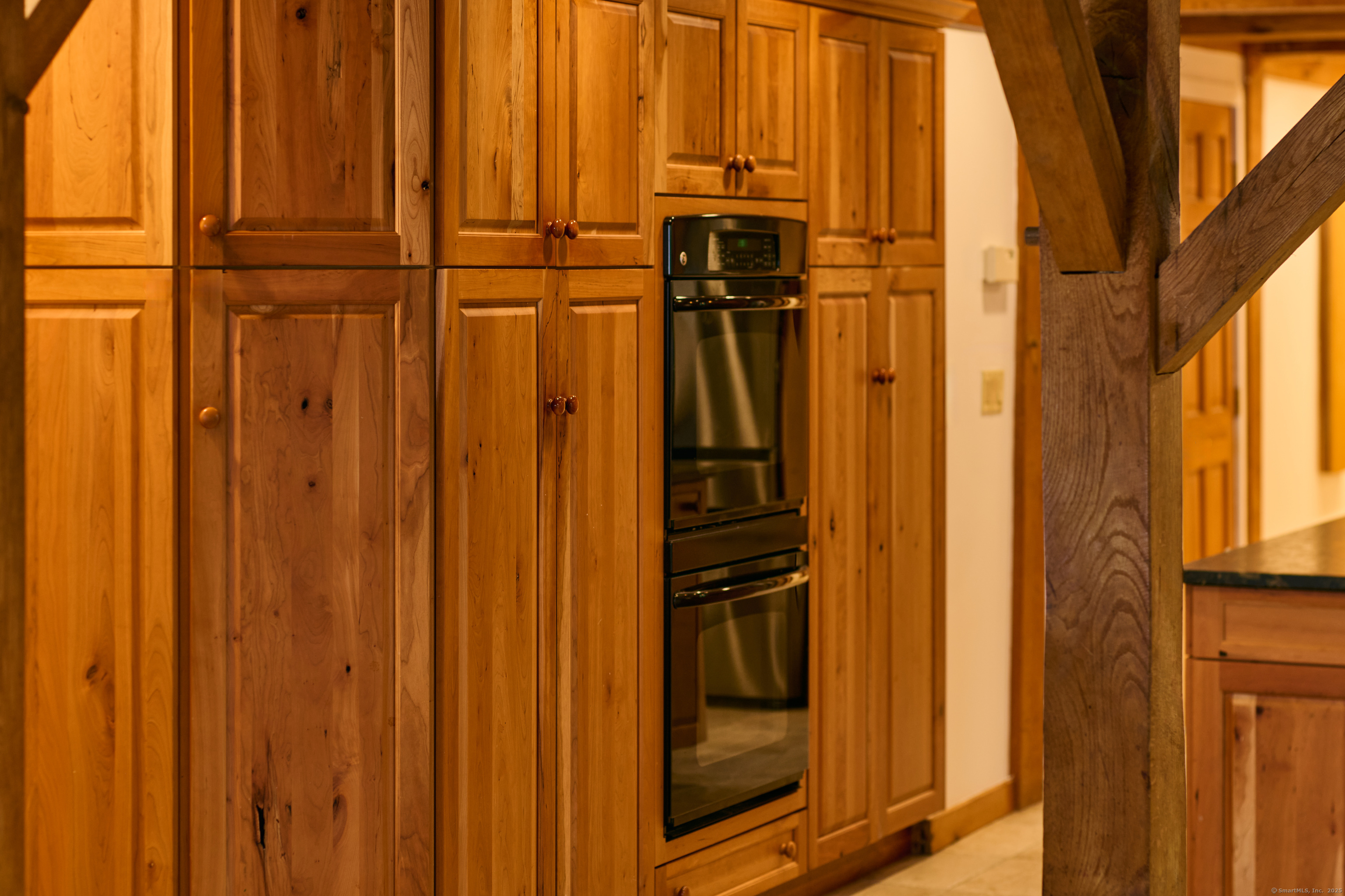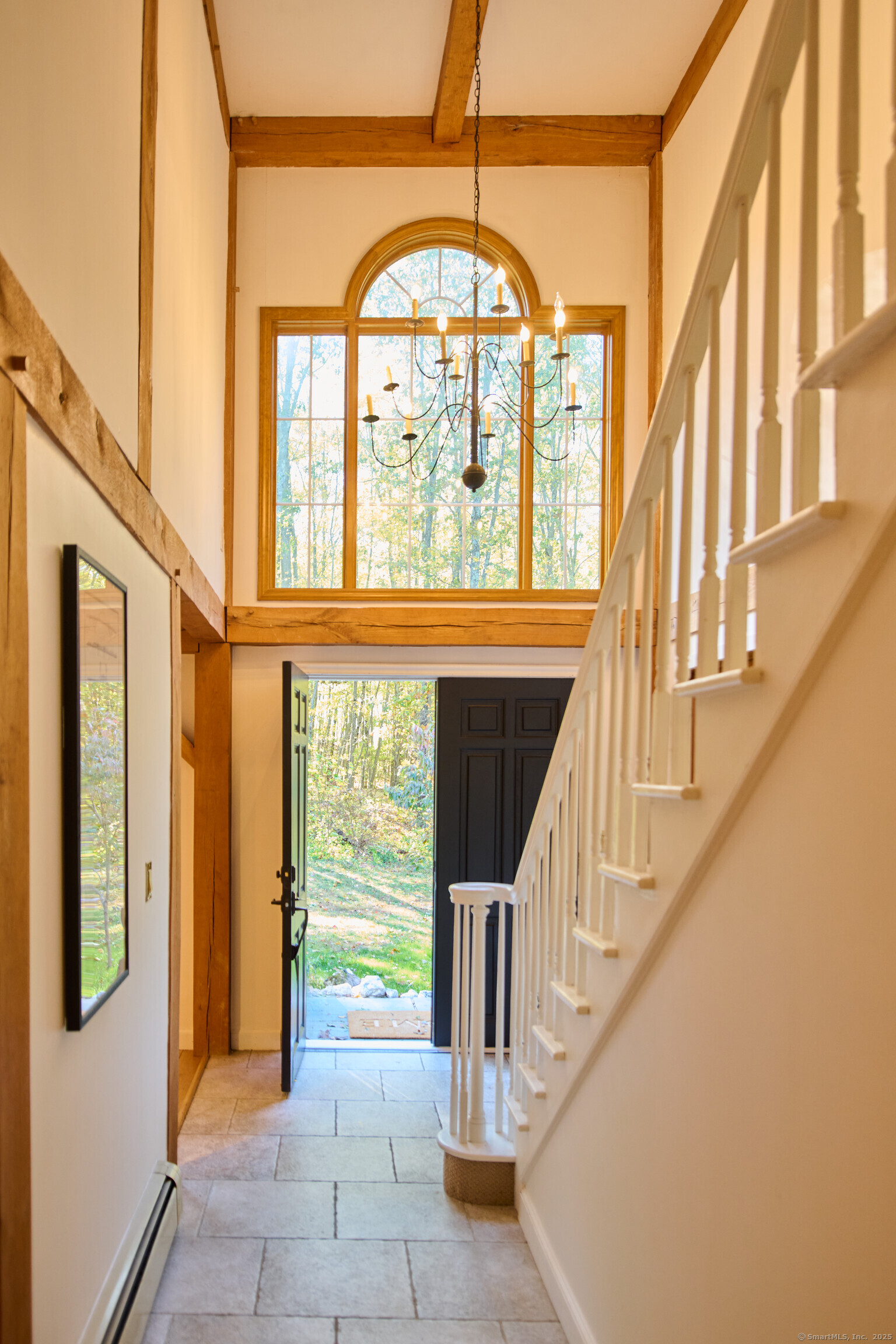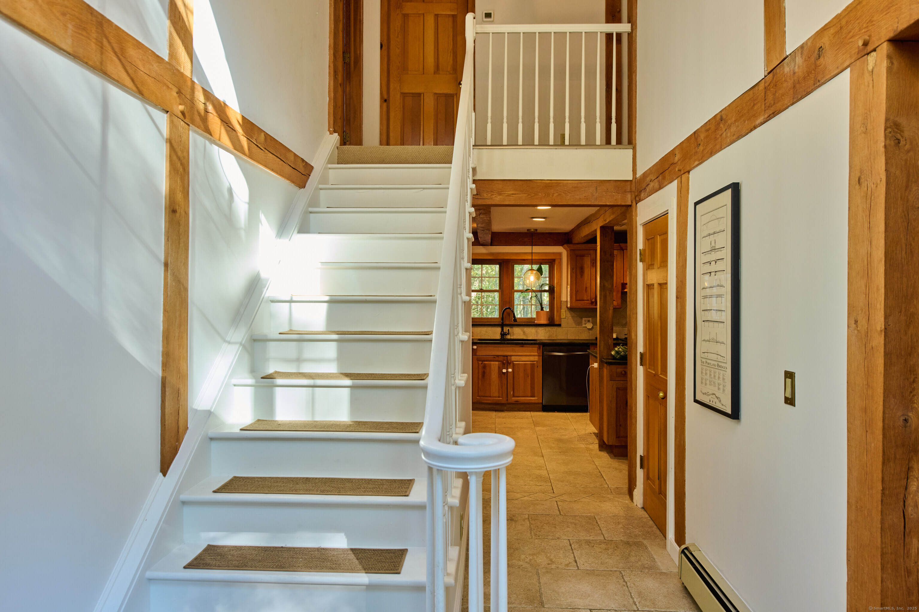 Stunning Post & Beam Home with Extensive Upgrades. This beautifully updated Post & Beam residence offers exceptional craftsmanship and modern amenities throughout. Over the past five years, the home has received numerous enhancements, including a new roof, remodeled kitchen with tile flooring, all-new Pella windows and doors, asphalt driveway, 5-zone LP boiler, central A/C unit, and more. The inviting interior centers around a dramatic two-story stair hall and an expansive Great Room with a cathedral ceiling and wood-burning fireplace-ideal for entertaining or relaxing evenings. Adjacent is a fully renovated eat-in kitchen featuring a large center island with honed granite countertops, custom cherry cabinetry, and premium appliances. Additional main-level highlights include a formal dining room and a private study with its own fireplace. Upstairs, four spacious bedrooms showcase exposed beams and hardwood floors. The primary suite includes a wood-burning fireplace and a private en-suite bath. A one-bedroom apartment above the garage with a separate entrance adds flexibility for guests or rental income. Energy-efficient features include R-26 insulated walls, Pella thermopane windows, LP heating, and solar PV panels. Additional amenities include a 2.5-car garage, central vacuum, screened porch, and five cedar closets. Set on a serene, wooded 3-acre lot with mature landscaping, the property offers privacy and convenience - just 15 minutes from shopping and I-84.