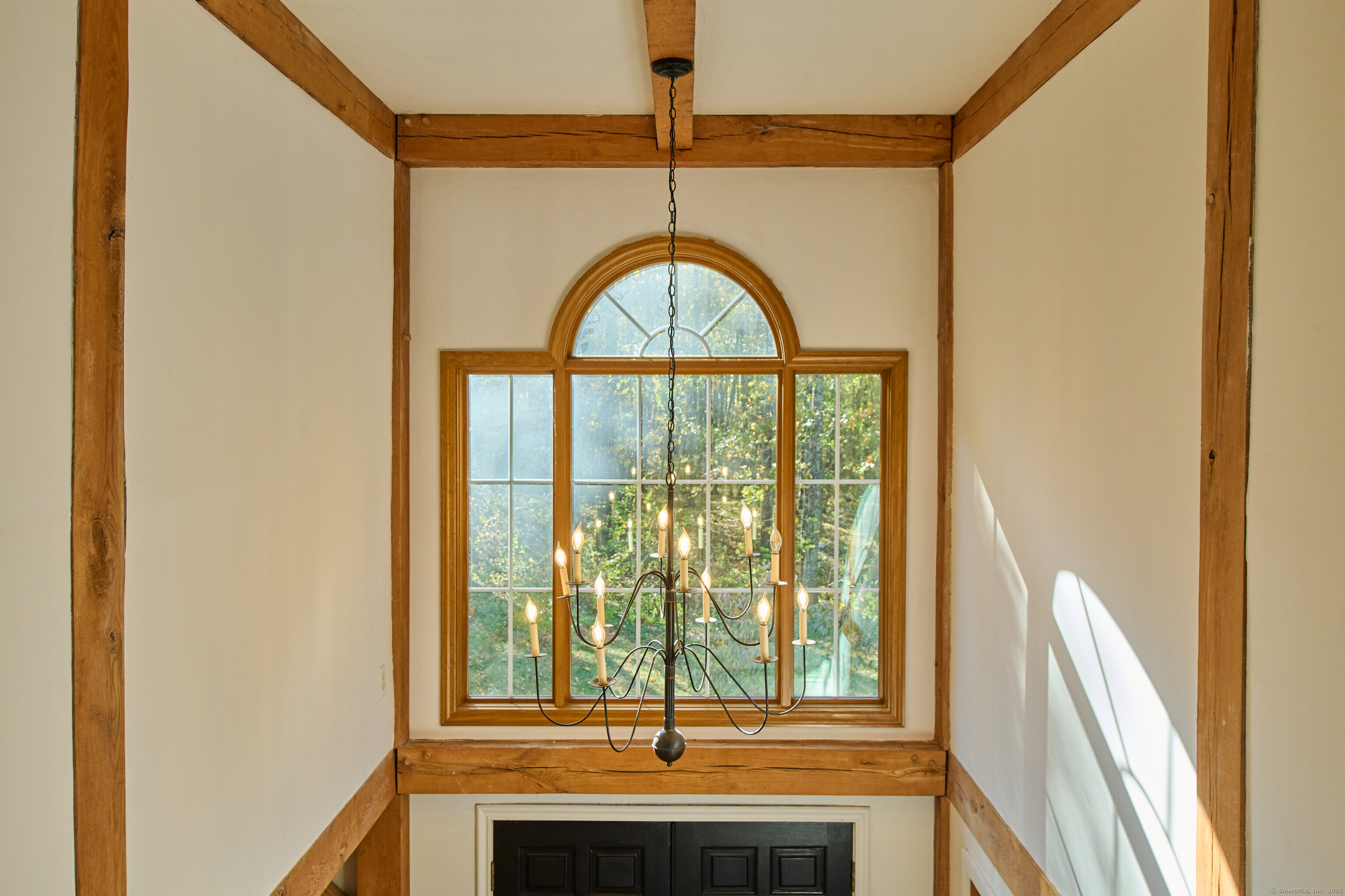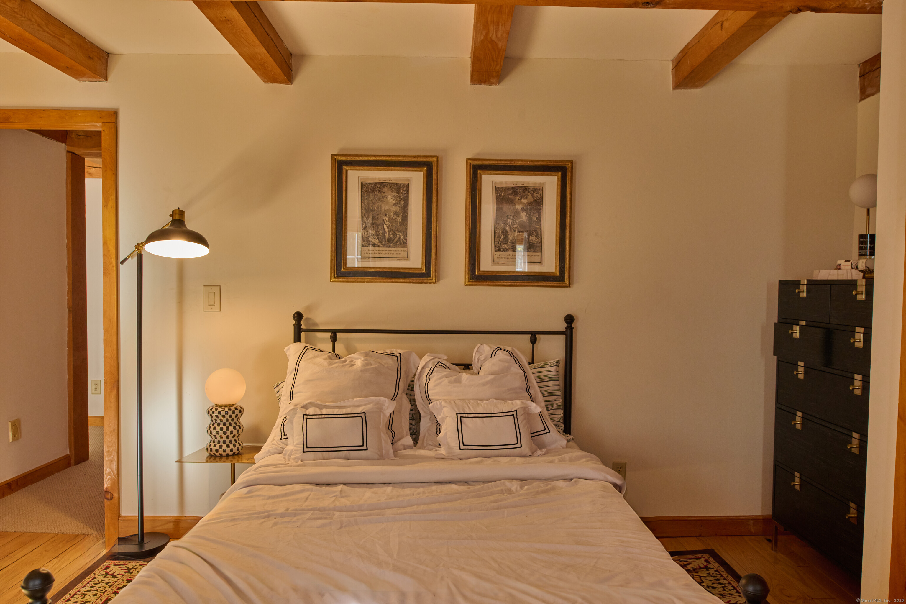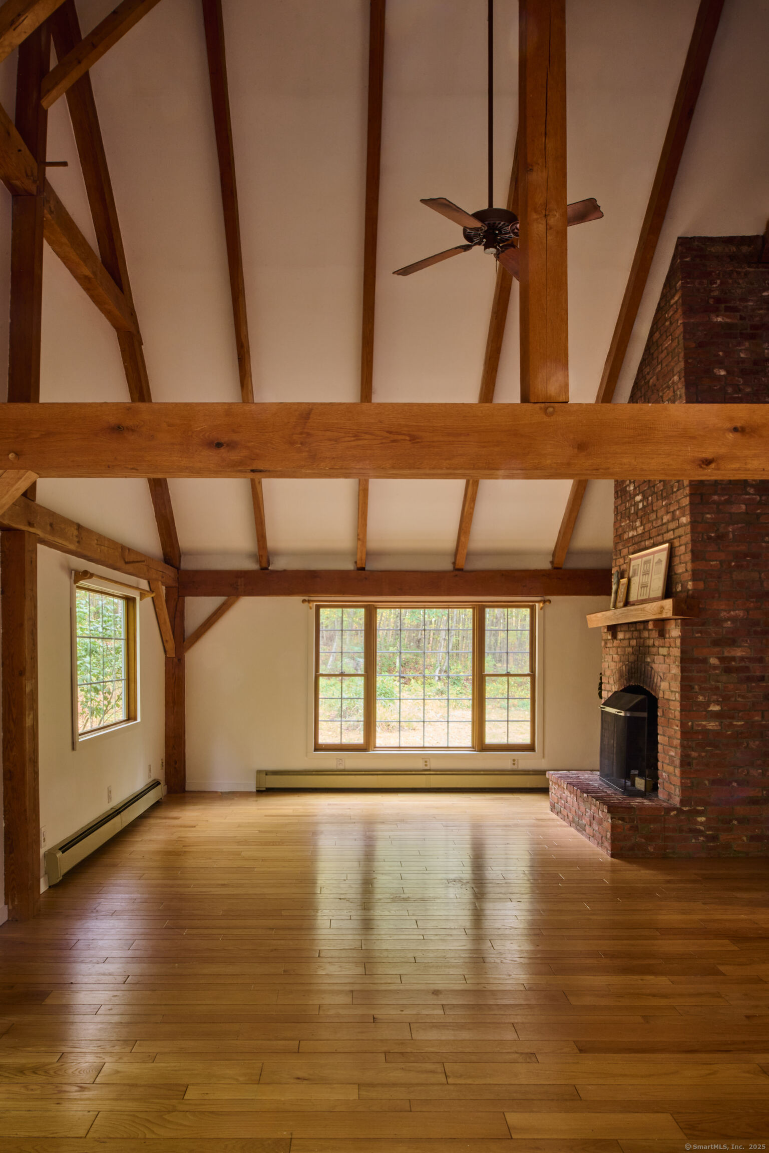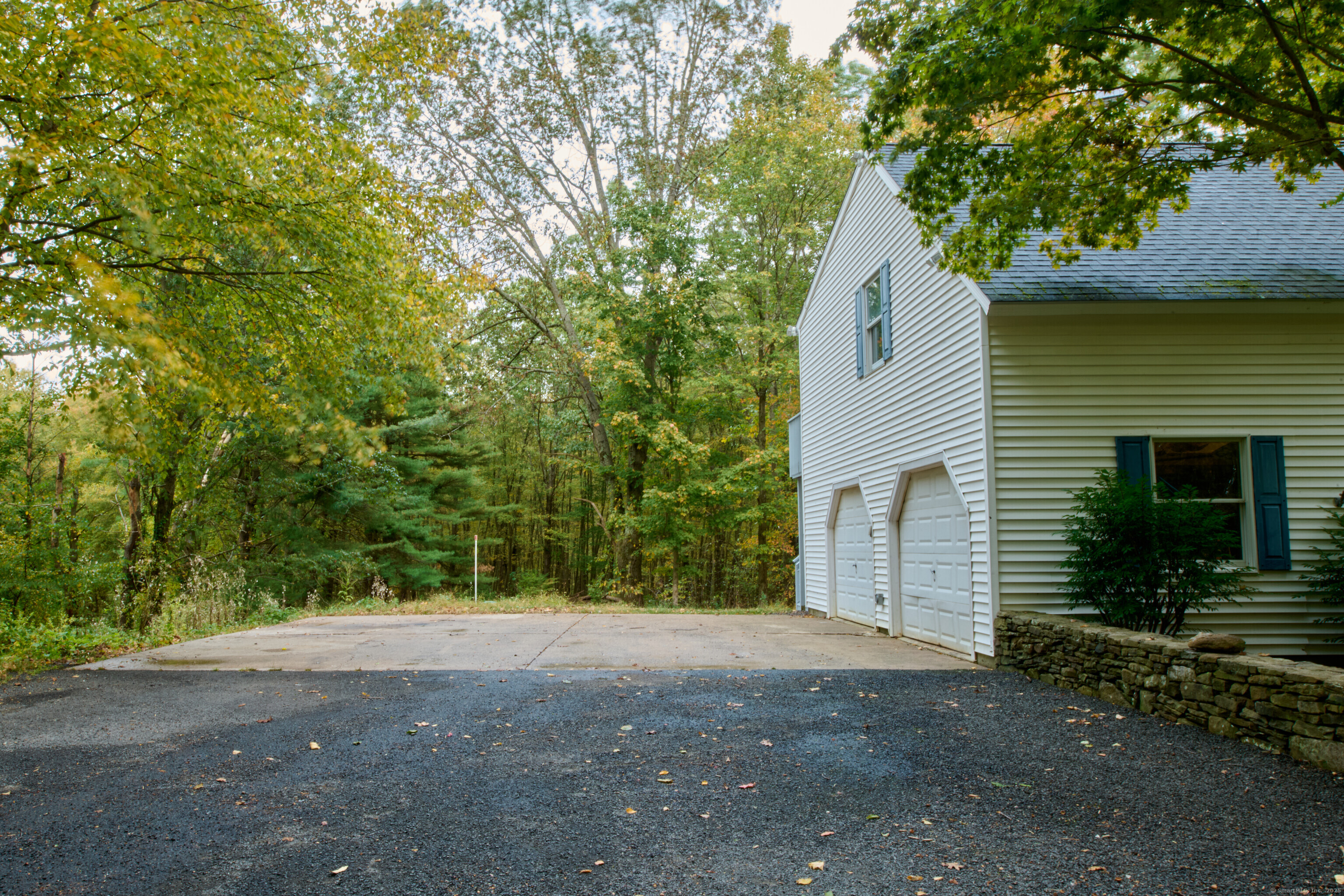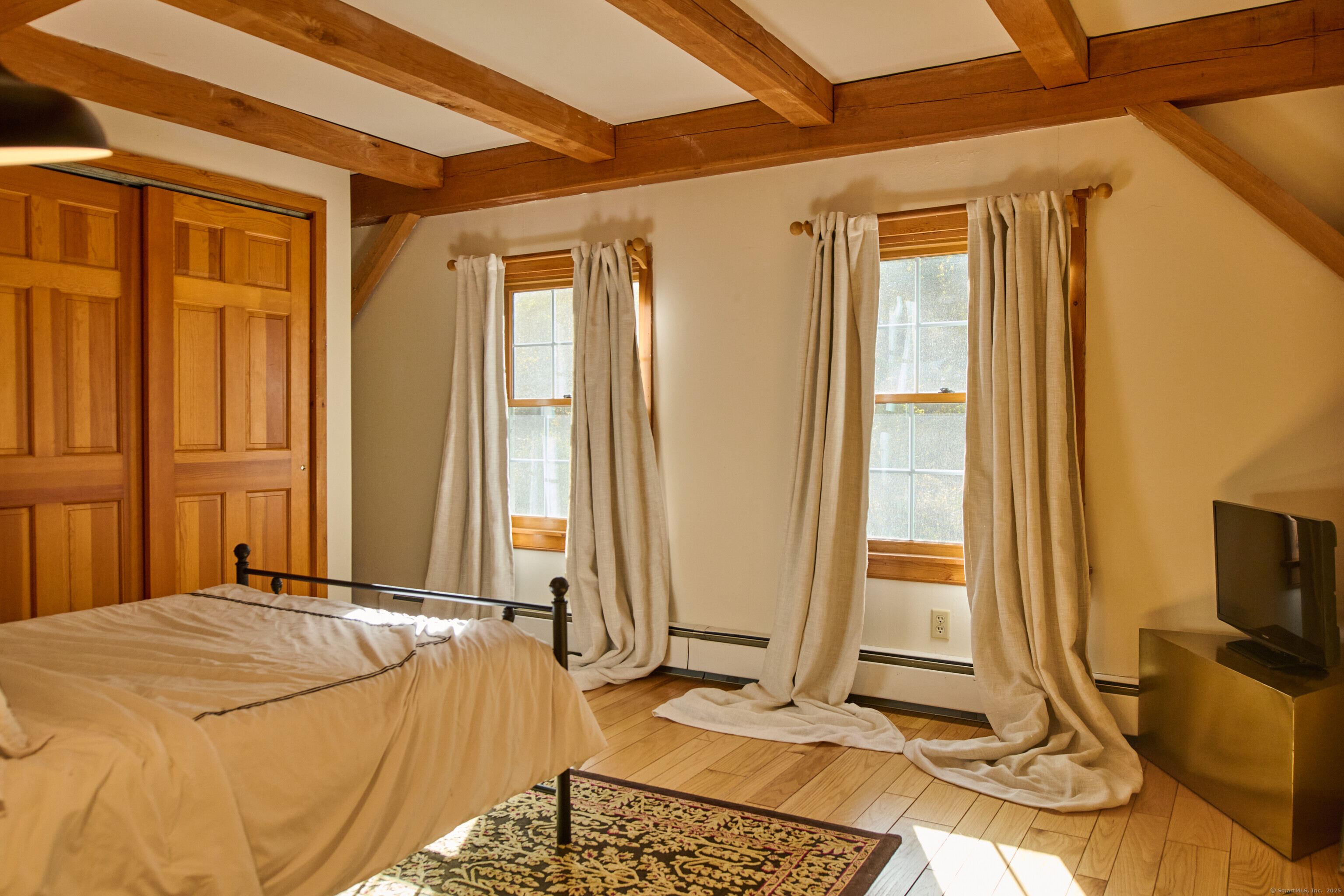 Stunning Post & Beam Home with Extensive Upgrades. This beautifully updated Post & Beam residence offers exceptional craftsmanship and modern amenities throughout. Over the past five years, the home has received numerous enhancements, including a new roof, remodeled kitchen with tile flooring, all-new Pella windows and doors, asphalt driveway, 5-zone LP boiler, central A/C unit, and more. The inviting interior centers around a dramatic two-story stair hall and an expansive Great Room with a cathedral ceiling and wood-burning fireplace-ideal for entertaining or relaxing evenings. Adjacent is a fully renovated eat-in kitchen featuring a large center island with honed granite countertops, custom cherry cabinetry, and premium appliances. Additional main-level highlights include a formal dining room and a private study with its own fireplace. Upstairs, four spacious bedrooms showcase exposed beams and hardwood floors. The primary suite includes a wood-burning fireplace and a private en-suite bath. A one-bedroom apartment above the garage with a separate entrance adds flexibility for guests or rental income. Energy-efficient features include R-26 insulated walls, Pella thermopane windows, LP heating, and solar PV panels. Additional amenities include a 2.5-car garage, central vacuum, screened porch, and five cedar closets. Set on a serene, wooded 3-acre lot with mature landscaping, the property offers privacy and convenience - just 15 minutes from shopping and I-84.