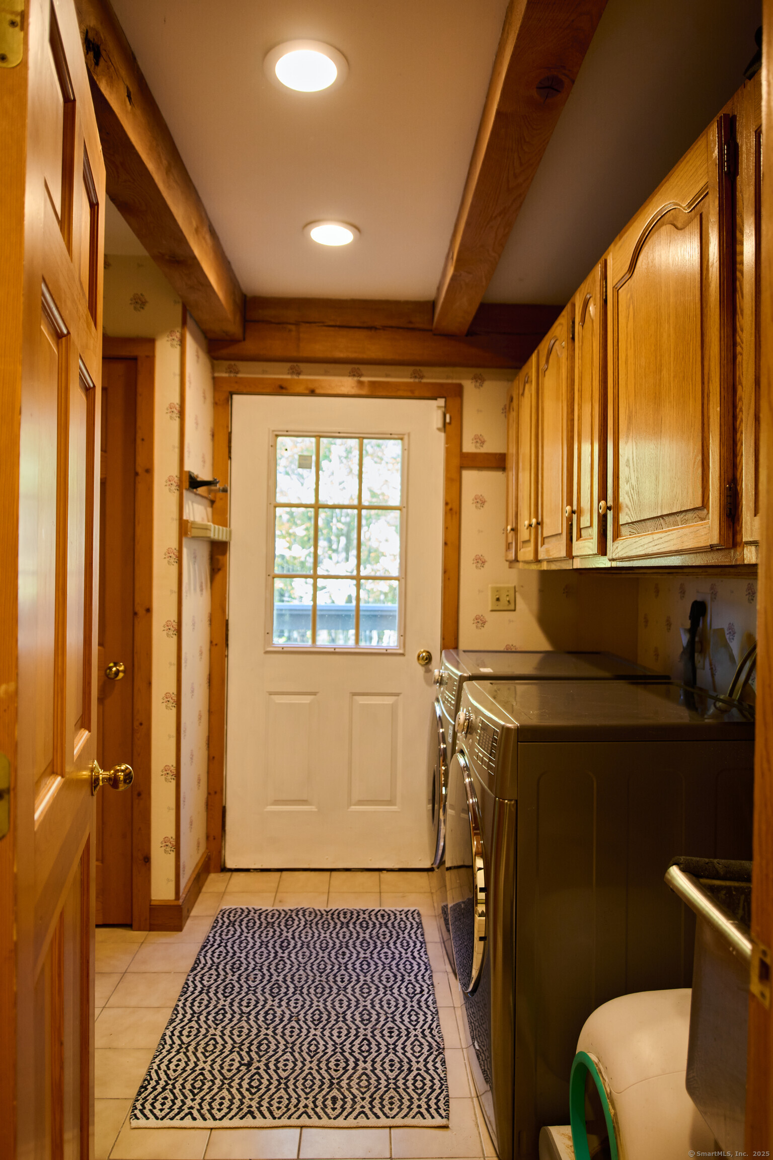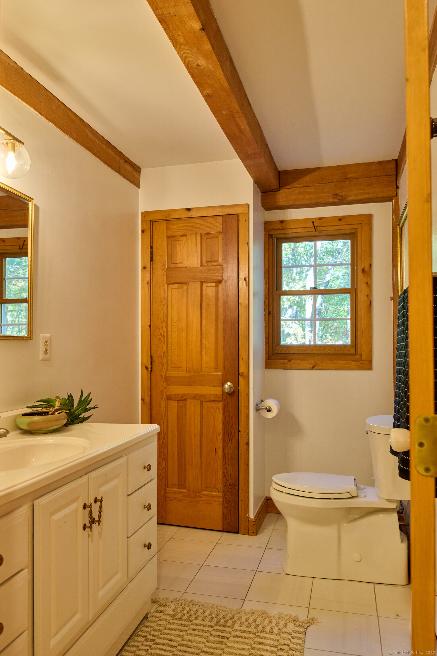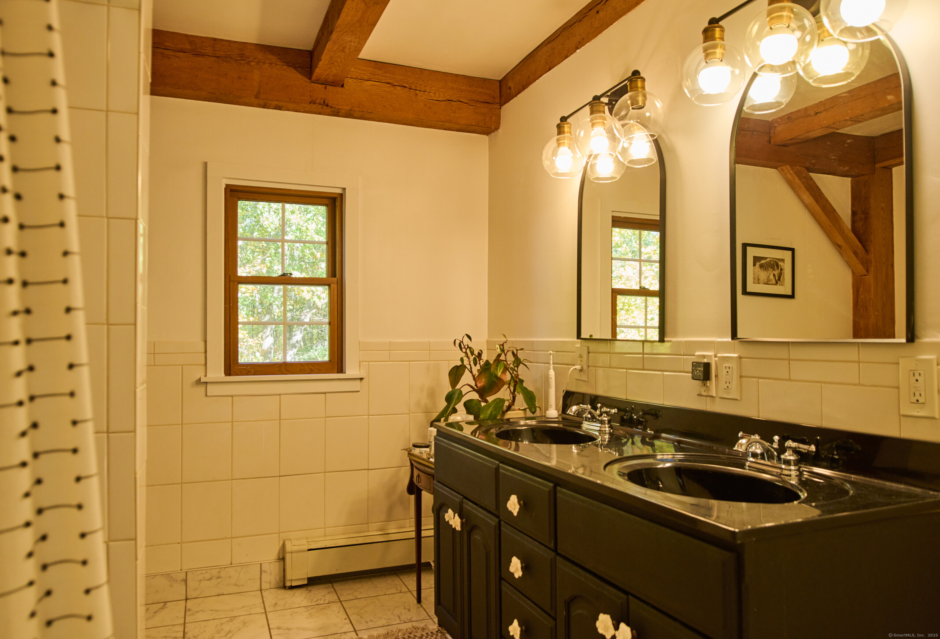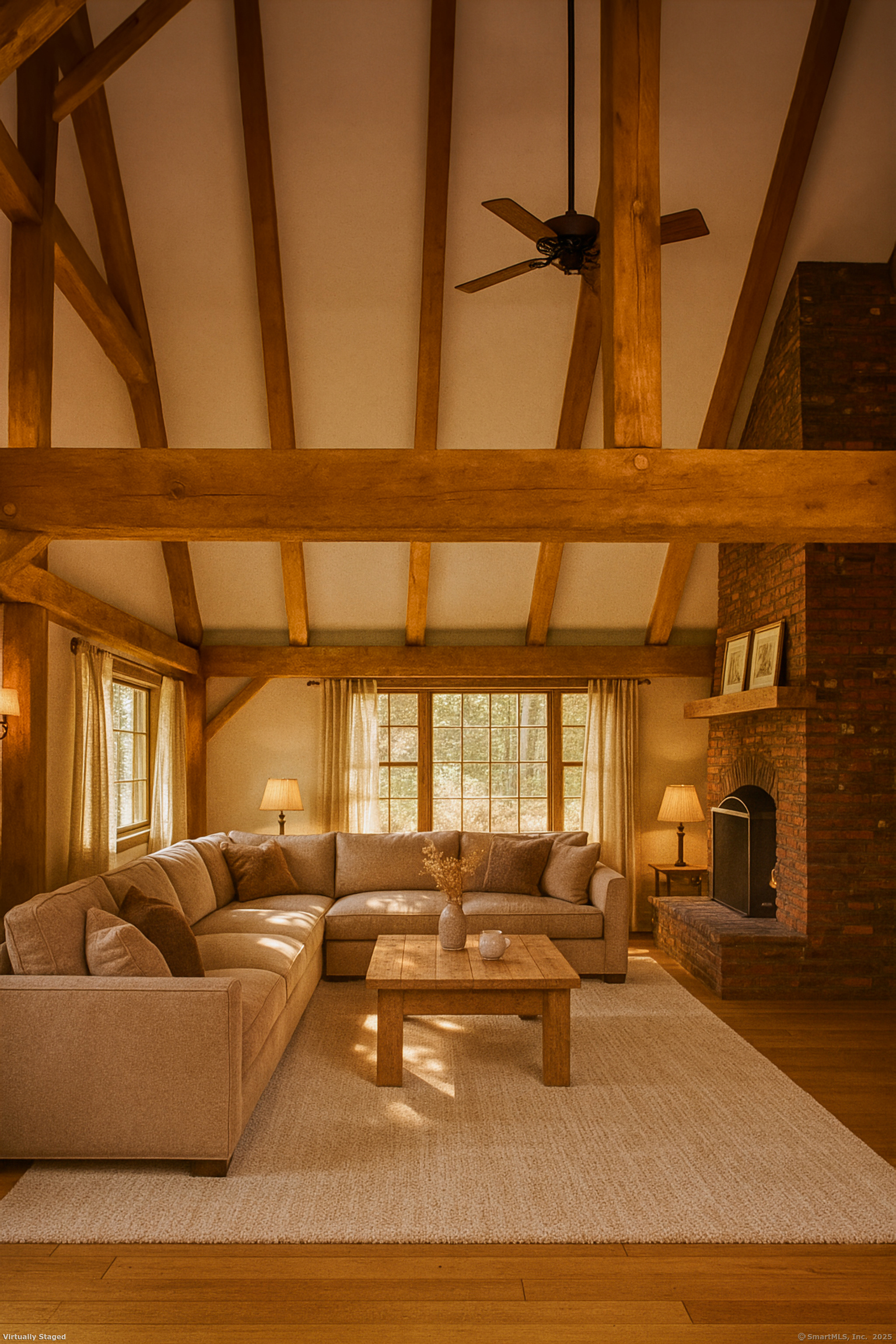Stunning Post & Beam Home with Extensive Upgrades. This beautifully updated Post & Beam residence offers exceptional craftsmanship and modern amenities throughout. Over the past five years, the home has received numerous enhancements, including a new roof, remodeled kitchen with tile flooring, all-new Pella windows and doors, asphalt driveway, 5-zone LP boiler, central A/C unit, and more. The inviting interior centers around a dramatic two-story stair hall and an expansive Great Room with a cathedral ceiling and wood-burning fireplace-ideal for entertaining or relaxing evenings. Adjacent is a fully renovated eat-in kitchen featuring a large center island with honed granite countertops, custom cherry cabinetry, and premium appliances. Additional main-level highlights include a formal dining room and a private study with its own fireplace. Upstairs, four spacious bedrooms showcase exposed beams and hardwood floors. The primary suite includes a wood-burning fireplace and a private en-suite bath. A one-bedroom apartment above the garage with a separate entrance adds flexibility for guests or rental income. Energy-efficient features include R-26 insulated walls, Pella thermopane windows, LP heating, and solar PV panels. Additional amenities include a 2.5-car garage, central vacuum, screened porch, and five cedar closets. Set on a serene, wooded 3-acre lot with mature landscaping, the property offers privacy and convenience - just 15 minutes from shopping and I-84.