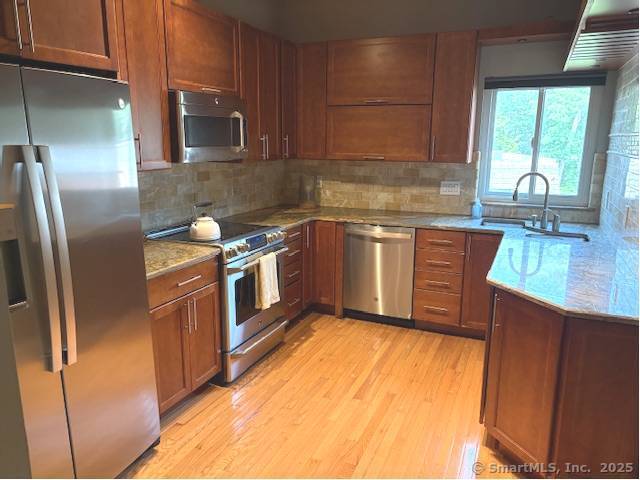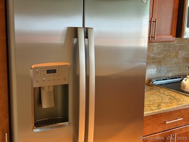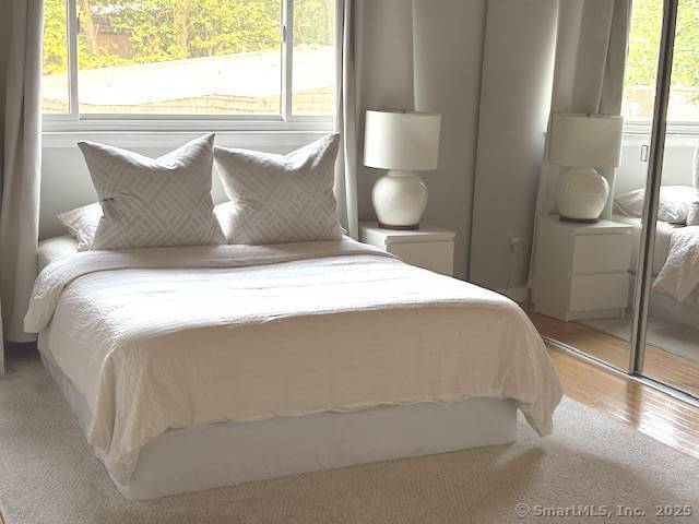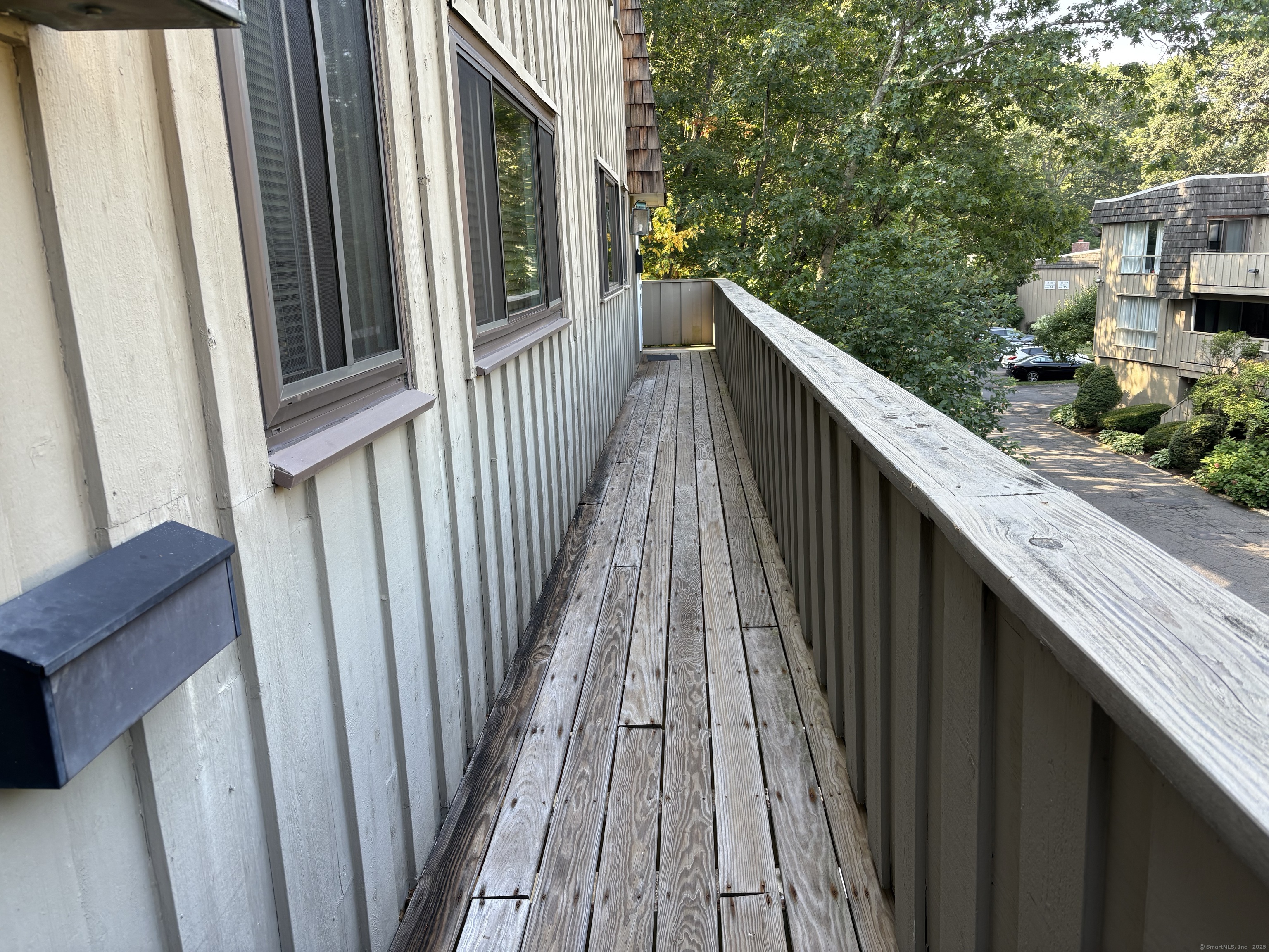 Bright and spacious very attractive two bedroom unit, featuring vaulted wood-beam ceilings, large living room/dining room with floor to ceiling brick fireplace and peaceful view of the woods from the deck. The remodeled kitchen includes brand-new stainless steel appliances, custom cabinetry, granite countertops and generous counter space-ideal for any home chef. The primary bedroom offers ample closet space. This is a must see! Located just 5 miles from Metro North and minutes from Post Road, I-95, and vibrant SoNo. This move-in-ready home offers comfort, convenience, and style in one of the area's most sought-after communities. Don't miss this opportunity-schedule a showing today!