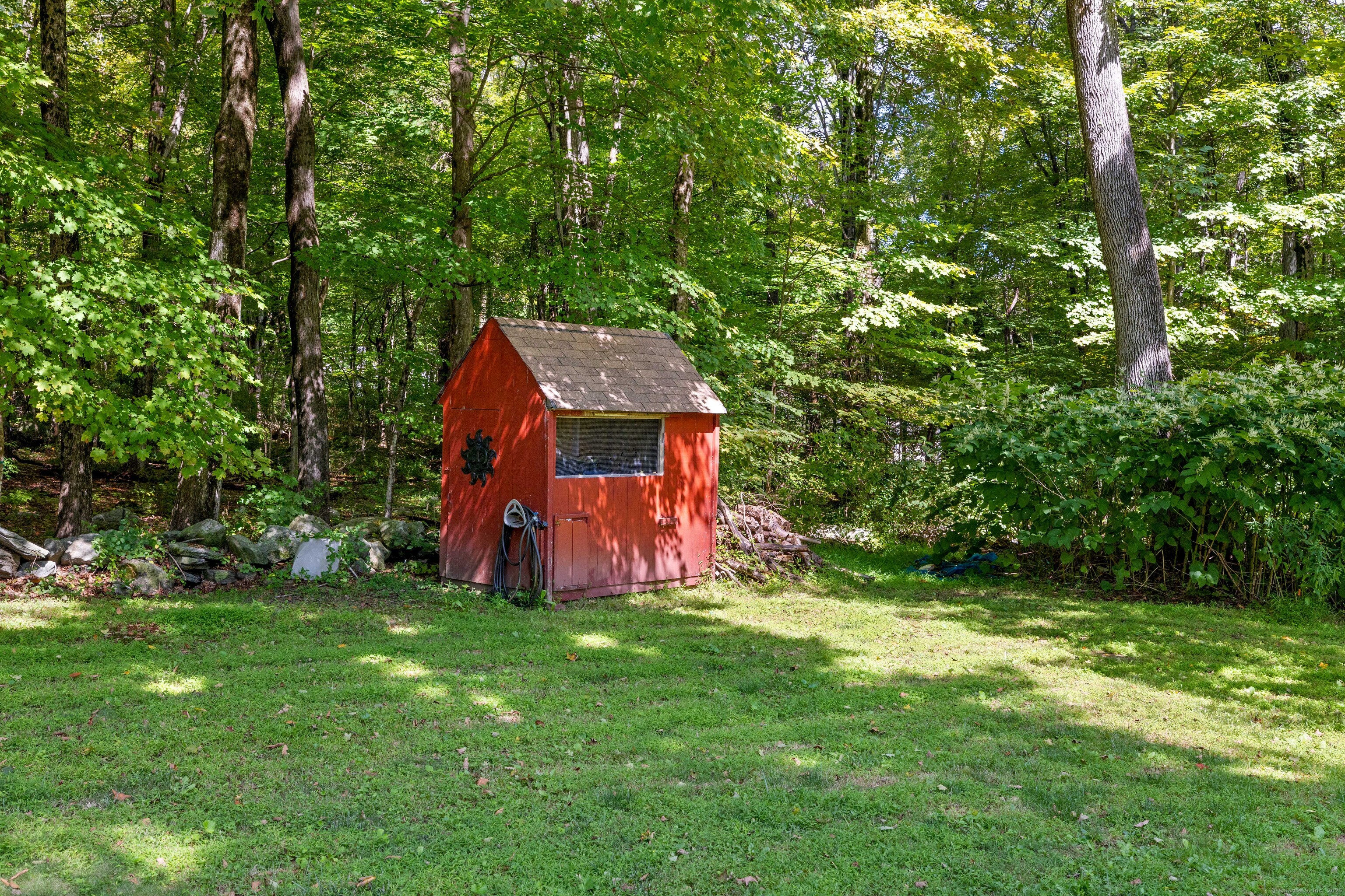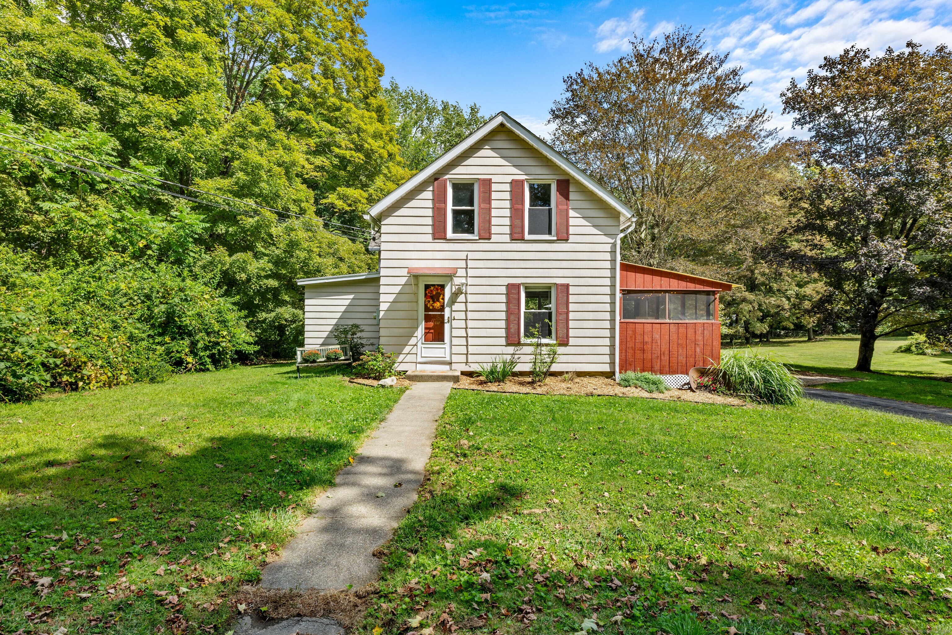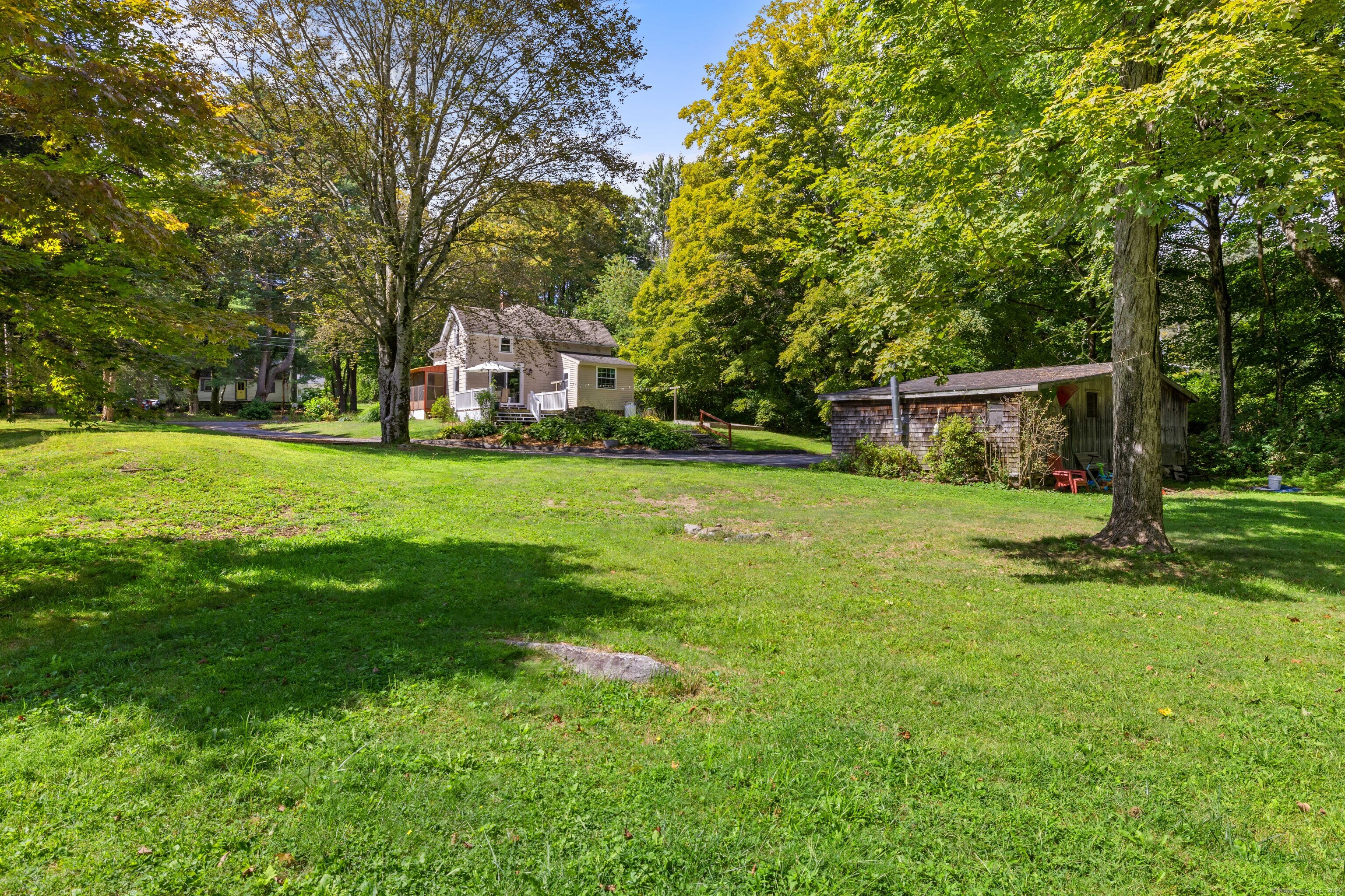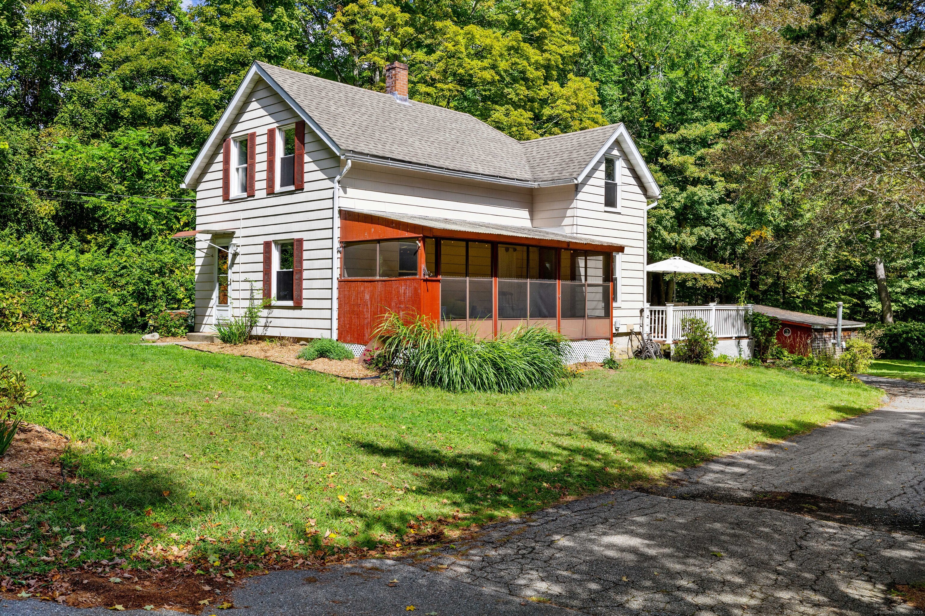 Charming 3-Bedroom Colonial in a Serene Wooded Setting Set on a private .75-acre lot, this inviting Colonial combines character and modern updates in a picturesque setting. The property features a detached barn perfect for a garage or workshop equipped with a woodstove, electricity plus a touch of history with a classic outhouse. Additional highlights include a storage shed, landscaped grounds with a tranquil water feature, and a spacious rear Trex deck perfect for gatherings conveniently located off the dining room . Inside, the open floor plan showcases hardwood floors, exposed beams, and a screened-in porch off the dining area for warm summer evenings. The remodeled kitchen offers maple cabinetry, a gas range, double sink, breakfast bar, pantry, and convenient first-floor laundry. The living and dining areas flow seamlessly, with sliders opening to the deck for effortless indoor-outdoor entertaining. Upstairs, you'll find three generously sized bedrooms, each with beautiful hardwood flooring. Recent updates include central air, 200-amp electrical service, a newer well and pump, and replaced windows and roof-ensuring peace of mind for years to come.