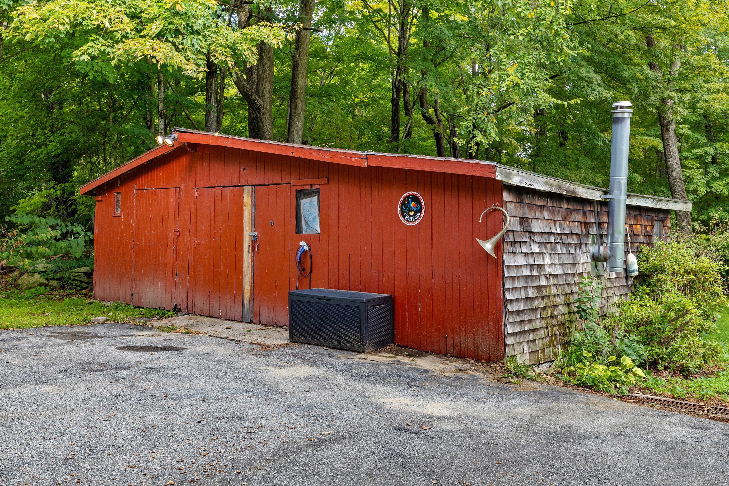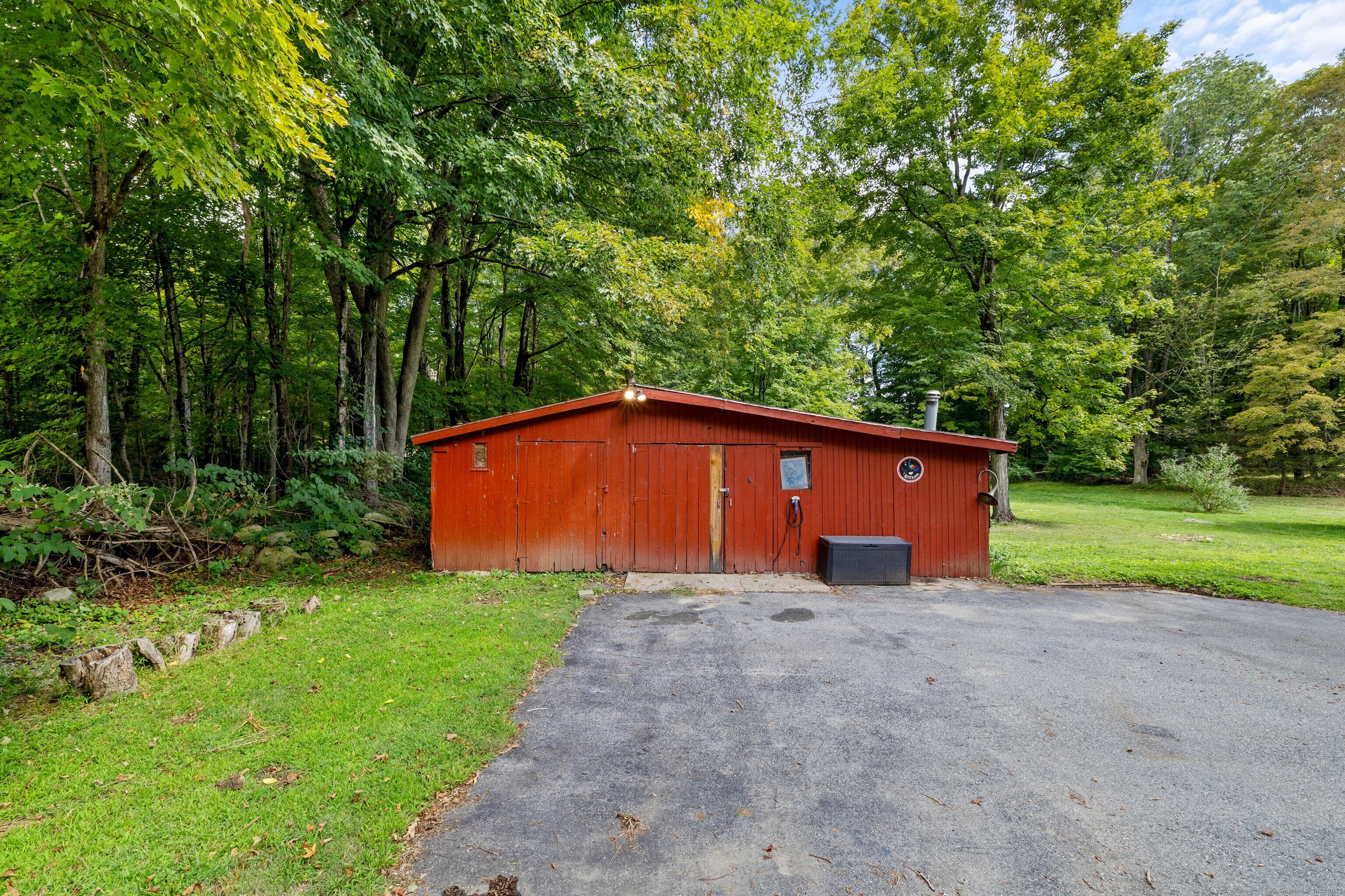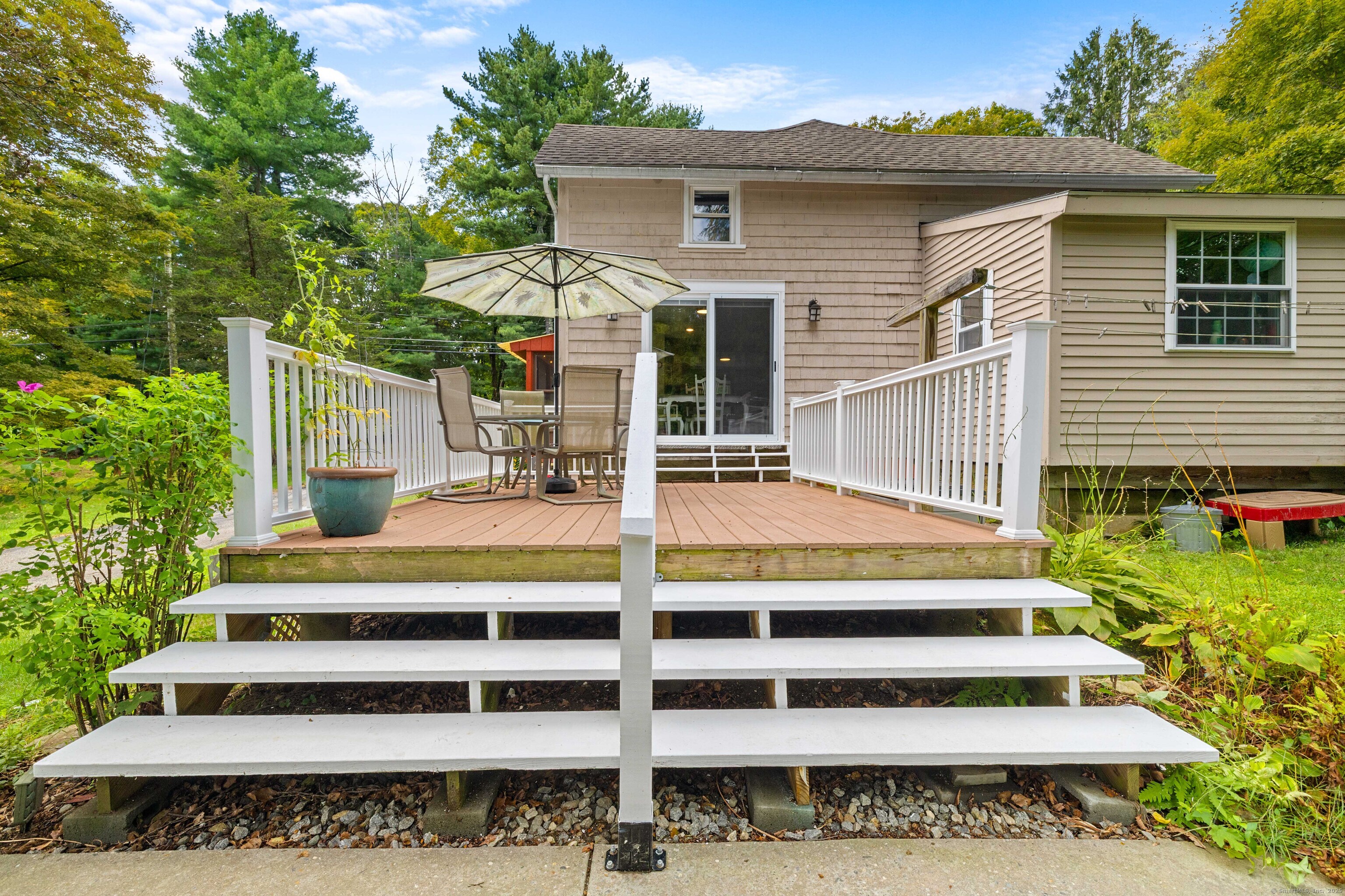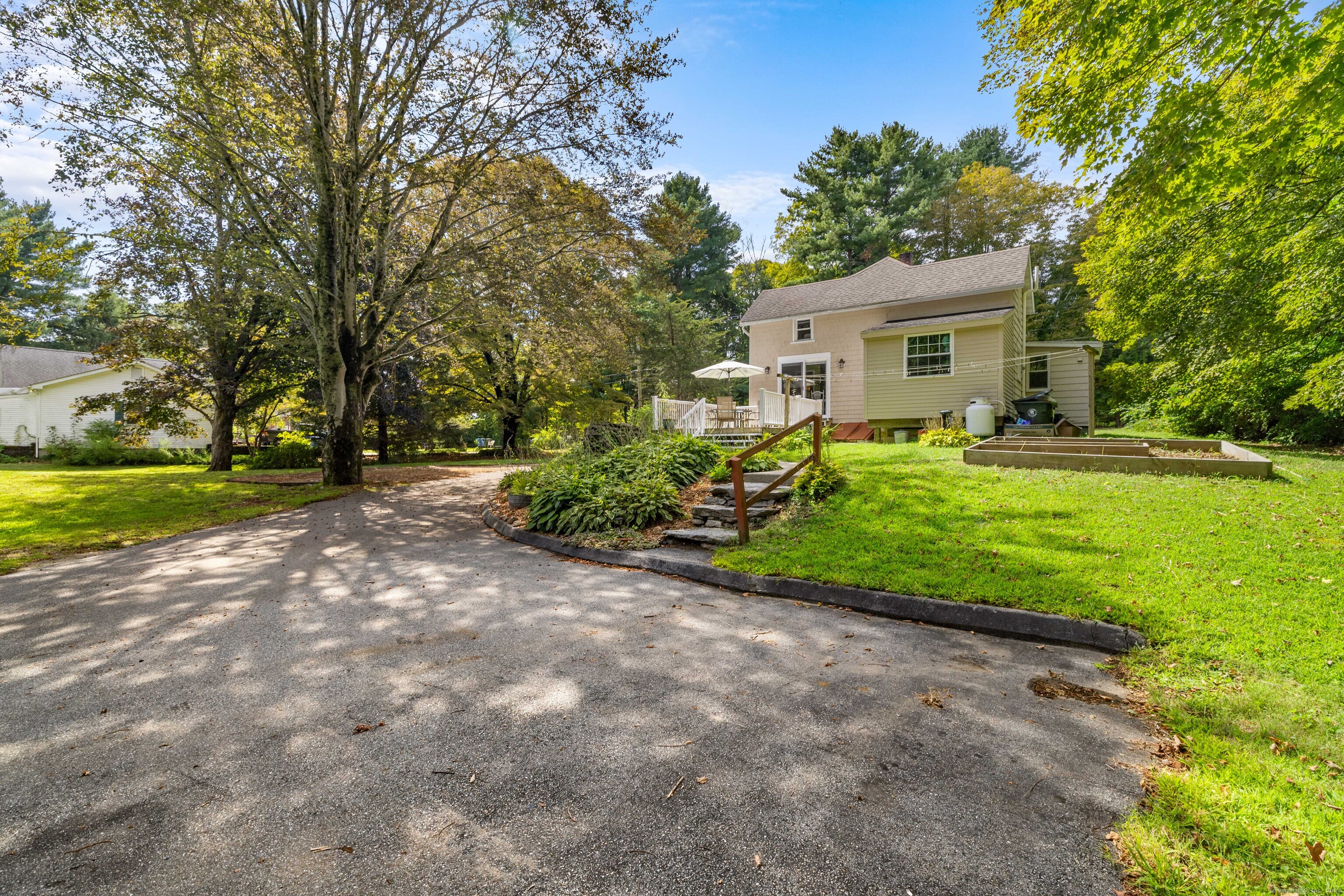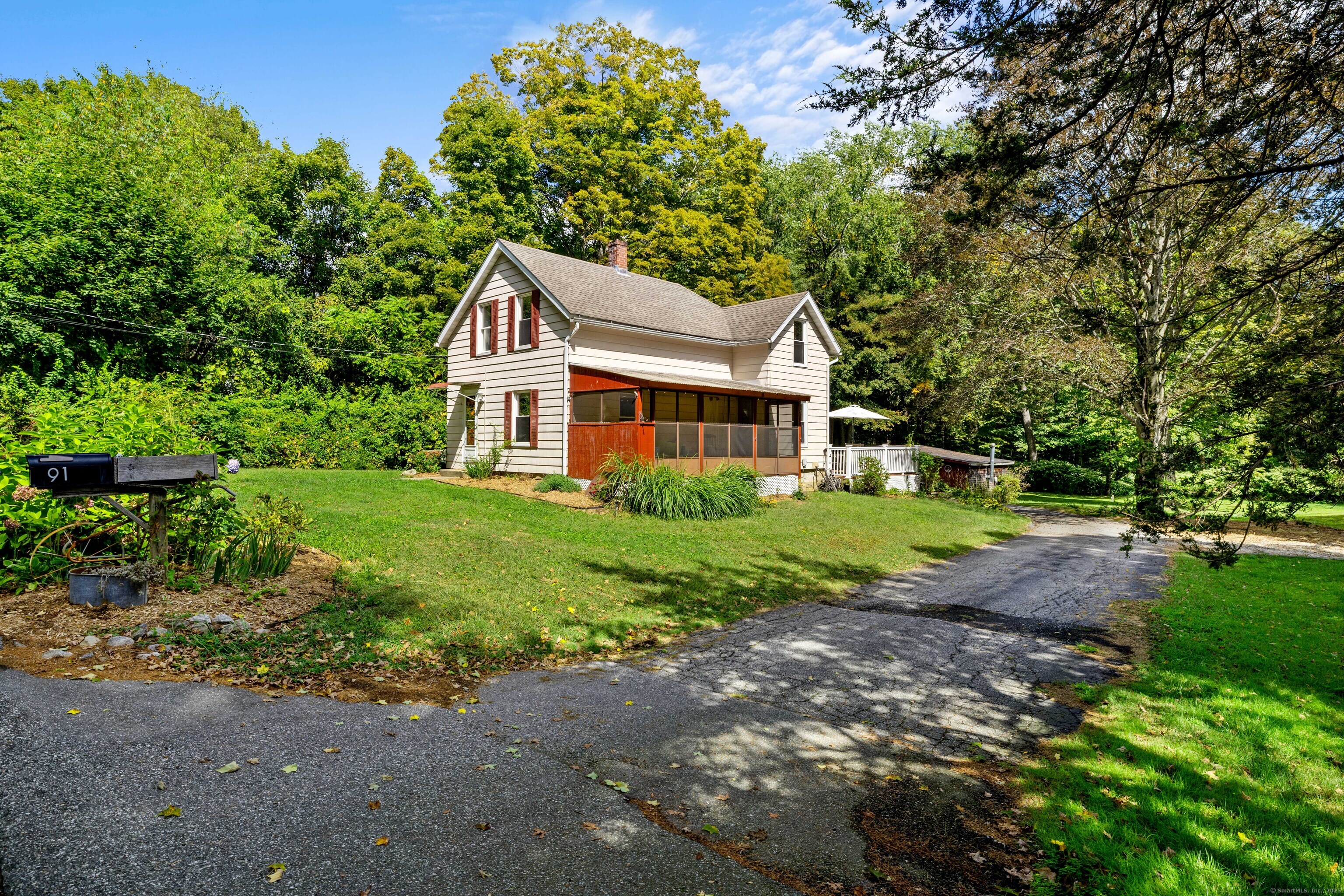 Charming 3-Bedroom Colonial in a Serene Wooded Setting Set on a private .75-acre lot, this inviting Colonial combines character and modern updates in a picturesque setting. The property features a detached barn perfect for a garage or workshop equipped with a woodstove, electricity plus a touch of history with a classic outhouse. Additional highlights include a storage shed, landscaped grounds with a tranquil water feature, and a spacious rear Trex deck perfect for gatherings conveniently located off the dining room . Inside, the open floor plan showcases hardwood floors, exposed beams, and a screened-in porch off the dining area for warm summer evenings. The remodeled kitchen offers maple cabinetry, a gas range, double sink, breakfast bar, pantry, and convenient first-floor laundry. The living and dining areas flow seamlessly, with sliders opening to the deck for effortless indoor-outdoor entertaining. Upstairs, you'll find three generously sized bedrooms, each with beautiful hardwood flooring. Recent updates include central air, 200-amp electrical service, a newer well and pump, and replaced windows and roof-ensuring peace of mind for years to come.