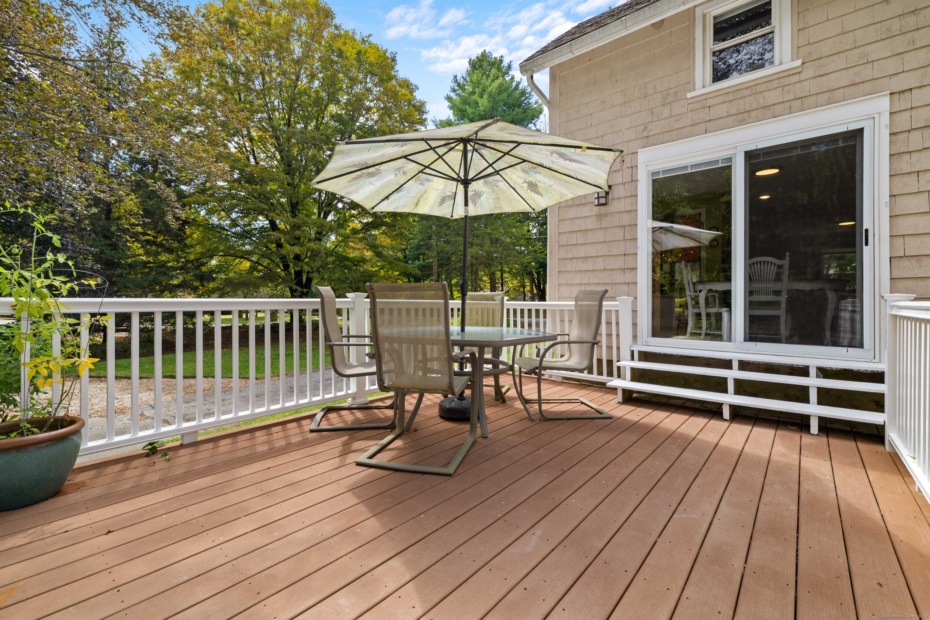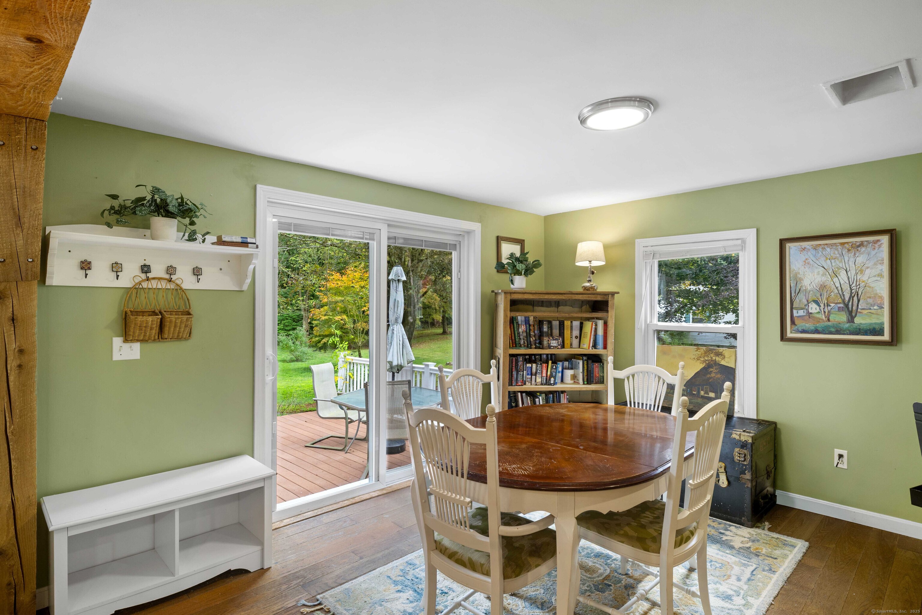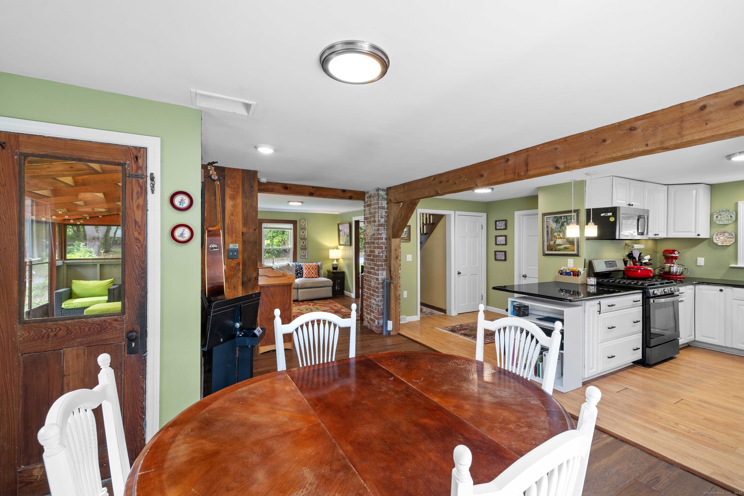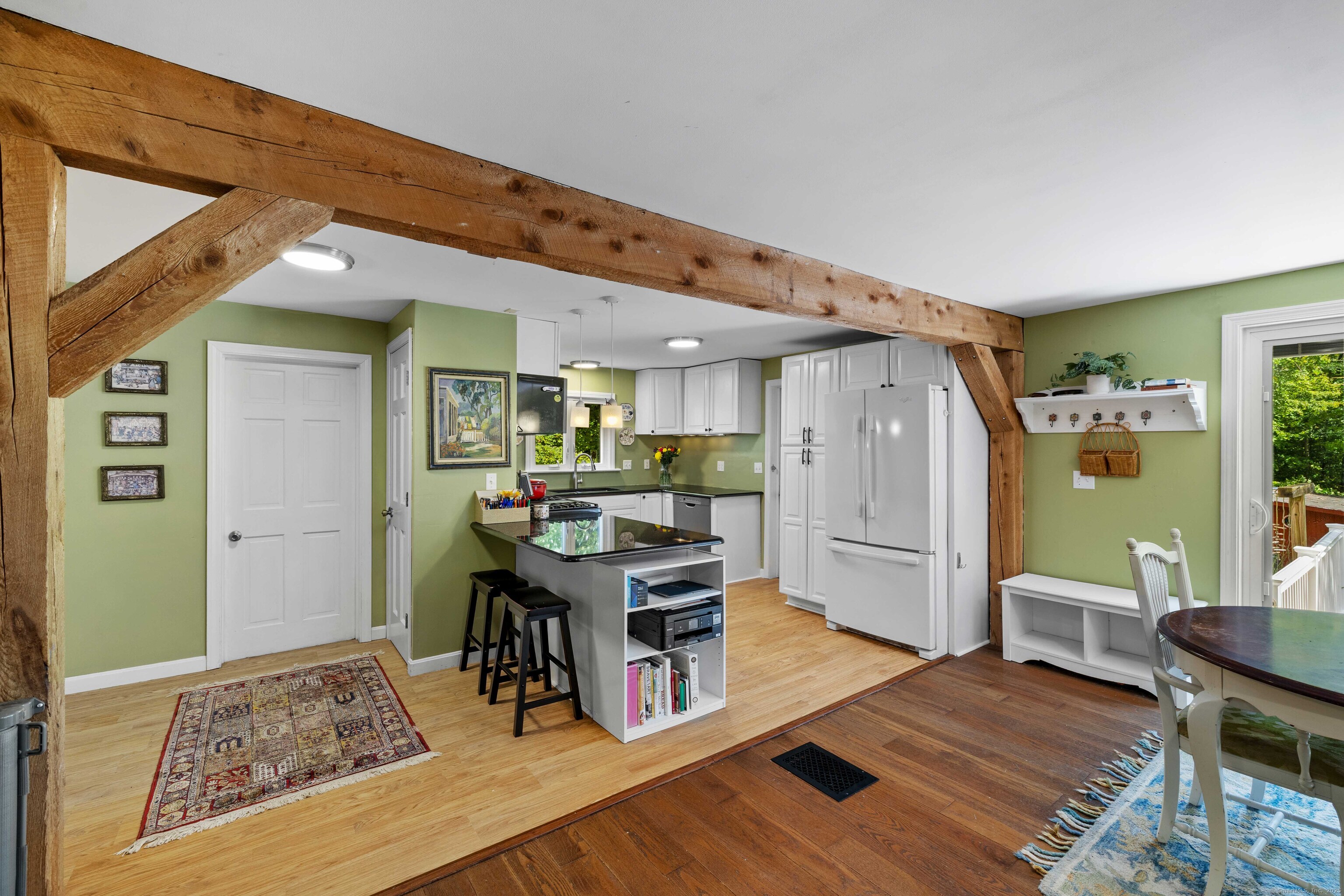 Charming 3-Bedroom Colonial in a Serene Wooded Setting Set on a private .75-acre lot, this inviting Colonial combines character and modern updates in a picturesque setting. The property features a detached barn perfect for a garage or workshop equipped with a woodstove, electricity plus a touch of history with a classic outhouse. Additional highlights include a storage shed, landscaped grounds with a tranquil water feature, and a spacious rear Trex deck perfect for gatherings conveniently located off the dining room . Inside, the open floor plan showcases hardwood floors, exposed beams, and a screened-in porch off the dining area for warm summer evenings. The remodeled kitchen offers maple cabinetry, a gas range, double sink, breakfast bar, pantry, and convenient first-floor laundry. The living and dining areas flow seamlessly, with sliders opening to the deck for effortless indoor-outdoor entertaining. Upstairs, you'll find three generously sized bedrooms, each with beautiful hardwood flooring. Recent updates include central air, 200-amp electrical service, a newer well and pump, and replaced windows and roof-ensuring peace of mind for years to come.