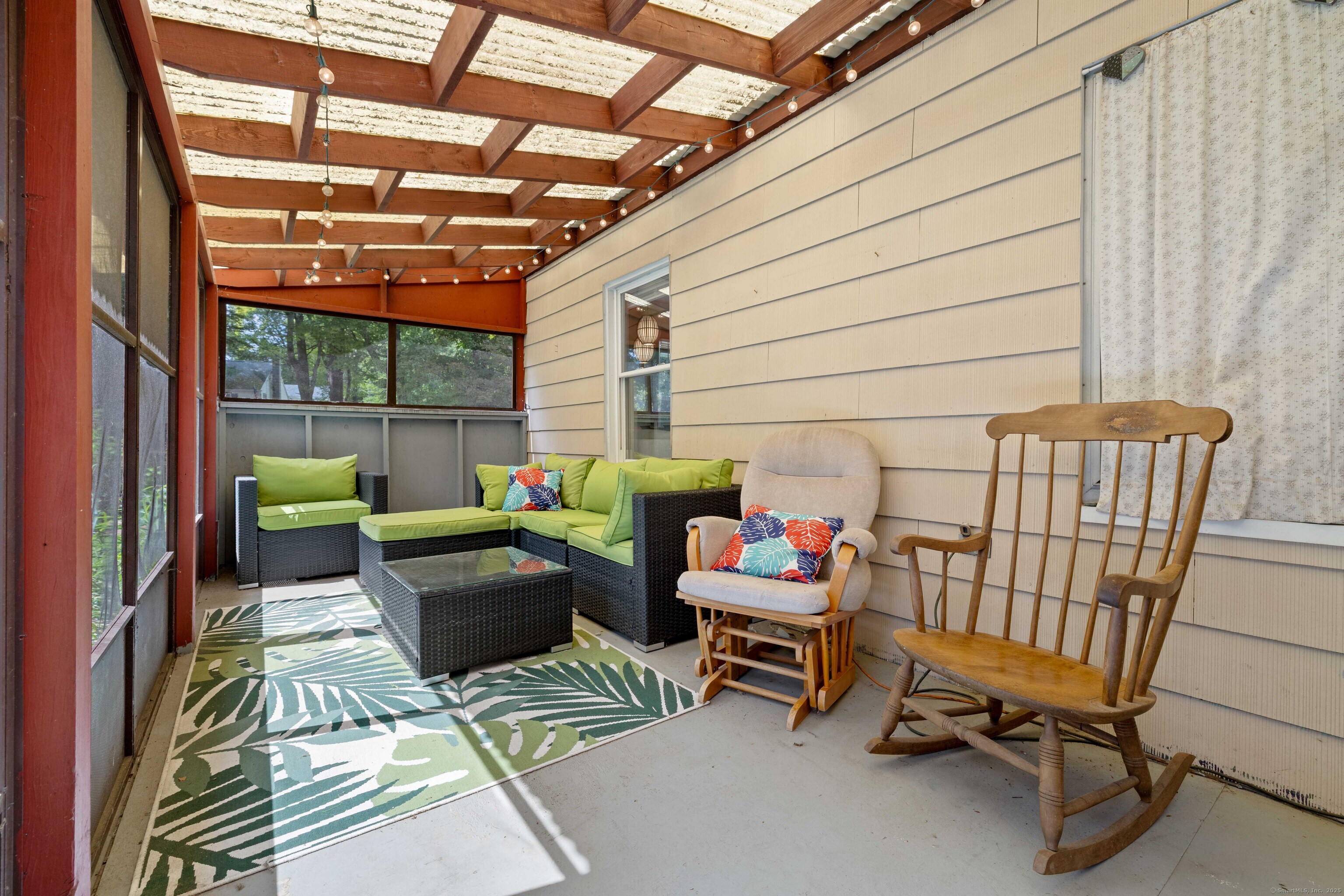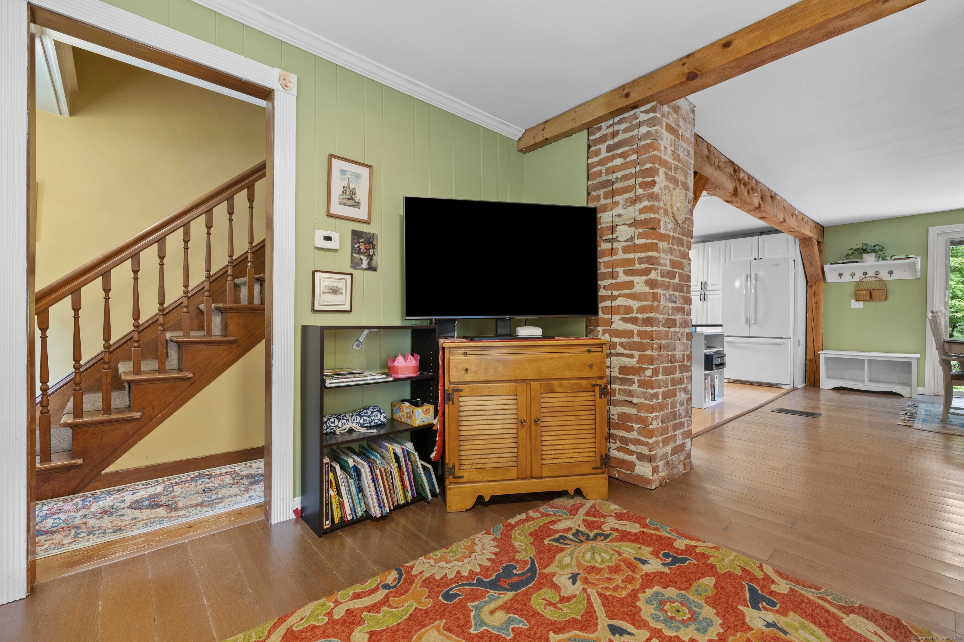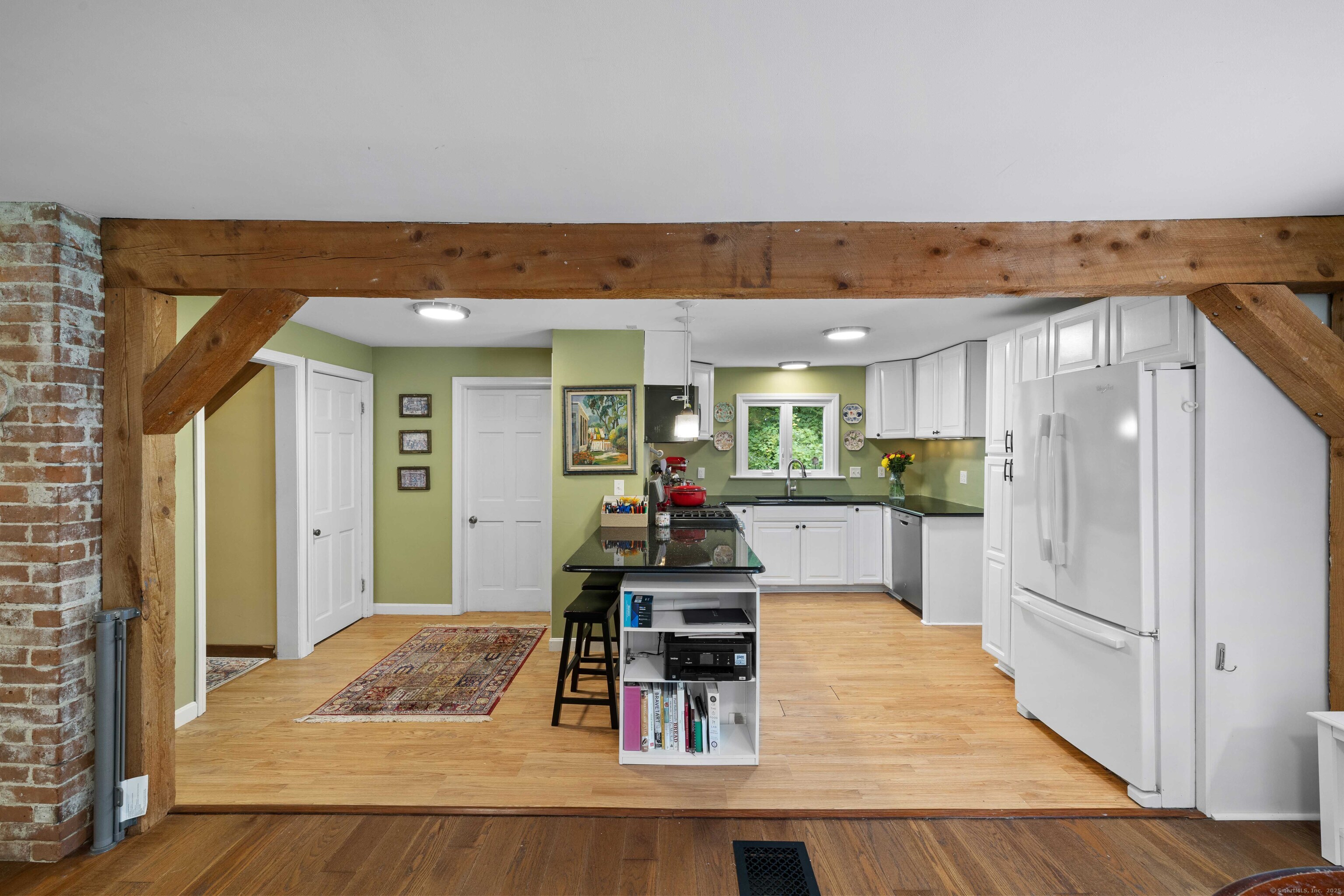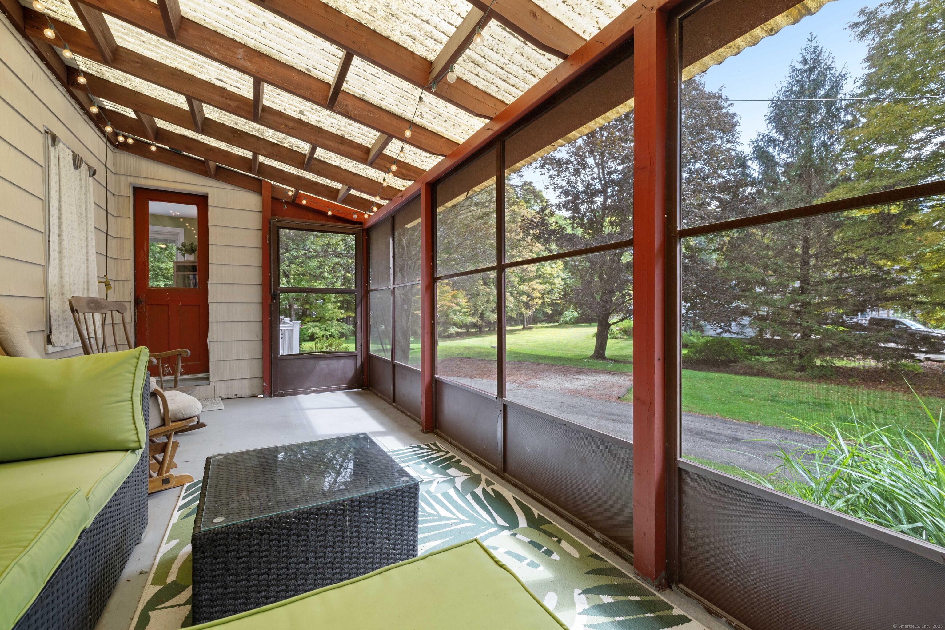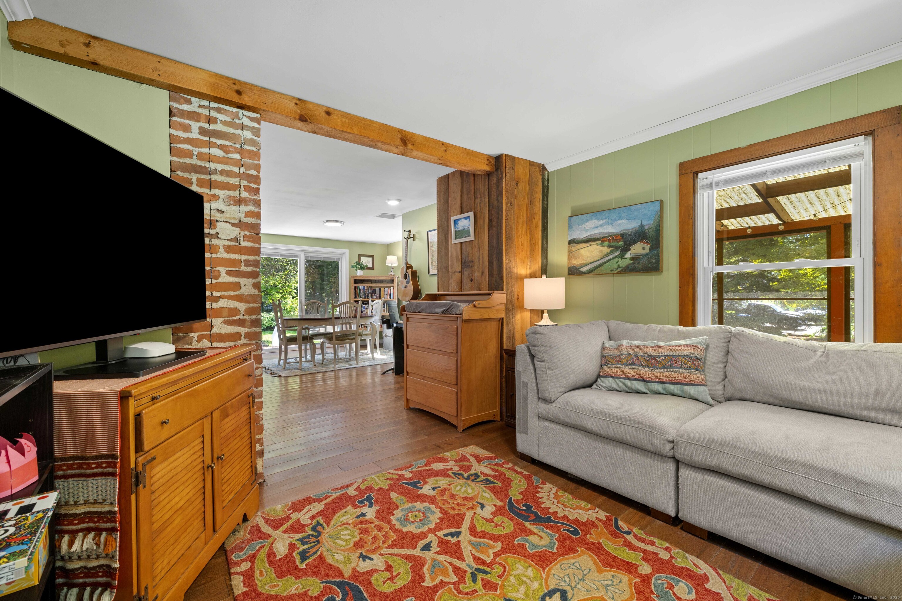 Charming 3-Bedroom Colonial in a Serene Wooded Setting Set on a private .75-acre lot, this inviting Colonial combines character and modern updates in a picturesque setting. The property features a detached barn perfect for a garage or workshop equipped with a woodstove, electricity plus a touch of history with a classic outhouse. Additional highlights include a storage shed, landscaped grounds with a tranquil water feature, and a spacious rear Trex deck perfect for gatherings conveniently located off the dining room . Inside, the open floor plan showcases hardwood floors, exposed beams, and a screened-in porch off the dining area for warm summer evenings. The remodeled kitchen offers maple cabinetry, a gas range, double sink, breakfast bar, pantry, and convenient first-floor laundry. The living and dining areas flow seamlessly, with sliders opening to the deck for effortless indoor-outdoor entertaining. Upstairs, you'll find three generously sized bedrooms, each with beautiful hardwood flooring. Recent updates include central air, 200-amp electrical service, a newer well and pump, and replaced windows and roof-ensuring peace of mind for years to come.