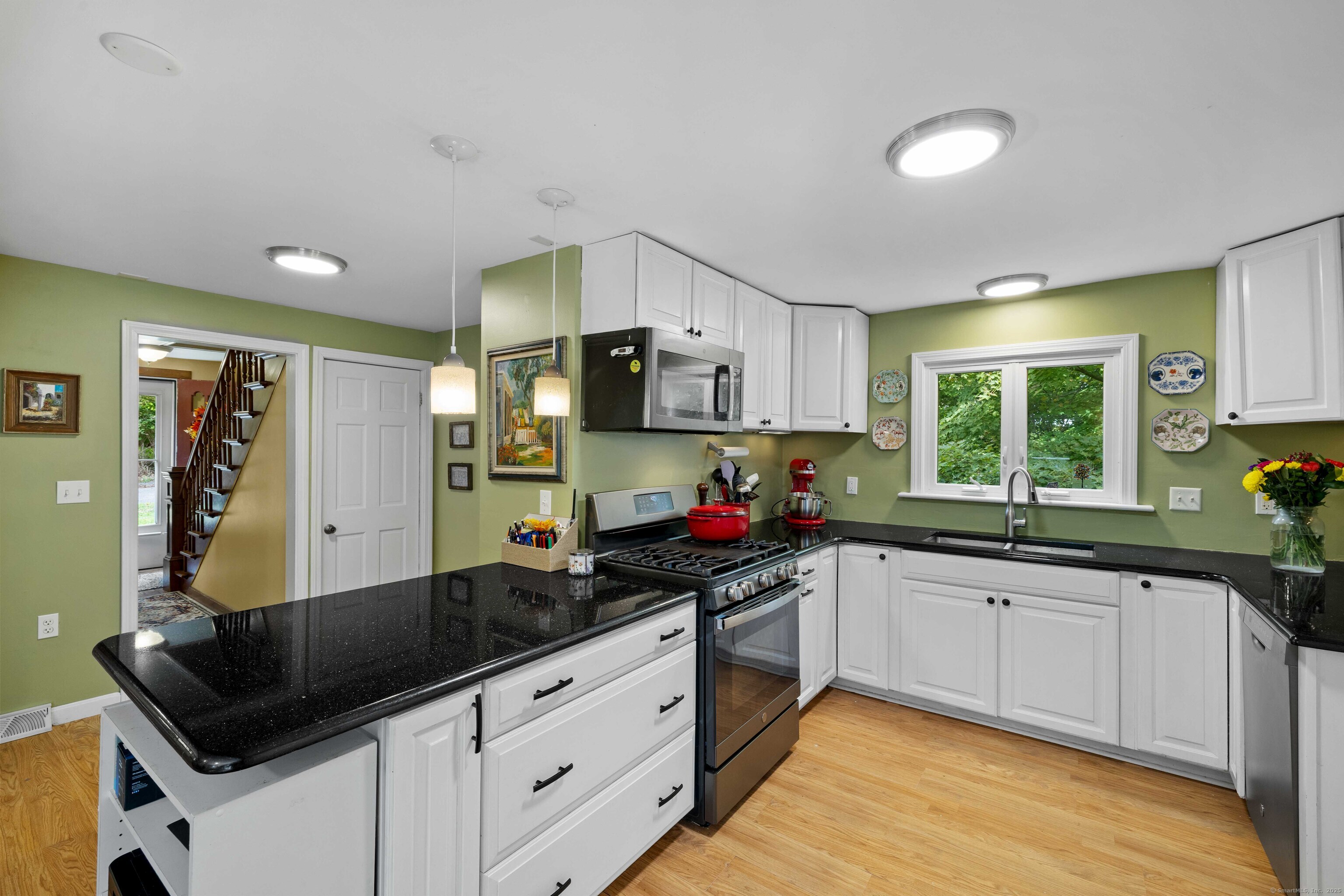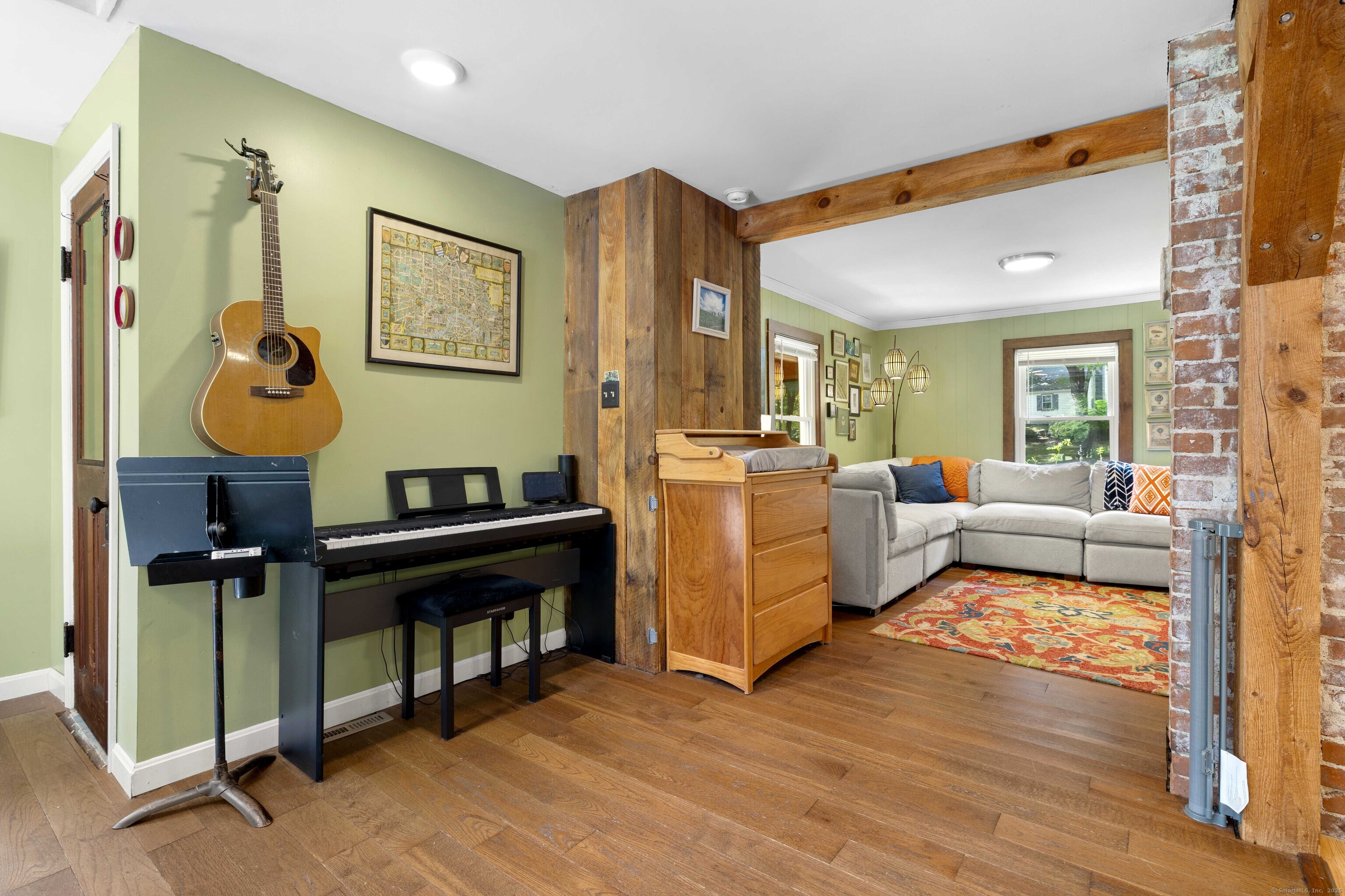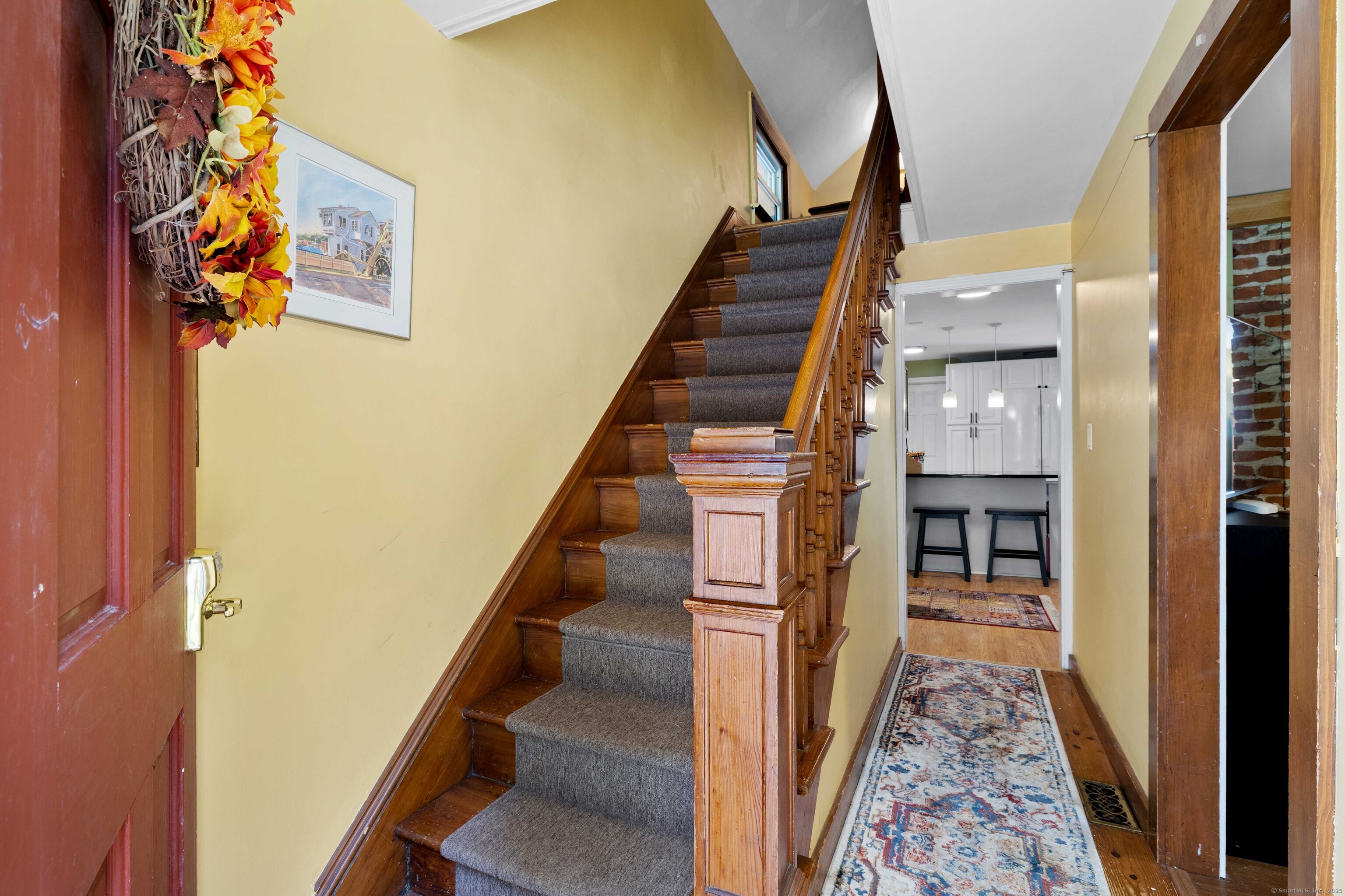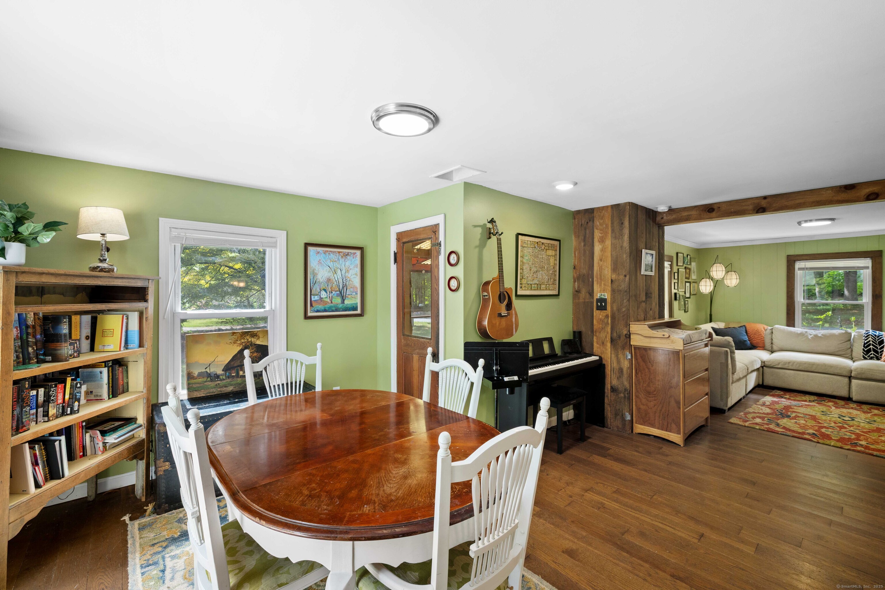 Charming 3-Bedroom Colonial in a Serene Wooded Setting Set on a private .75-acre lot, this inviting Colonial combines character and modern updates in a picturesque setting. The property features a detached barn perfect for a garage or workshop equipped with a woodstove, electricity plus a touch of history with a classic outhouse. Additional highlights include a storage shed, landscaped grounds with a tranquil water feature, and a spacious rear Trex deck perfect for gatherings conveniently located off the dining room . Inside, the open floor plan showcases hardwood floors, exposed beams, and a screened-in porch off the dining area for warm summer evenings. The remodeled kitchen offers maple cabinetry, a gas range, double sink, breakfast bar, pantry, and convenient first-floor laundry. The living and dining areas flow seamlessly, with sliders opening to the deck for effortless indoor-outdoor entertaining. Upstairs, you'll find three generously sized bedrooms, each with beautiful hardwood flooring. Recent updates include central air, 200-amp electrical service, a newer well and pump, and replaced windows and roof-ensuring peace of mind for years to come.