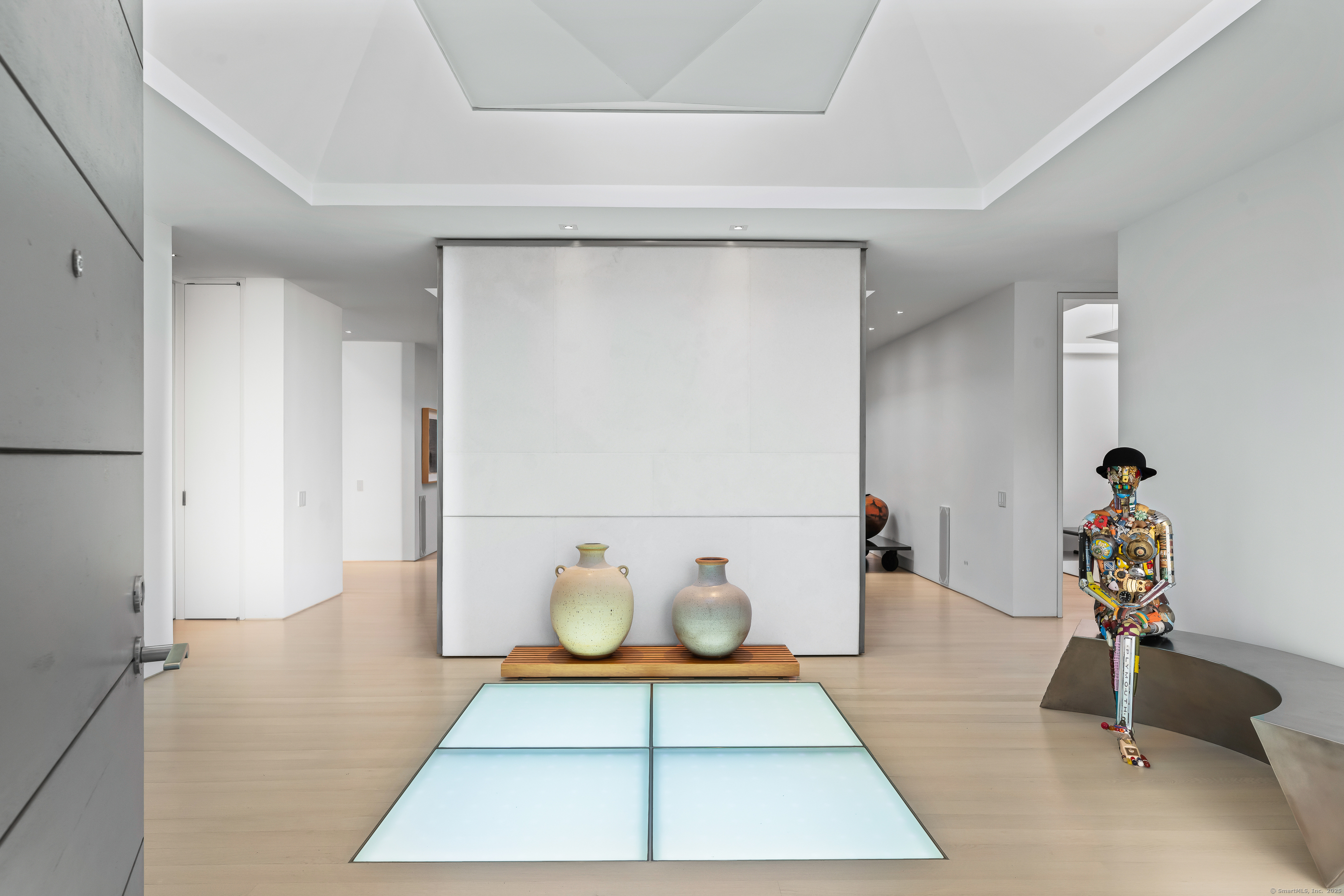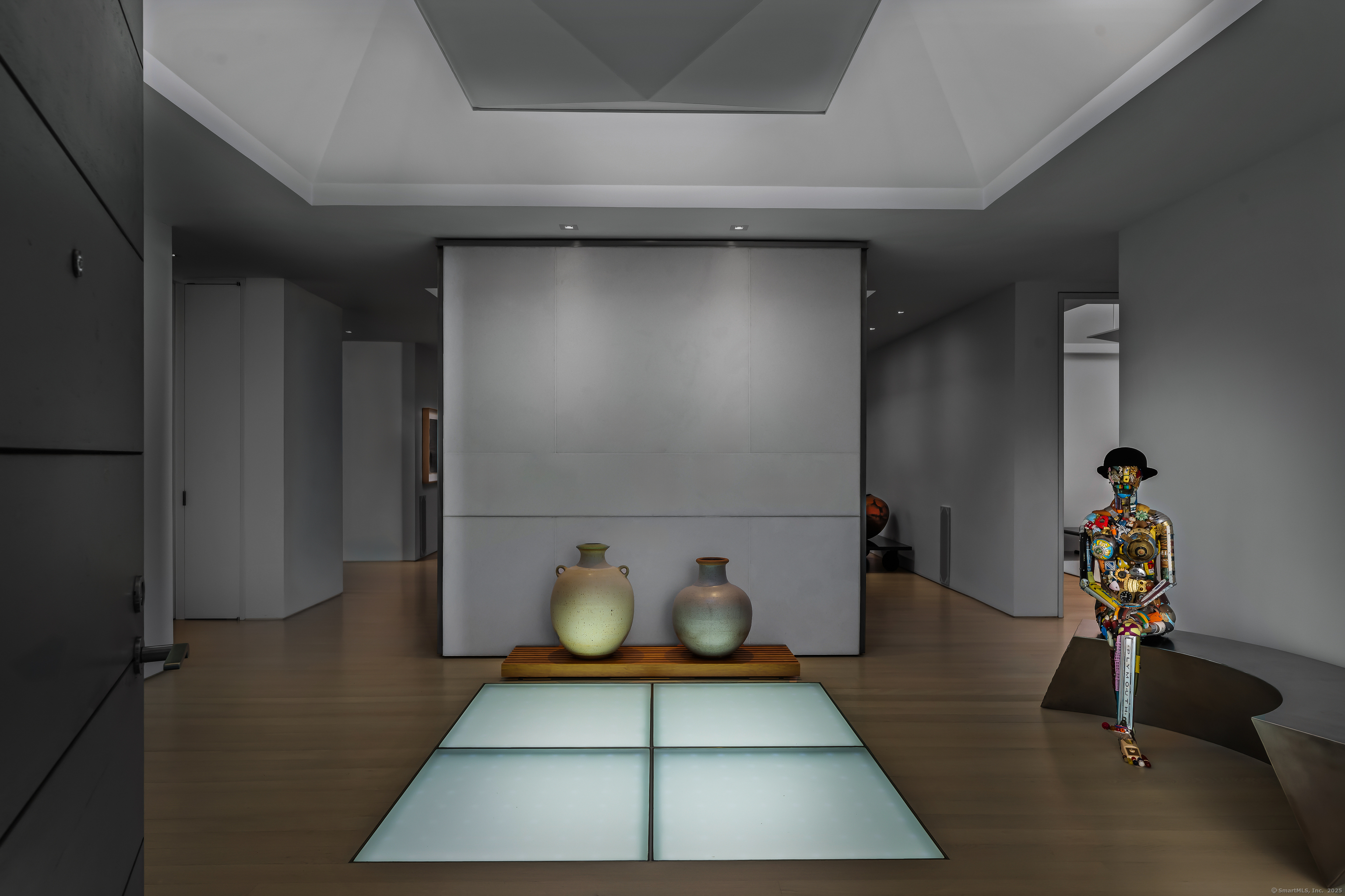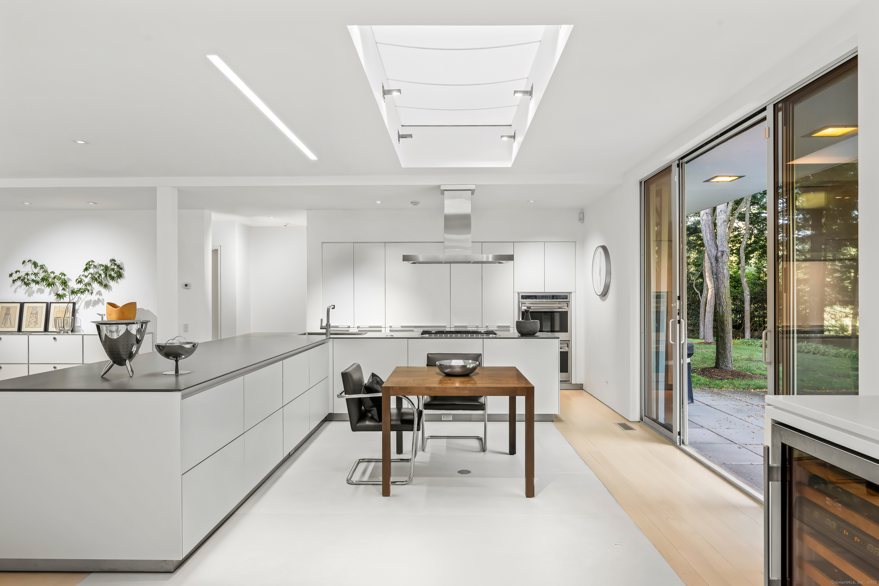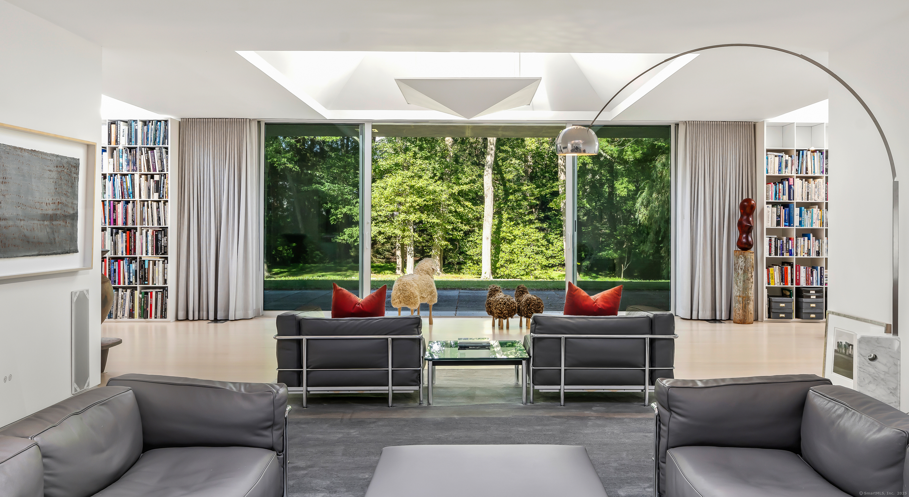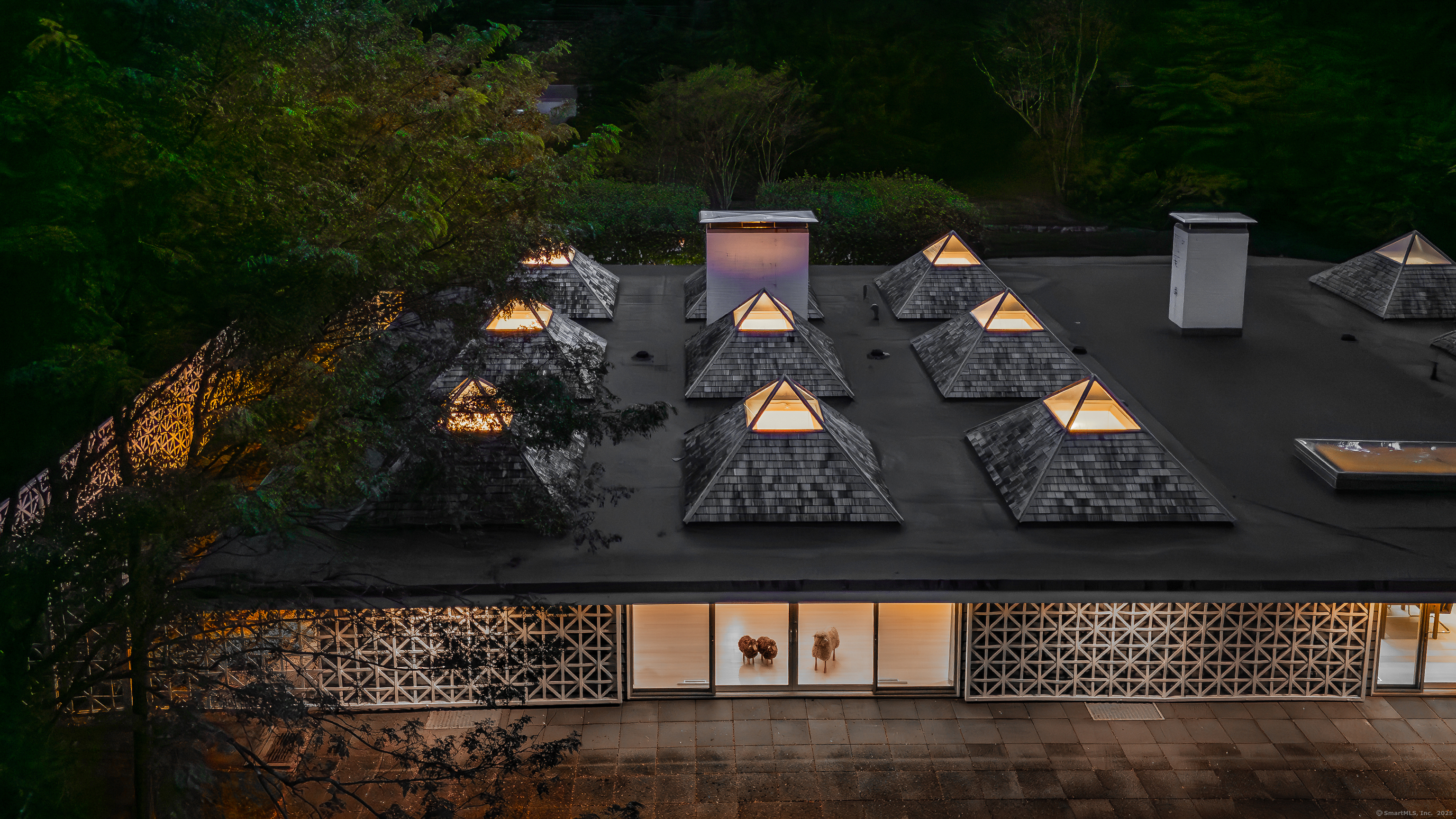 Experience Architectural History: The Celebrated Celanese House. This is your chance to own a true masterpiece. Designed in 1959 by visionary architect Edward Durell Stone, the Celanese House is one of New Canaan's most celebrated mid-century modern landmarks-an architectural treasure admired by design publications for decades. Stone's signature elements remain unmistakable: the striking lattice screen facade and distinctive glass roof pyramids create an iconic silhouette that endures. Inside, the home's recent renovation both preserves Stone's vision and introduces contemporary luxury. Floating sheet rock walls, satin-bleached oak floors, and walls of glass heighten the sense of openness, while state-of-the-art lighting transforms every space into an artful composition. The dramatic underlit glass entry floor offers a breathtaking welcome, setting the stage for the architectural splendor beyond. With 4 bedrooms, 4.5 baths, and 4,927 square feet of inspired interiors, the residence unfolds across 2.06 beautifully lush acres-a rare opportunity to experience historic architecture in harmony with modern living.