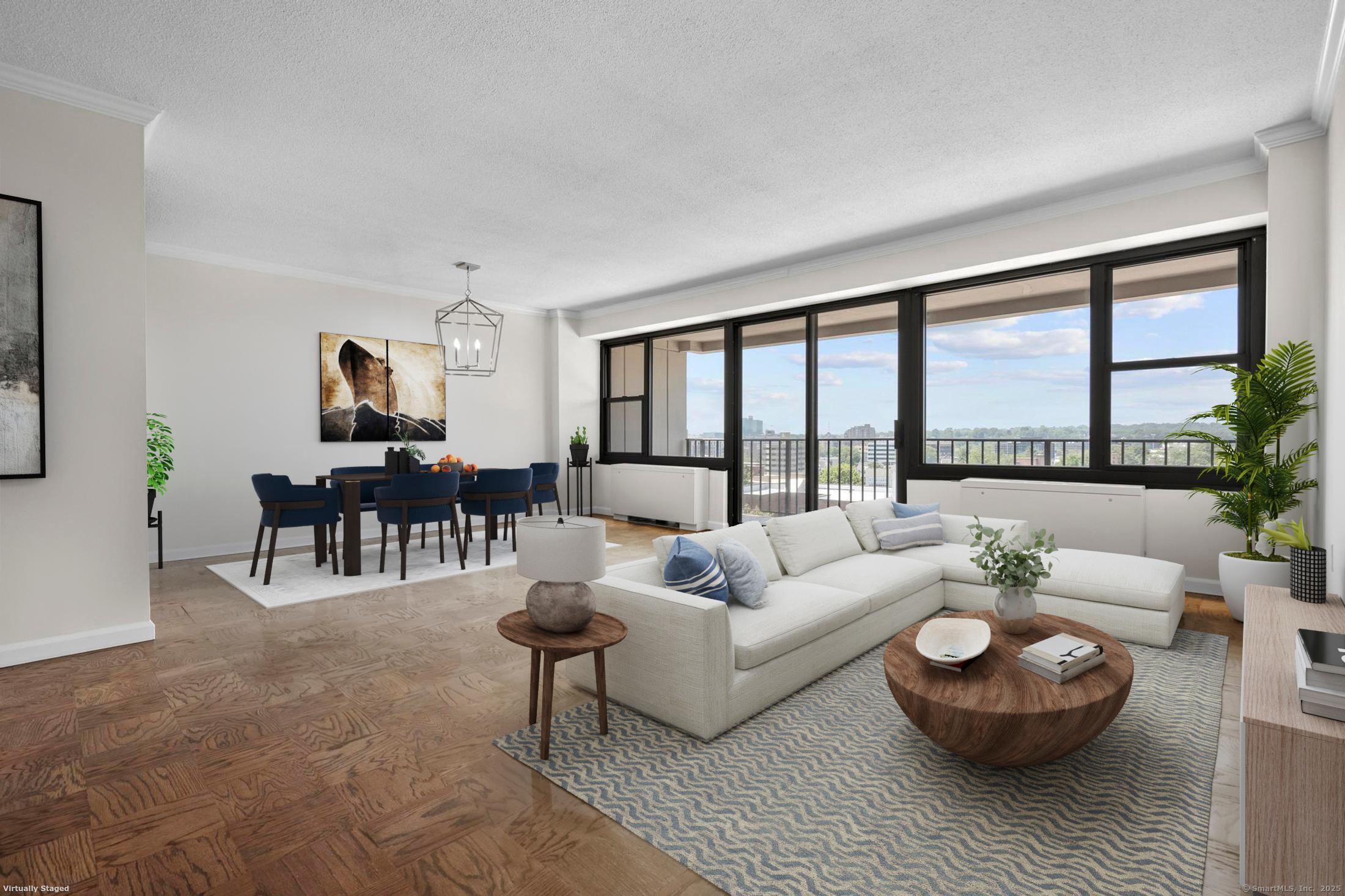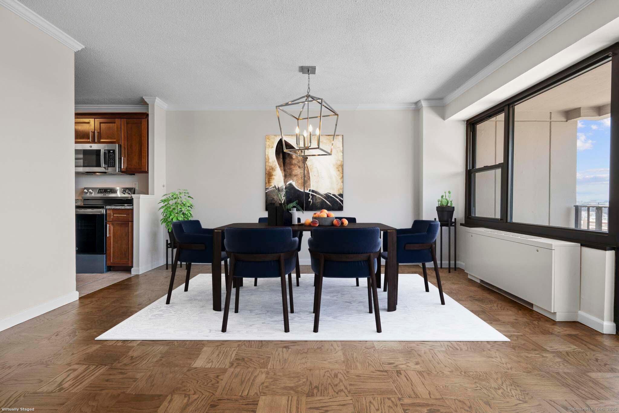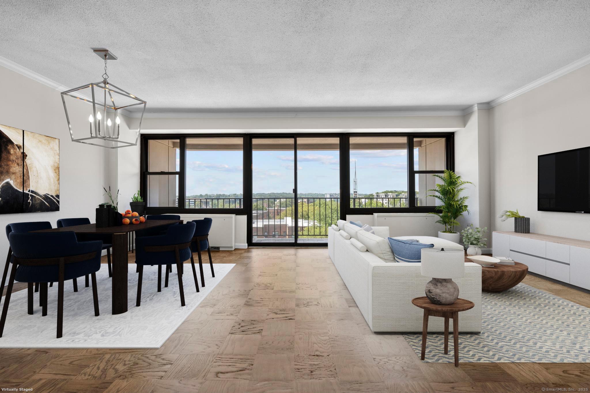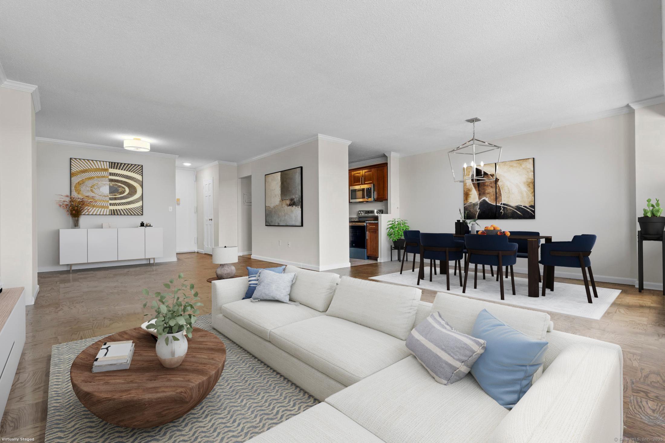 Step into sophisticated city living with this beautifully appointed 2BR 2BA residence in the desirable Hayes House, one of Stamford's most distinguished condo buildings. The home welcomes you with expansive open-concept living and dining areas, where oversized windows and sliders frame breathtaking western sunset views. A spacious private balcony extends your living space, offering the perfect setting for entertaining or unwinding. The remodeled kitchen is outfitted with brand new stainless steel appliances, granite countertops, and rich cabinetry, seamlessly blending style and function. Throughout the home, timelessly refinished parquet flooring, elegant crown molding, and abundant storage closets create a warm, refined atmosphere. The primary suite boasts a walk-in closet and ensuite bath, while the generous second bedroom provides flexibility for guests or a home office. Hayes House residents enjoy a newly redesigned marble lobby with concierge, a fitness center, community room, garage parking with abundant guest spaces, private storage, and 24-hour security. With heat, hot water, and cooling included in the HOA, residents enjoy both comfort and convenience in every season. Ideally situated in the heart of Stamford, this residence is just moments from dining, shopping, nightlife, and Metro North, with easy access to I-95 and the Merritt Parkway. A rare opportunity to pair elevated design with unmatched convenience.