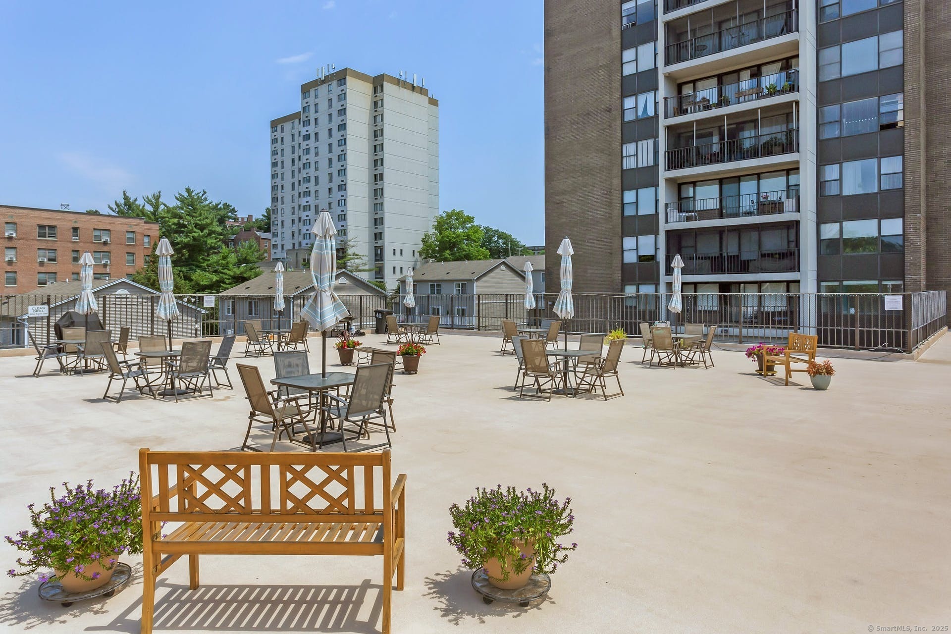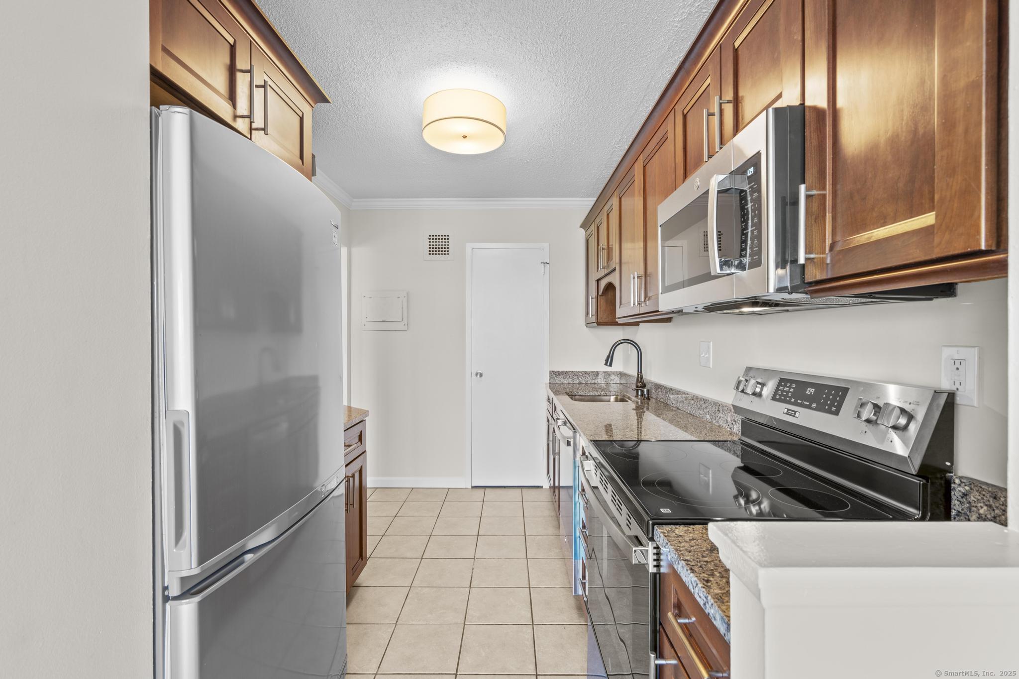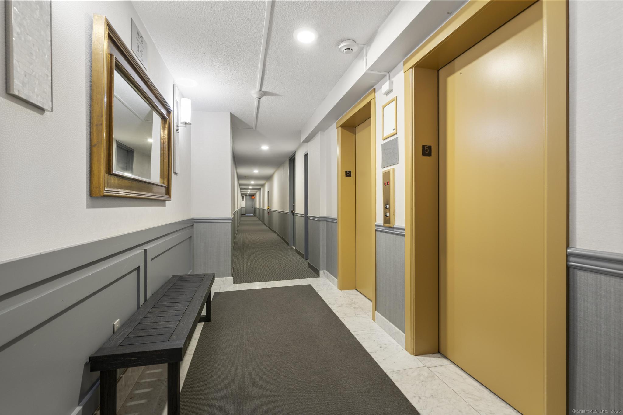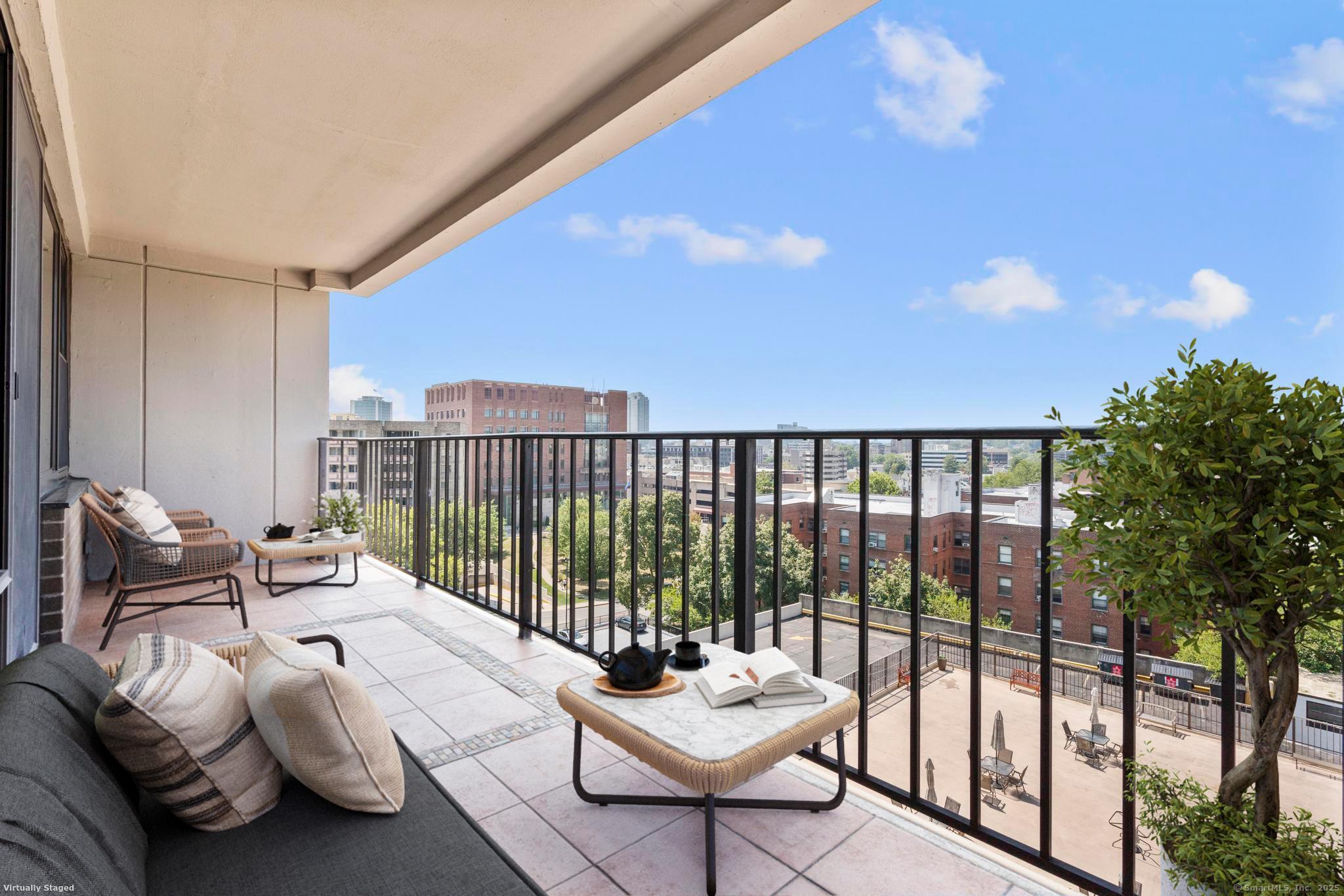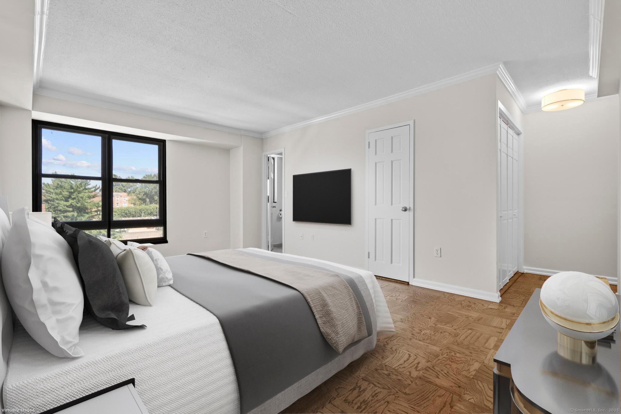 Step into sophisticated city living with this beautifully appointed 2BR 2BA residence in the desirable Hayes House, one of Stamford's most distinguished condo buildings. The home welcomes you with expansive open-concept living and dining areas, where oversized windows and sliders frame breathtaking western sunset views. A spacious private balcony extends your living space, offering the perfect setting for entertaining or unwinding. The remodeled kitchen is outfitted with brand new stainless steel appliances, granite countertops, and rich cabinetry, seamlessly blending style and function. Throughout the home, timelessly refinished parquet flooring, elegant crown molding, and abundant storage closets create a warm, refined atmosphere. The primary suite boasts a walk-in closet and ensuite bath, while the generous second bedroom provides flexibility for guests or a home office. Hayes House residents enjoy a newly redesigned marble lobby with concierge, a fitness center, community room, garage parking with abundant guest spaces, private storage, and 24-hour security. With heat, hot water, and cooling included in the HOA, residents enjoy both comfort and convenience in every season. Ideally situated in the heart of Stamford, this residence is just moments from dining, shopping, nightlife, and Metro North, with easy access to I-95 and the Merritt Parkway. A rare opportunity to pair elevated design with unmatched convenience.
