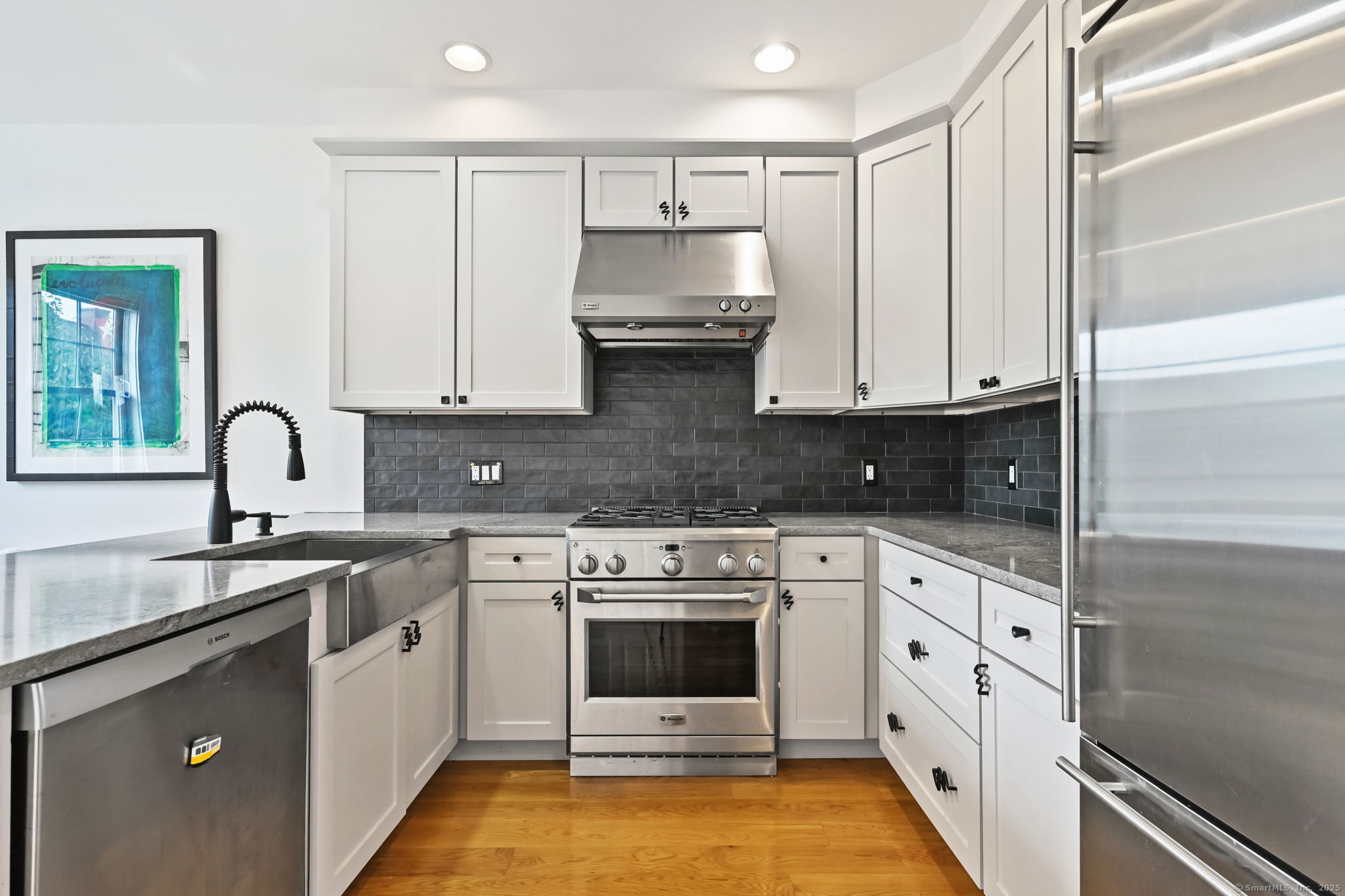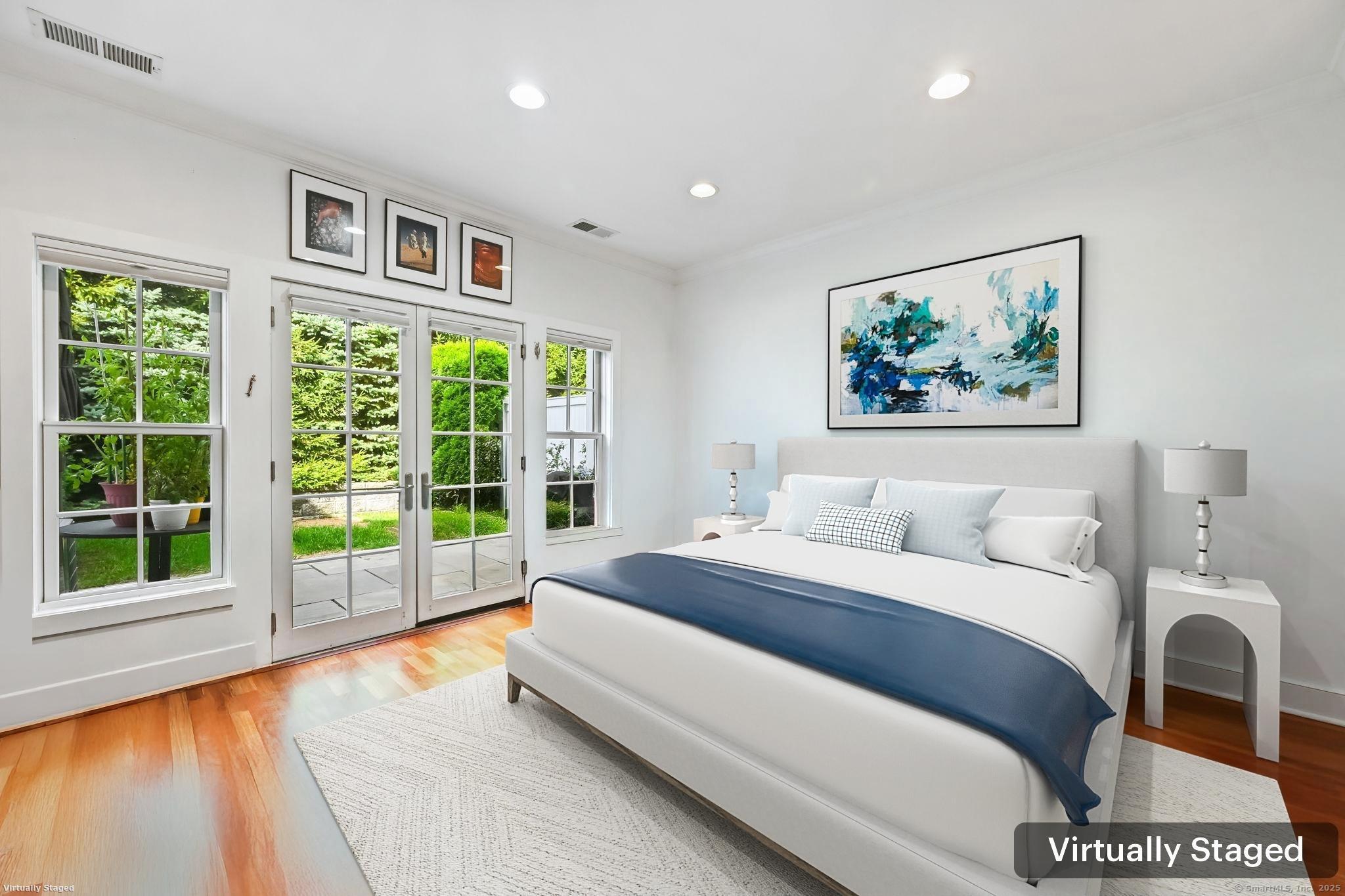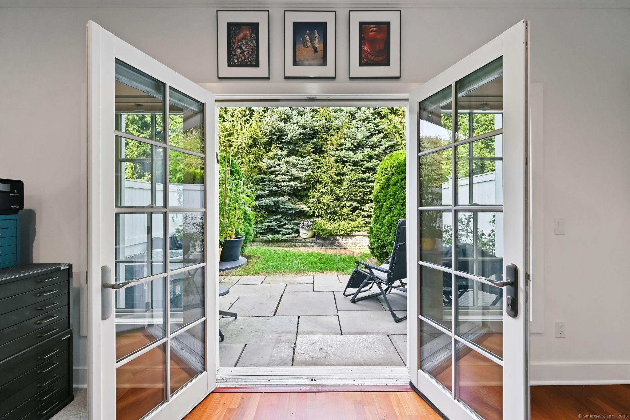 Palmer Hill Townhouse! in this luxury gated community located on the Old Greenwich/Stamford border. Fantastic, light and bright, 3 bedroom/2.5 bath townhouse model, rarely on market! 1 car attached garage + 1 deeded parking space in the midrise garage. Many home updates and remodeling. Flexible floor plan. Features include all wood floors, customized cabinetry in the eat in kitchen, SS appliances, 2 pantries, open plan living/dining room with a gas fireplace, tray ceiling, custom lighting throughout, French doors to a Juliet balcony in the living/dining room, and French doors to a private patio on the 1st level. There is a powder room with a heated floor on the main level. Upper level has 2 bedrooms, new wood floors, custom closets and a newly remodeled full bath. The 1st level has the 3rd en-suite bedroom with full bath, custom closets, and French doors to your Private Patio. This room has the flexibility to be a home office ( as in photos)/den/playroom. Amenities include a clubhouse, pool, hot tub, fire pit, gym with yoga room above, and business center. Dog Friendly! Minutes to Metro North and I-95. DON'T MISS THIS FABULOUS TOWNHOUSE! Great Price, Great Home! Great Opportunity!