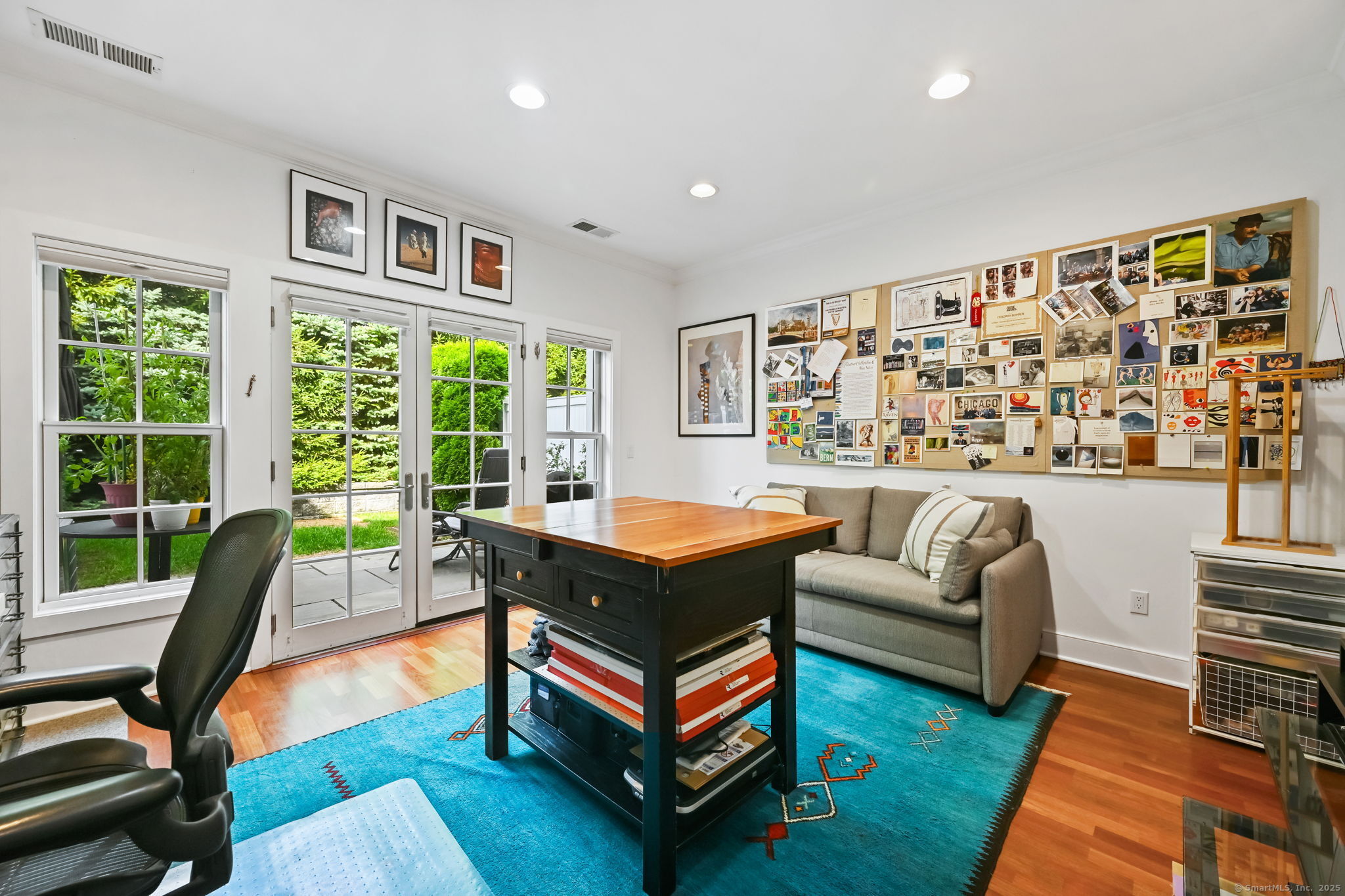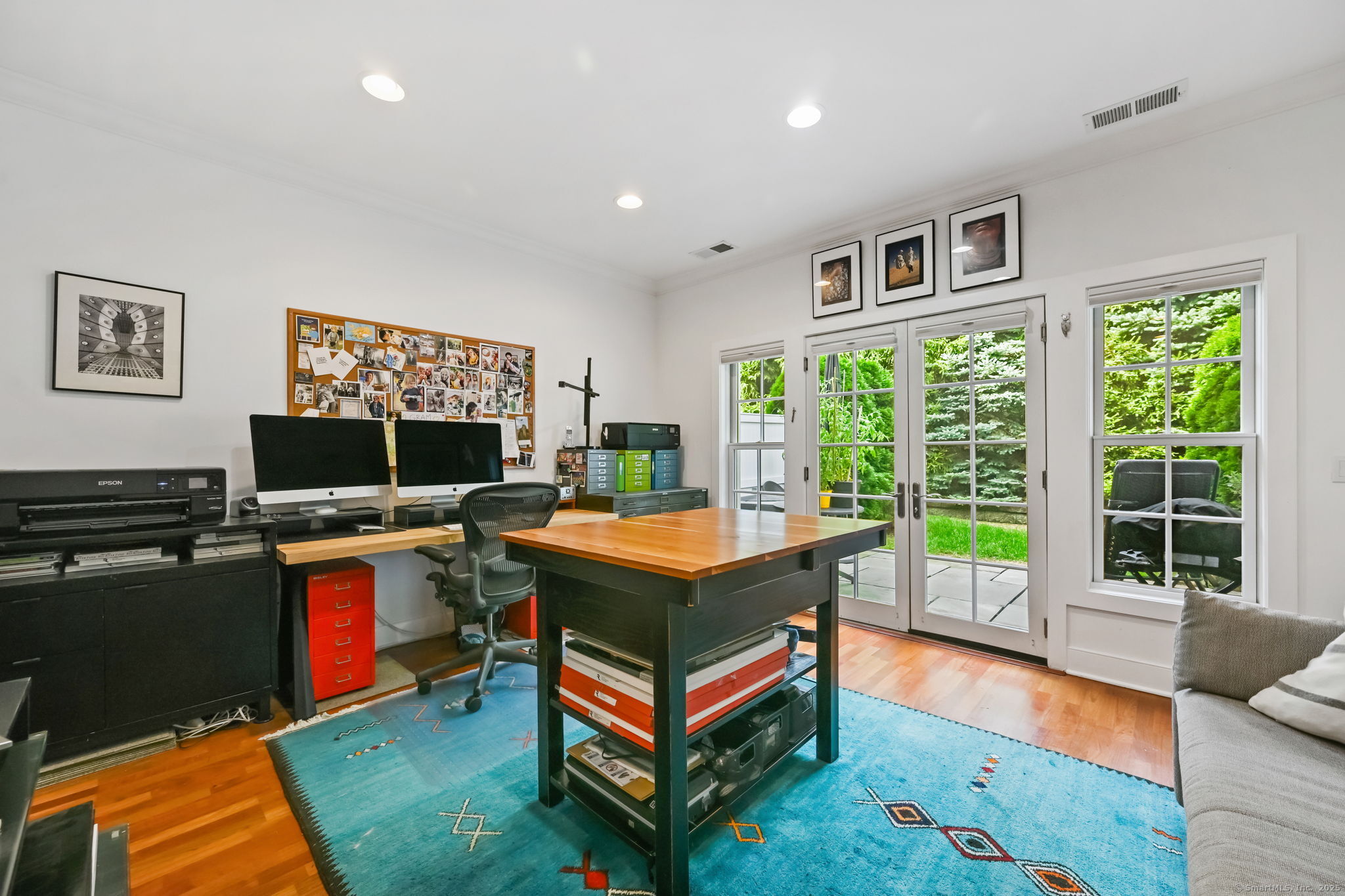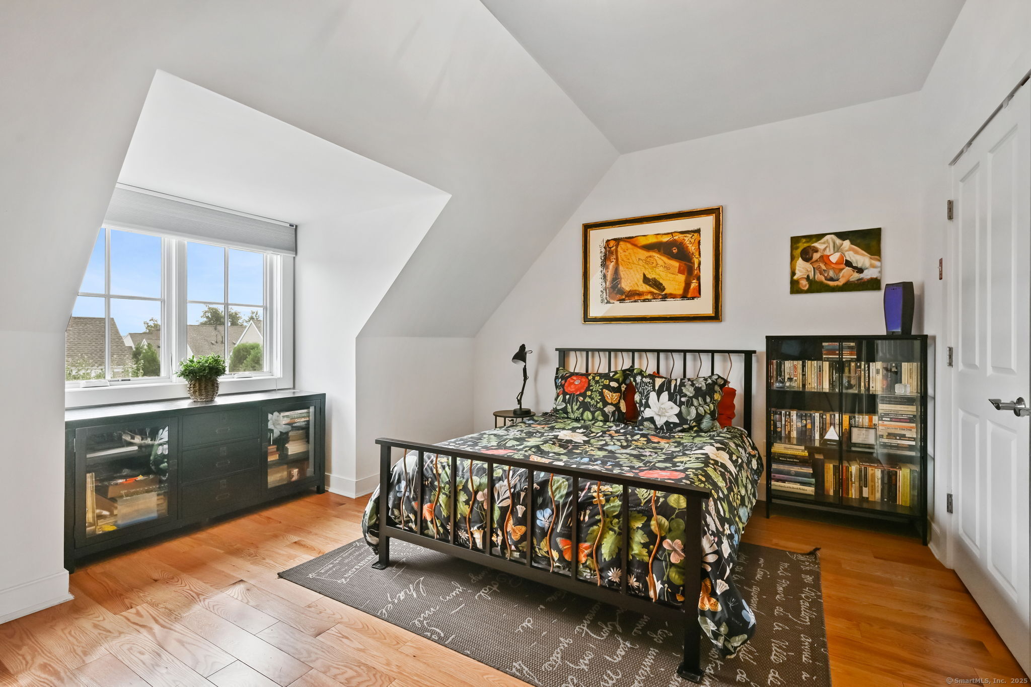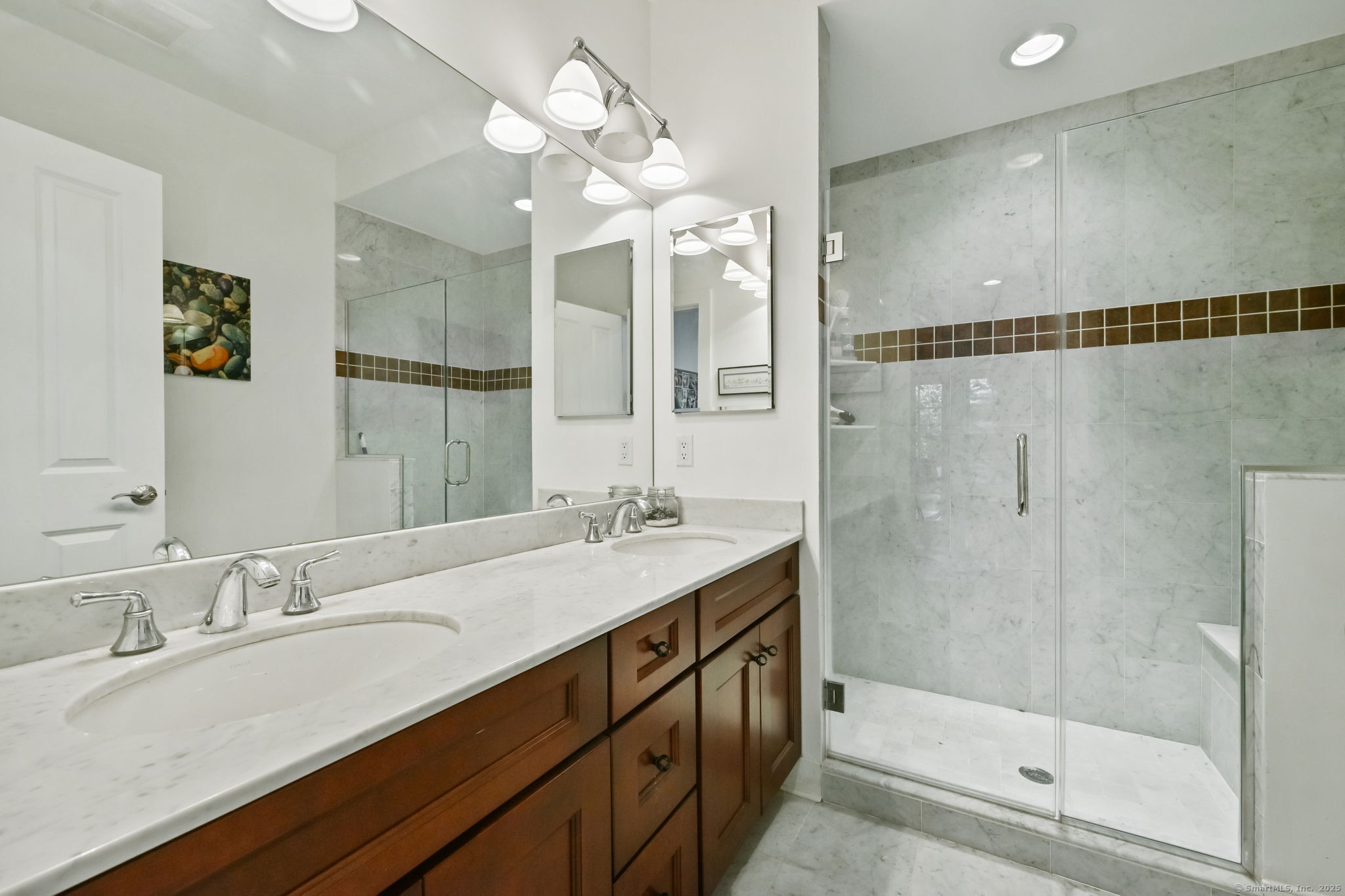 Palmer Hill Townhouse! in this luxury gated community located on the Old Greenwich/Stamford border. Fantastic, light and bright, 3 bedroom/2.5 bath townhouse model, rarely on market! 1 car attached garage + 1 deeded parking space in the midrise garage. Many home updates and remodeling. Flexible floor plan. Features include all wood floors, customized cabinetry in the eat in kitchen, SS appliances, 2 pantries, open plan living/dining room with a gas fireplace, tray ceiling, custom lighting throughout, French doors to a Juliet balcony in the living/dining room, and French doors to a private patio on the 1st level. There is a powder room with a heated floor on the main level. Upper level has 2 bedrooms, new wood floors, custom closets and a newly remodeled full bath. The 1st level has the 3rd en-suite bedroom with full bath, custom closets, and French doors to your Private Patio. This room has the flexibility to be a home office ( as in photos)/den/playroom. Amenities include a clubhouse, pool, hot tub, fire pit, gym with yoga room above, and business center. Dog Friendly! Minutes to Metro North and I-95. DON'T MISS THIS FABULOUS TOWNHOUSE! Great Price, Great Home! Great Opportunity!