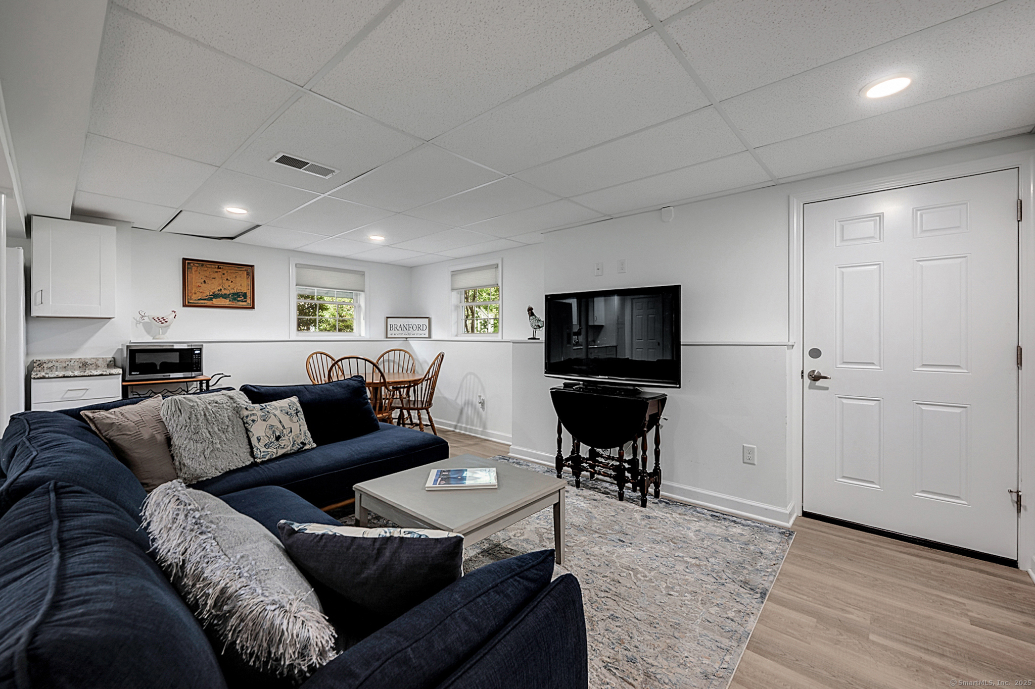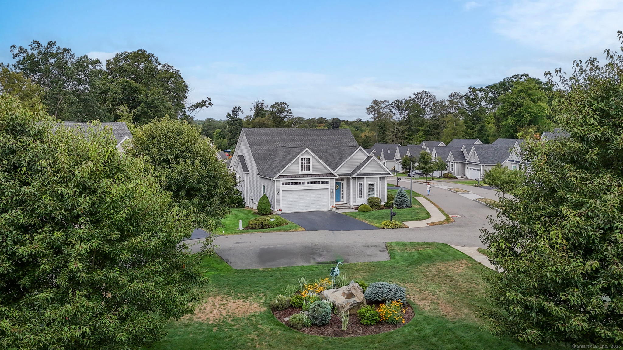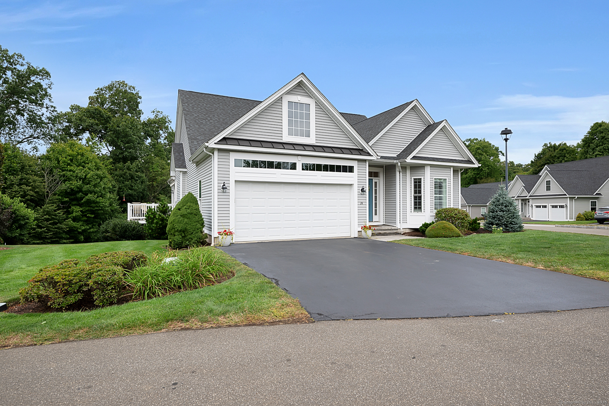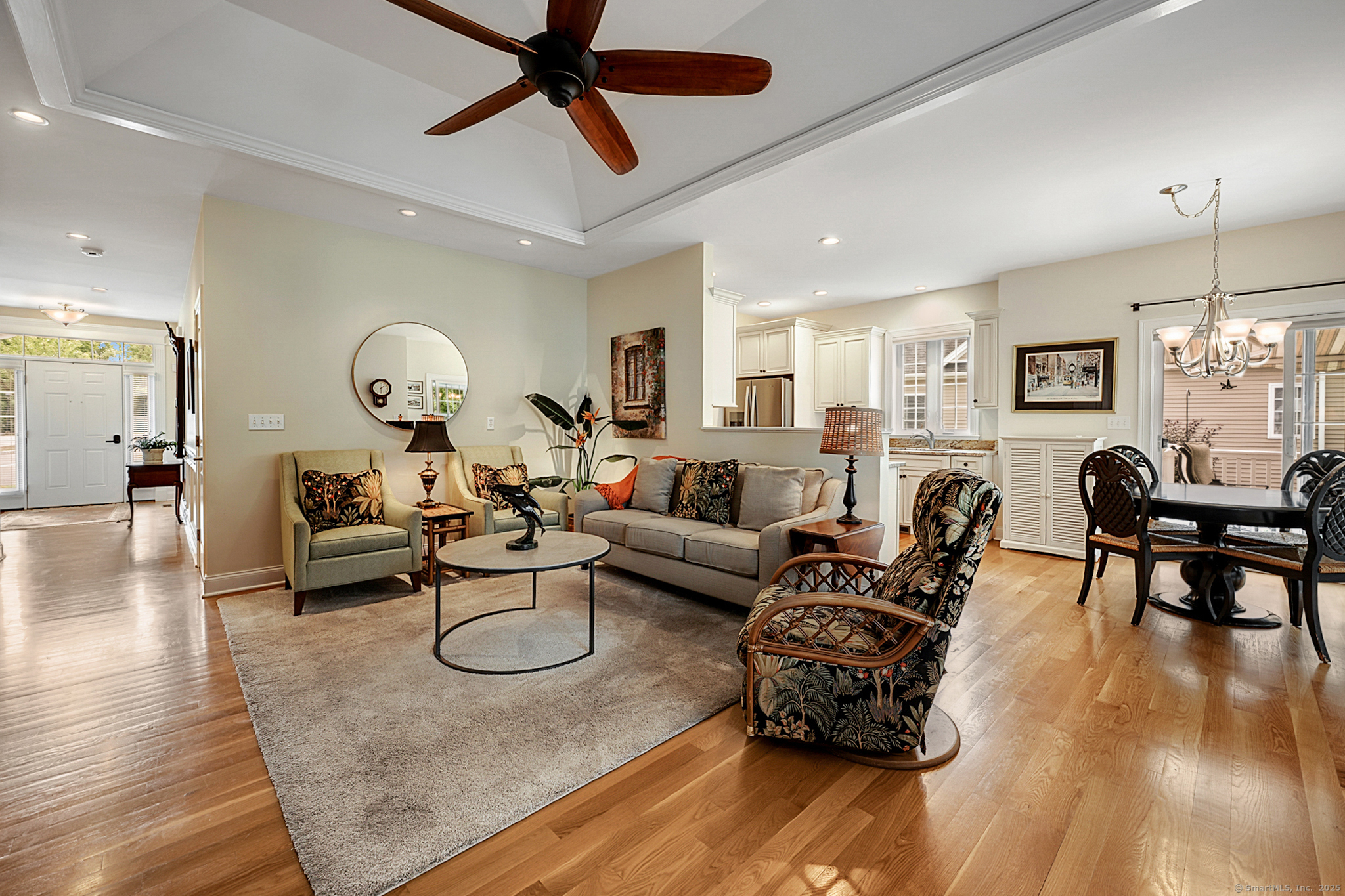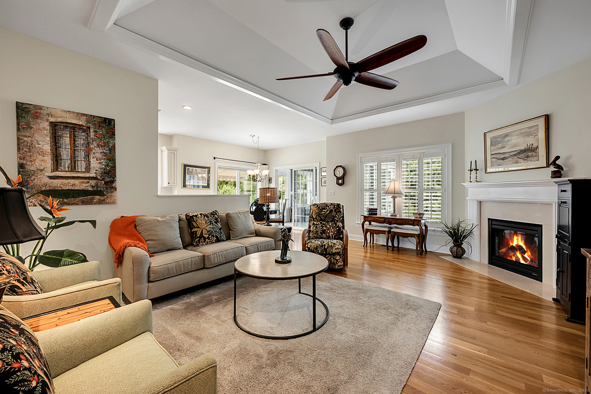 Welcome to River Walk, Branford's only 55+ community! This Contemporary Ranch model home offers the perfect blend of comfort, style and convenience in a highly desirable location. From the moment you step inside, you'll appreciate the open layout, gleaming hardwood floors and detailed millwork throughout the main level. An inviting foyer leads to a private study/office featuring a French door and oversized bay window that fills the space with natural light. The spacious living room boasts a tray ceiling and gas fireplace, flowing seamlessly into the kitchen and dining area. The kitchen is appointed with granite counters and stainless-steel appliances, while the dining area opens to a private deck with a retractable awning-ideal for outdoor entertaining. A vaulted, light-filled sunroom offers a warm and welcoming retreat-a perfect spot for your morning coffee. The main level includes two bedrooms, two full baths including a primary suite with tray ceiling, custom walk-in closet, walk-in shower and double vanity. The finished lower level provides great space for guests, featuring a family room, kitchenette, private office with French door, walk-in closet, full bath and ample storage in the unfinished area. Additional highlights include convenient main-level laundry, a two-car attached garage with fresh epoxy floor, level front entry and ample guest parking. Thoughtfully designed and meticulously maintained, this home is ideal for easy living - minutes to town and the shoreline!