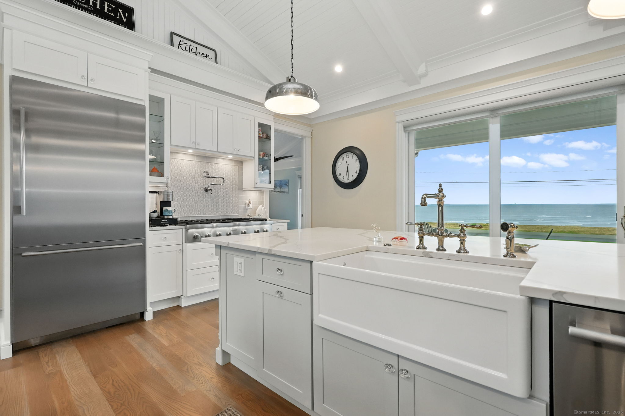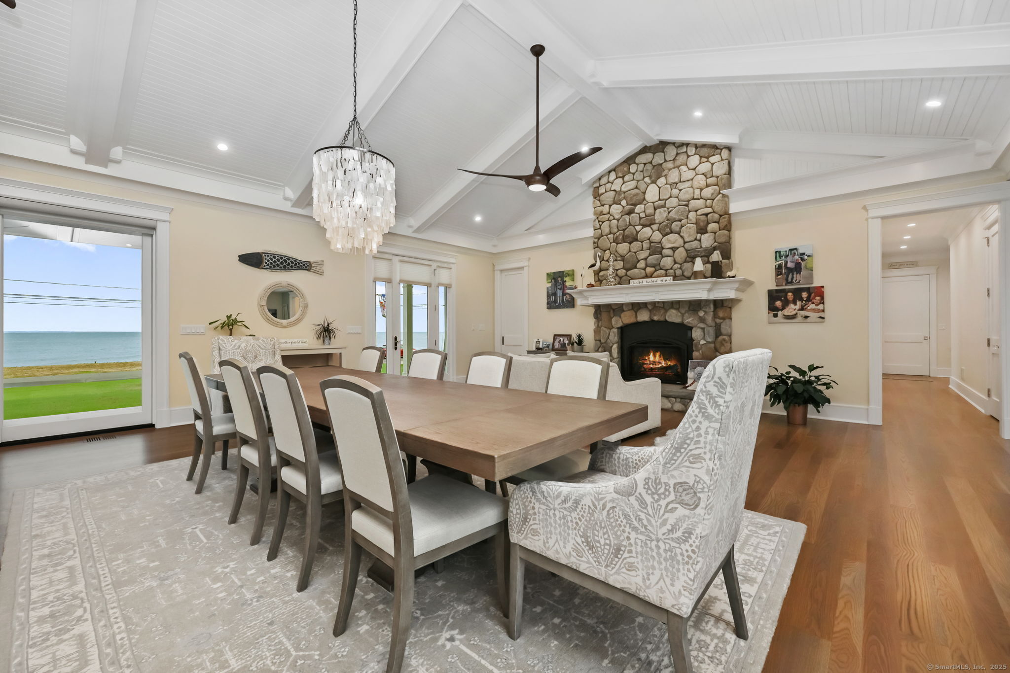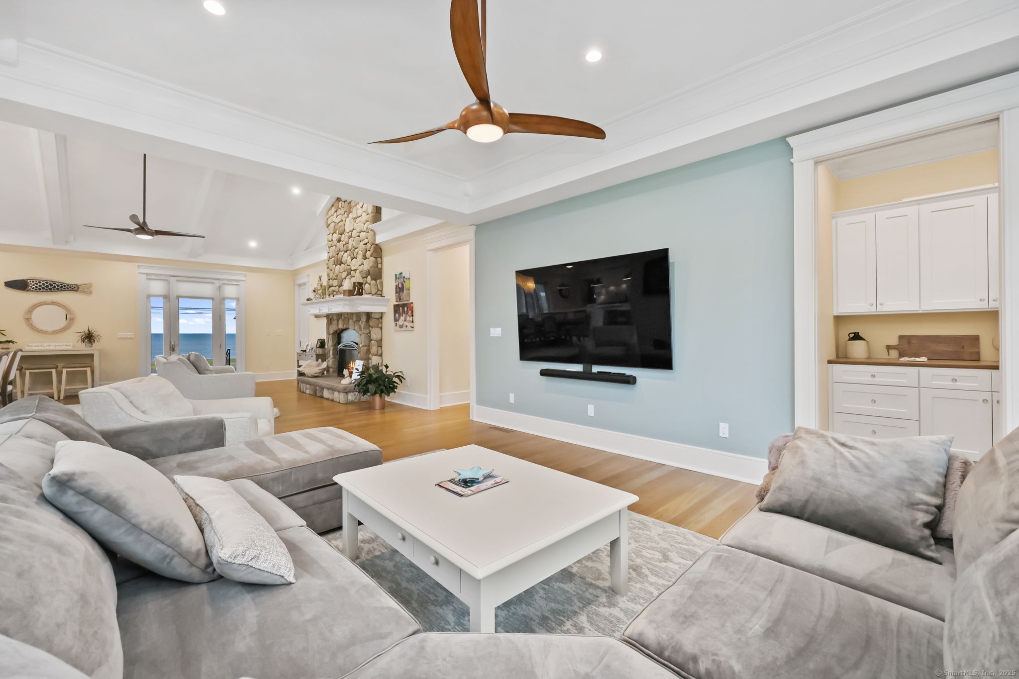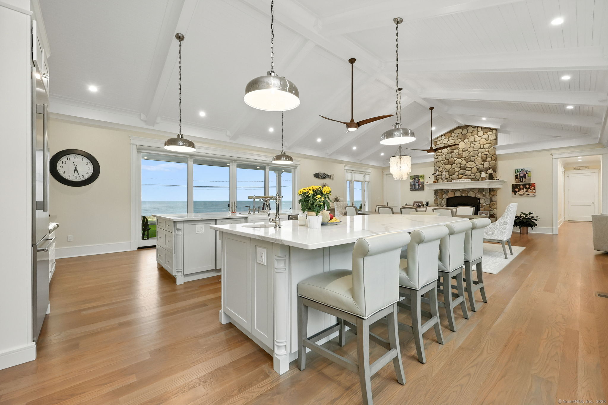 Coastal living meets everyday luxury in this waterfront gem in Lordship - welcome home! This custom-built waterfront home offers finely crafted living spaces, including a 3,700+ sq. ft. ranch-style main level, a framed walk-out lower level, and a private 2,000 sq. ft. multi-purpose area, which is framed out and drywalled to serve as 1,000 sq. ft. of living space and 1,000 sq. ft. of storage space. The waterfront views of this property are breathtaking! Designed with vaulted ceilings, White Oak floors, Marvin windows, and expansive glass panels, this home embraces its coastal setting on Lordship's shoreline. Highlights include a chef's Thermador kitchen (complete with a double wall oven and warming drawer, a speed oven with microwave, dishwasher, built-in refrigerator, and 6-burner range with a griddle and pot filler), dual islands, a vaulted great room with a stone fireplace, two luxurious primary suites, spa-inspired baths with heated floors, and expansive, architecturally inspired outdoor living areas. Enjoy a cozy fire on the patio or an outdoor shower after a day at the beach! Ring cameras, alarm system, generator, and a heated/AC 3-bay garage with EV outlet complete this exceptional opportunity for multi-generational waterfront living. Showings start September 2-don't miss your chance to tour this luxurious property!