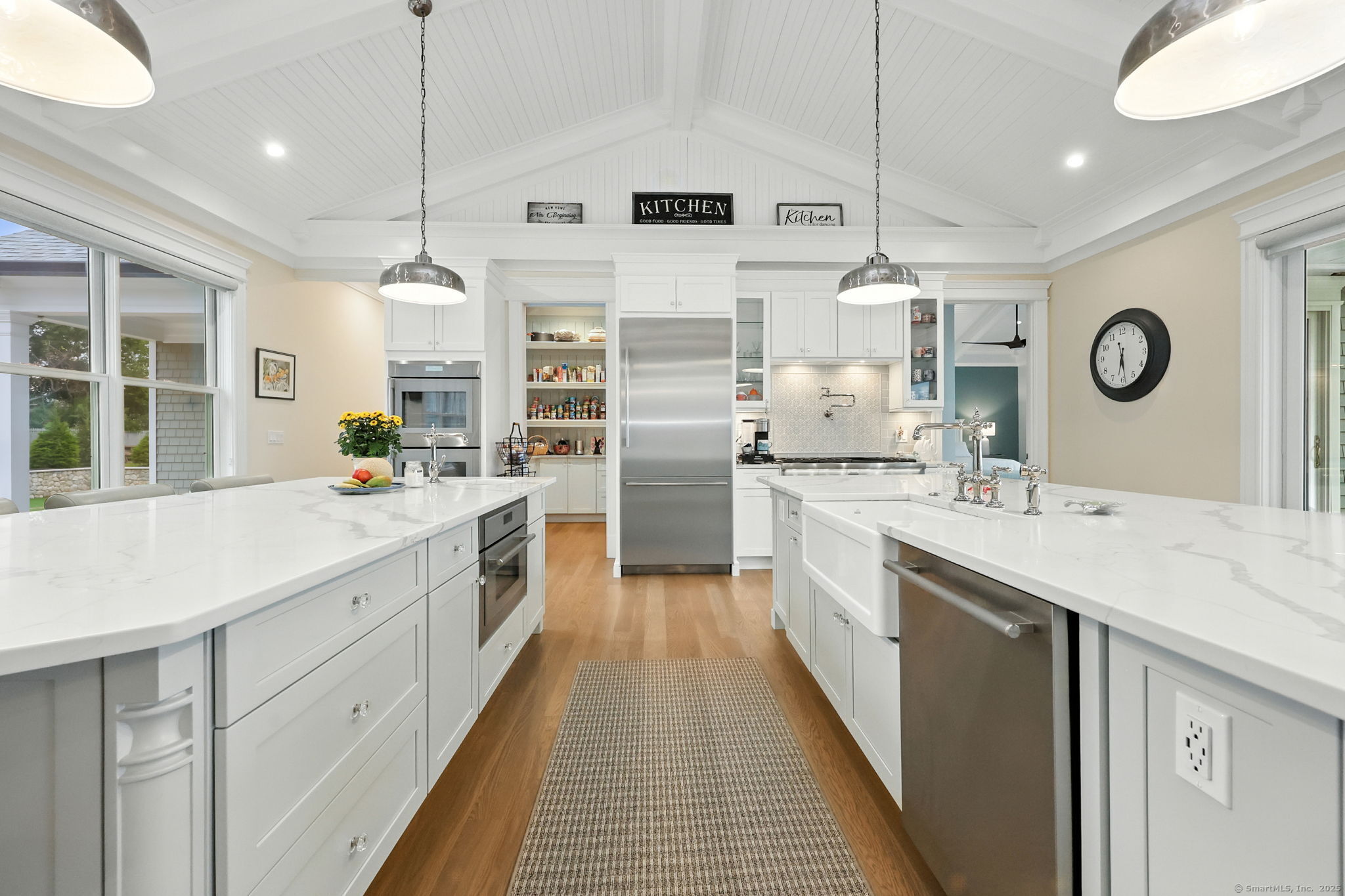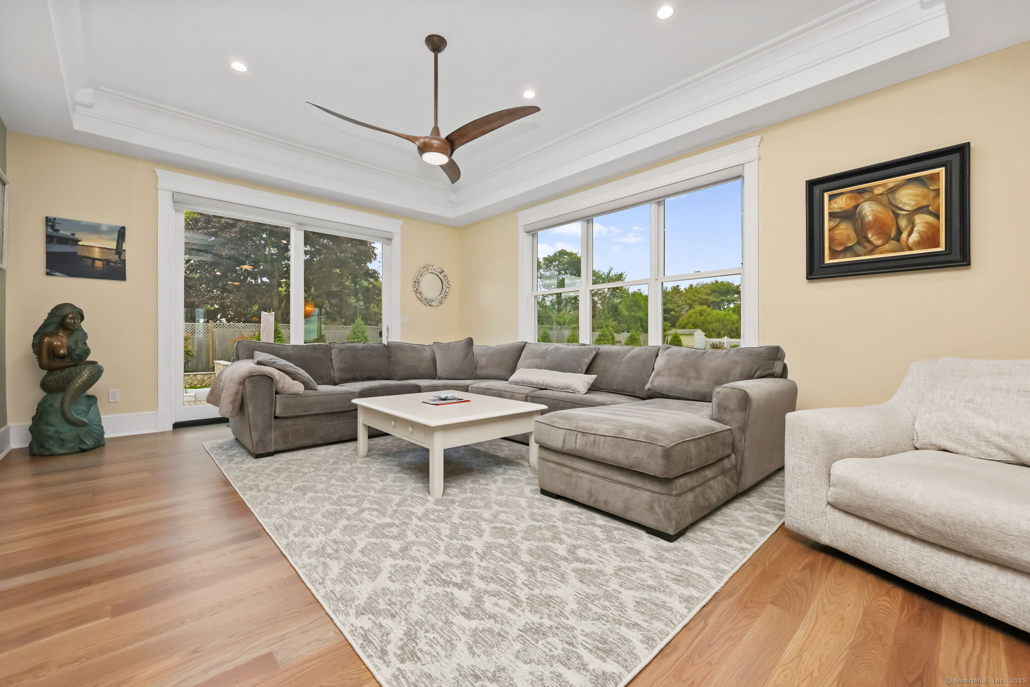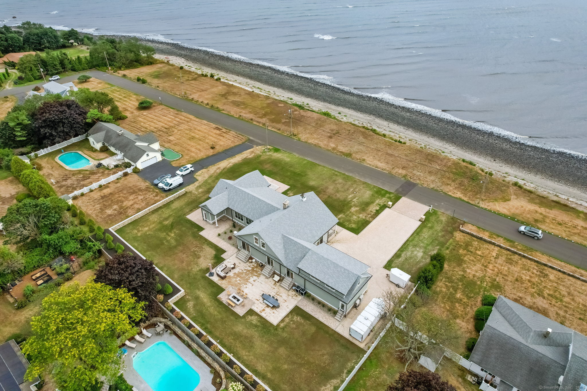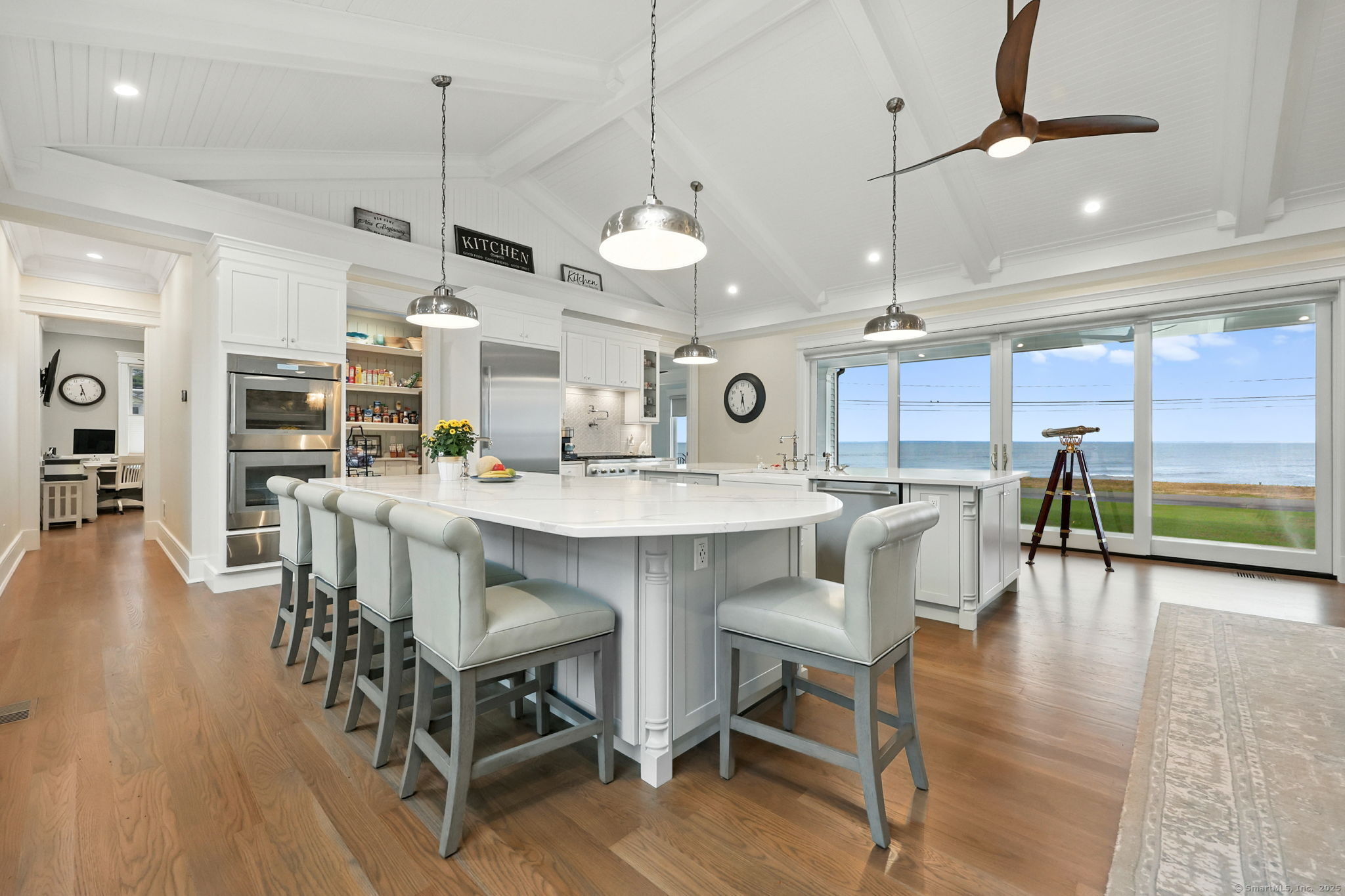 Coastal living meets everyday luxury in this waterfront gem in Lordship - welcome home! This custom-built waterfront home offers finely crafted living spaces, including a 3,700+ sq. ft. ranch-style main level, a framed walk-out lower level, and a private 2,000 sq. ft. multi-purpose area, which is framed out and drywalled to serve as 1,000 sq. ft. of living space and 1,000 sq. ft. of storage space. The waterfront views of this property are breathtaking! Designed with vaulted ceilings, White Oak floors, Marvin windows, and expansive glass panels, this home embraces its coastal setting on Lordship's shoreline. Highlights include a chef's Thermador kitchen (complete with a double wall oven and warming drawer, a speed oven with microwave, dishwasher, built-in refrigerator, and 6-burner range with a griddle and pot filler), dual islands, a vaulted great room with a stone fireplace, two luxurious primary suites, spa-inspired baths with heated floors, and expansive, architecturally inspired outdoor living areas. Enjoy a cozy fire on the patio or an outdoor shower after a day at the beach! Ring cameras, alarm system, generator, and a heated/AC 3-bay garage with EV outlet complete this exceptional opportunity for multi-generational waterfront living. Showings start September 2-don't miss your chance to tour this luxurious property!
