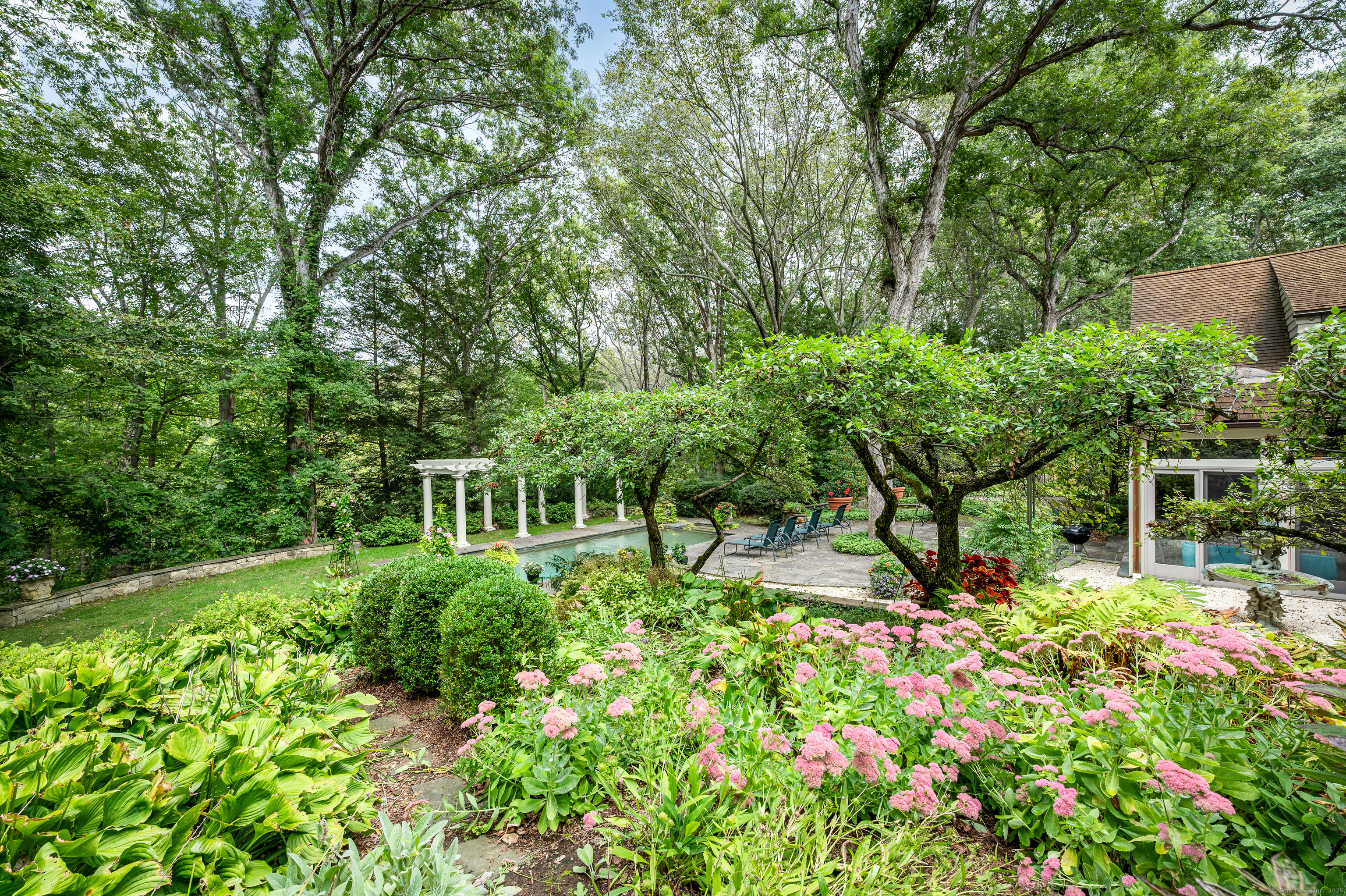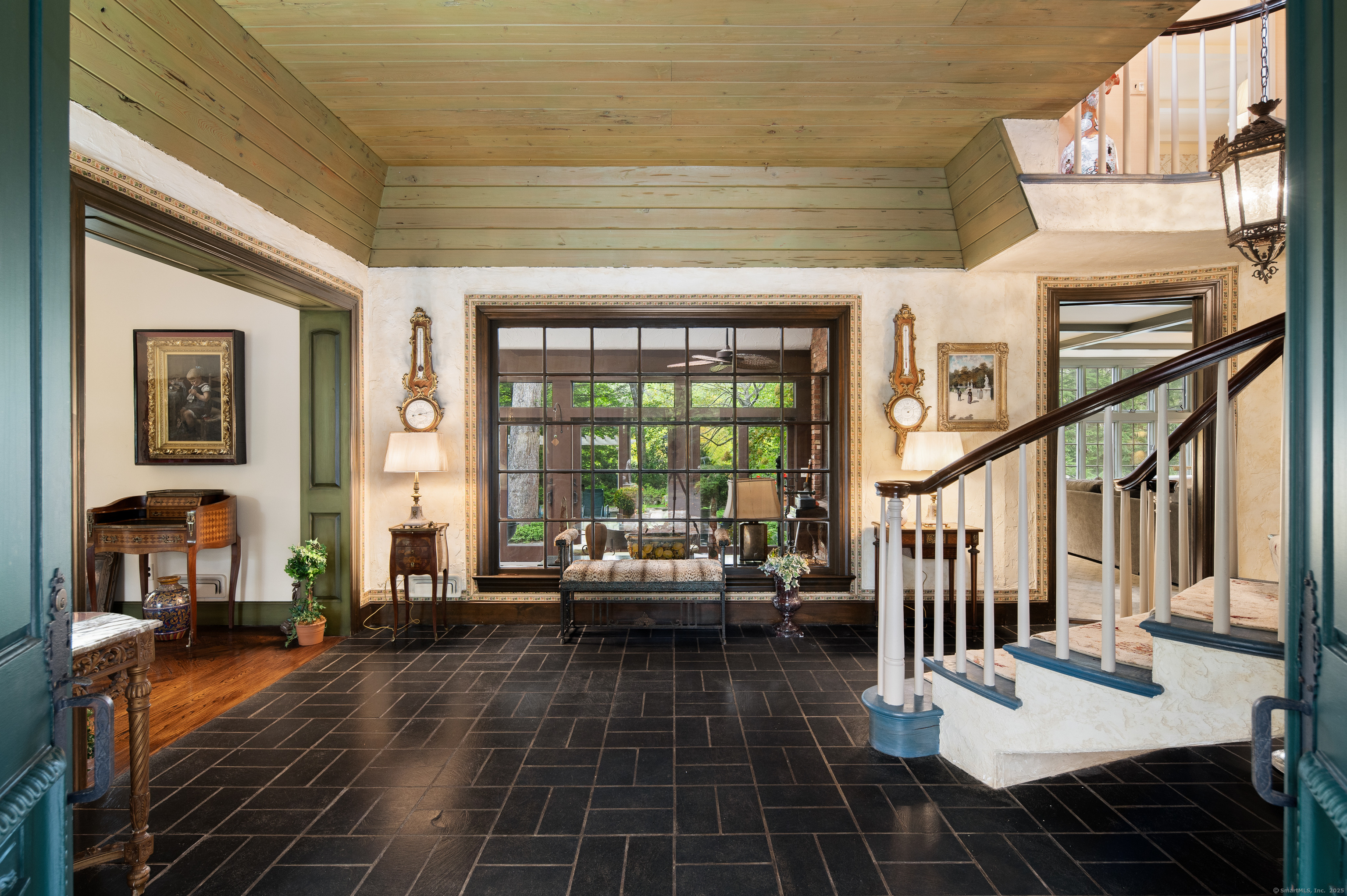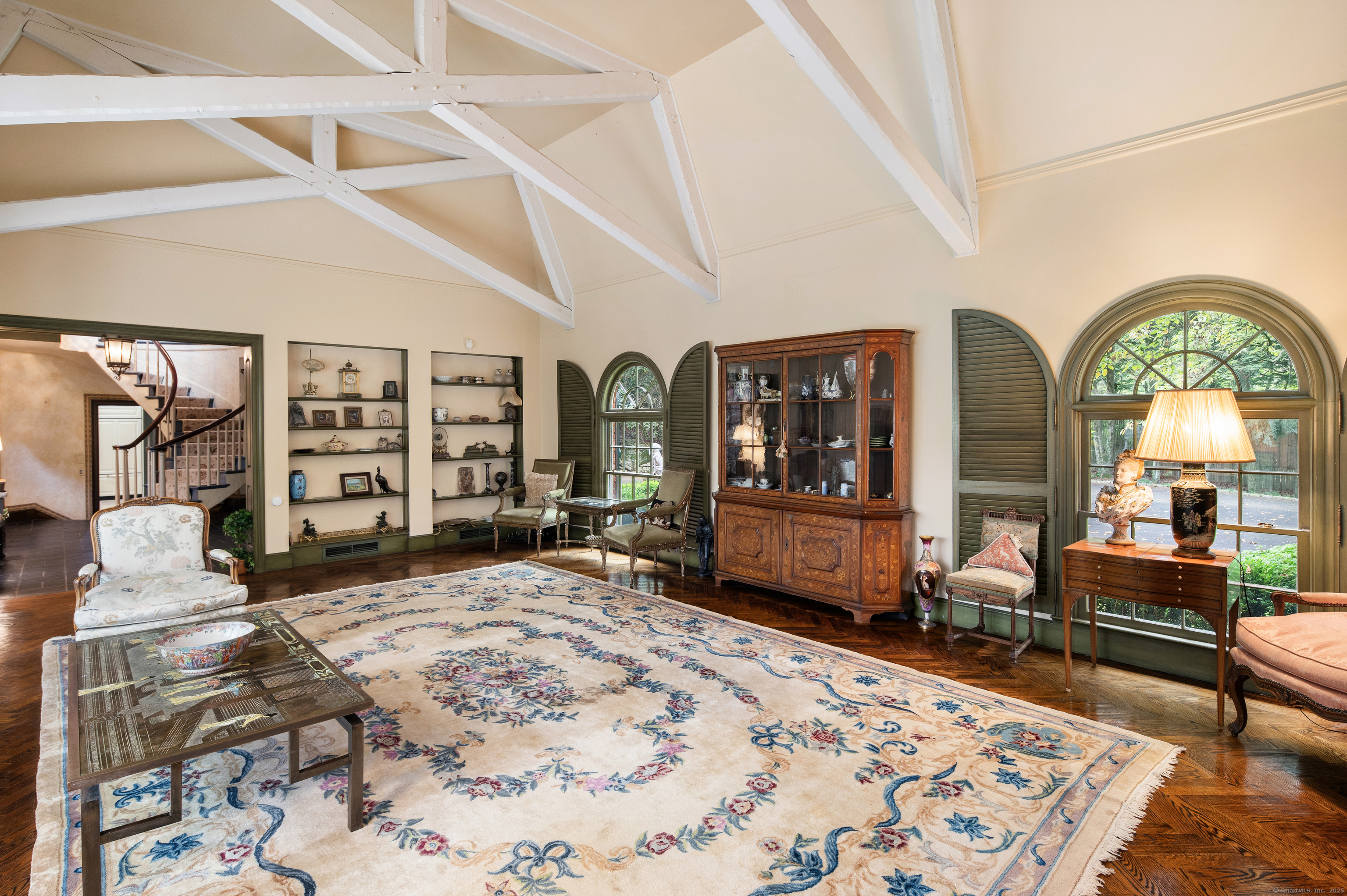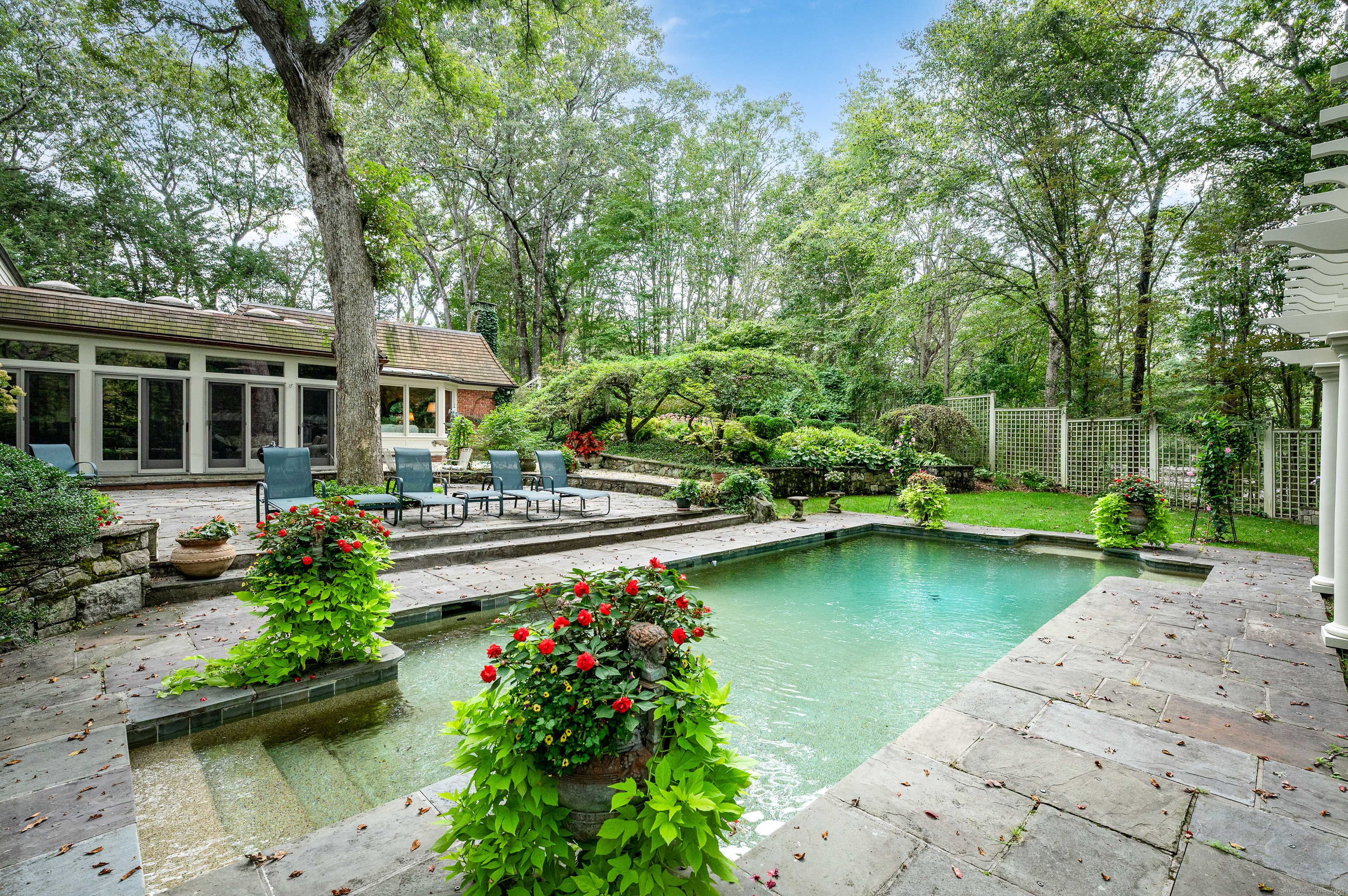 Secluded brick French country estate in private association on 2.3 North Stamford acres set at the end of a tree-lined driveway. Enter via the circular drive and this architectural gem evokes romance coupled with European flair. The facade is timeless surrounded by mature landscaping and lush woodlands, creating a natural wonderland, ensuring peace and quiet in every corner of the property. Amidst the tranquility, you are greeted by a stunning resort-style heated pool, overlooking a spring fed lake-perfectly surrounded by stone terraces, courtyards and flowering gardens. A graceful pergola stands nearby, ideal for shaded lounging. The expansive terrace is built for entertaining, with ample space for al fresco dining, cocktail parties, or simply soaking in the serenity. Once inside, elegance surrounds you as you enter the grand living room with beamed cathedral ceiling, arched windows and fireplace. Elegant formal dining room with old-world charm. Kitchen by Clive Christian opens to a glass enclosed greenhouse perfect for dining. The family room w/fireplace is open to the kitchen area. There is a sunlit solarium with French doors and ceiling fans offering great views of the backyard. Au pair suite or maid's quarters complement this level. The second floor offers a spacious master bedroom, and three additional bedrooms; one with separate entrance, perfect for a home office. Don't miss your chance to own this rare and sophisticated masterpiece - where luxury meets lifestyle.