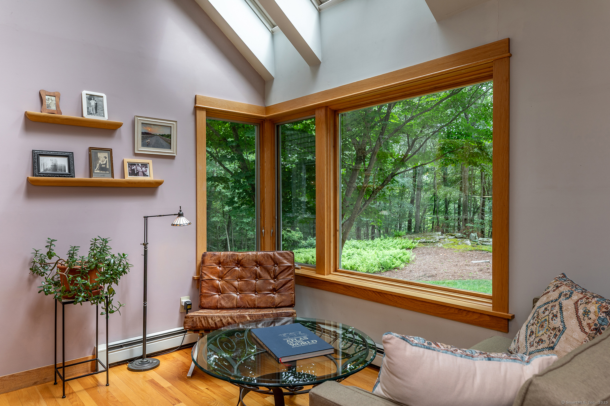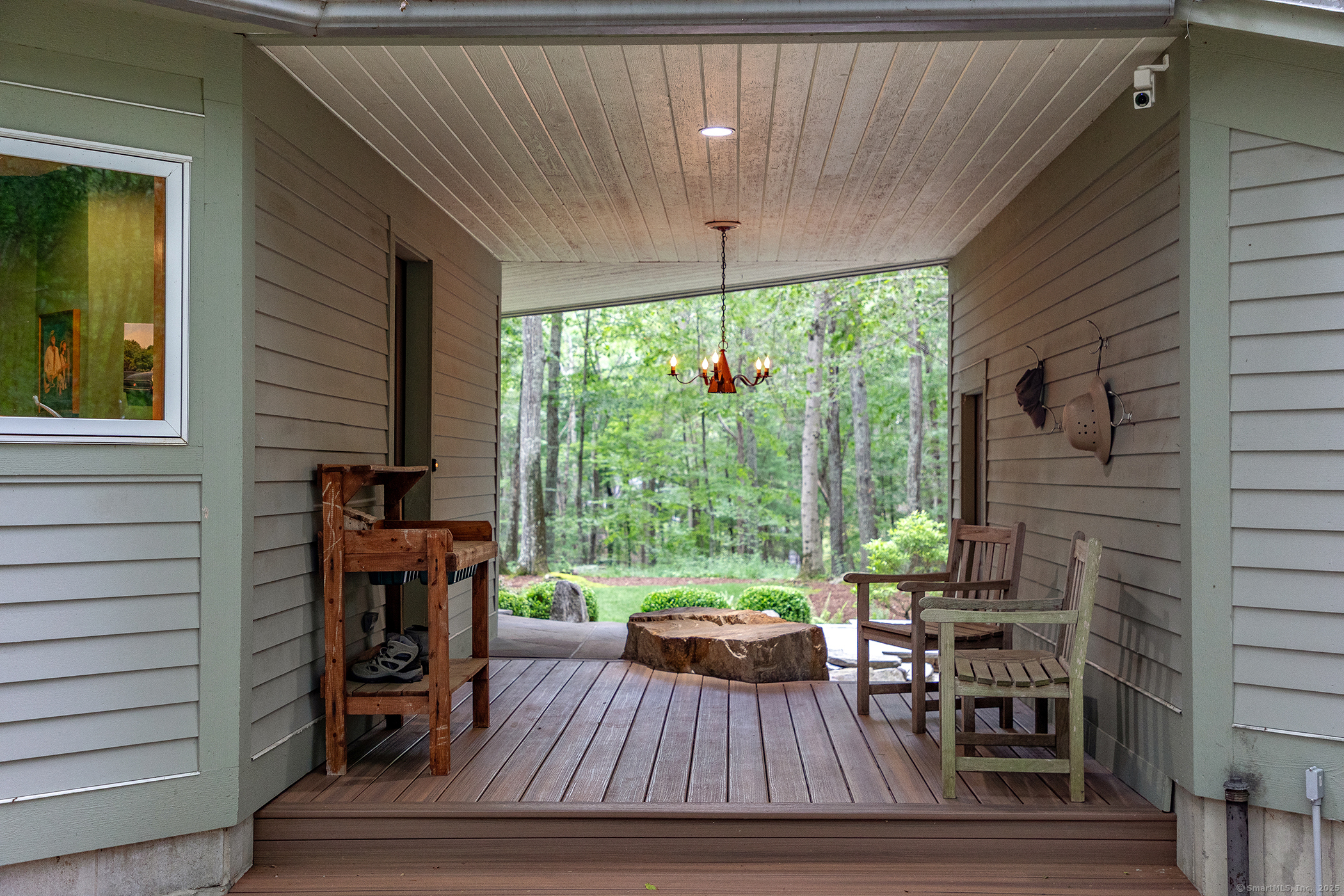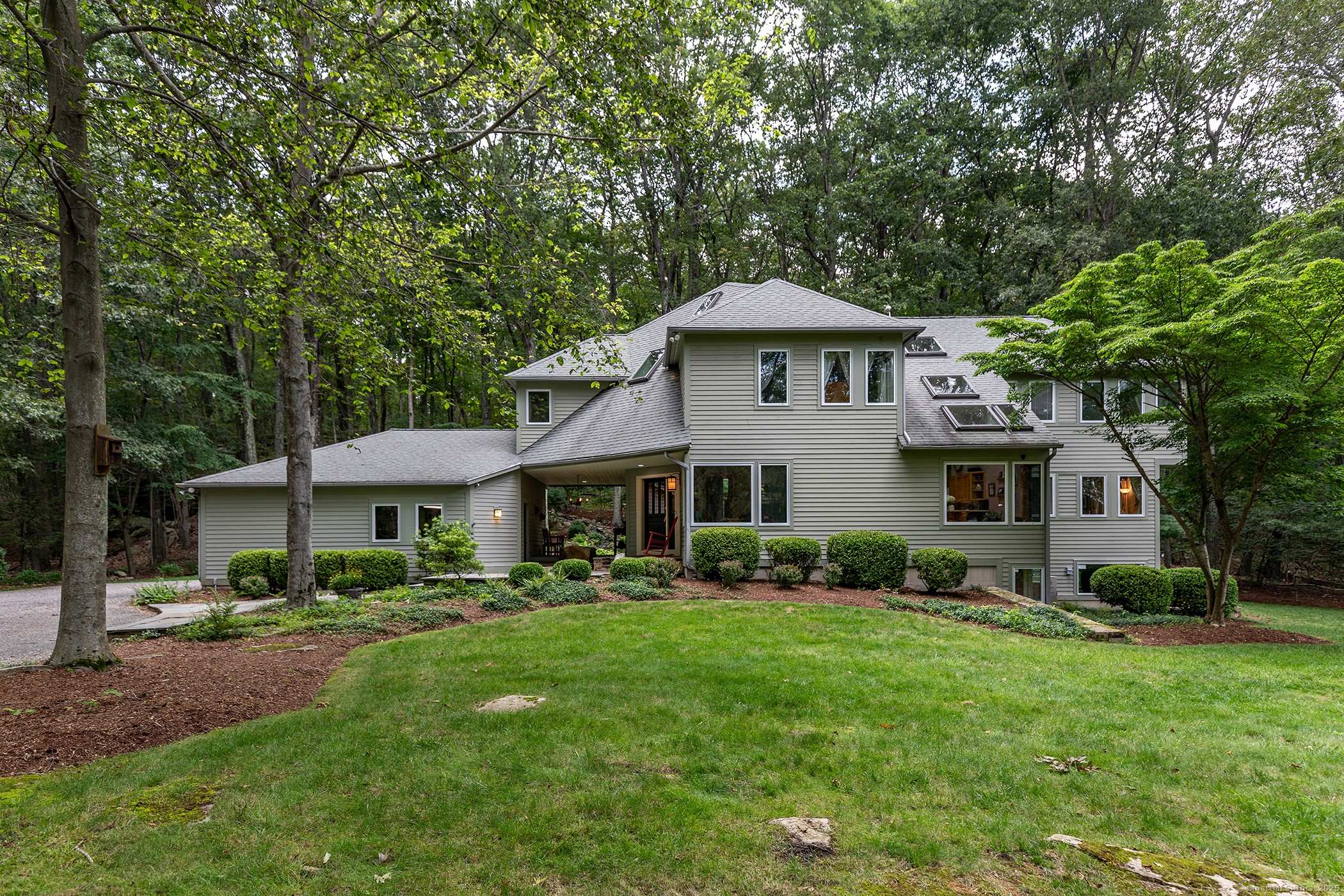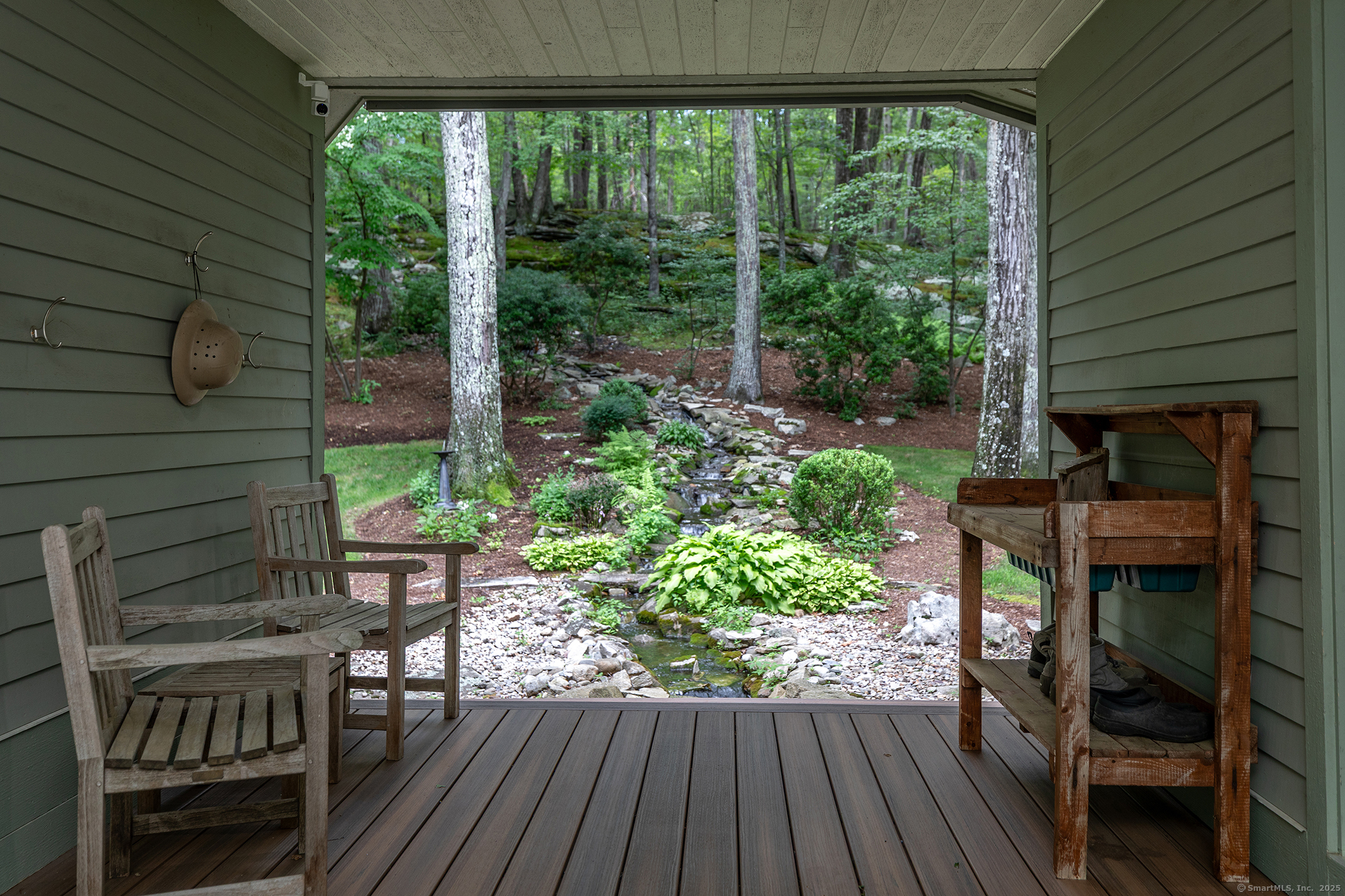Architect-designed Bridgewater oasis set next to over 300 acres of Roxbury Land Trust. Tucked away on 4+ private acres, this light-filled contemporary by Stephen Lasar was designed with passive solar principles, offering a retreat with exceptional privacy and efficiency. With 2,500+ sq ft, the home features 4 bedrooms and 3.5 baths, including a first-floor suite and a dedicated office. Upstairs, you'll find 3 bedrooms, including the vaulted-ceiling primary which overlooks treetops and is complemented by a convenient second-floor laundry. Artistic hardscaping leads to a covered porch and active stream feature, connecting the home to its natural surroundings. At its heart is a well-appointed kitchen and stone fireplace living room that flows into the dining area, framed by windows showcasing fern-covered grounds and dramatic granite outcroppings. The finished walkout lower level includes a full bath, media room, workshop, and storage. Outdoor living shines with a composite deck and stone patios. An attached two-car garage offers storage or workshop space, while a separate barn provides room for hobbies or equipment. Just minutes to Bridgewater village and a short drive to New Milford, Roxbury, Washington, and Lake Lillinonah, this property blends architectural integrity, natural beauty, and convenience-offering tranquility without isolation.