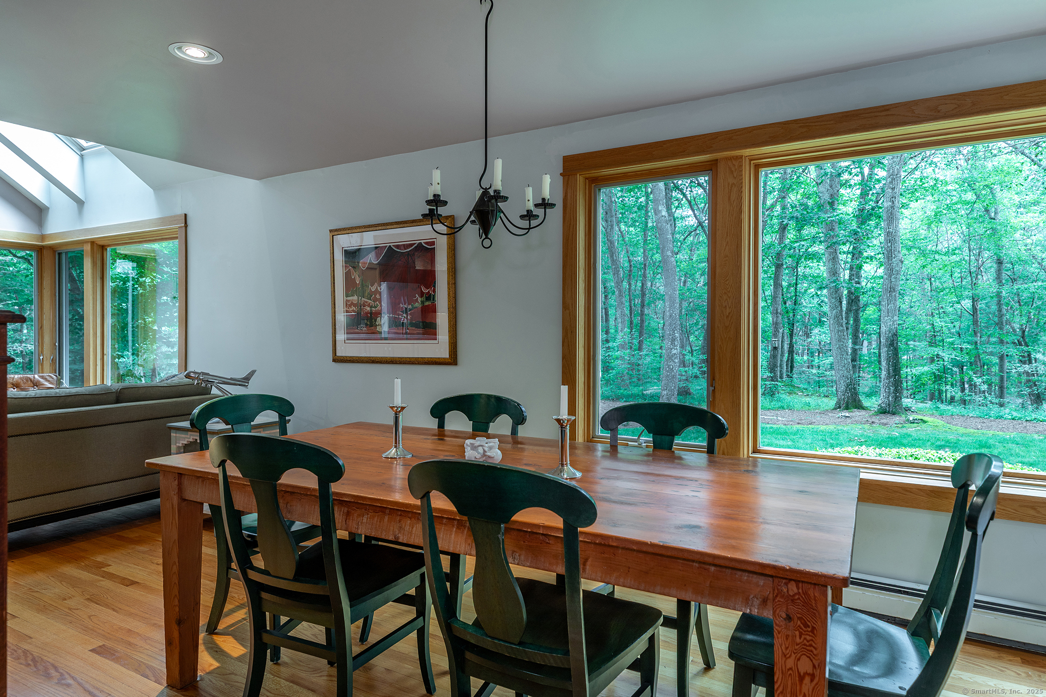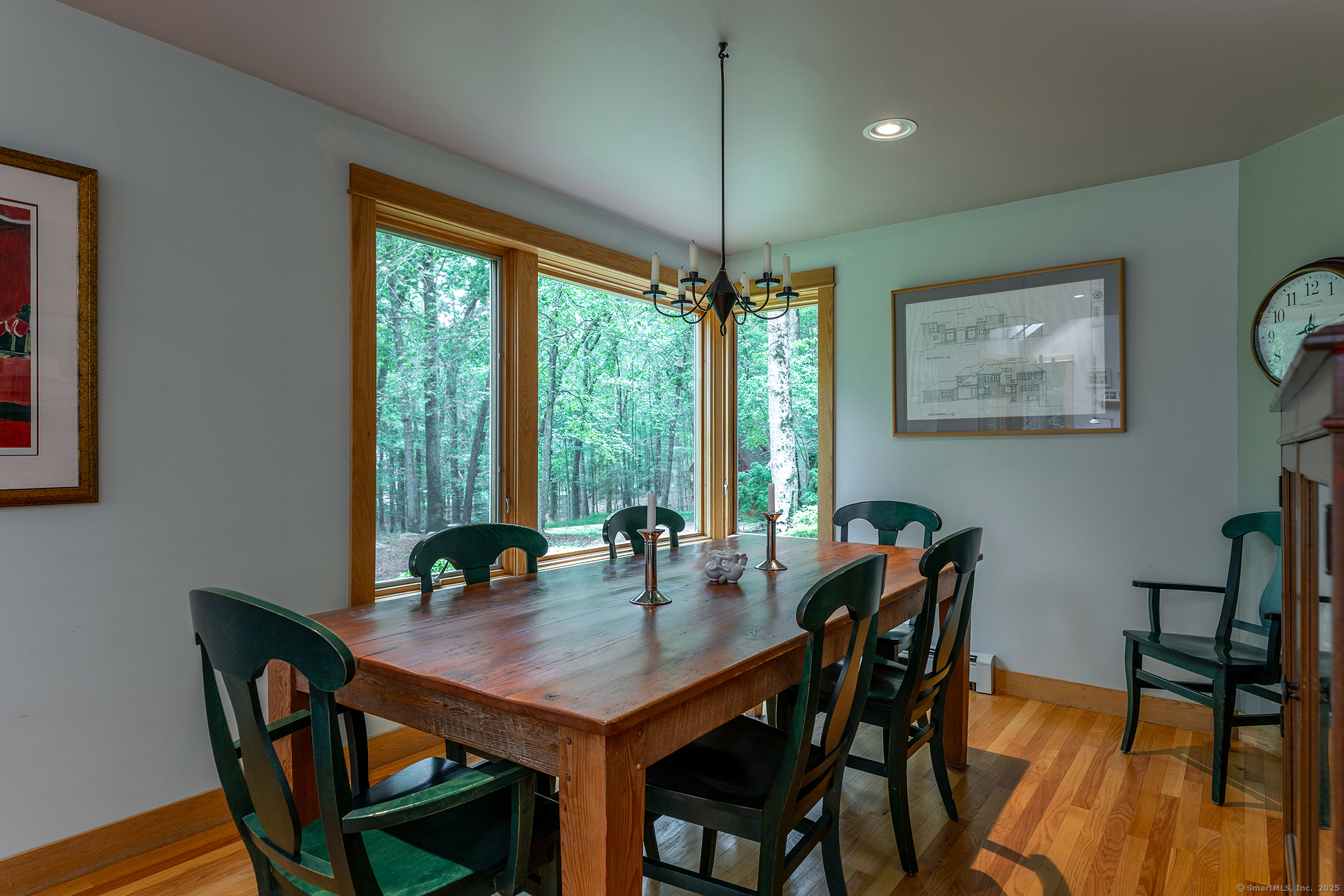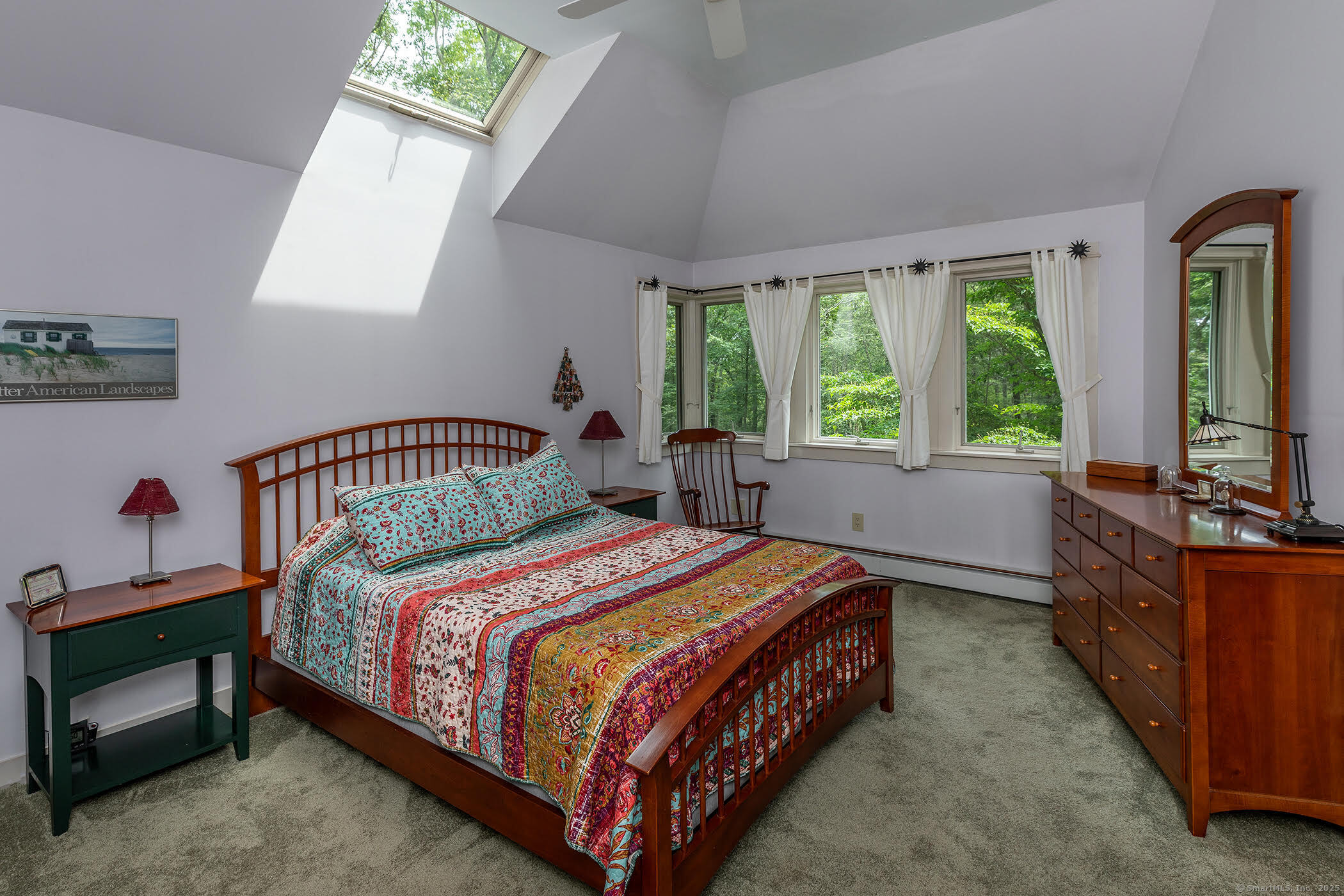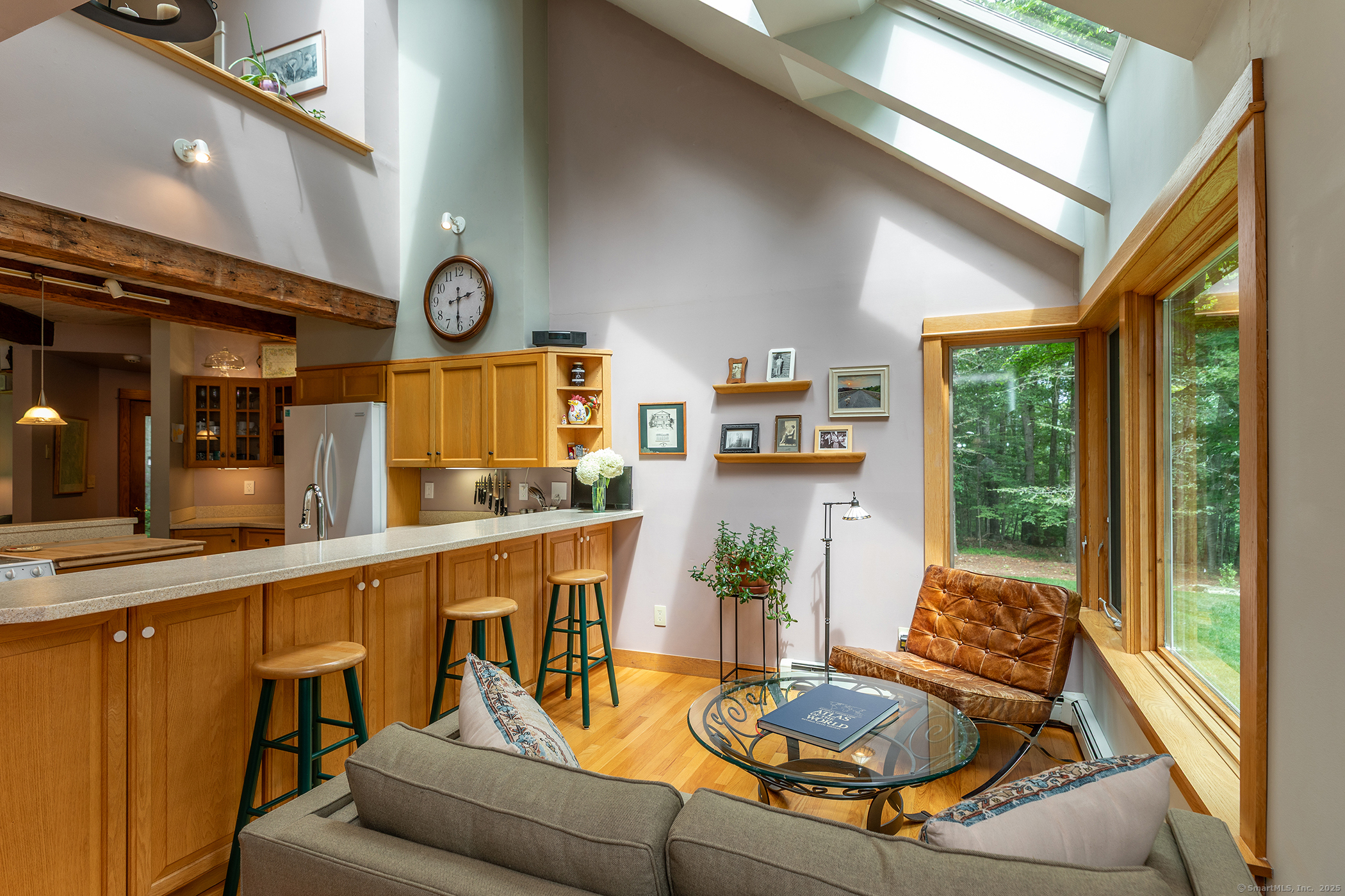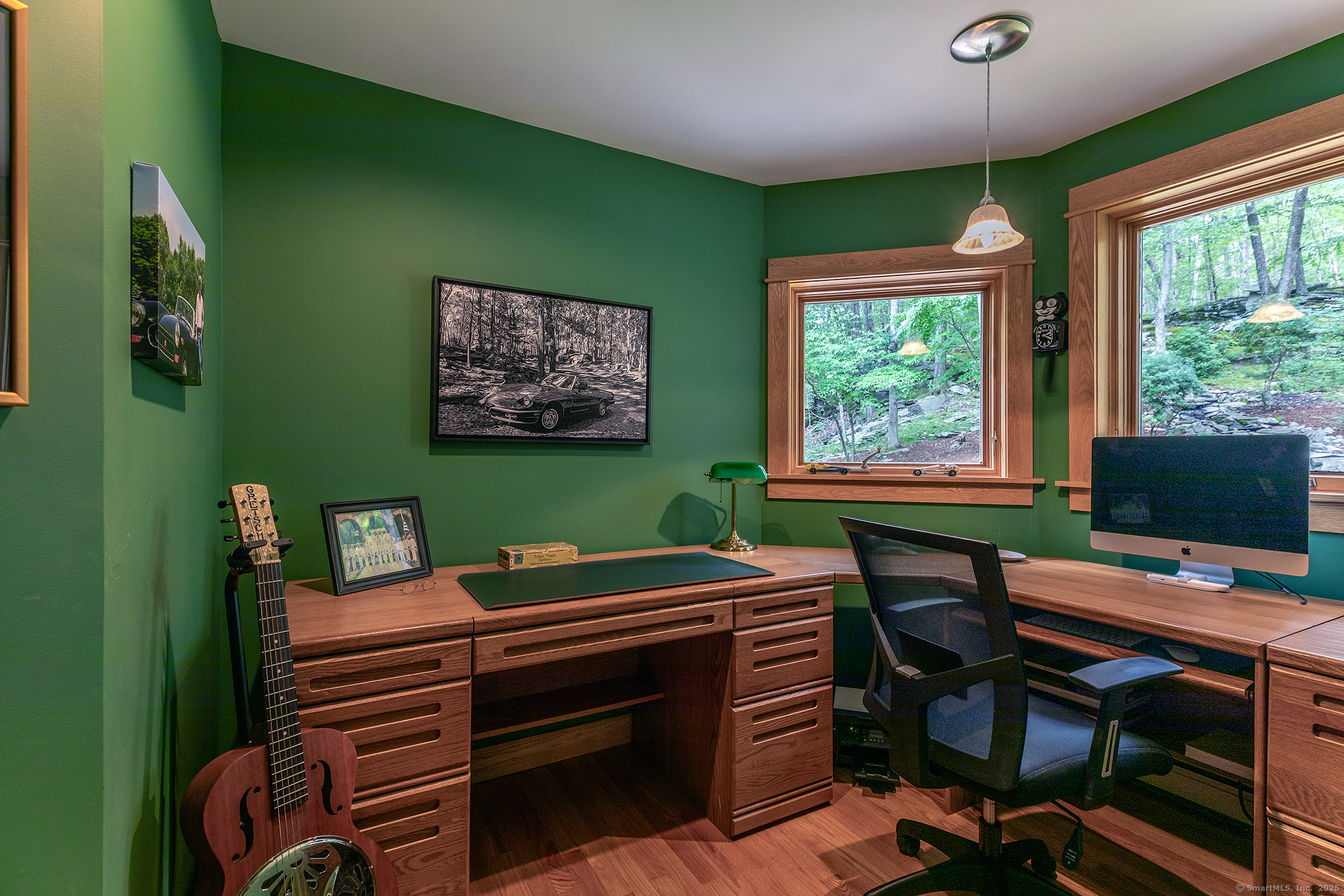Architect-designed Bridgewater oasis set next to over 300 acres of Roxbury Land Trust. Tucked away on 4+ private acres, this light-filled contemporary by Stephen Lasar was designed with passive solar principles, offering a retreat with exceptional privacy and efficiency. With 2,500+ sq ft, the home features 4 bedrooms and 3.5 baths, including a first-floor suite and a dedicated office. Upstairs, you'll find 3 bedrooms, including the vaulted-ceiling primary which overlooks treetops and is complemented by a convenient second-floor laundry. Artistic hardscaping leads to a covered porch and active stream feature, connecting the home to its natural surroundings. At its heart is a well-appointed kitchen and stone fireplace living room that flows into the dining area, framed by windows showcasing fern-covered grounds and dramatic granite outcroppings. The finished walkout lower level includes a full bath, media room, workshop, and storage. Outdoor living shines with a composite deck and stone patios. An attached two-car garage offers storage or workshop space, while a separate barn provides room for hobbies or equipment. Just minutes to Bridgewater village and a short drive to New Milford, Roxbury, Washington, and Lake Lillinonah, this property blends architectural integrity, natural beauty, and convenience-offering tranquility without isolation.