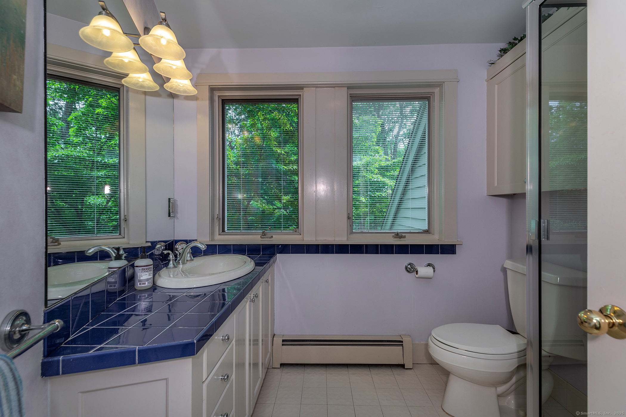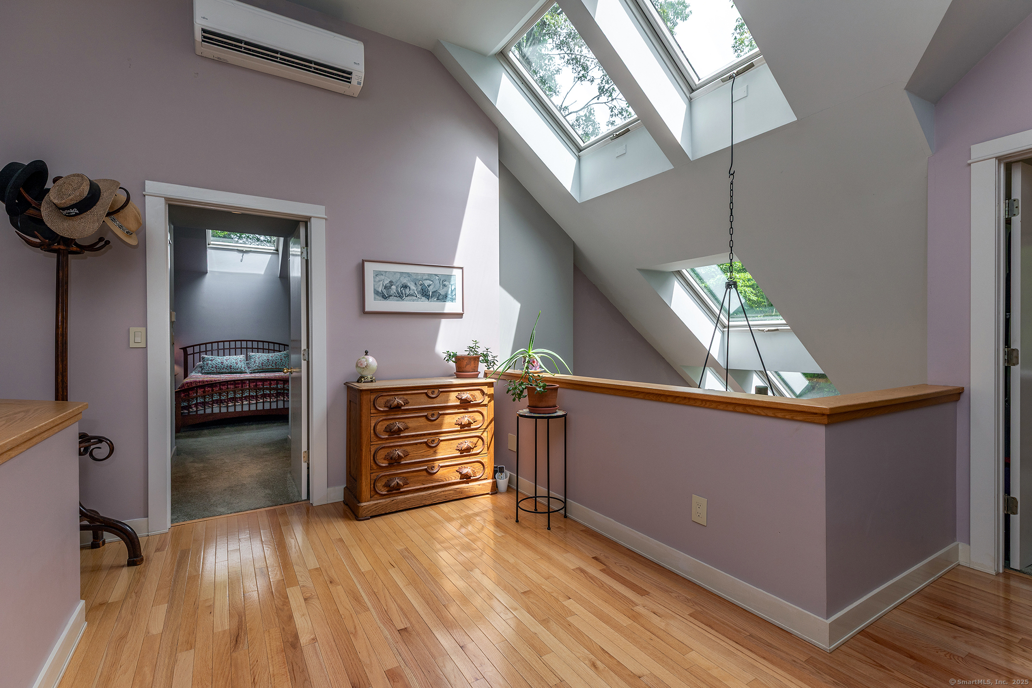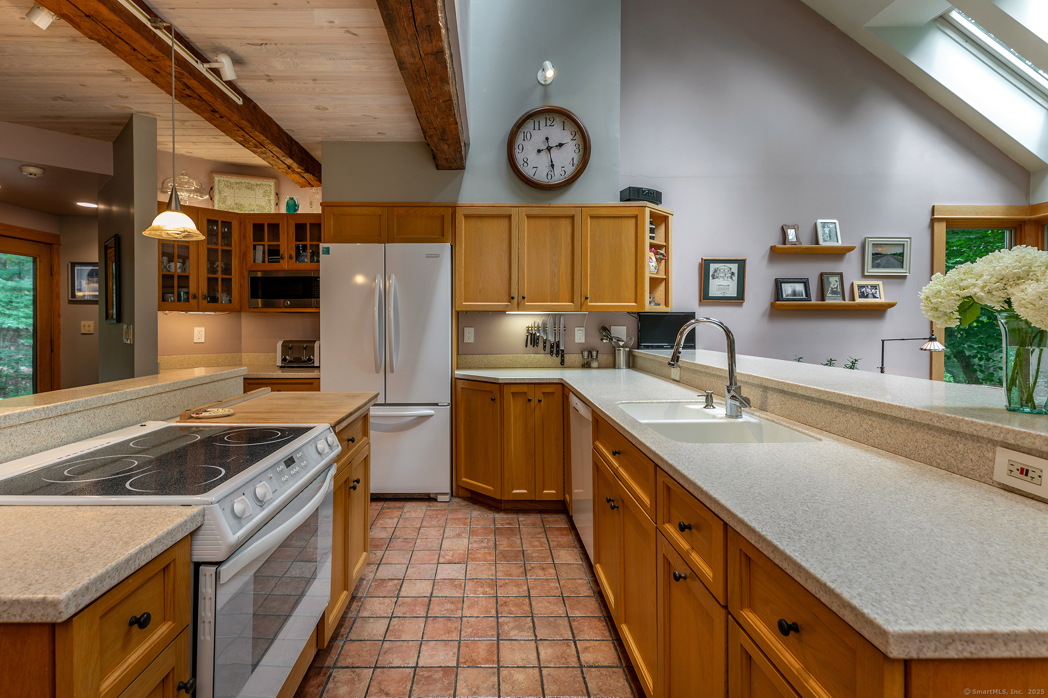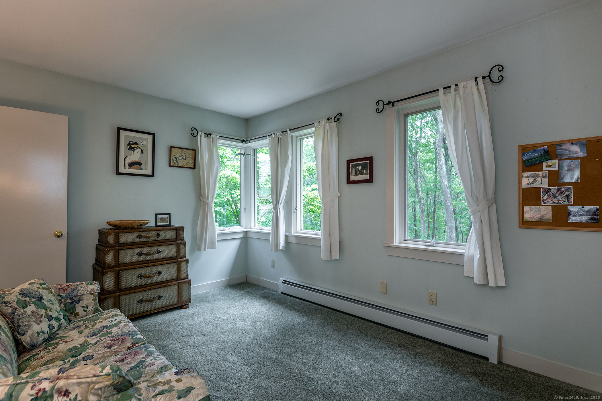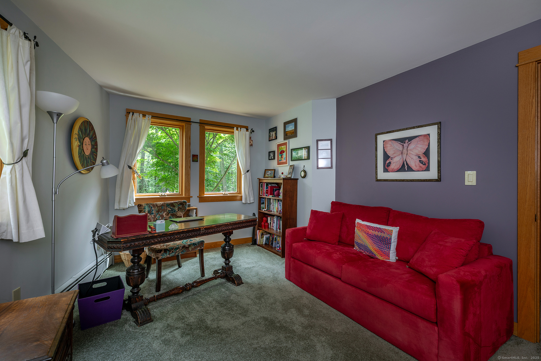 Architect-designed Bridgewater oasis set next to over 300 acres of Roxbury Land Trust. Tucked away on 4+ private acres, this light-filled contemporary by Stephen Lasar was designed with passive solar principles, offering a retreat with exceptional privacy and efficiency. With 2,500+ sq ft, the home features 4 bedrooms and 3.5 baths, including a first-floor suite and a dedicated office. Upstairs, you'll find 3 bedrooms, including the vaulted-ceiling primary which overlooks treetops and is complemented by a convenient second-floor laundry. Artistic hardscaping leads to a covered porch and active stream feature, connecting the home to its natural surroundings. At its heart is a well-appointed kitchen and stone fireplace living room that flows into the dining area, framed by windows showcasing fern-covered grounds and dramatic granite outcroppings. The finished walkout lower level includes a full bath, media room, workshop, and storage. Outdoor living shines with a composite deck and stone patios. An attached two-car garage offers storage or workshop space, while a separate barn provides room for hobbies or equipment. Just minutes to Bridgewater village and a short drive to New Milford, Roxbury, Washington, and Lake Lillinonah, this property blends architectural integrity, natural beauty, and convenience-offering tranquility without isolation.