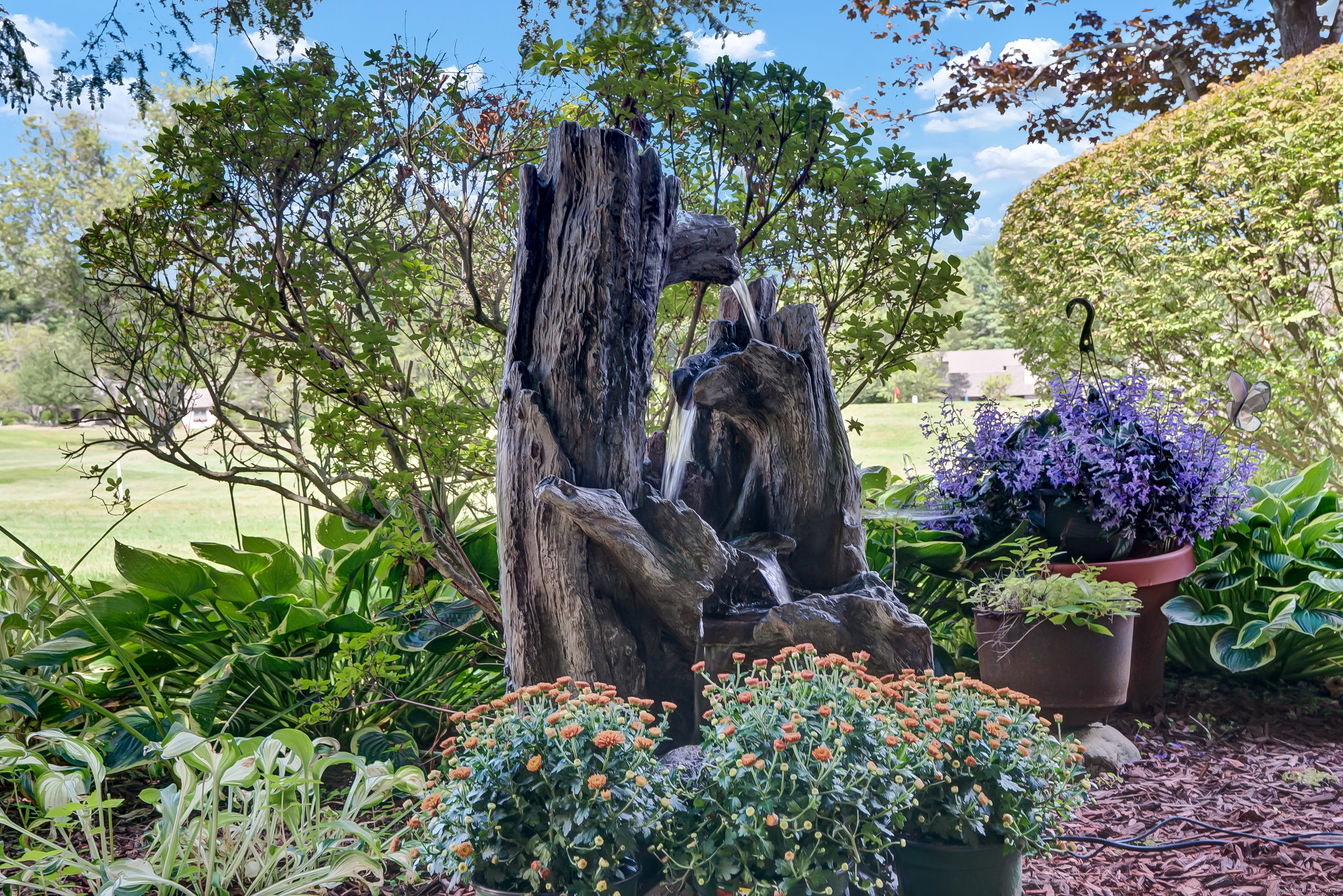 This desirable unit has been in the same family since its construction. Sought after private location overlooking the fairway from the patio with soothing fountain. Freshly painted throughout. Welcoming foyer with guest closet. Remodeled kitchen with custom cherry cabinetry, maintenance free engineered wood style flooring, plenty of Corian counters, virtually new stainless appliances, one of a kind tile backsplash, under cabinet lighting & generous eating area.L-shaped living/ dining with new sliders accessing private patio with awning.Fireplace has electric insert that can be easily removed and converted to wood burning.Book & display shelving abound. Neutral carpeting throughout both floors. 1/2 bath has newer fixtures, vanity, granite counter & tile floor. Top of the stairs has new dryer with good storage and washer. Primary bedroom with sitting area and spacious closet also has its own balcony all overlooking the golf fairway. Full remodeled bathroom connects with additional closet, newer vanity & tile floor. An additional vanity with sink connects from the other bedroom. Jack & Jill style.Other bedroom is filled with natural light, has built in shelving and a walk in closet. Electric baseboard heat throughout. Central air unit replaced couple of years ago. All light fixtures are newer. Garage unit is #5 and is around the corner. An exceptionally comfortable unit in an outstanding location. Windows replaced with low E throughout.